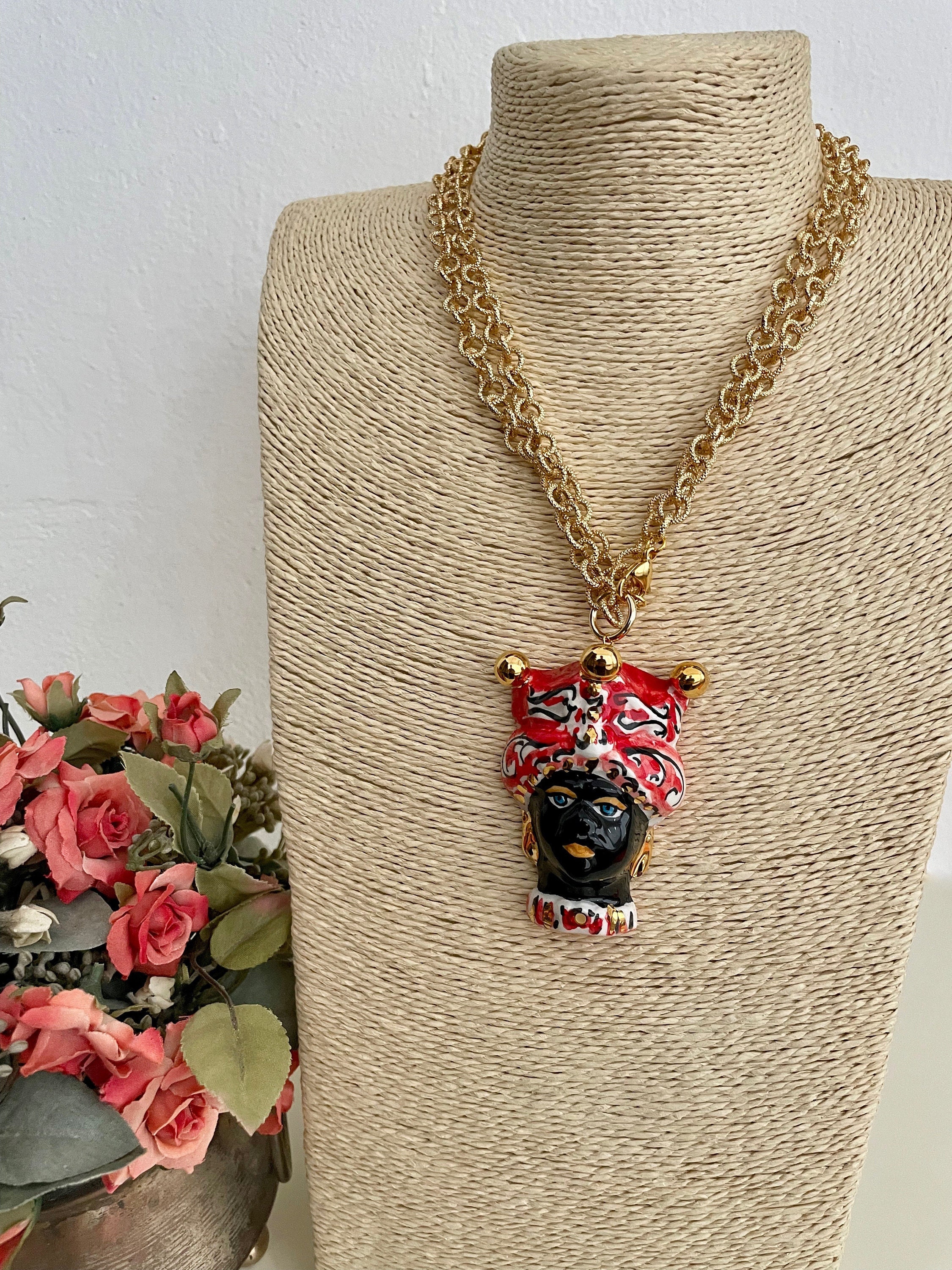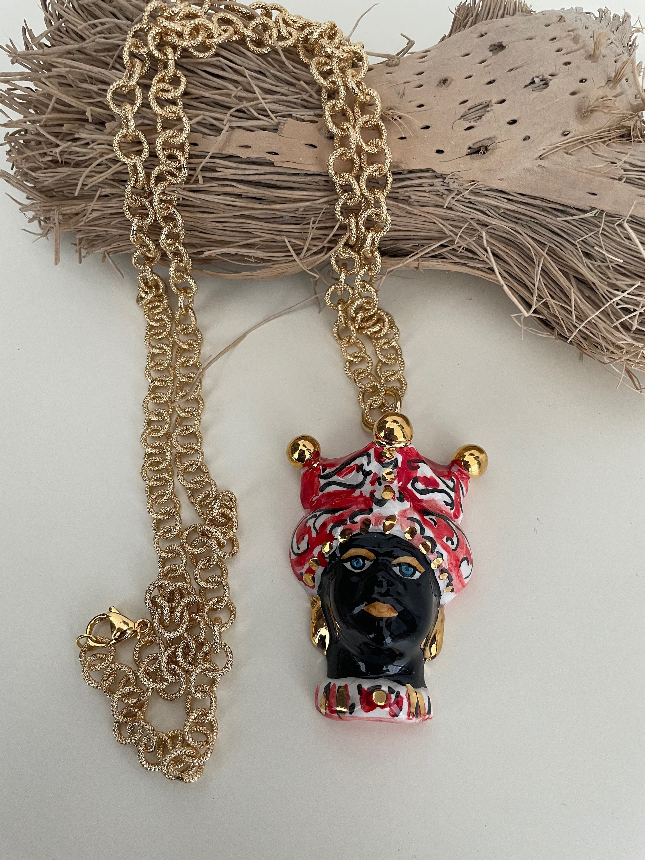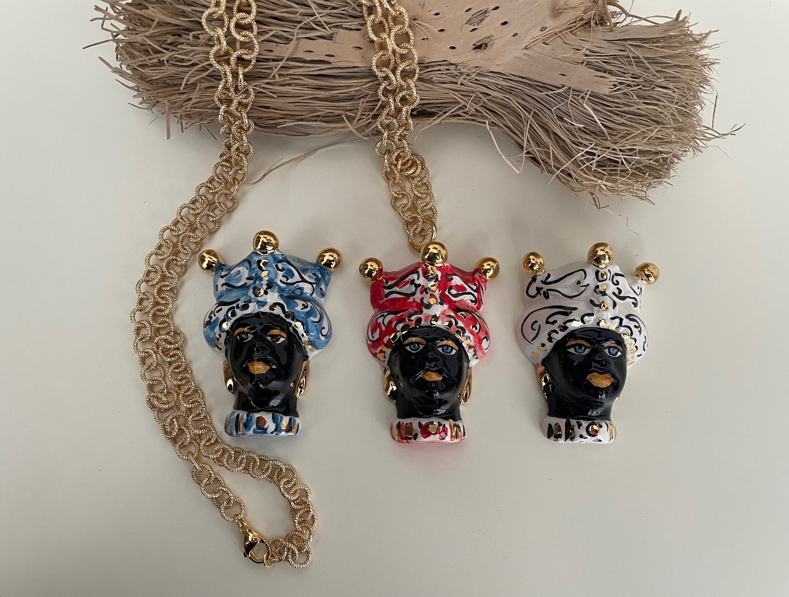 Completa il tutto un ciondolo pendente in ceramica di Caltagirone, dipinto a mano, raffigurante una Testa di moro, simbolo siciliano!