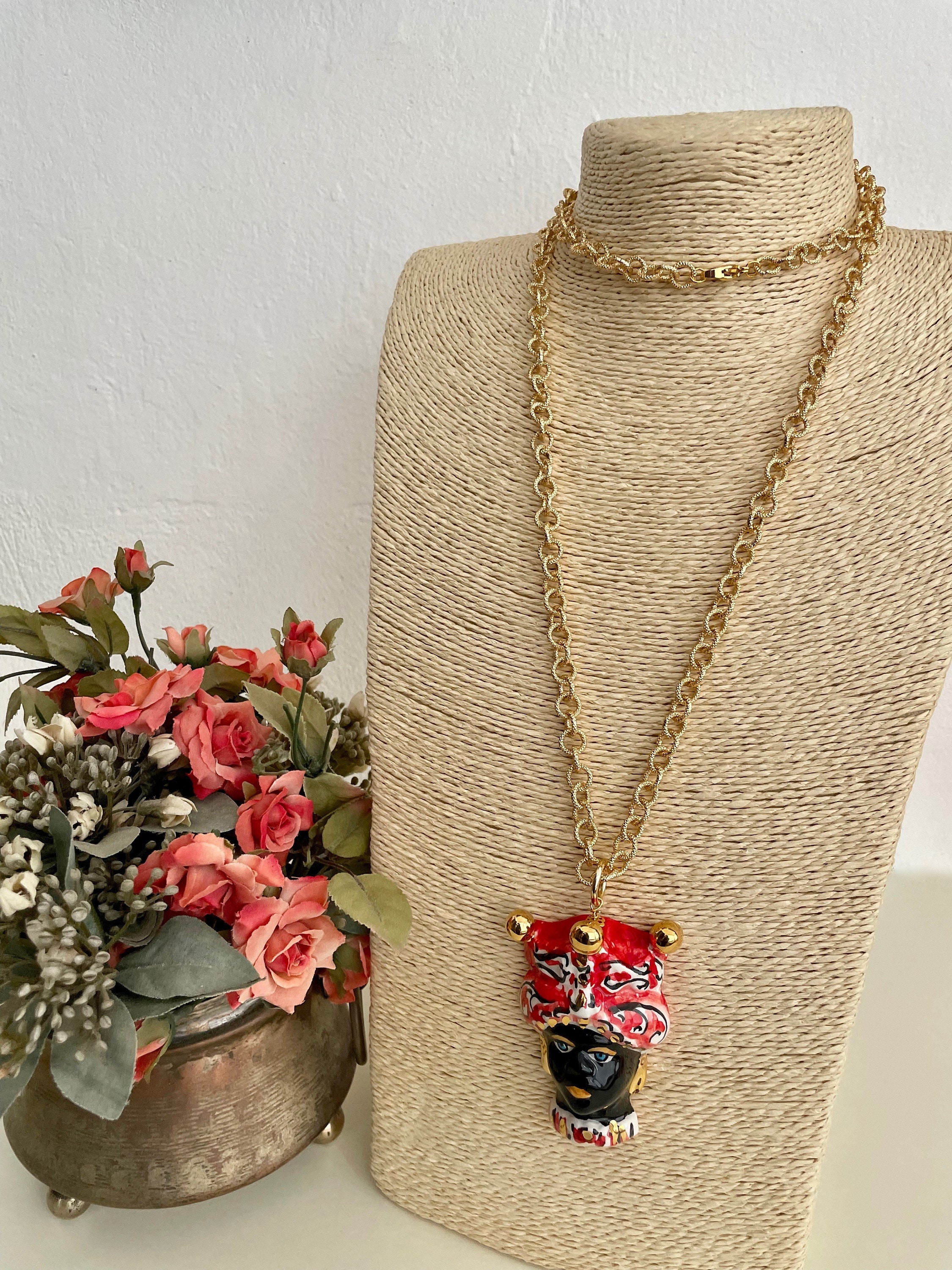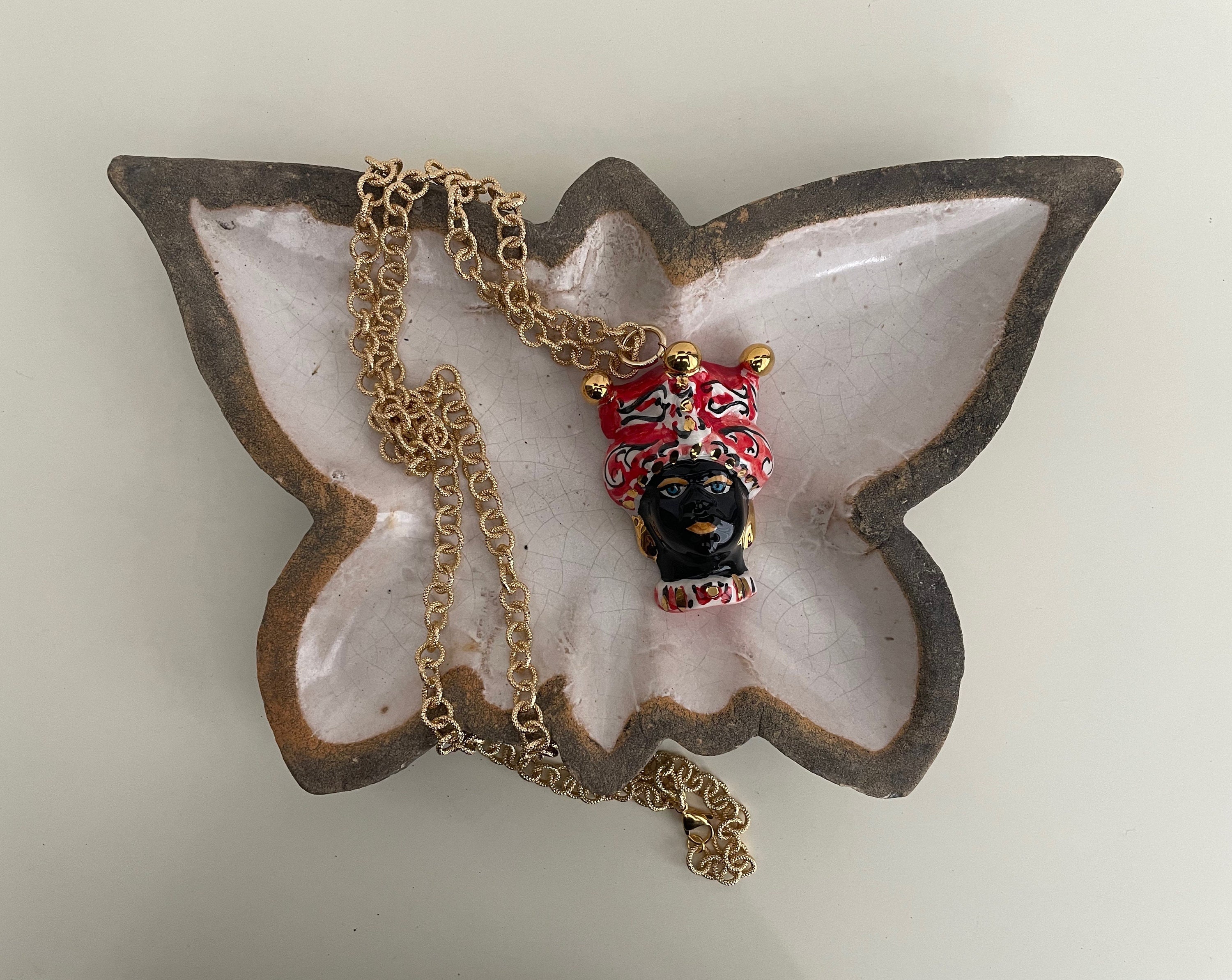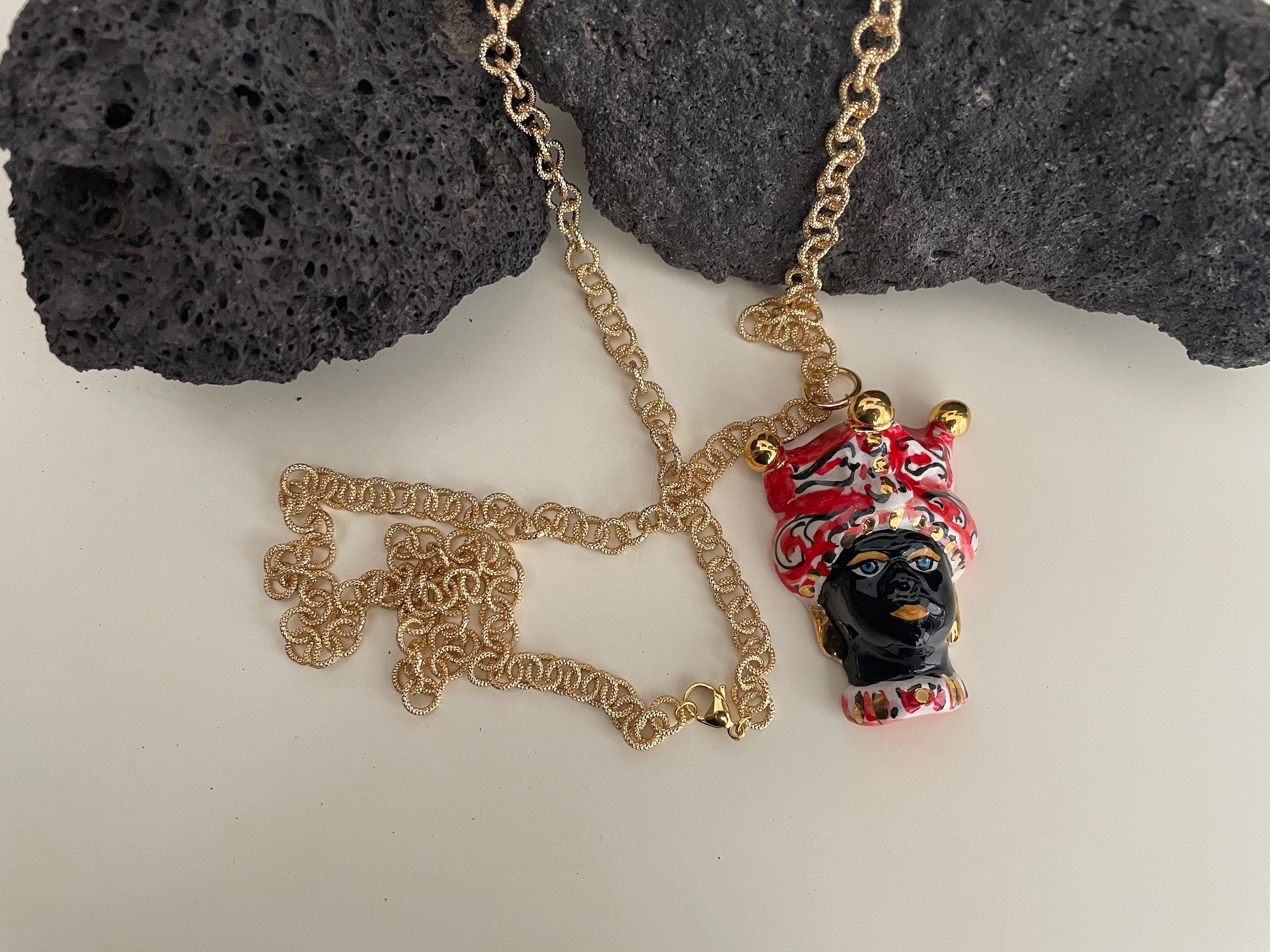 Completa il tutto un ciondolo pendente in ceramica di Caltagirone, dipinto a mano, raffigurante una Testa di moro, simbolo siciliano!