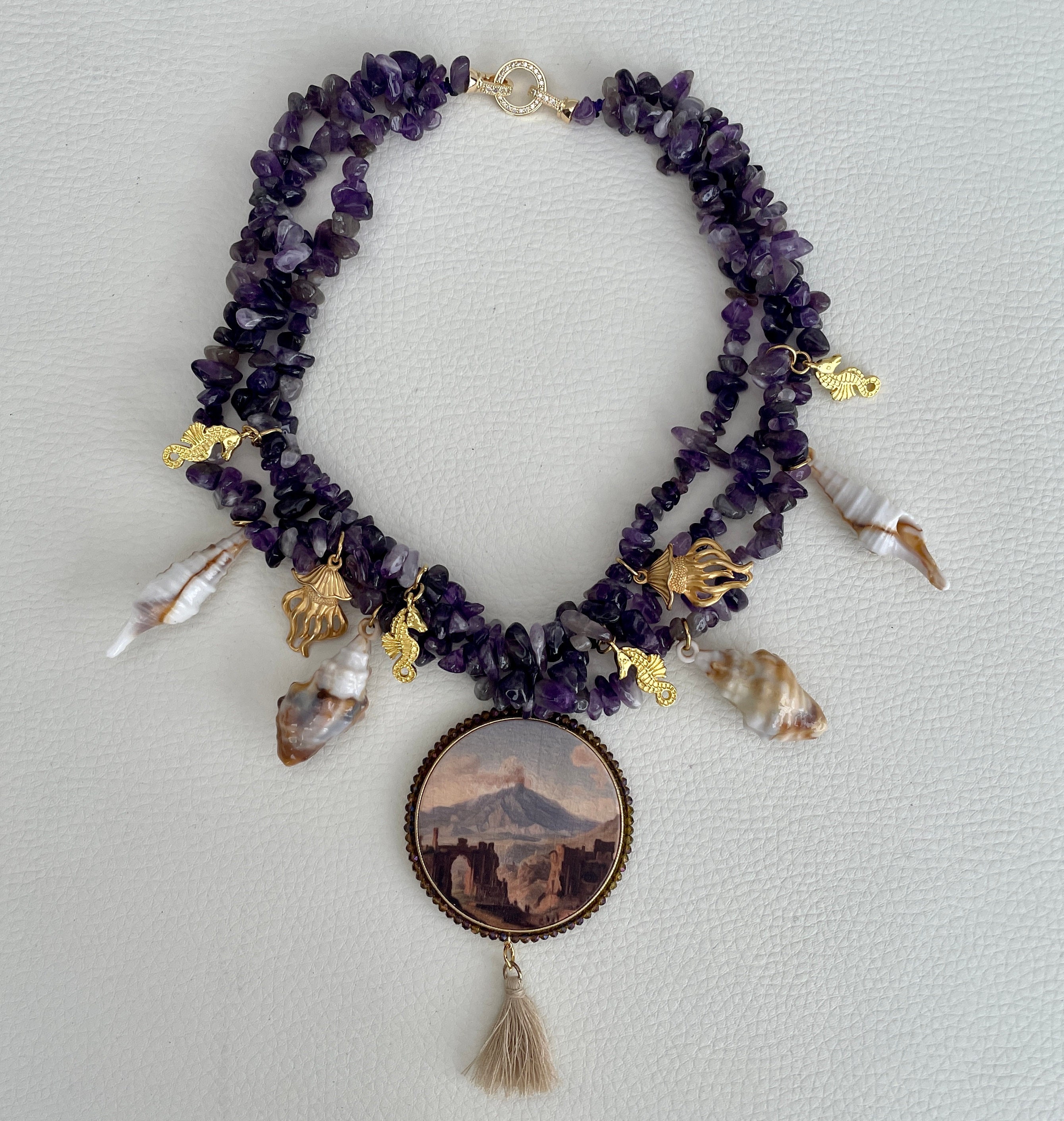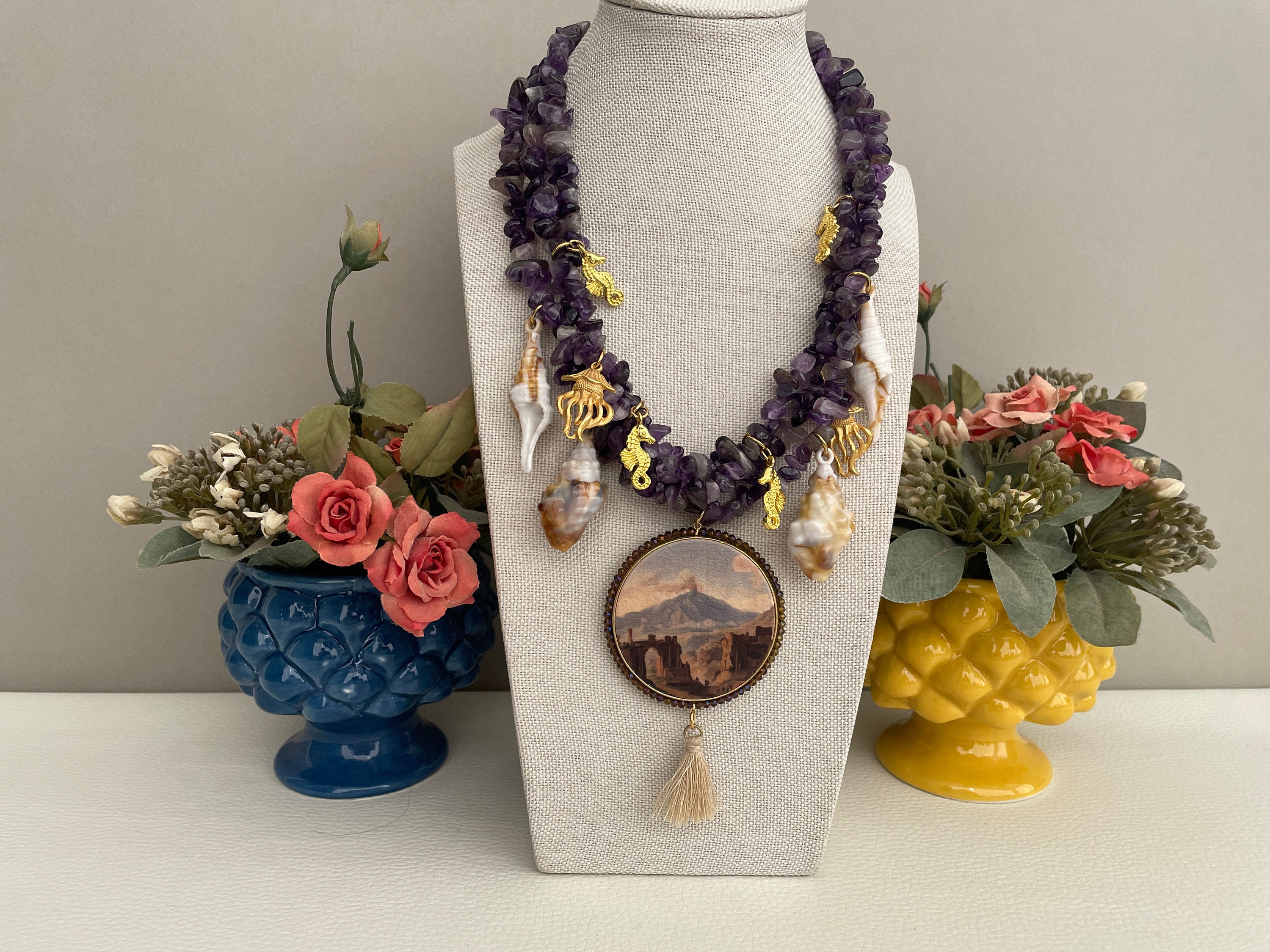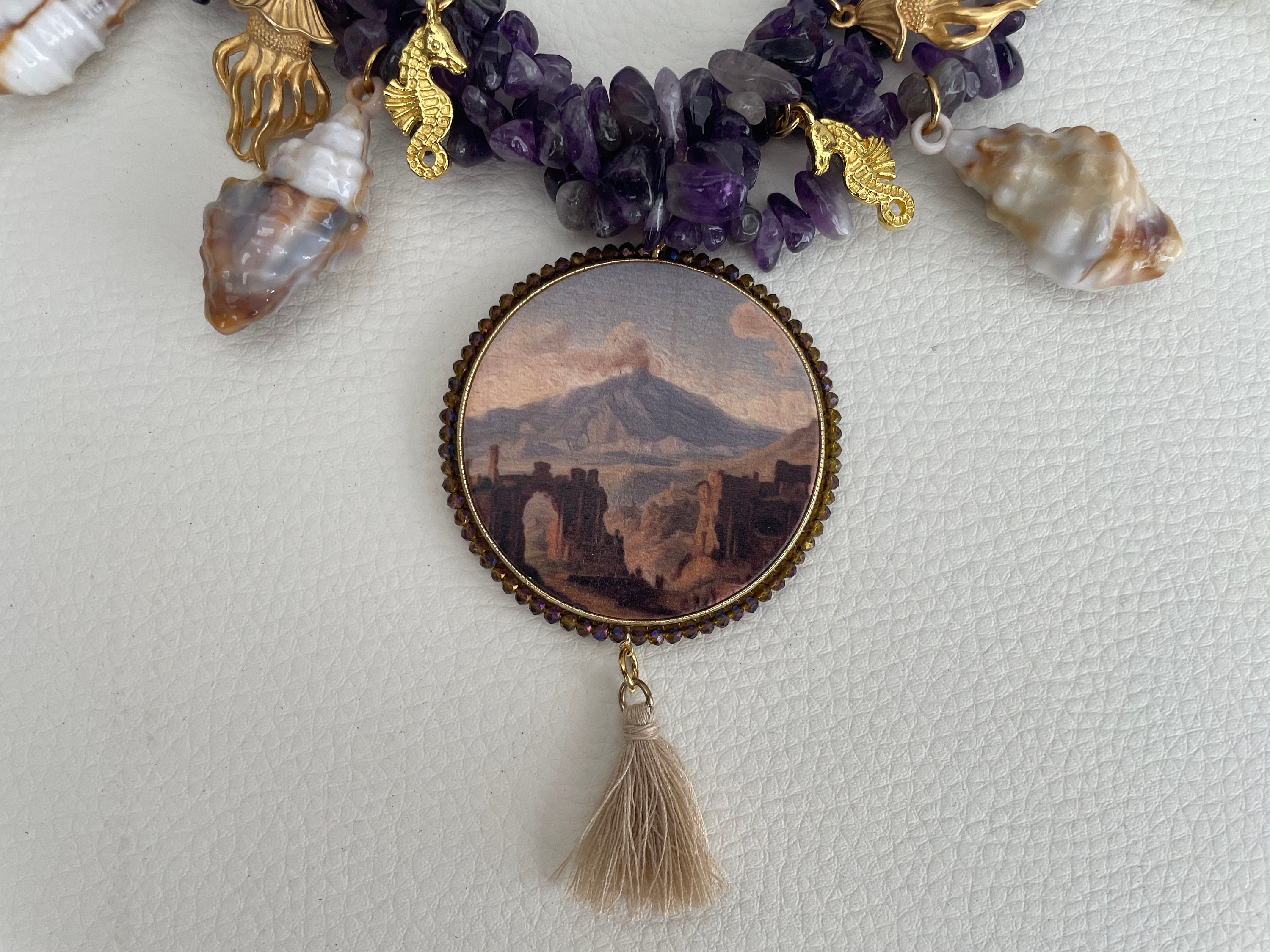 Un grande ciondolo di legno tondo raffigurante una riproduzione del Vulcano Etna visto dal Teatro Greco di Taormina pende centralmente dal girocollo.