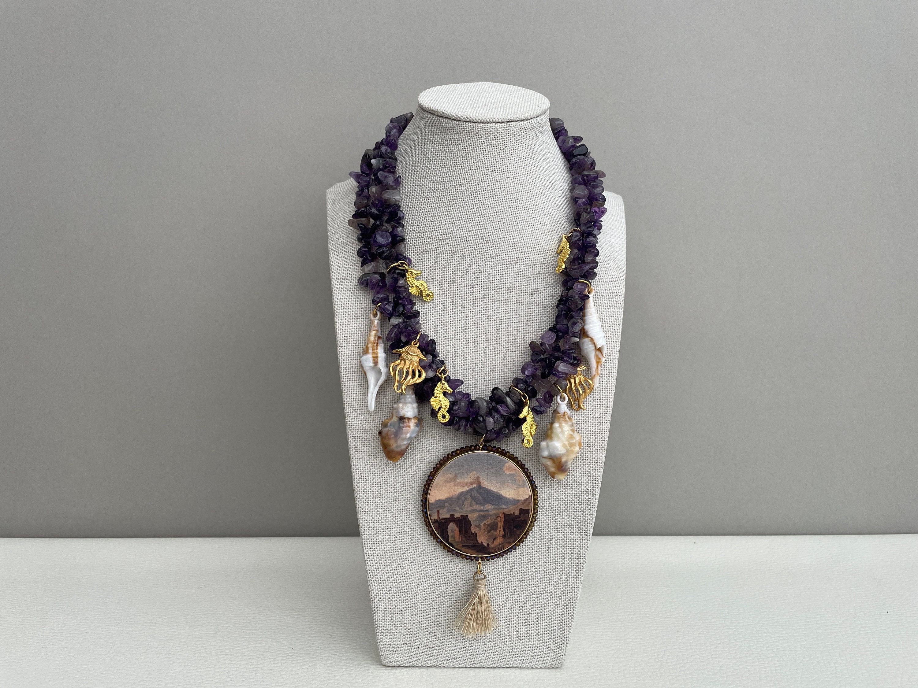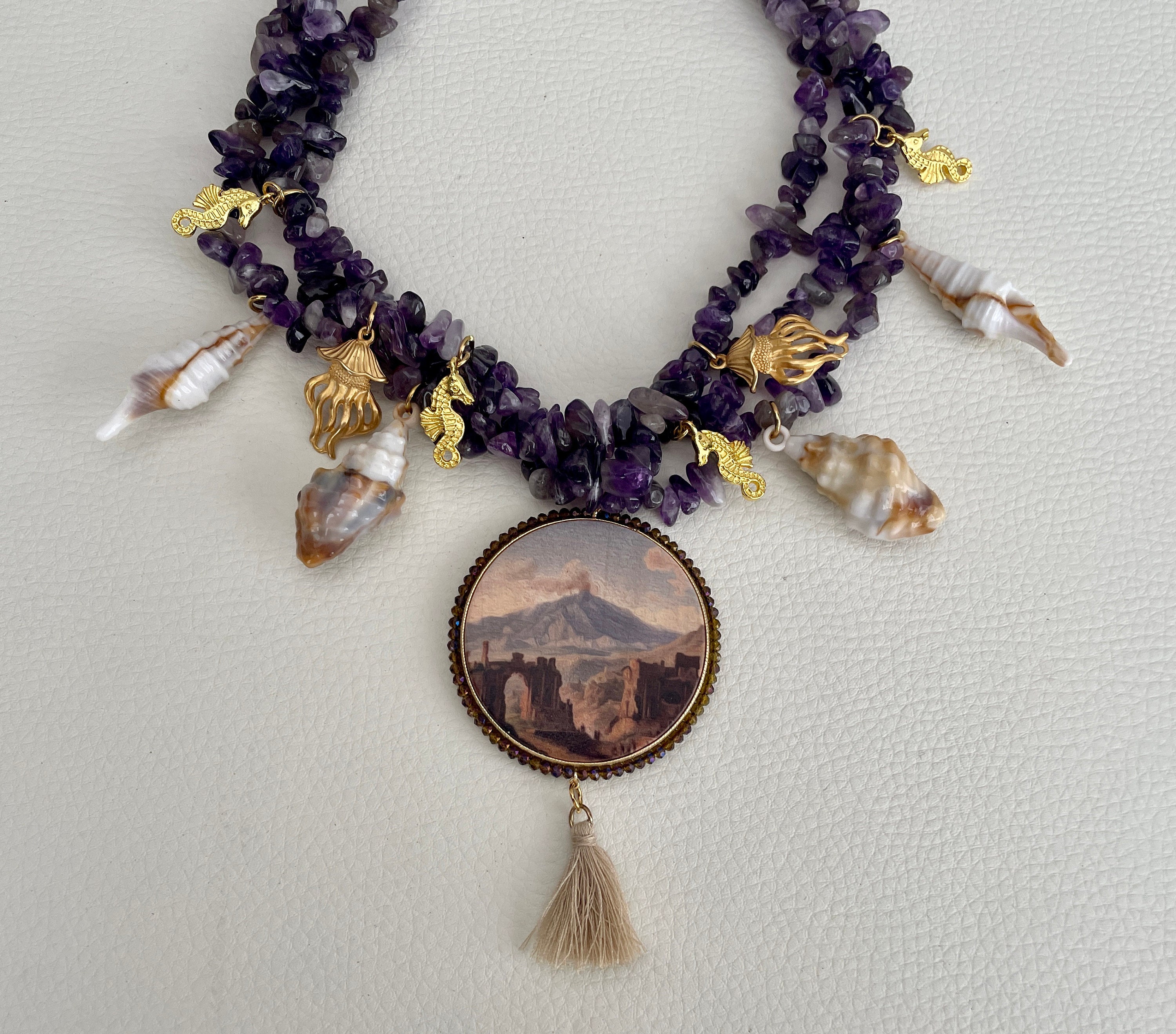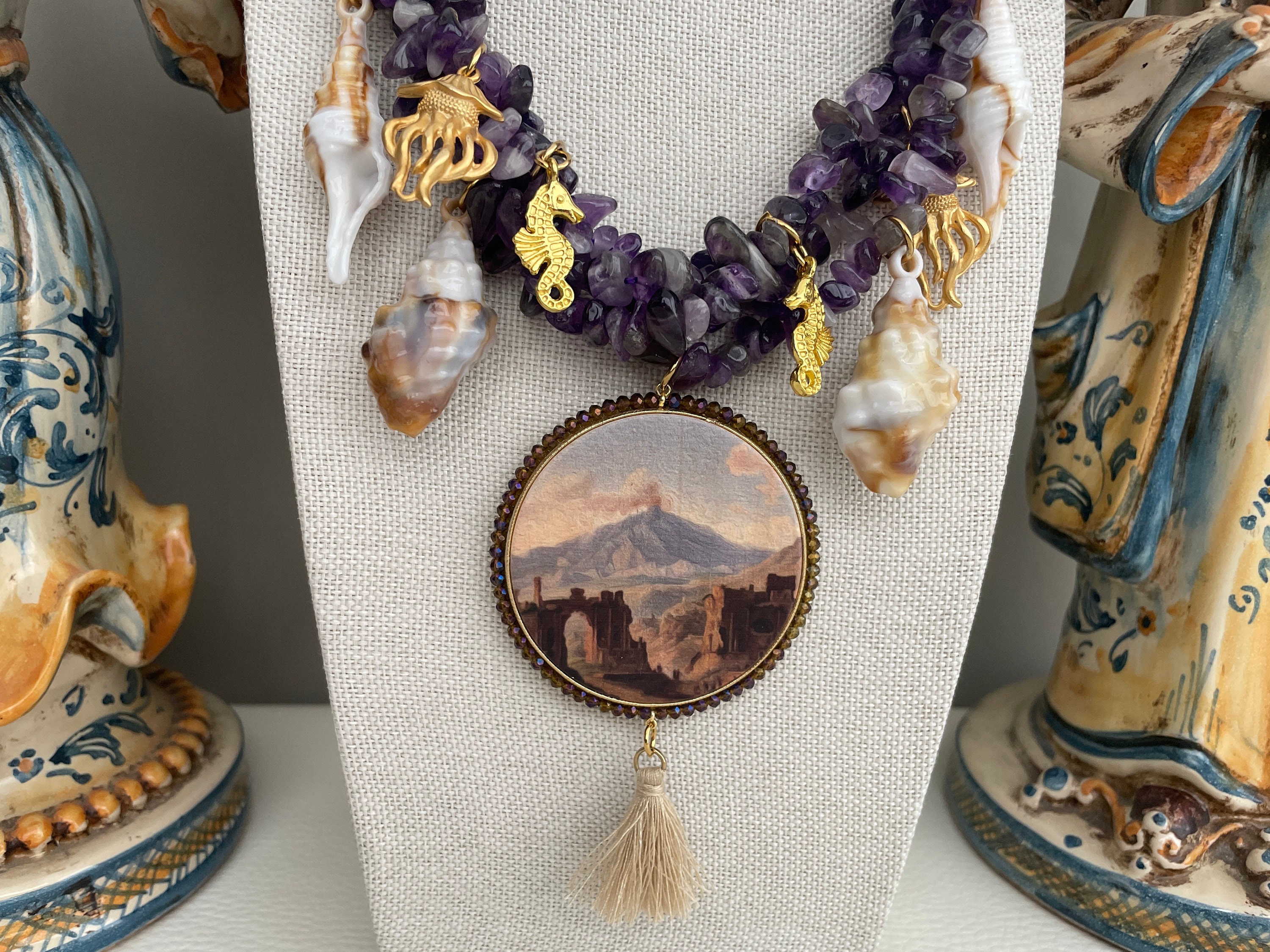 Un grande ciondolo di legno tondo raffigurante una riproduzione del Vulcano Etna visto dal Teatro Greco di Taormina pende centralmente dal girocollo.