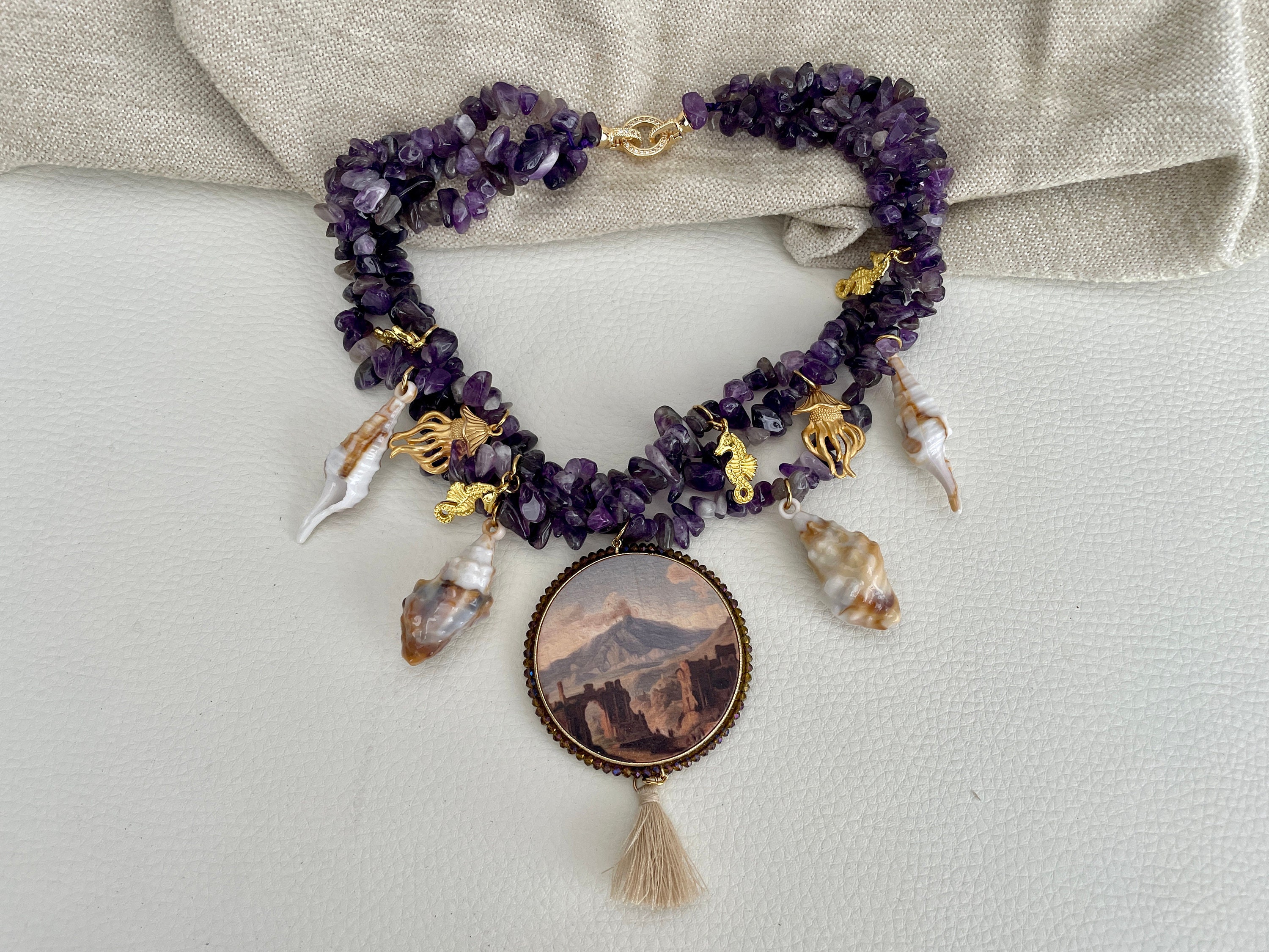 Collana siciliana di grande effetto, realizzata con tre fili di chips di Ametista e una bella chiusura gioiello a scatto in acciaio oro e zirconi.