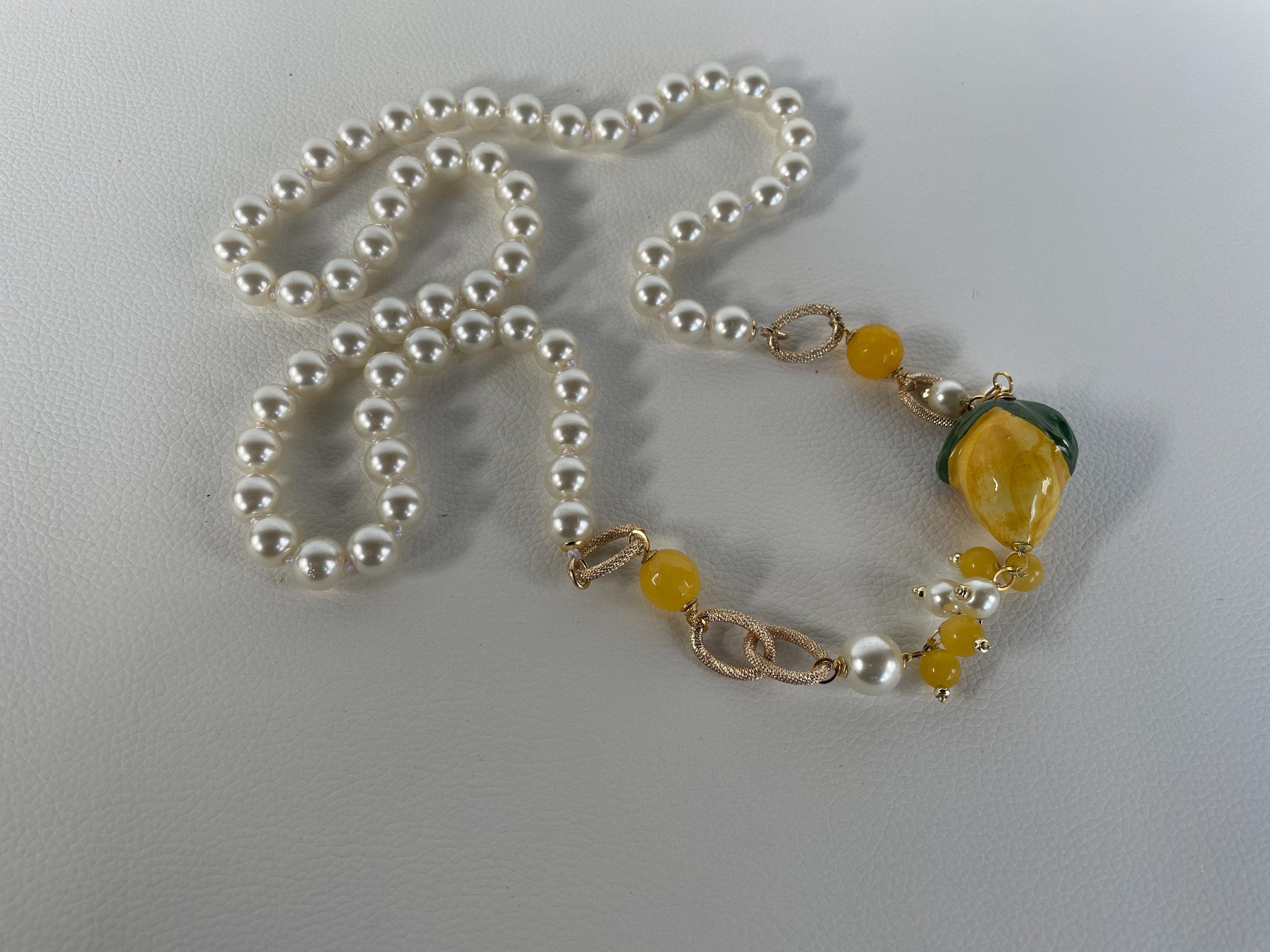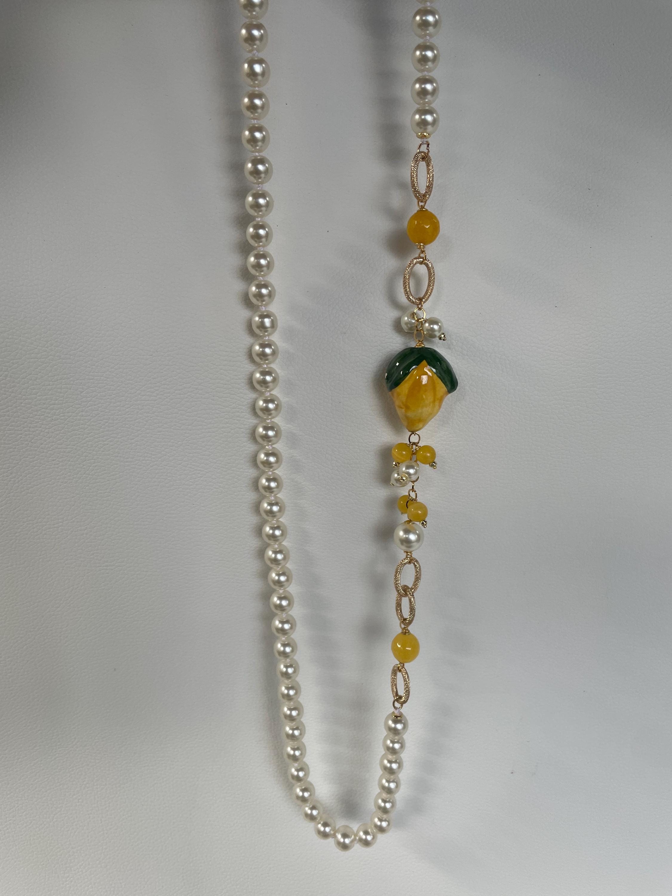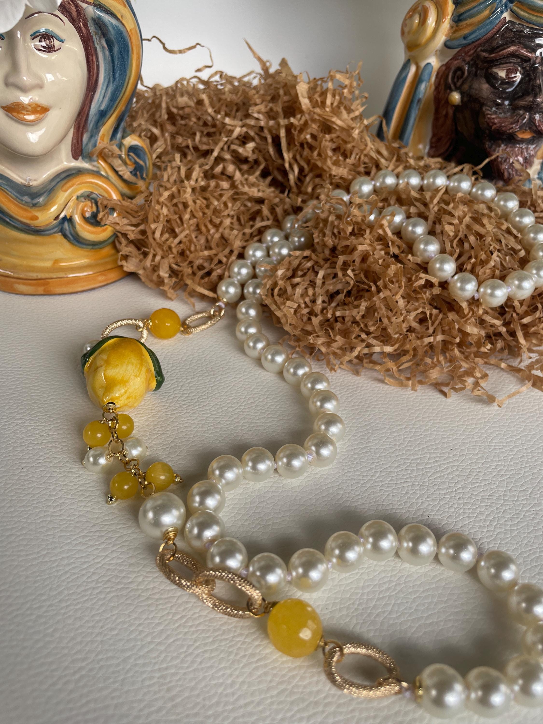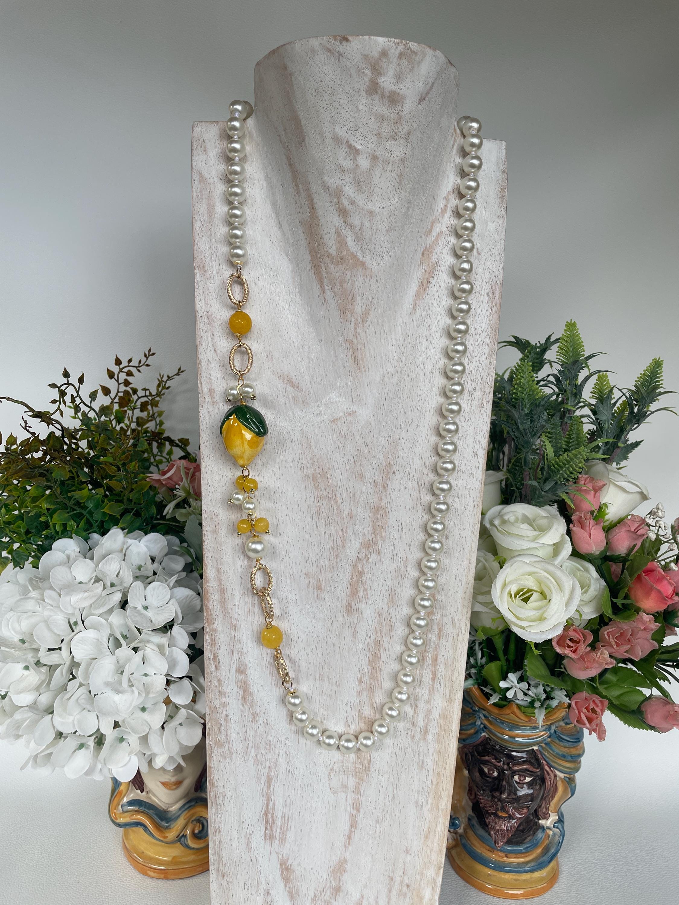 Un grande limone di ceramica di Caltagirone che si combina con un filo di perle Maiorca, annodate a mano, e arricchite da un grappolo di perle, Agata e Occhio di gatto gialli.
