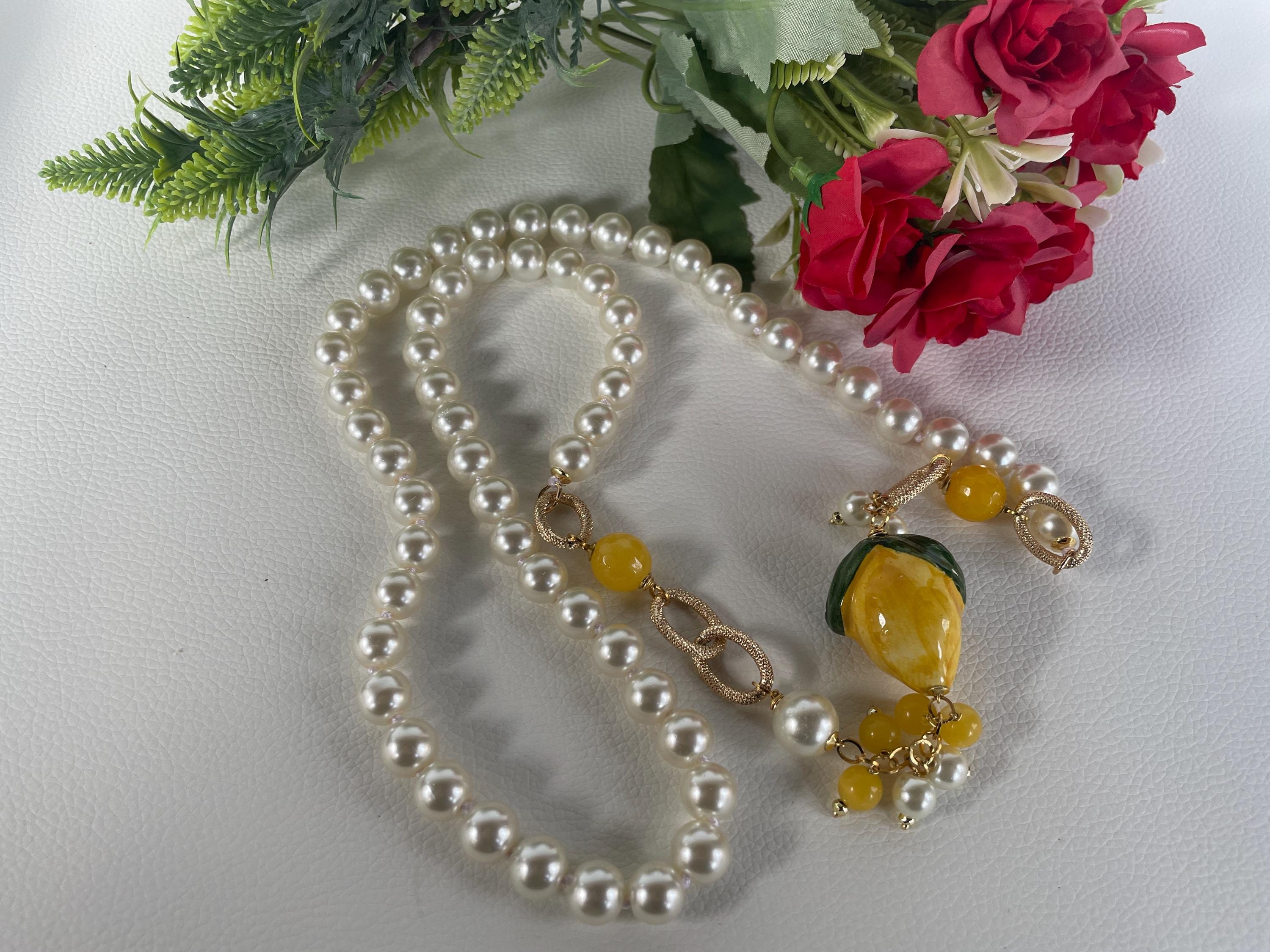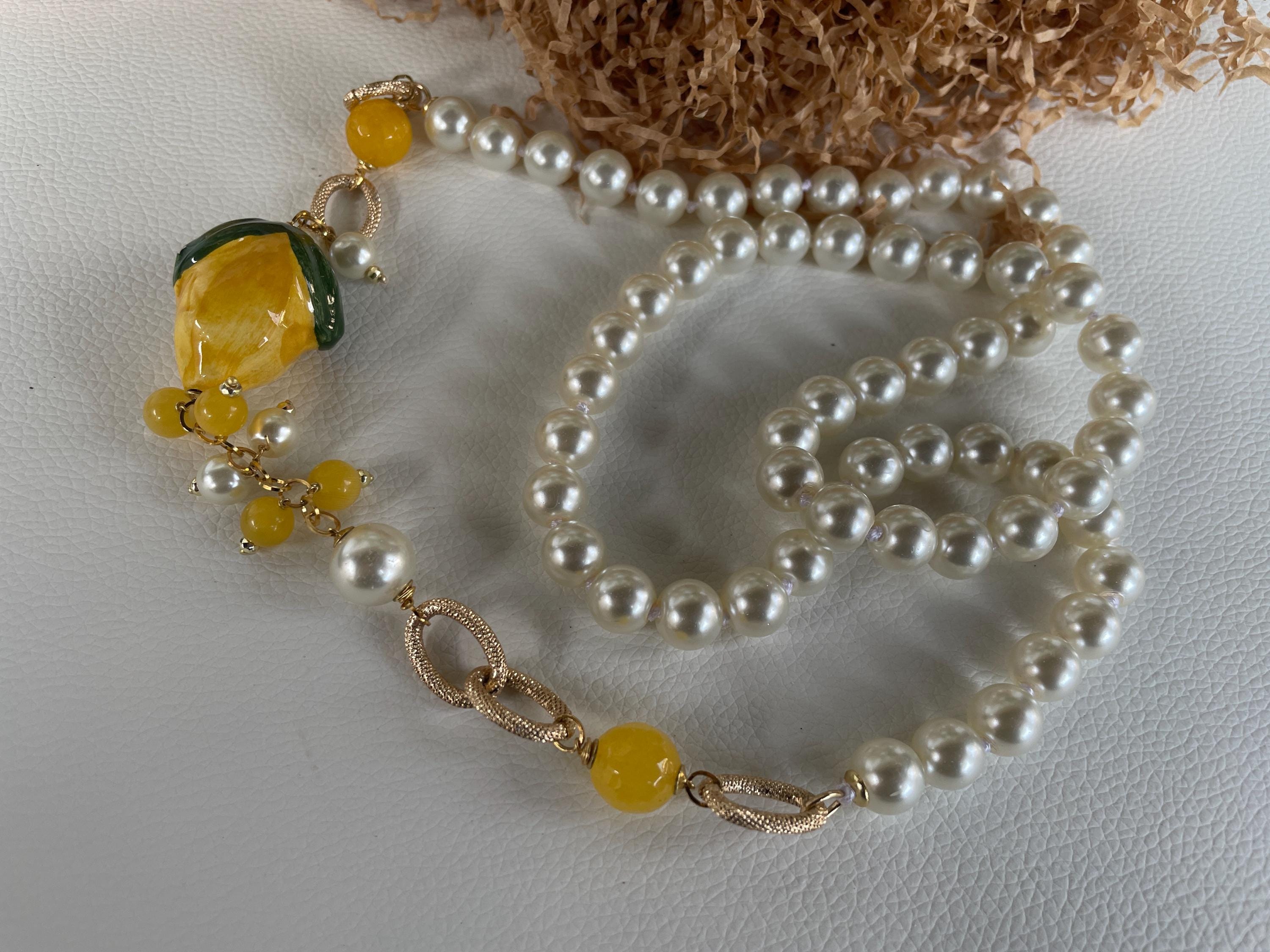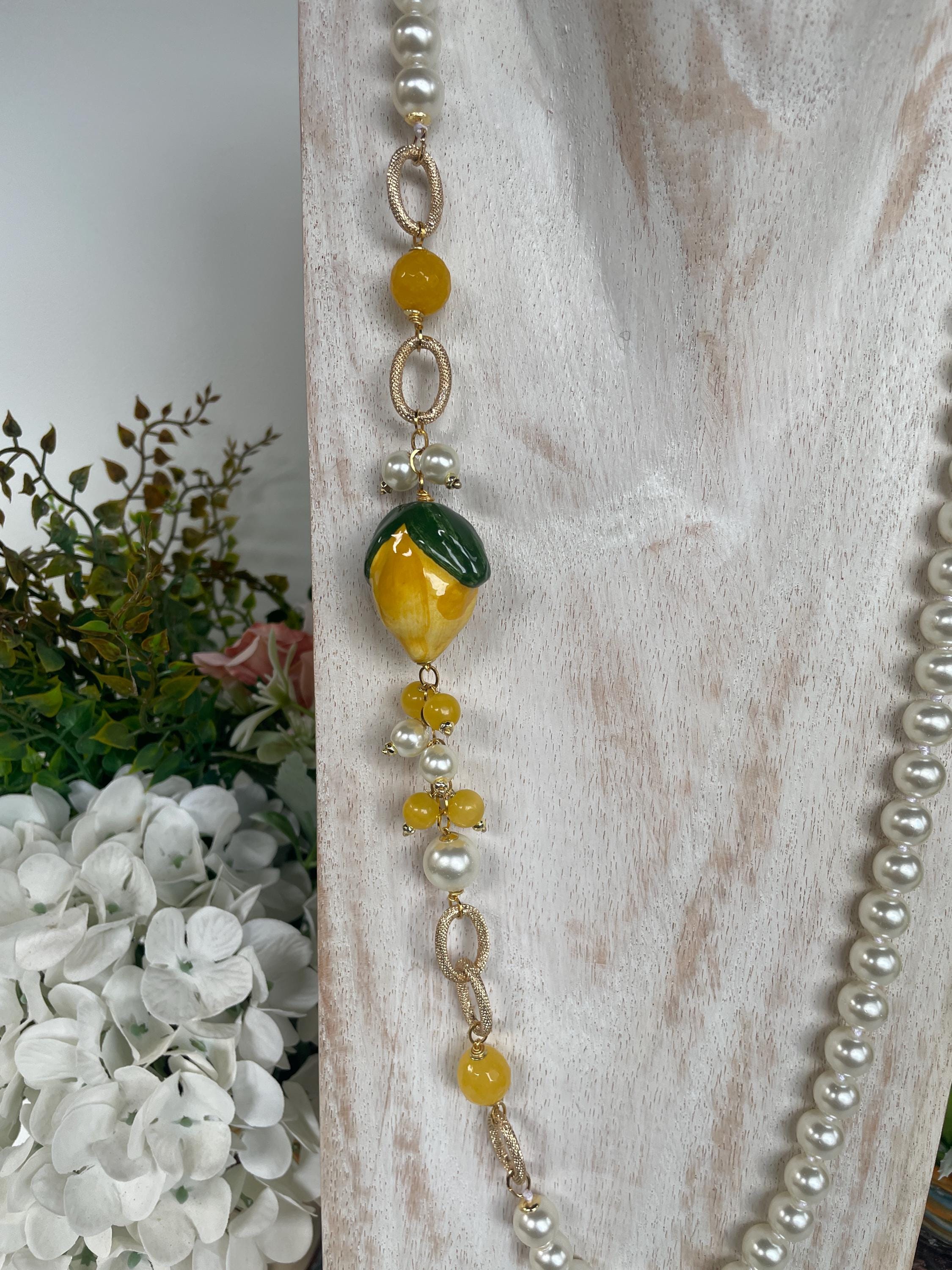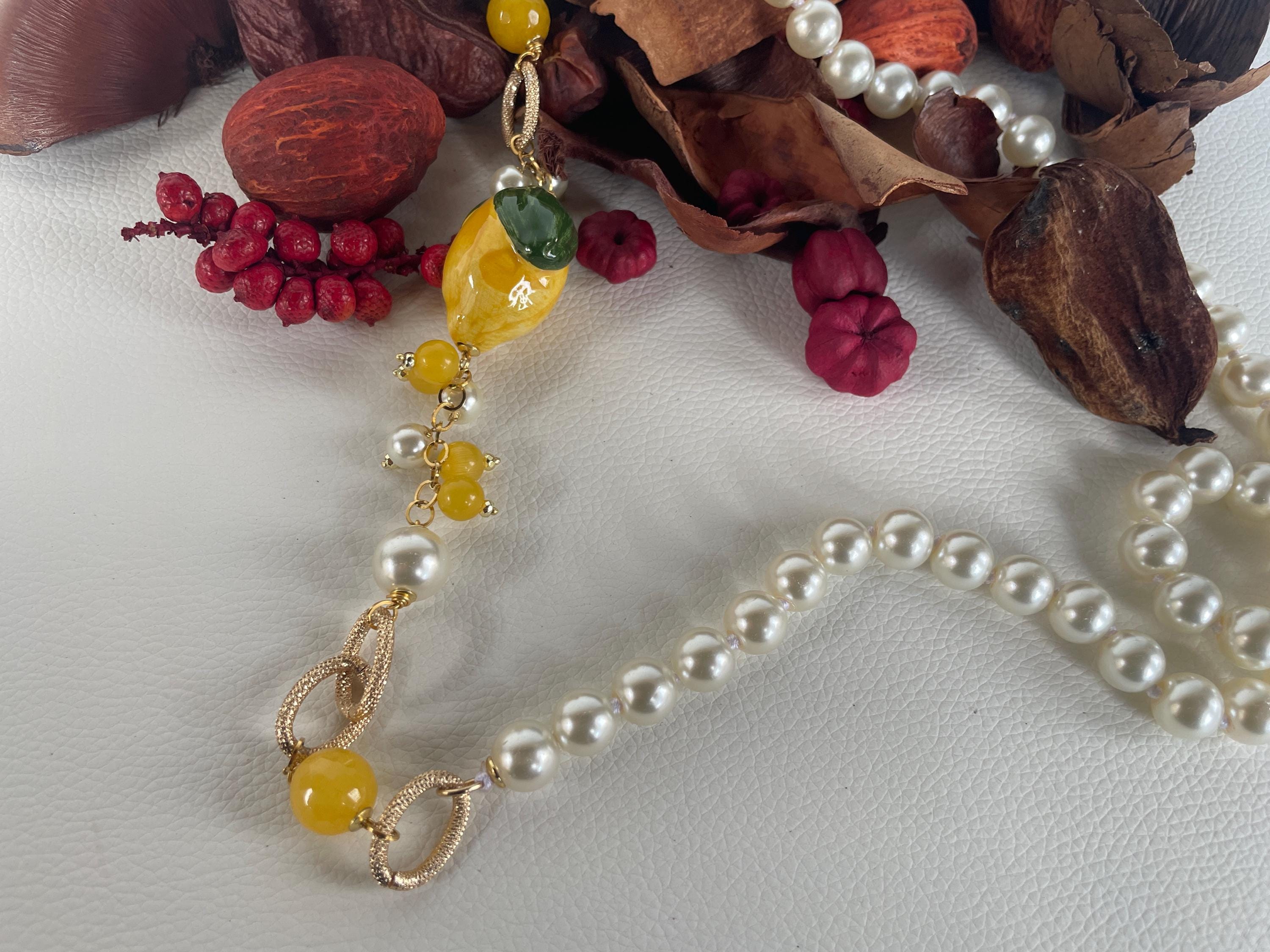Un grande limone di ceramica di Caltagirone che si combina con un filo di perle Maiorca, annodate a mano, e arricchite da un grappolo di perle, Agata e Occhio di gatto gialli.