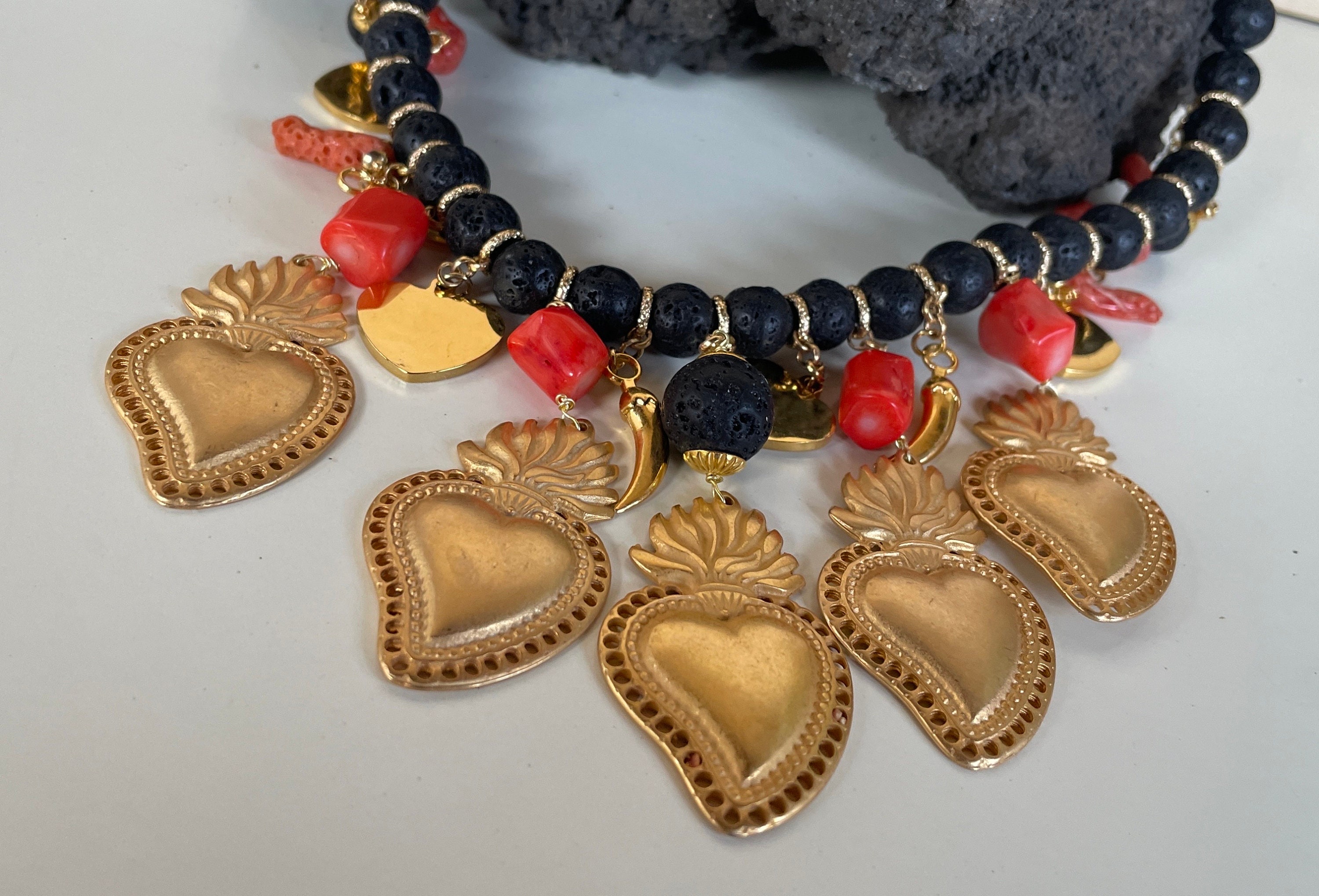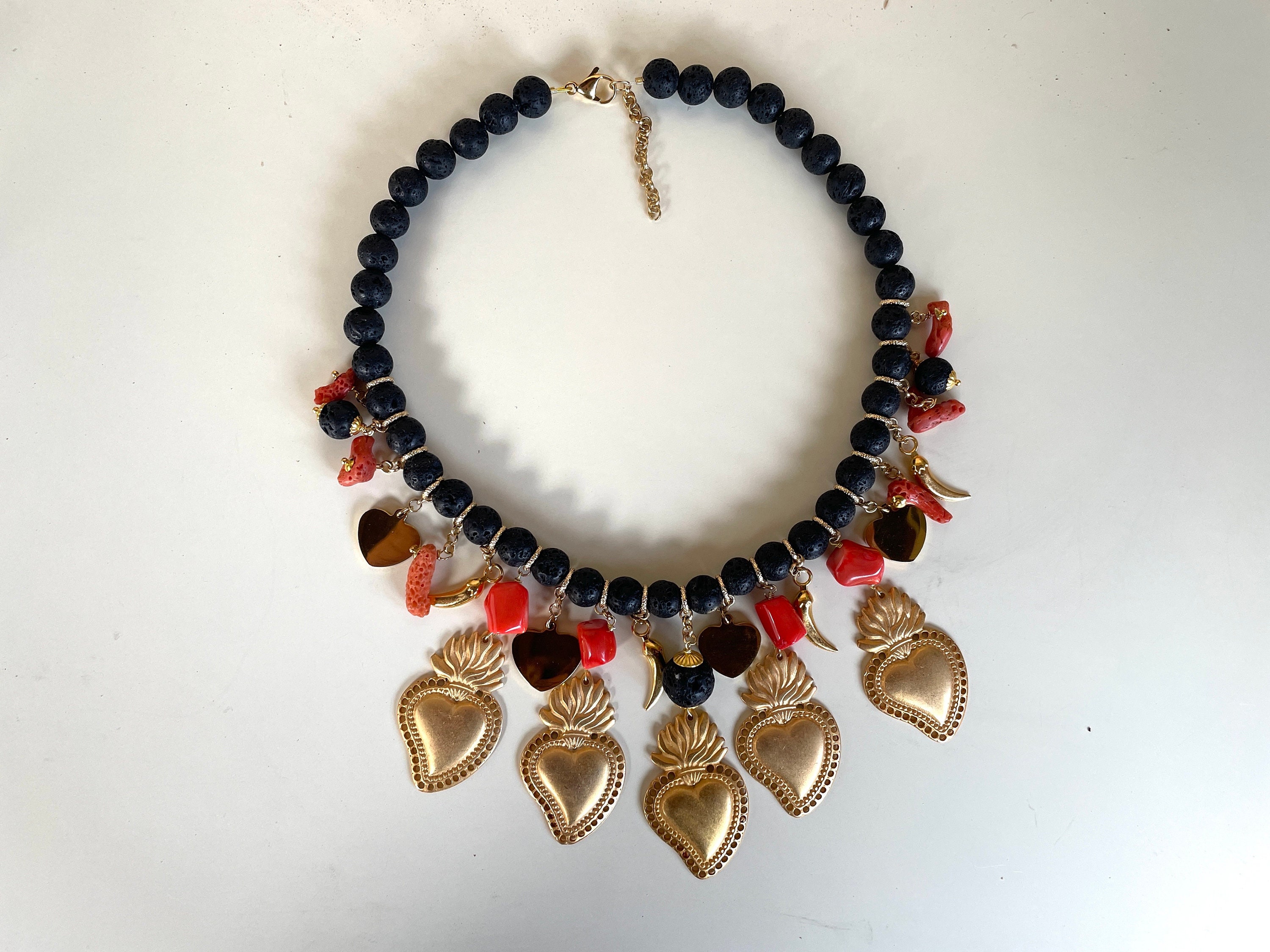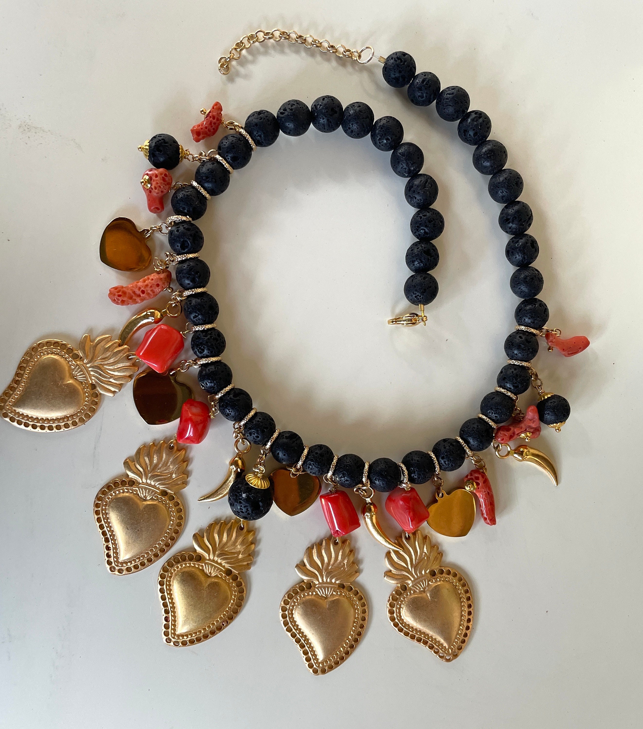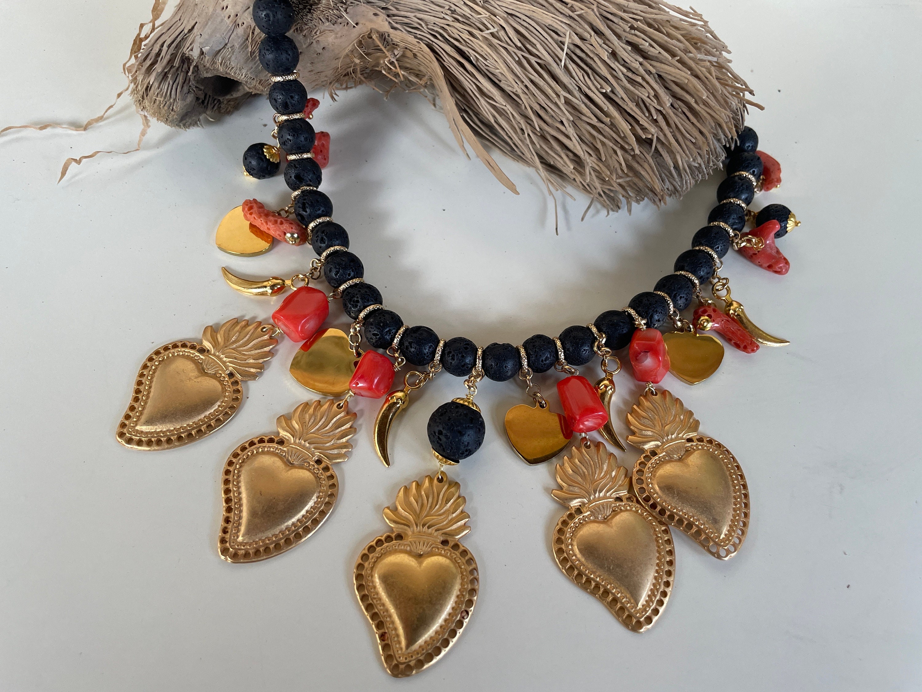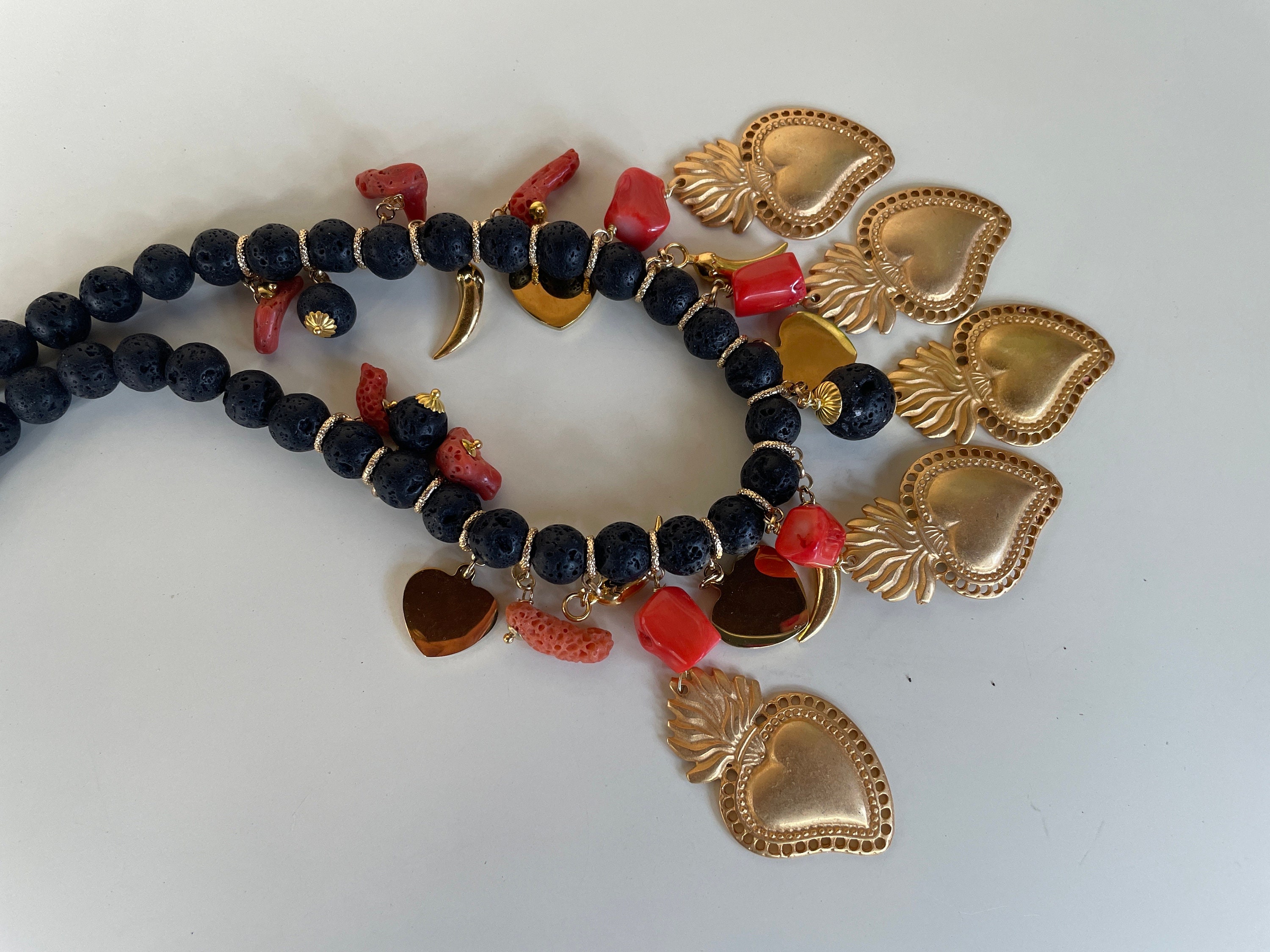 Realizzata con un bel filo di perle di lava da cui pendono numerosi ciondoli progressivi e misti: 5 grandi Cuori Sacri di Zama oro, pezzi di corallo autentico del mediterraneo, pezzi di corallo bambu rosso, charms assortiti in acciaio inossidabile. Un tripudio di ciondoli simbolici per una collana ricca e avvolgente.