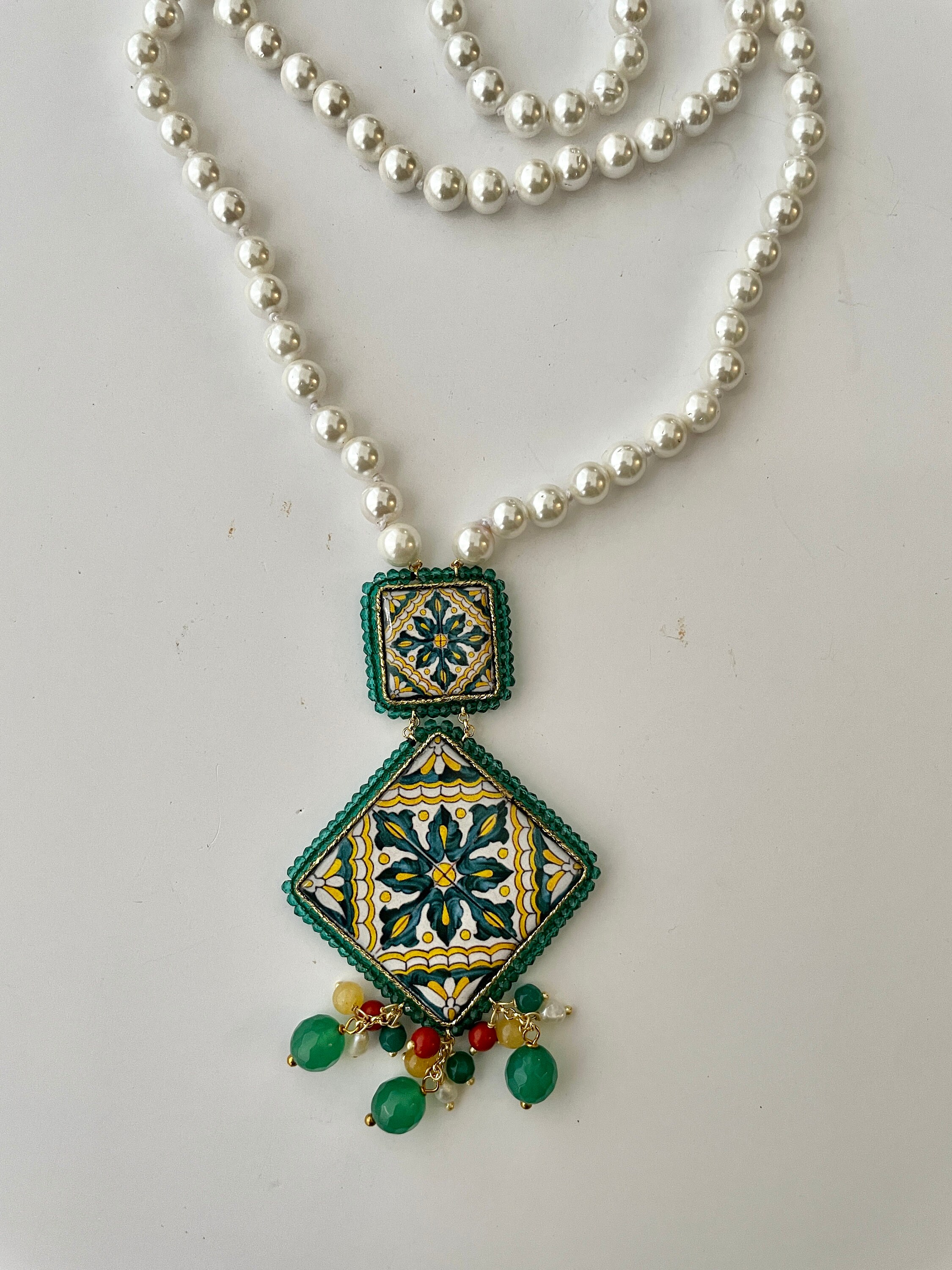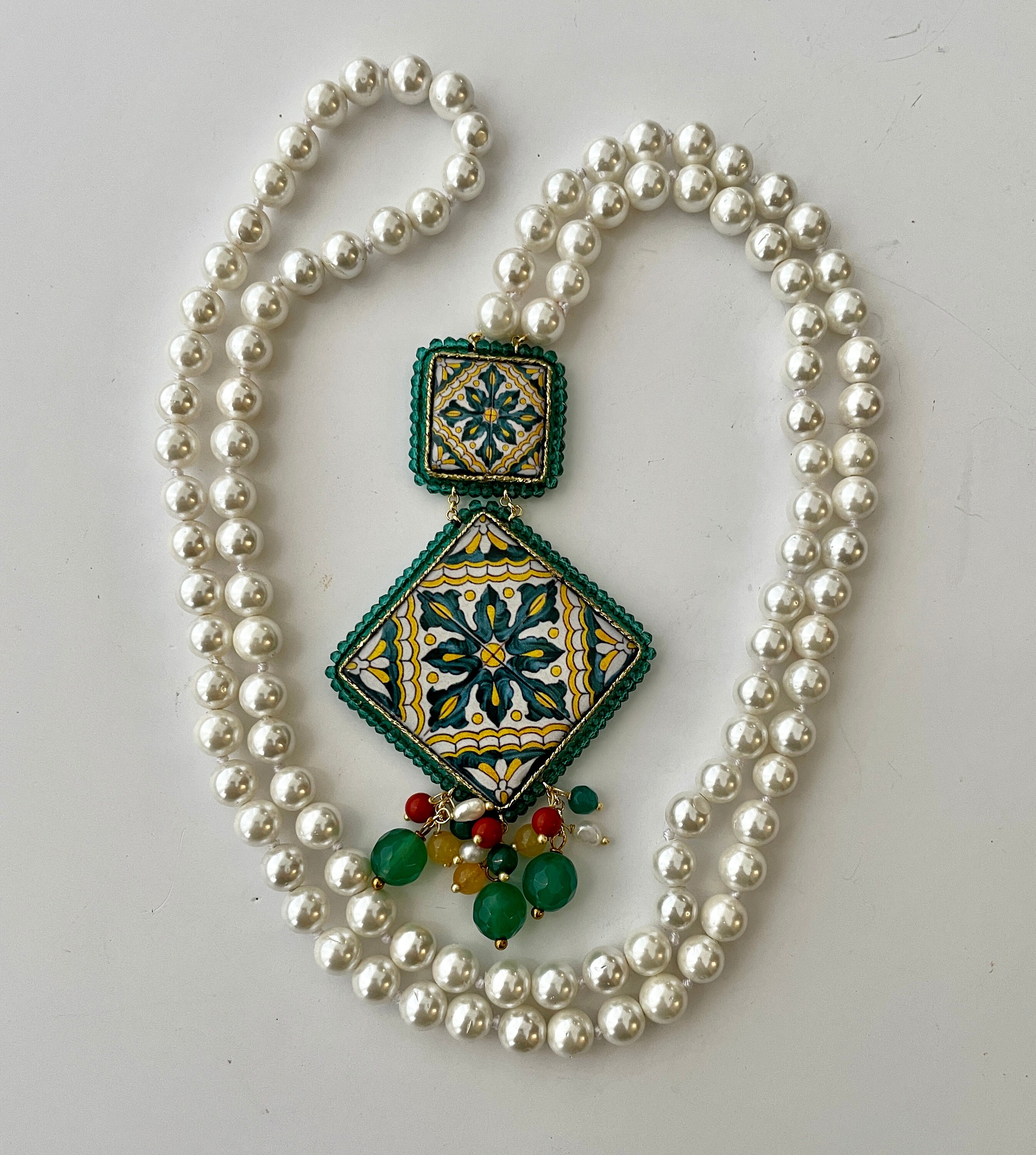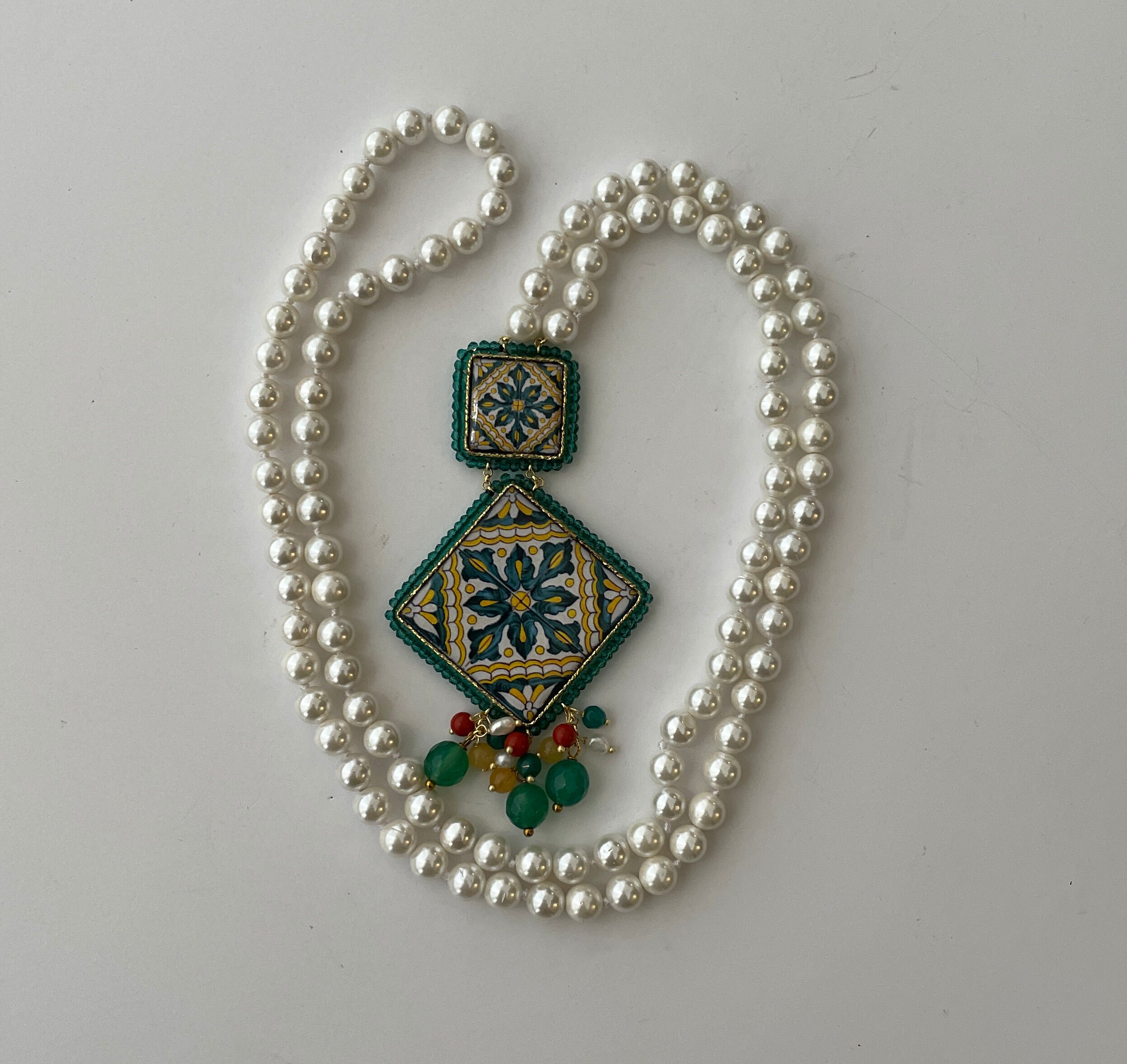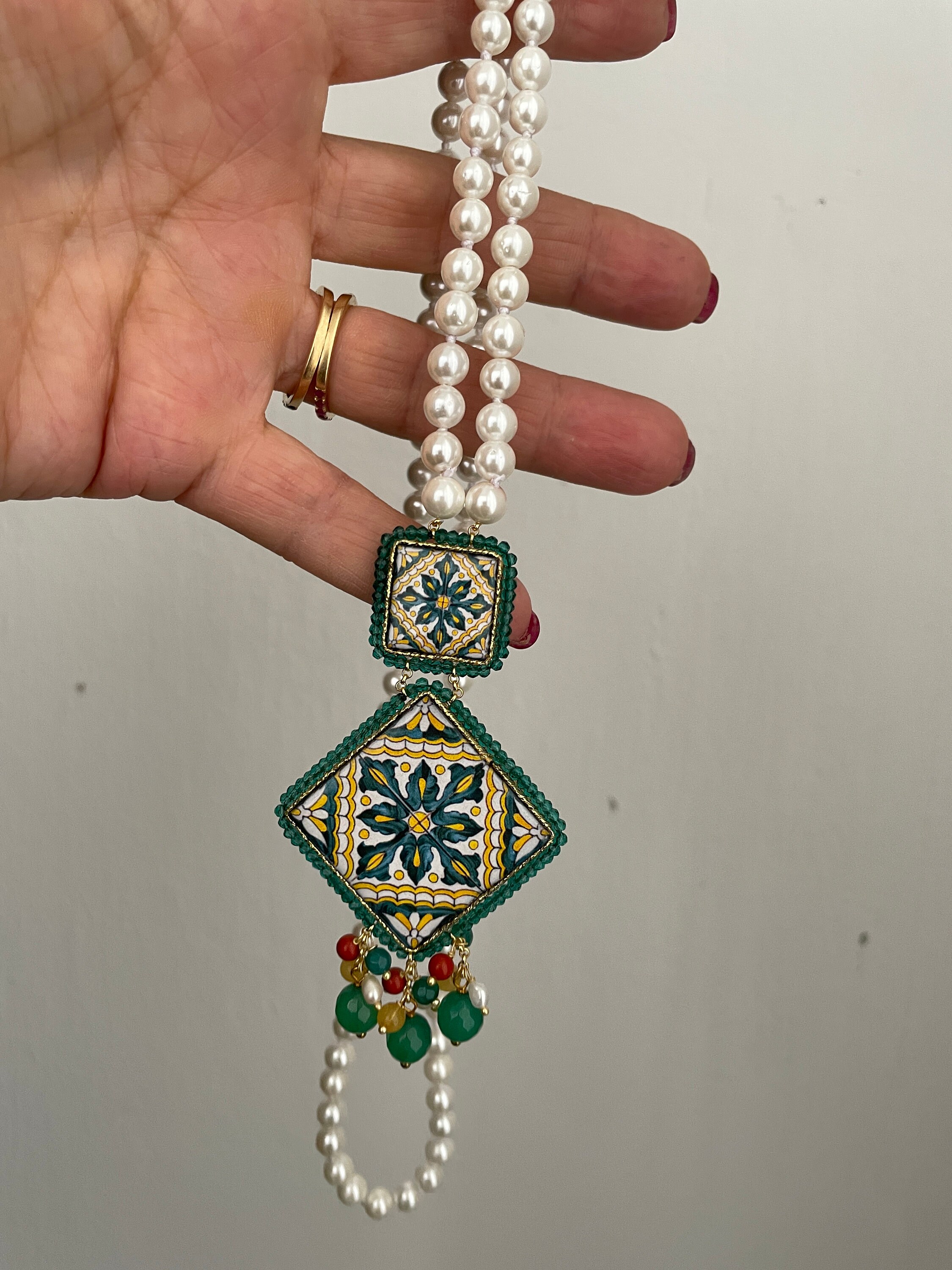 Delicata collana artigianale, realizzata con un filo di perle Maiorca, singolarmente annodate, e pendenti due mattonelle di Ceramica di Caltagirone.