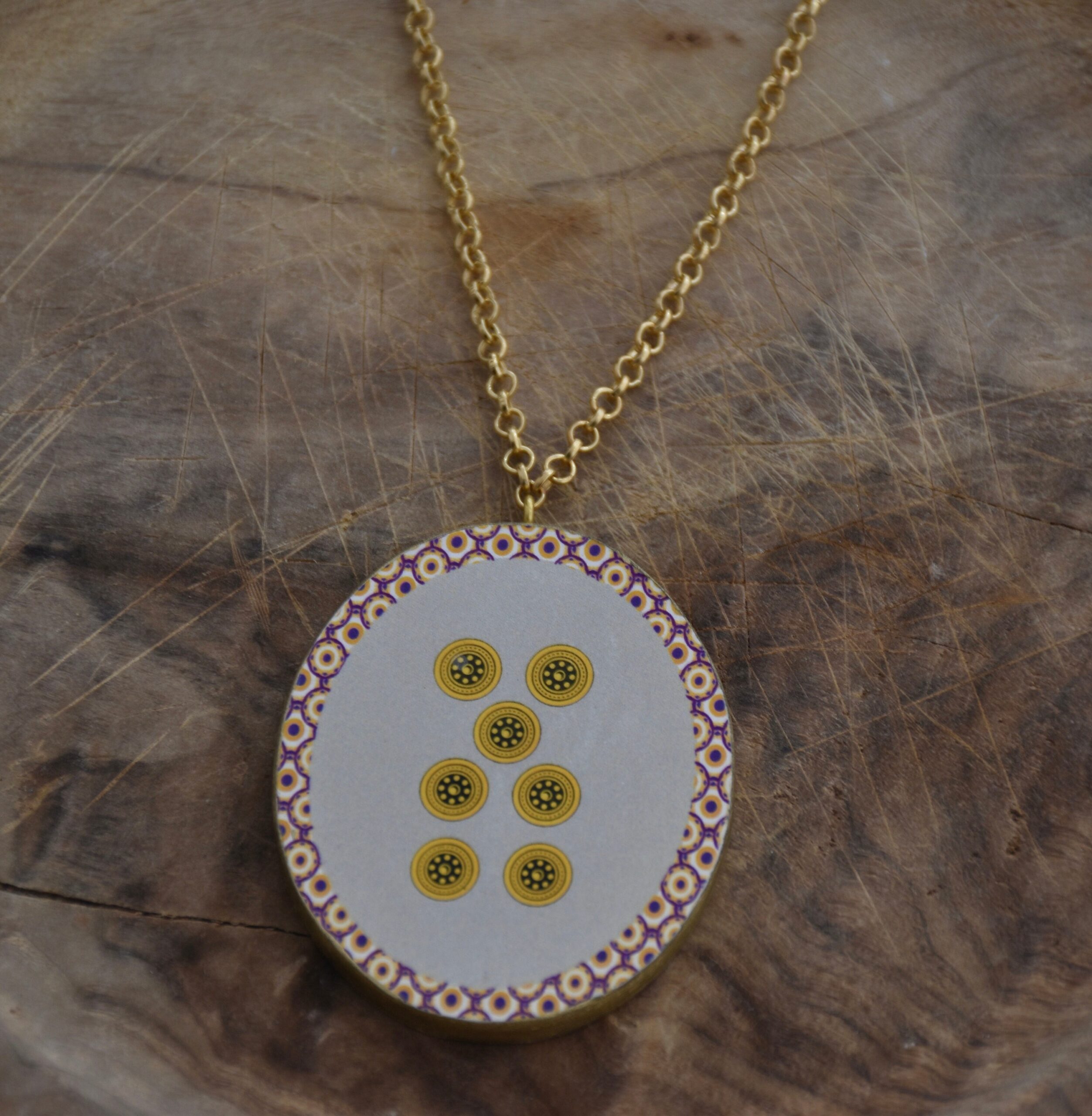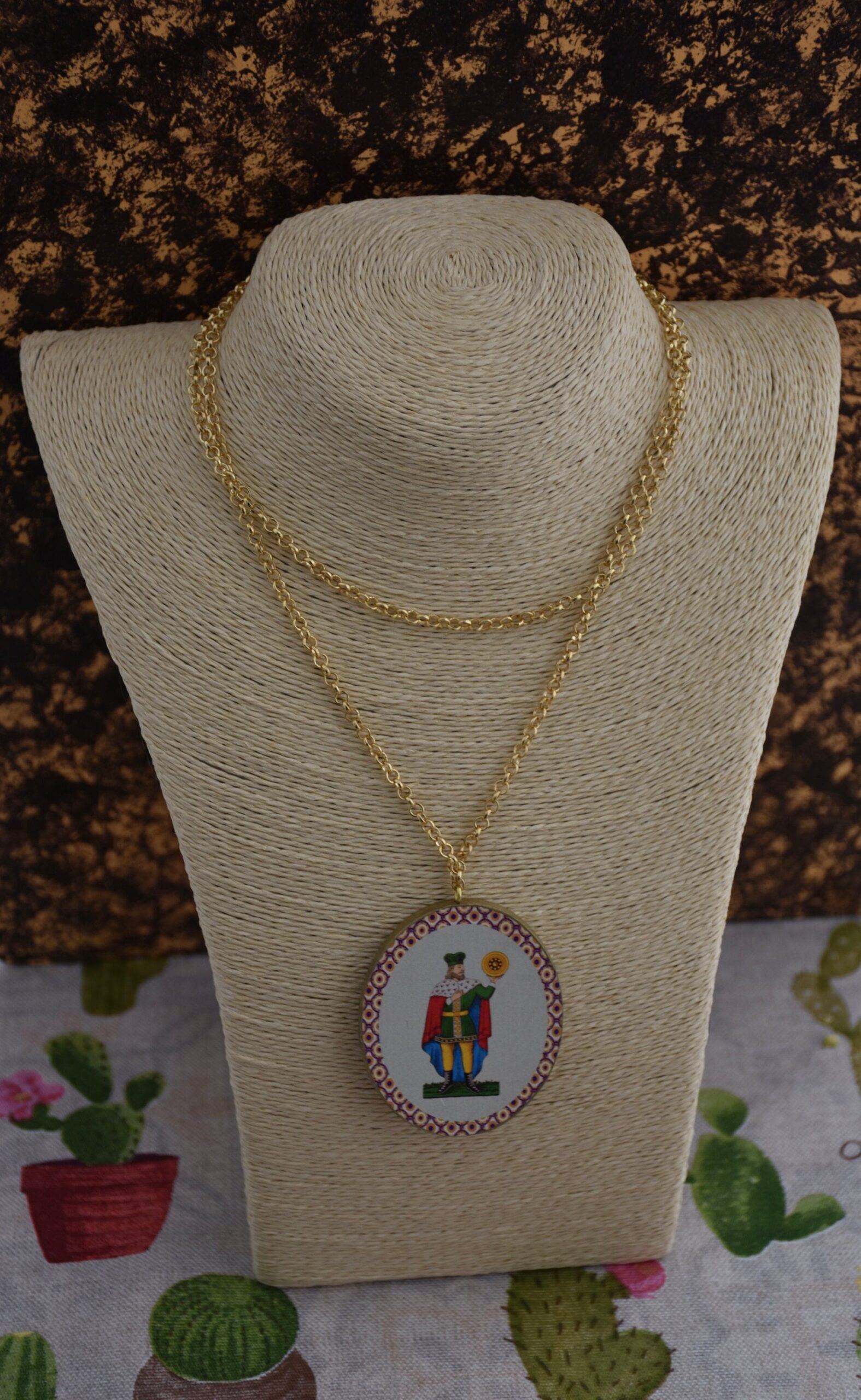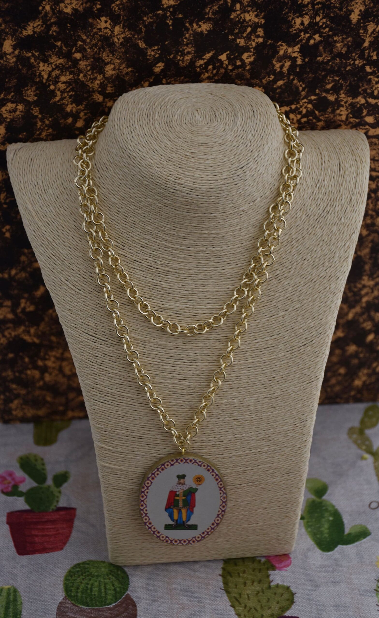 Collana molto originale con un grande ciondolo quadrato “double-face” raffigurante due carte siciliane simboli della fortuna: il settebello e il re d’oro.