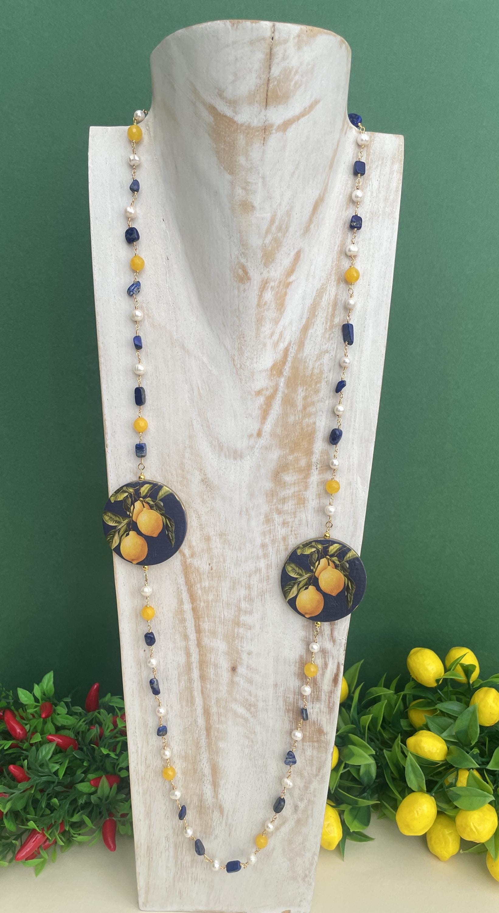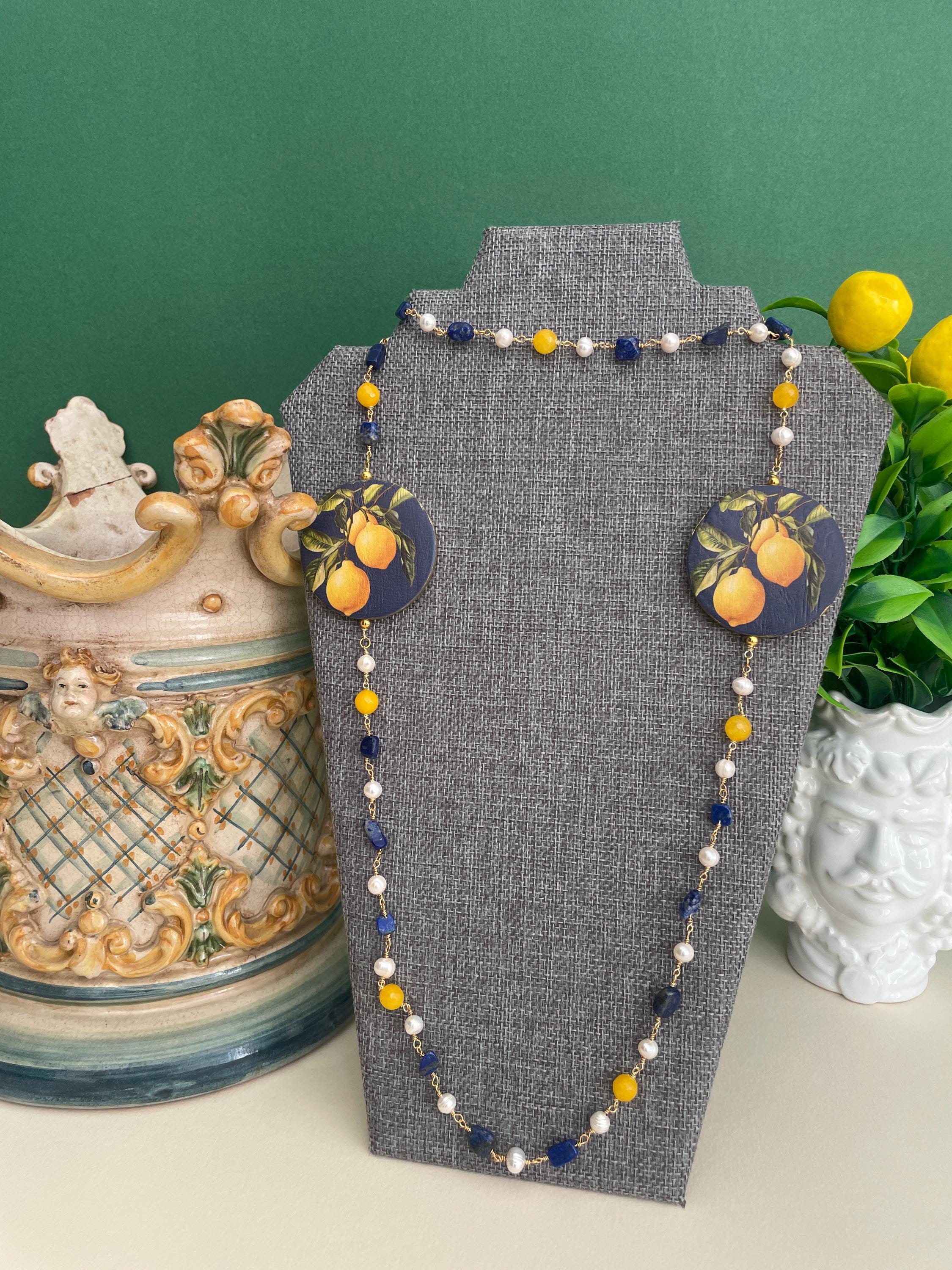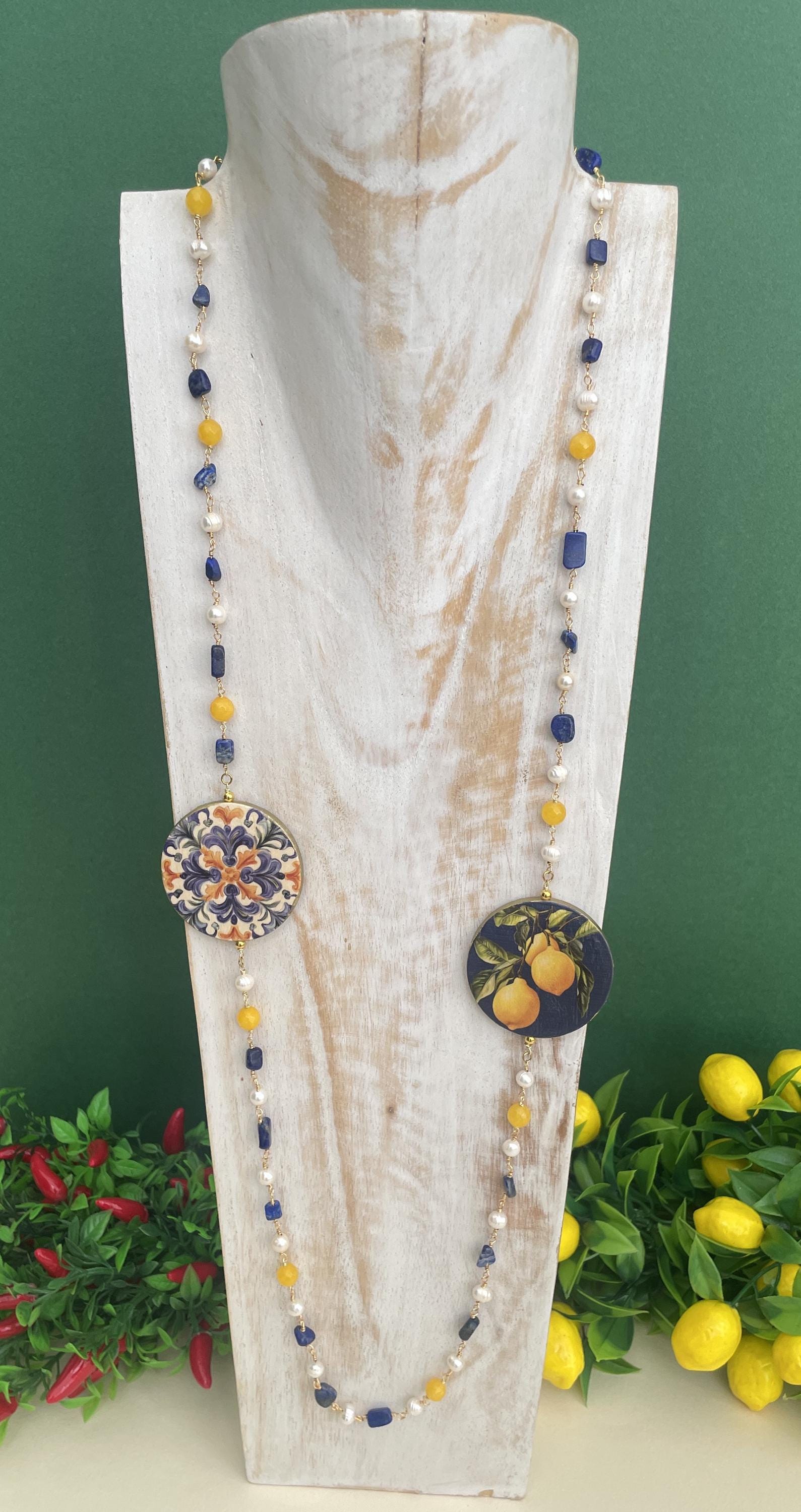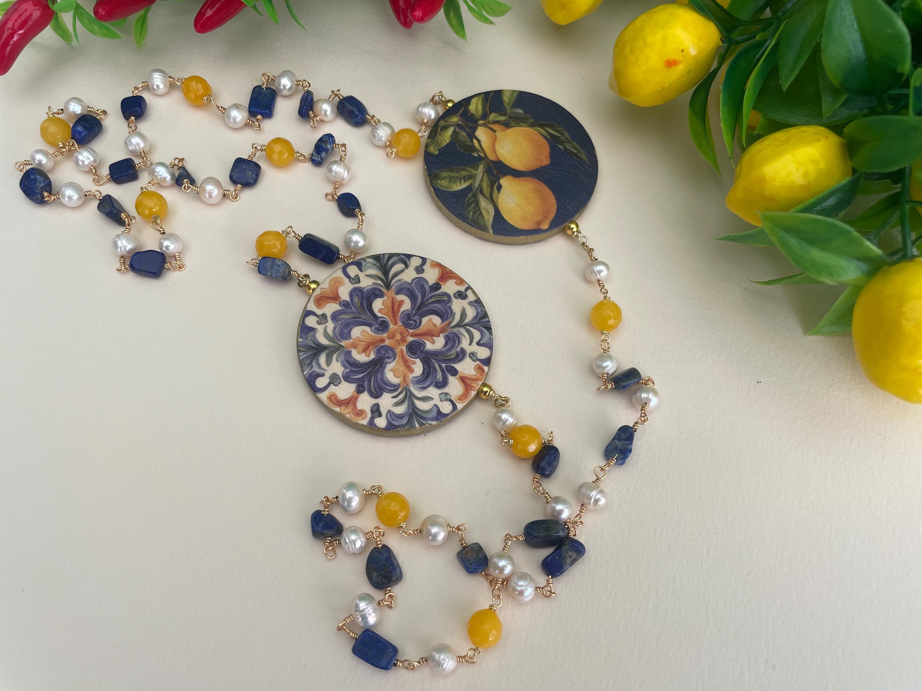 Collana lunghissima con catena rosario formata da sassi burattati di Lapislazzuli, perle di Giada gialla e perle di fiume. Due medaglioni di legno double-face arricchiscono la collana imprimendole uno stile tutto siciliano. Infatti raffigurano su un lato un grappolo di limoni su fondo blu e sull’altro una texture con fantasia geometrico-floreale sui toni del giallo e blu che richiamano i decori delle maioliche siciliane.