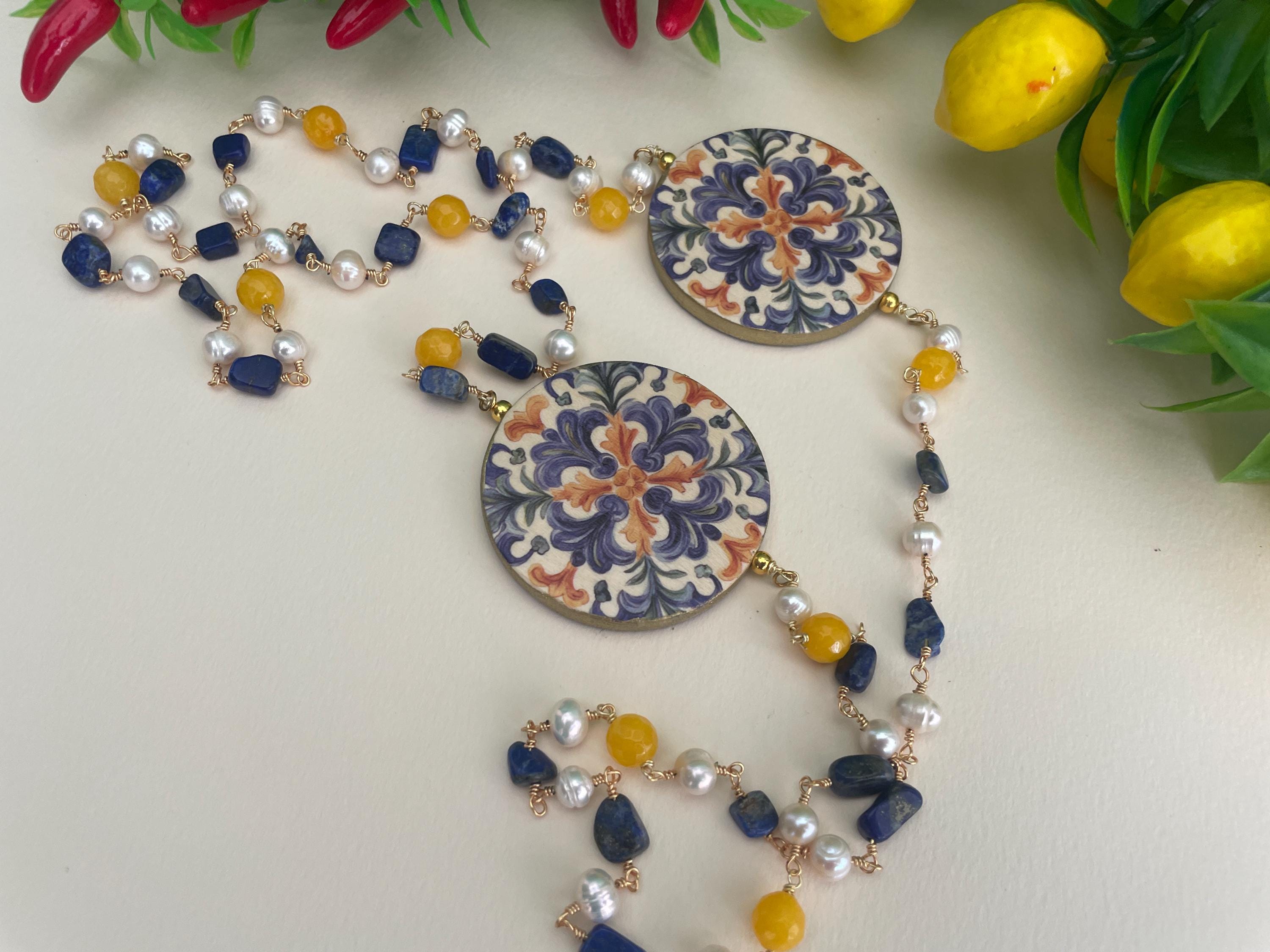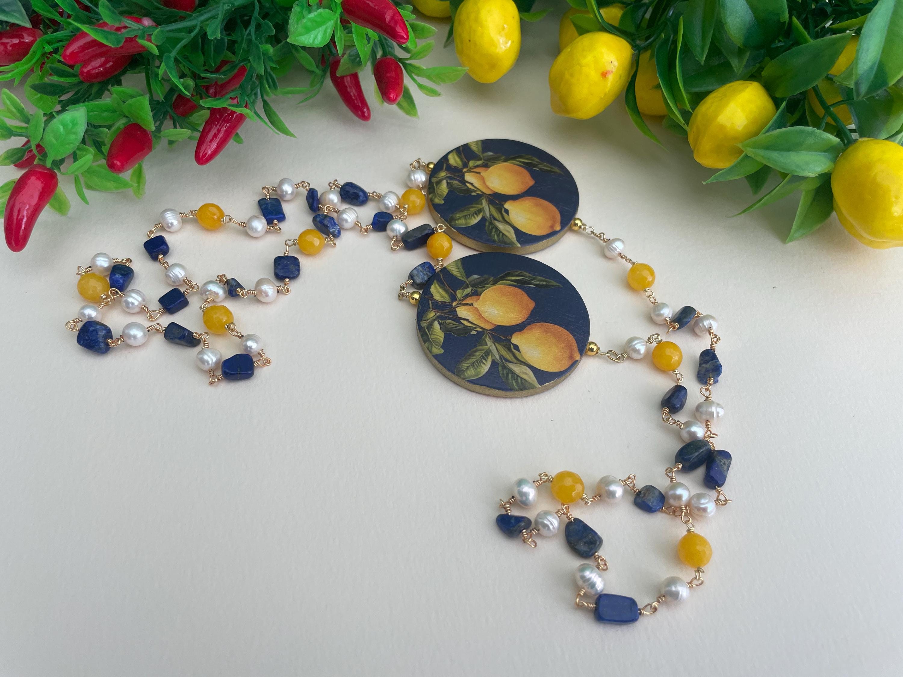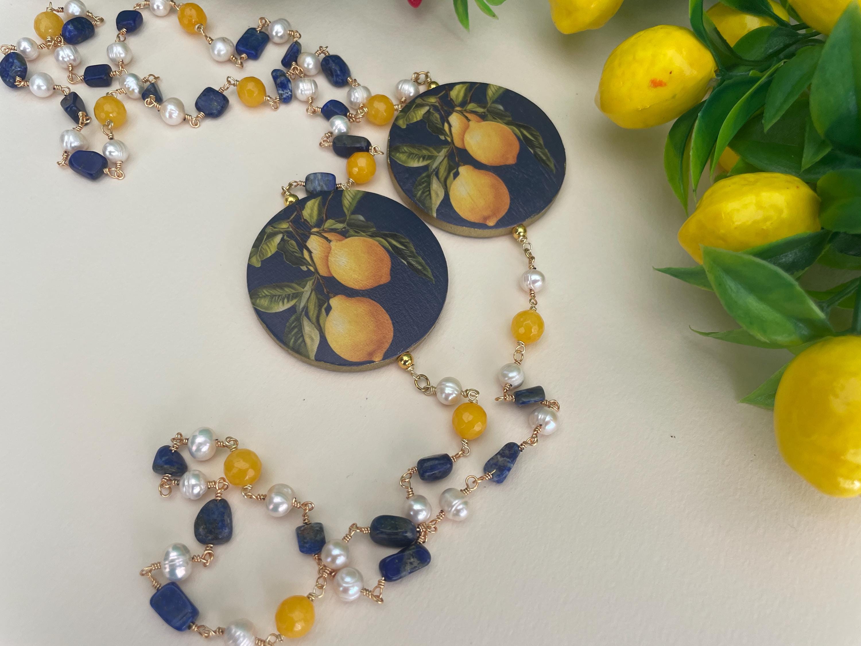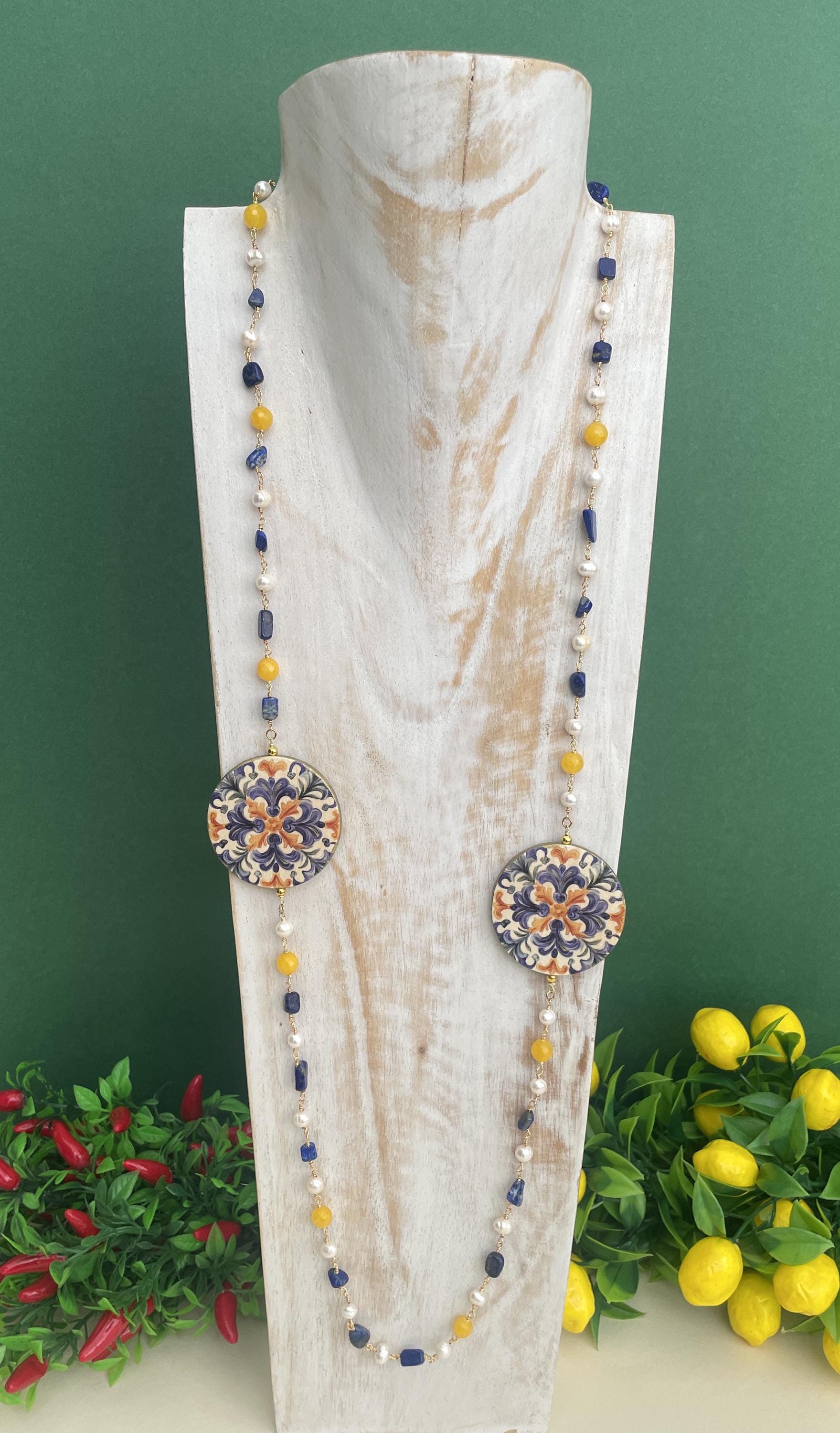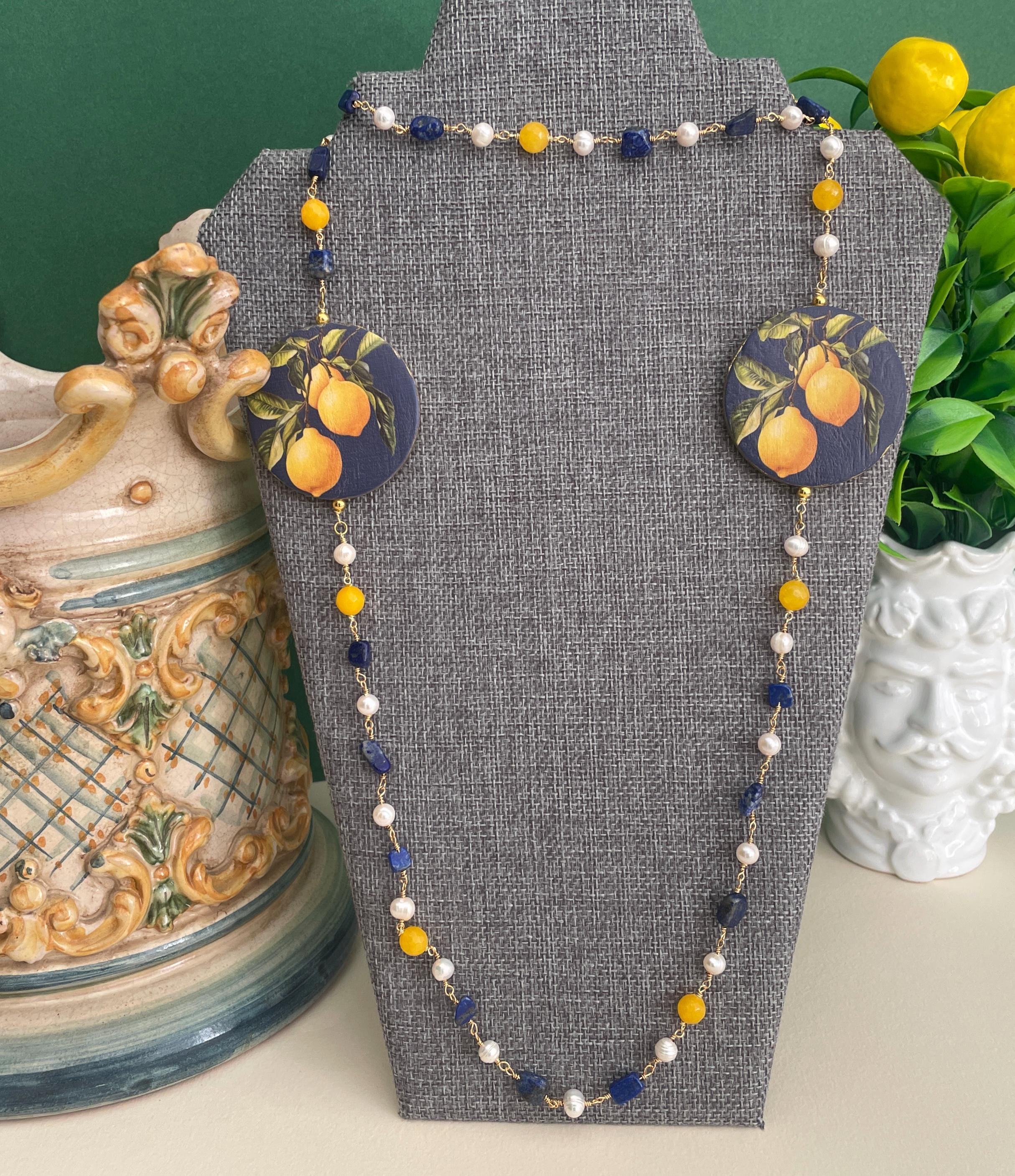 Collana lunghissima con catena rosario formata da sassi burattati di Lapislazzuli, perle di Giada gialla e perle di fiume. Due medaglioni di legno double-face arricchiscono la collana imprimendole uno stile tutto siciliano. Infatti raffigurano su un lato un grappolo di limoni su fondo blu e sull’altro una texture con fantasia geometrico-floreale sui toni del giallo e blu che richiamano i decori delle maioliche siciliane.