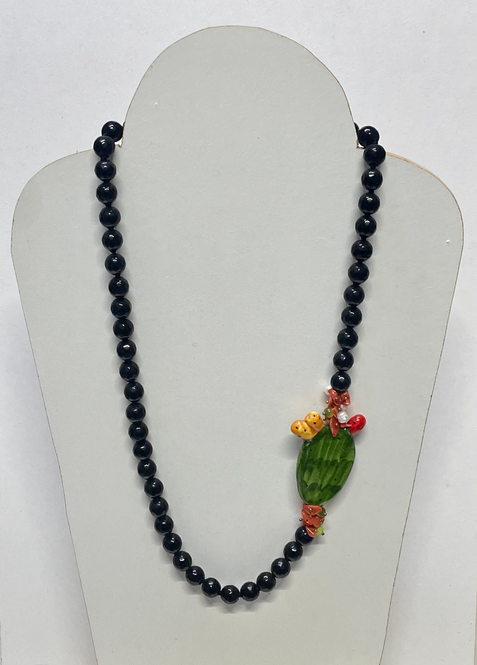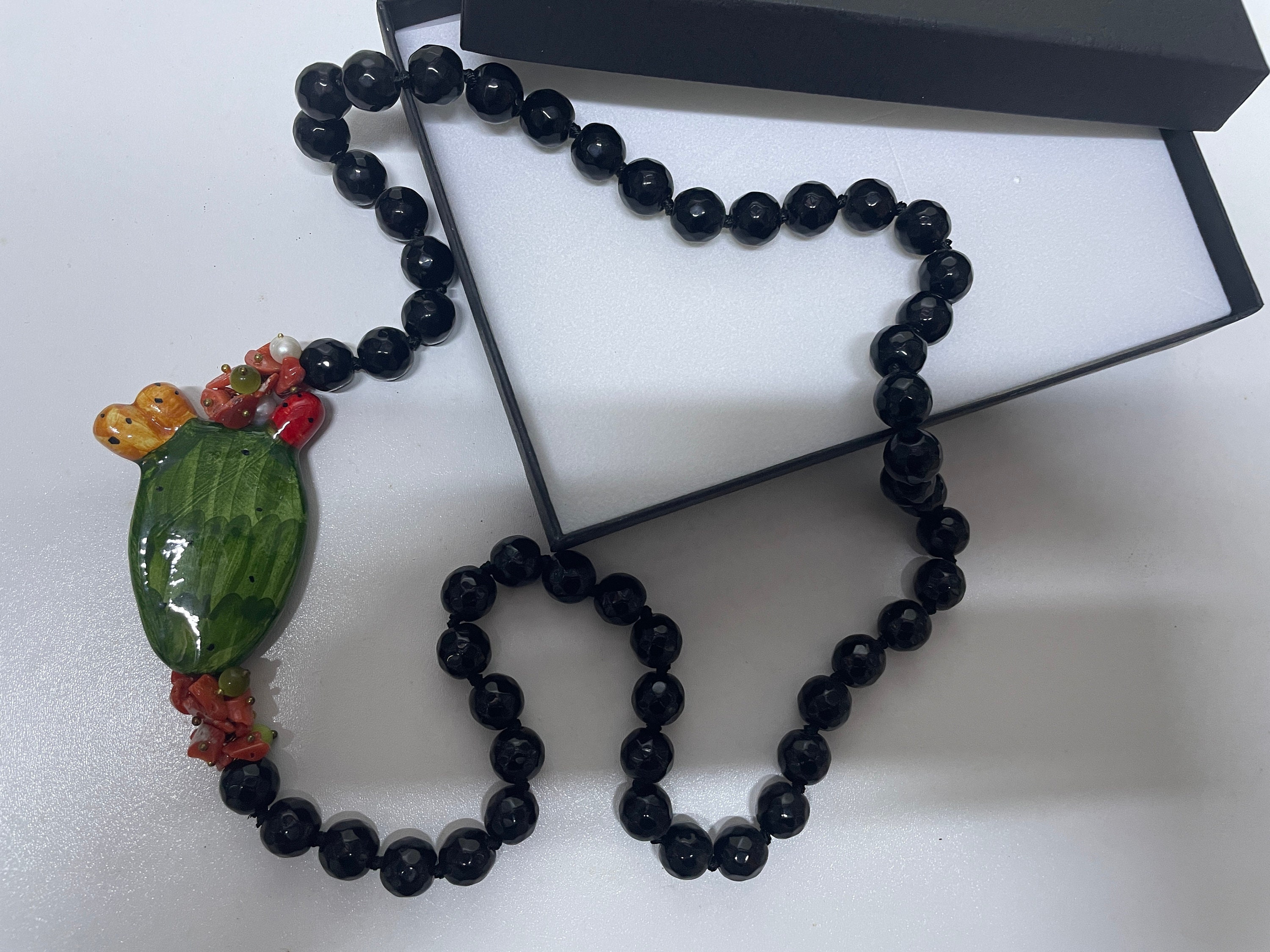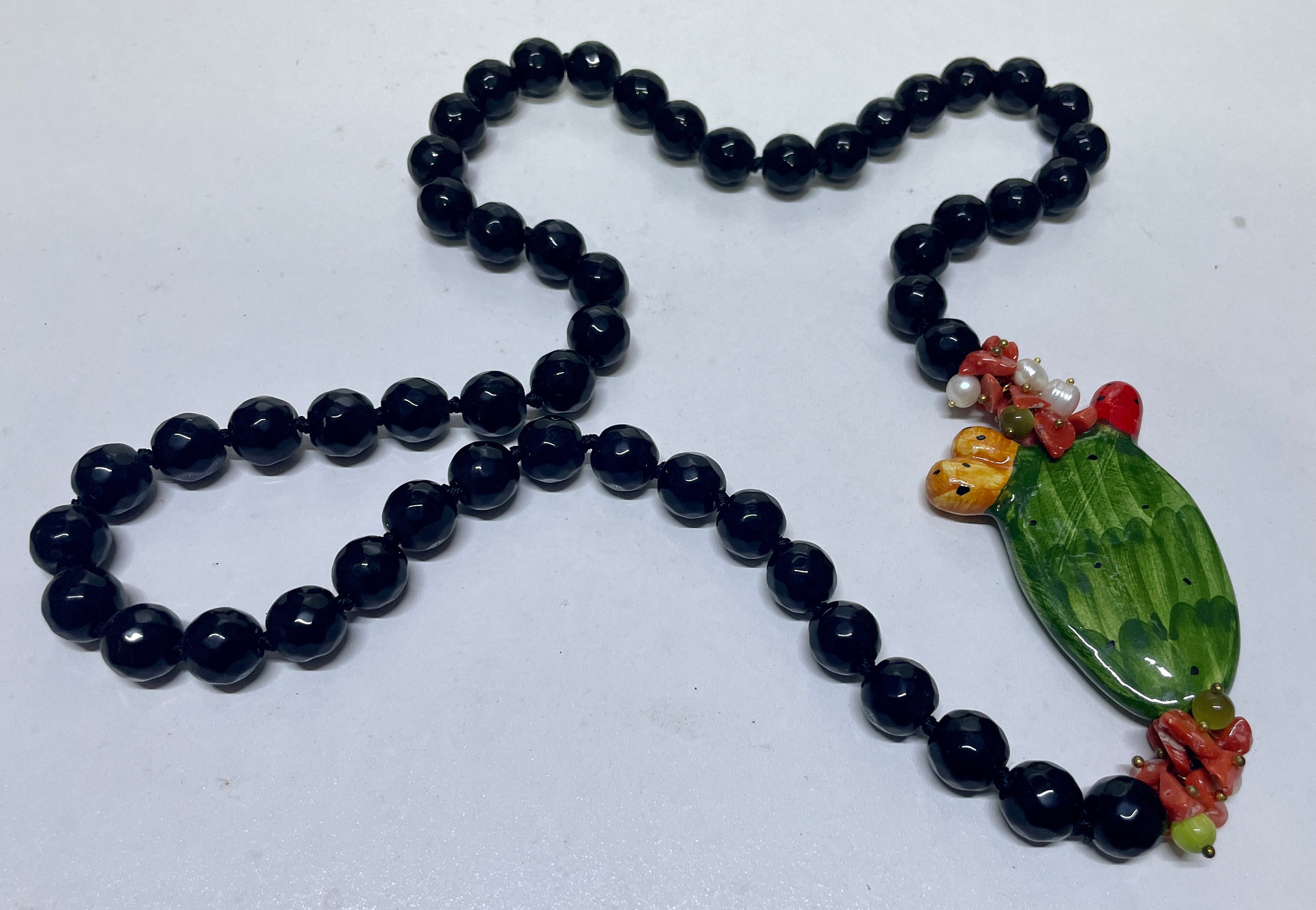 Realizzata con filo di perle di Onice nere, singolarmente annodate, chips di corallo, perle bianche e di agata verde.