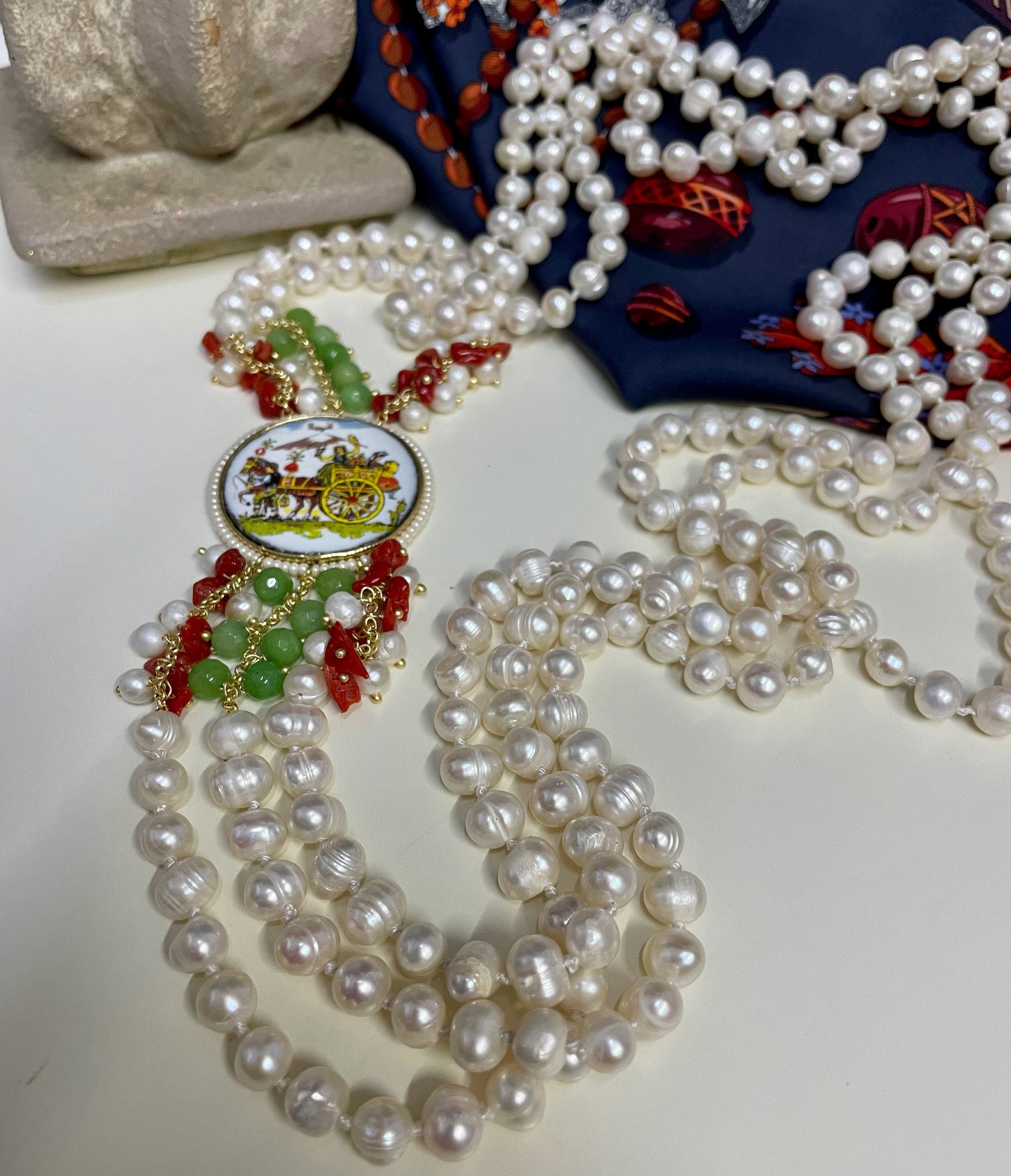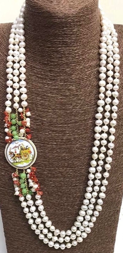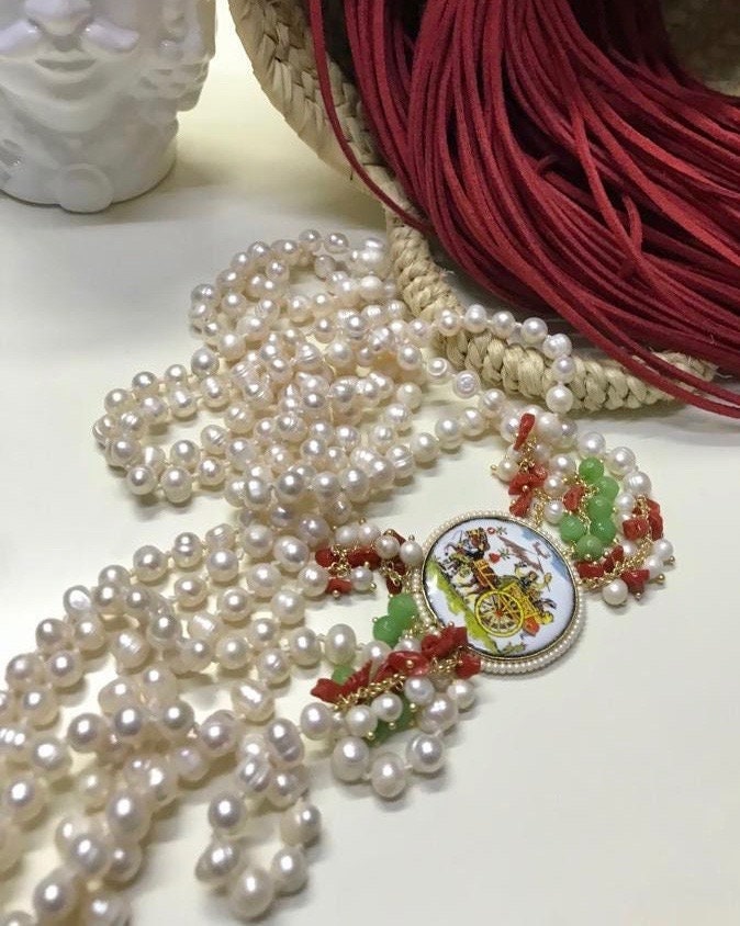 Bellissima collana dallo stile siciliano, realizzata con tre fili di perle di fiume, singolarmente annodate.
