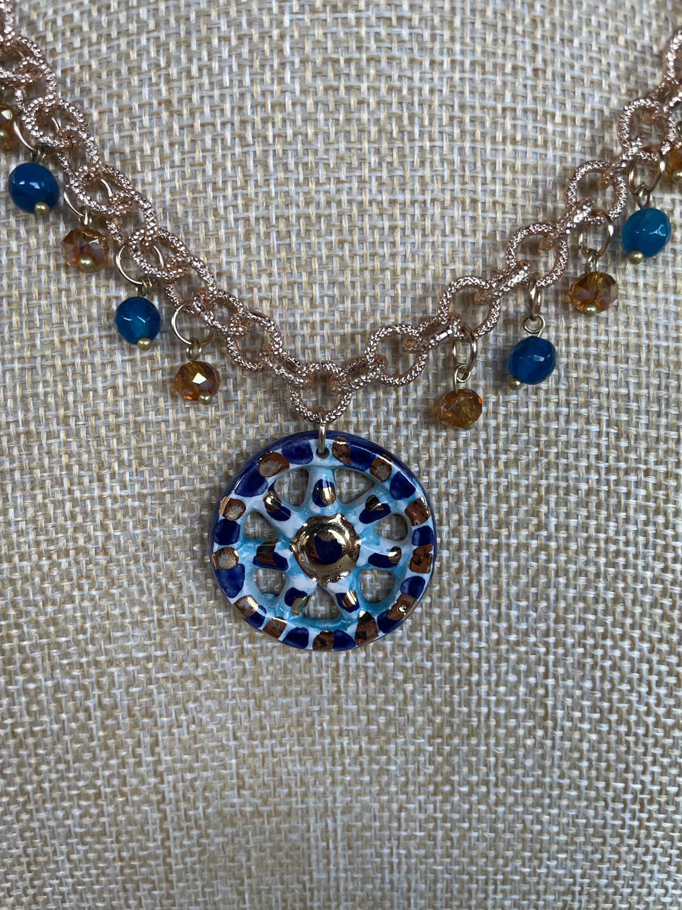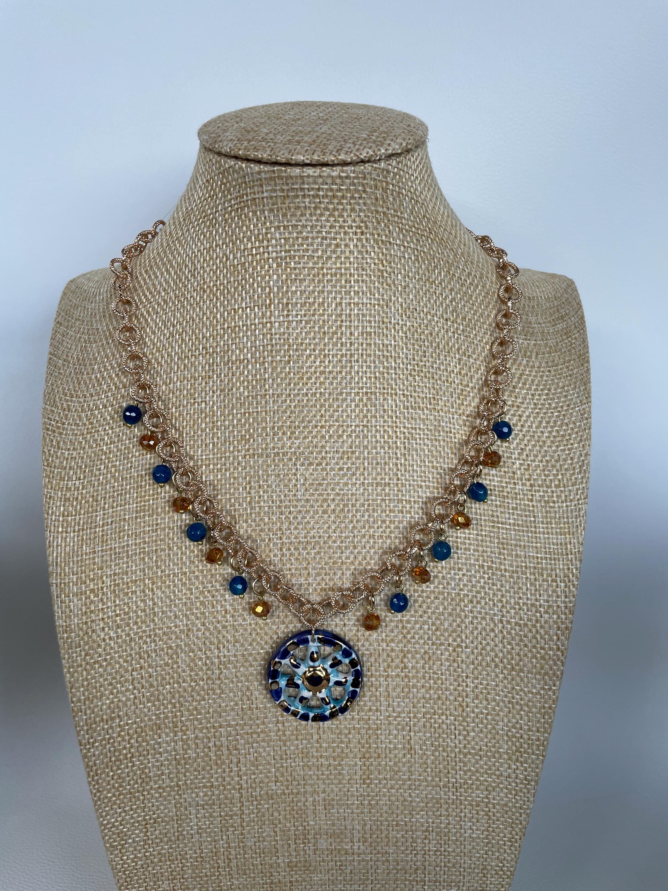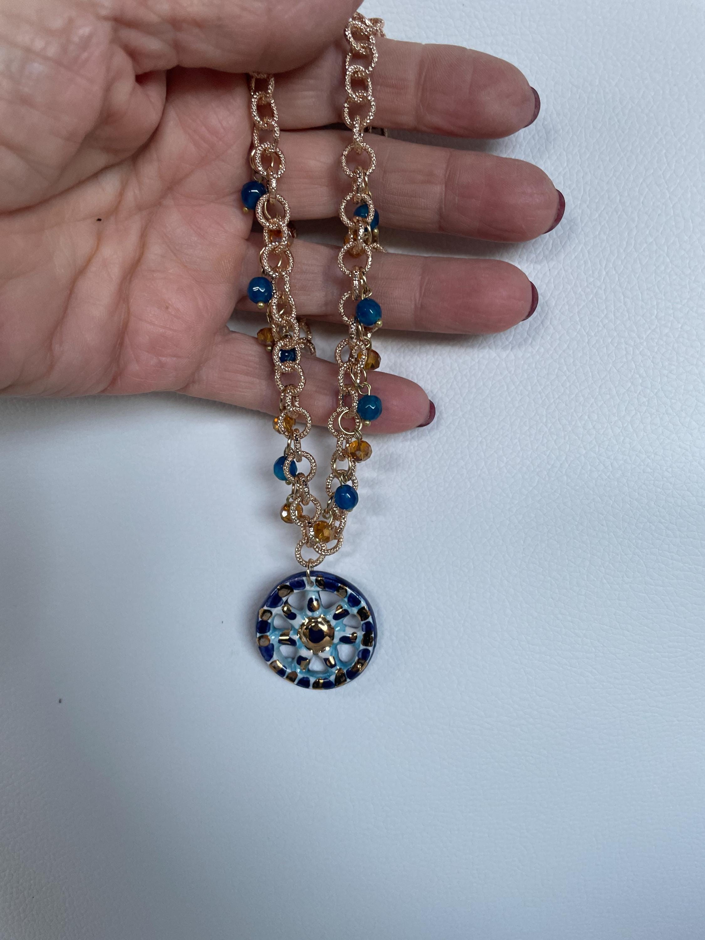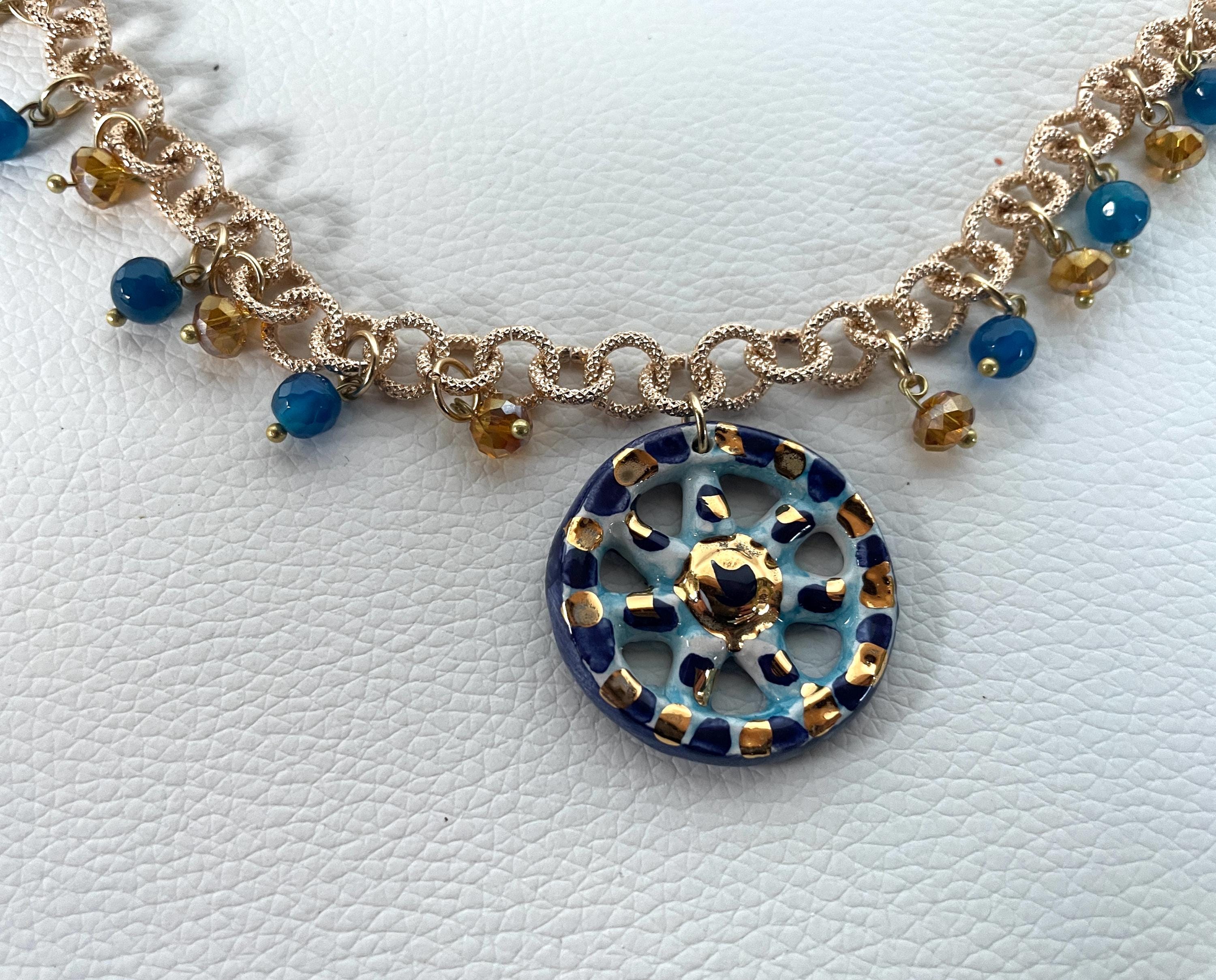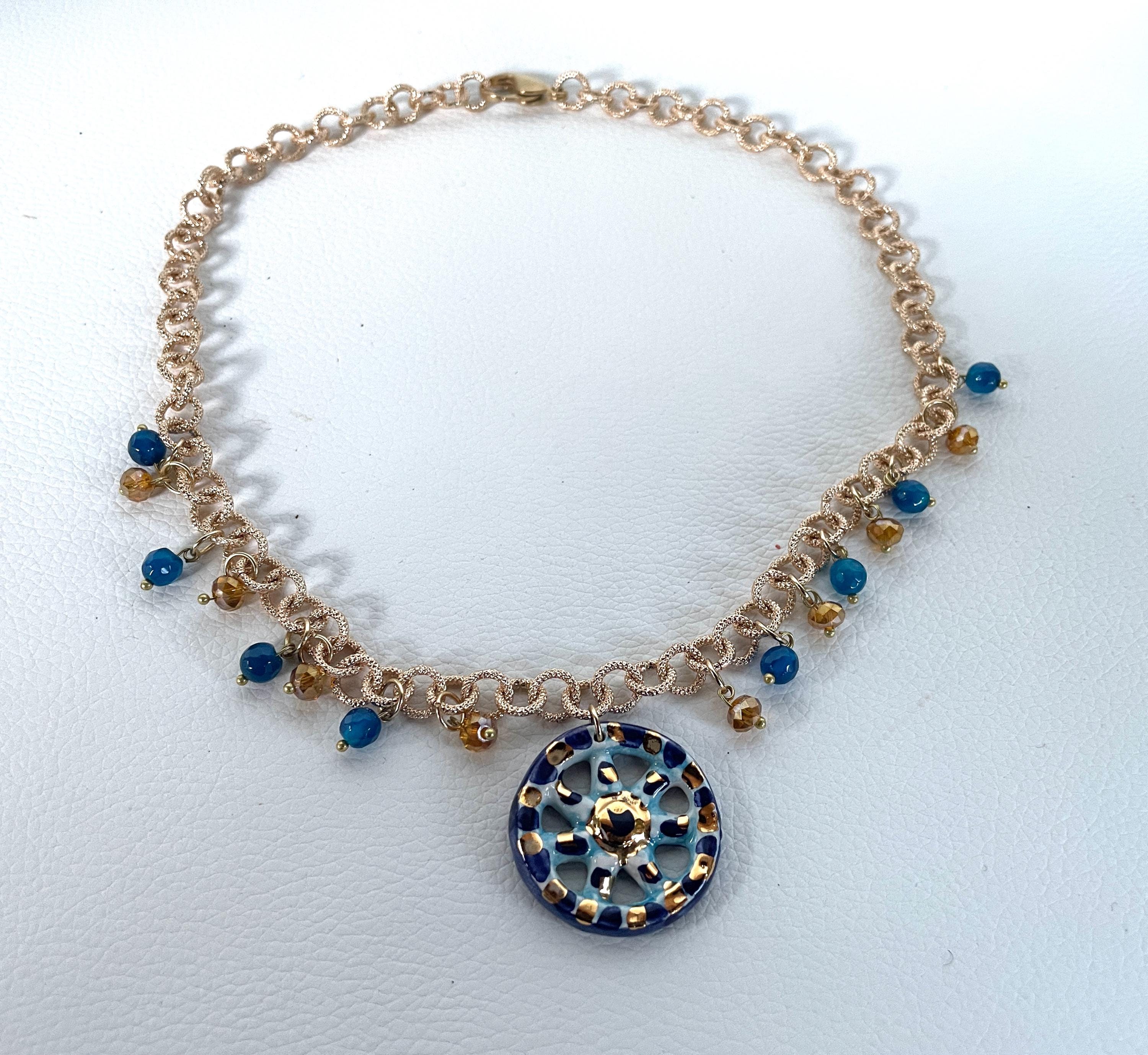 Deliziosa collana realizzata con una catena a maglie tonde satinate di alluminio oro anallergico e un pendente centrale di ceramica di Caltagirone raffigurante una Ruota di Carretto. Perle di Agata blu e cristalli dorati arricchiscono la catena in progressione ai lati del pendente.