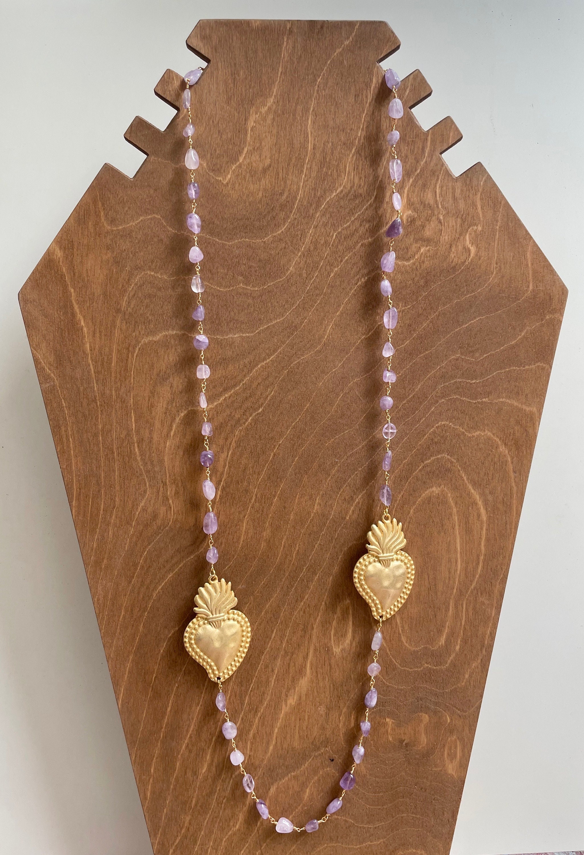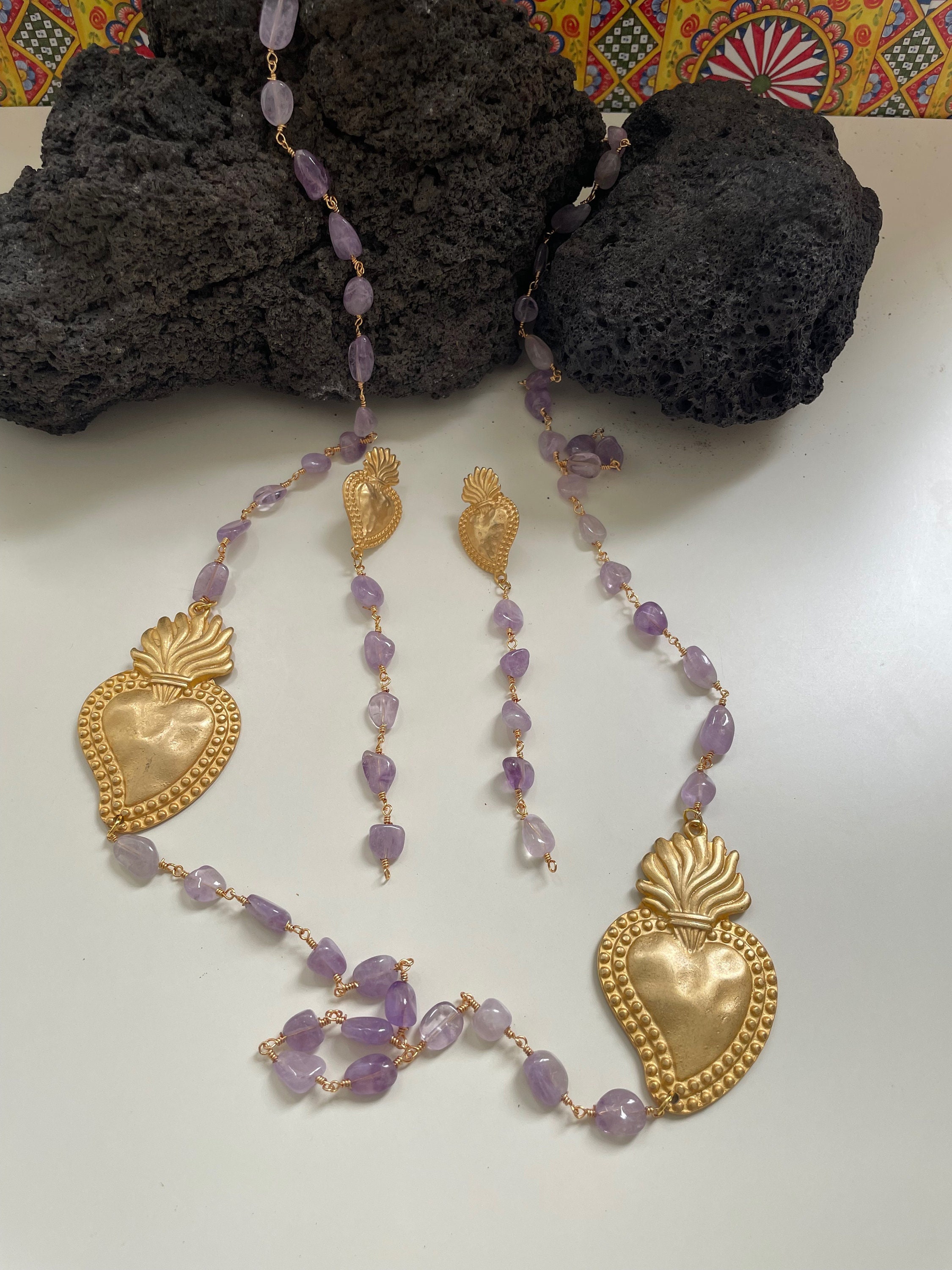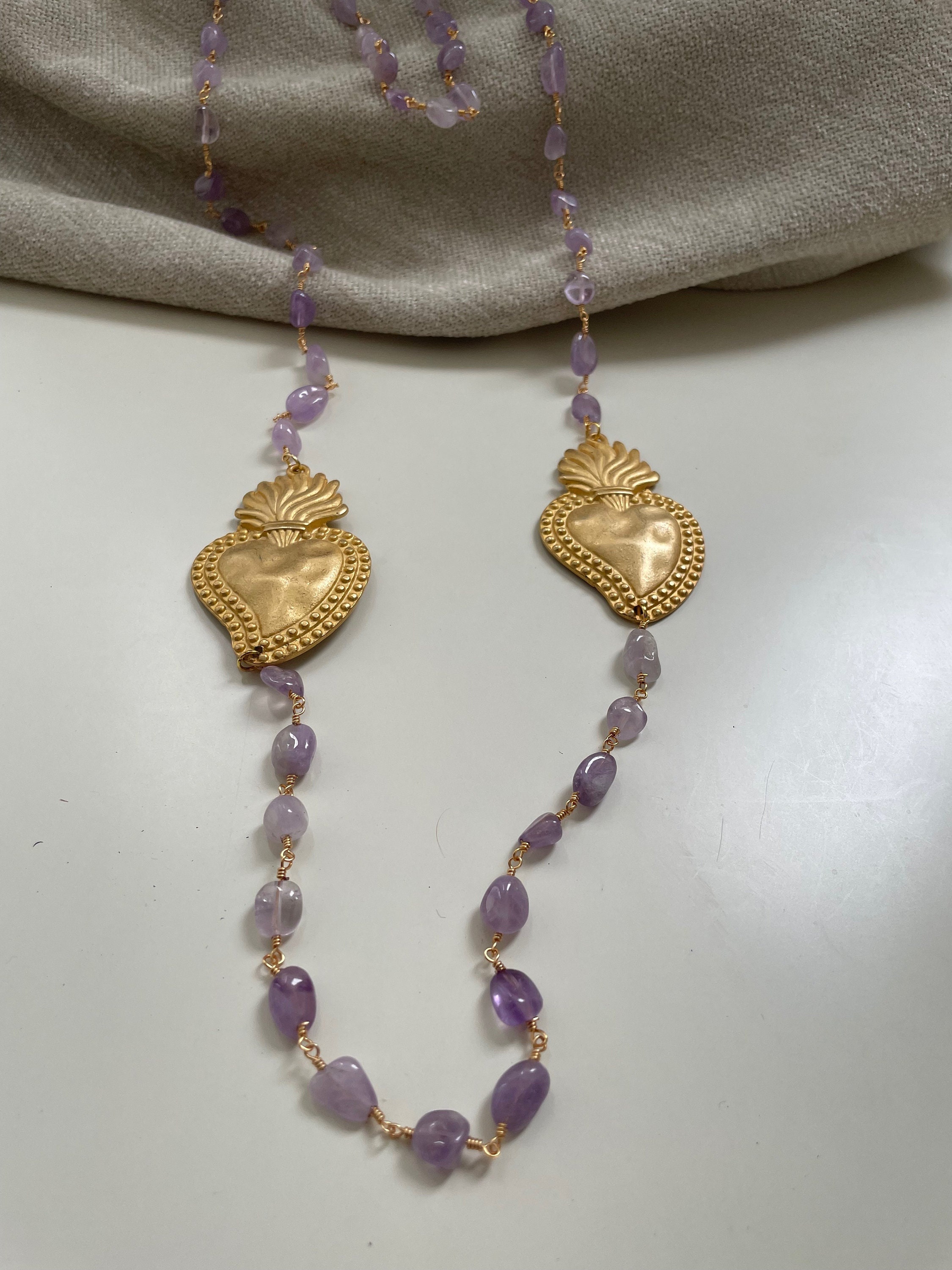 Realizzata con catena di tipo Rosario in ottone e sassi burattati di Ametista.