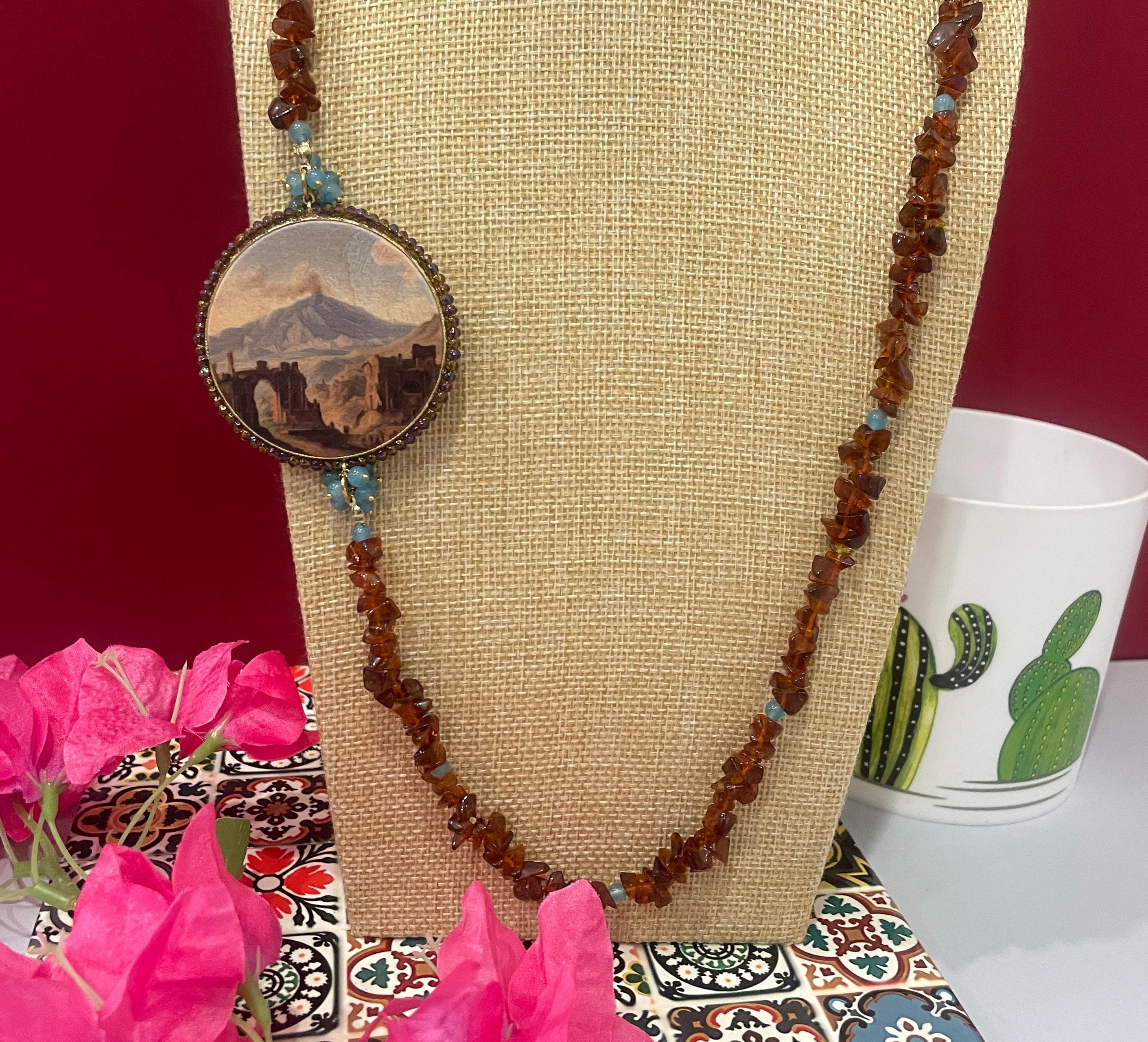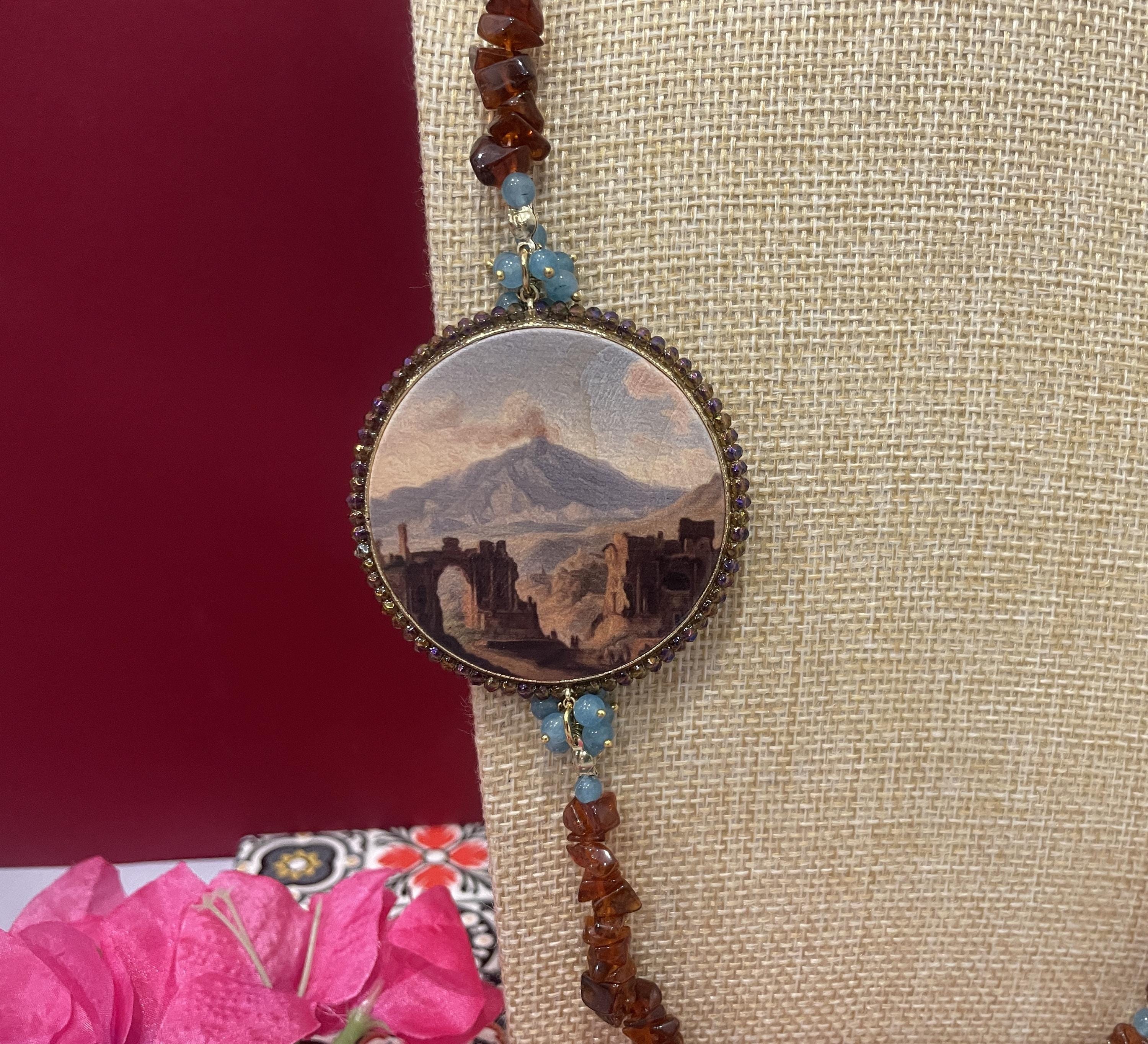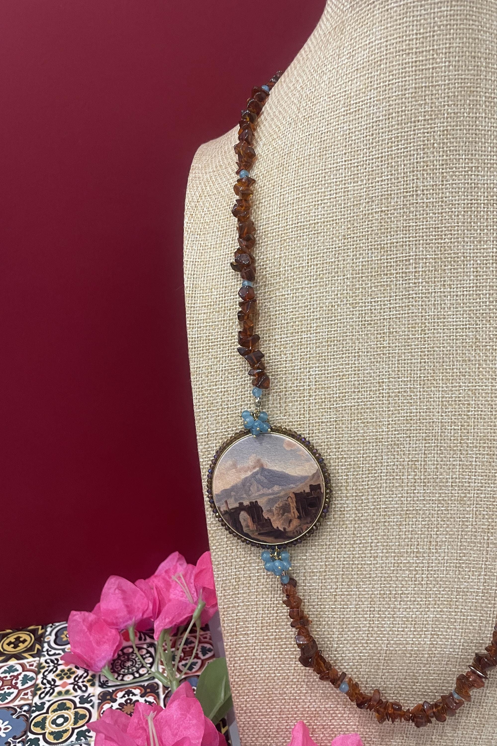 Collana di grande effetto unica nel suo genere realizzata con un filo di chips di pietra naturale marrone alternata a piccole perle di Angelite con un grande connettore centrale di legno stampato su due lati e raffigurante un dipinto dell’ottocento con la Veduta dell’Etna dal Teatro Greco di Taormina.
