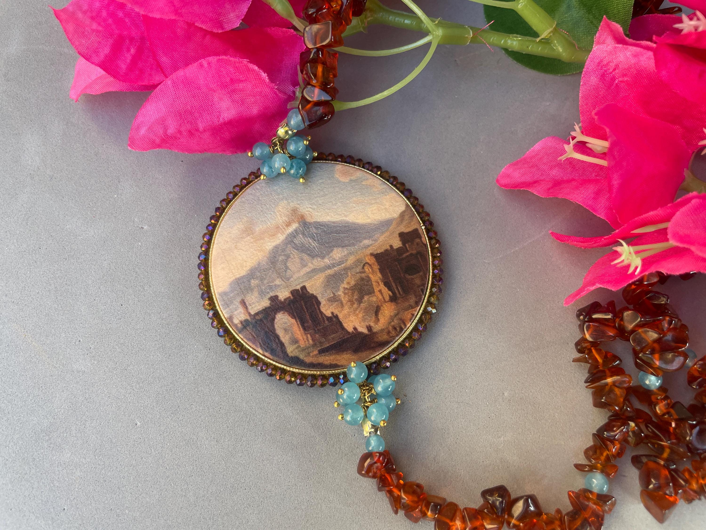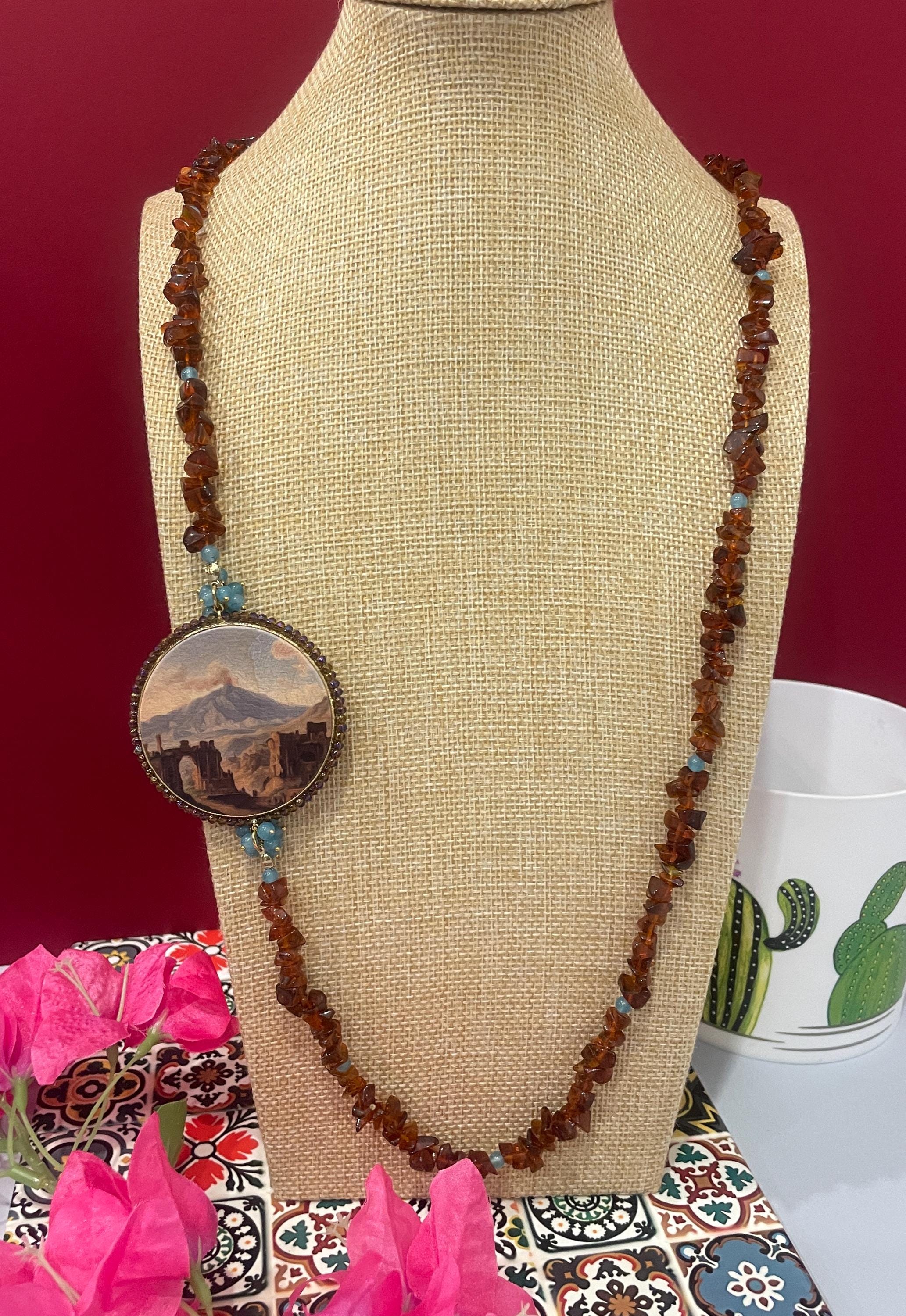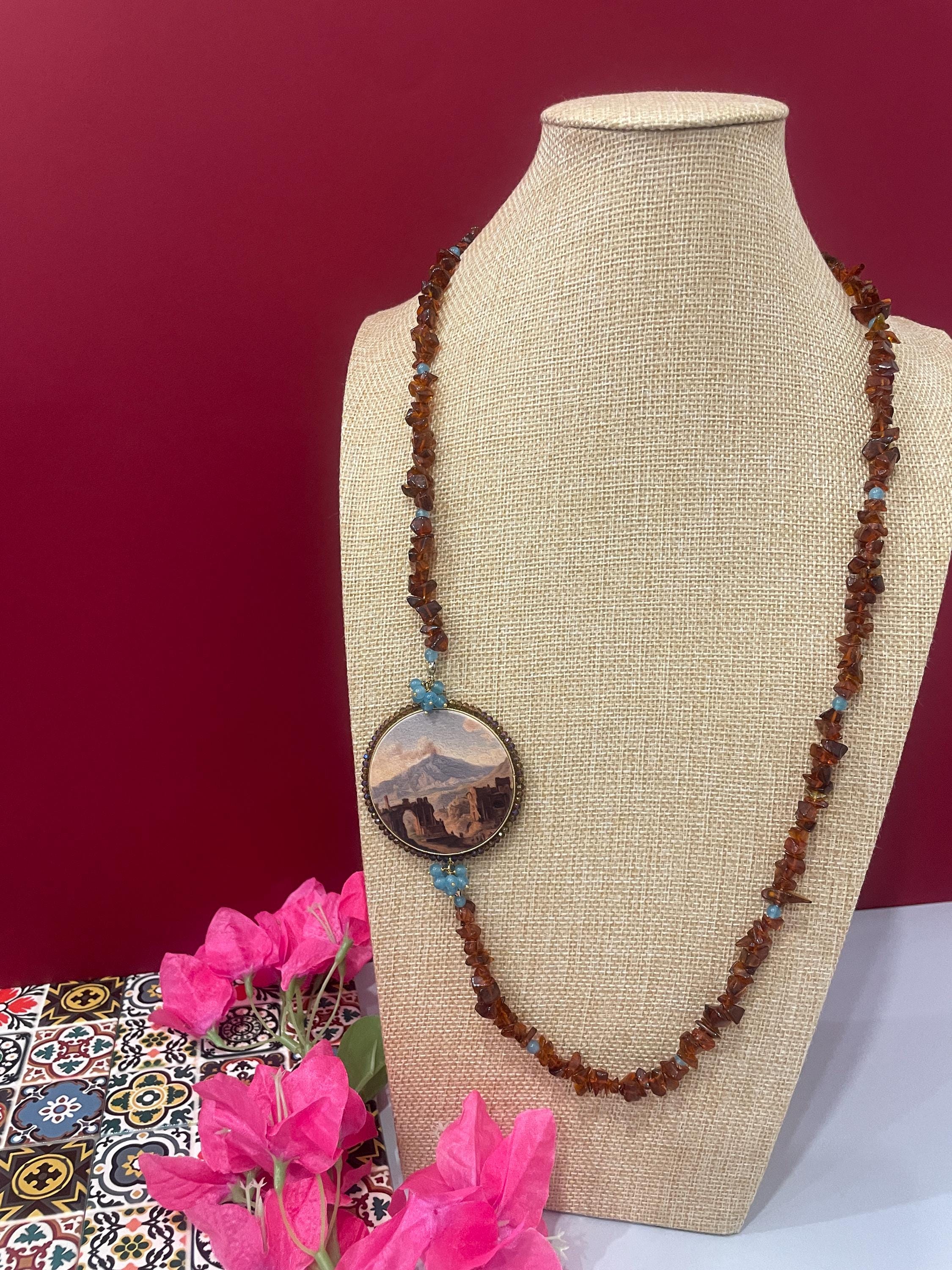 Collana di grande effetto unica nel suo genere realizzata con un filo di chips di pietra naturale marrone alternata a piccole perle di Angelite con un grande connettore centrale di legno stampato su due lati e raffigurante un dipinto dell’ottocento con la Veduta dell’Etna dal Teatro Greco di Taormina.