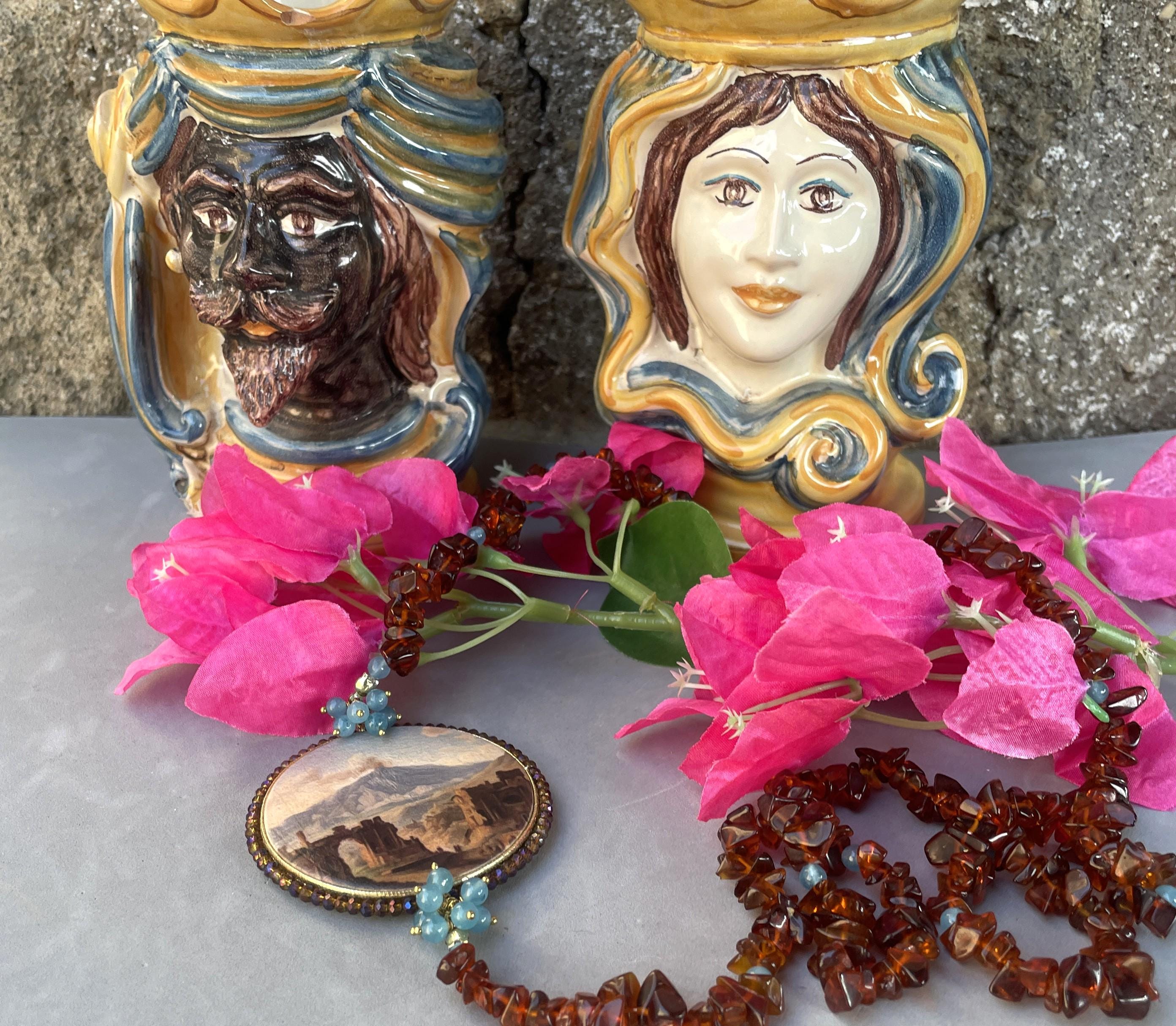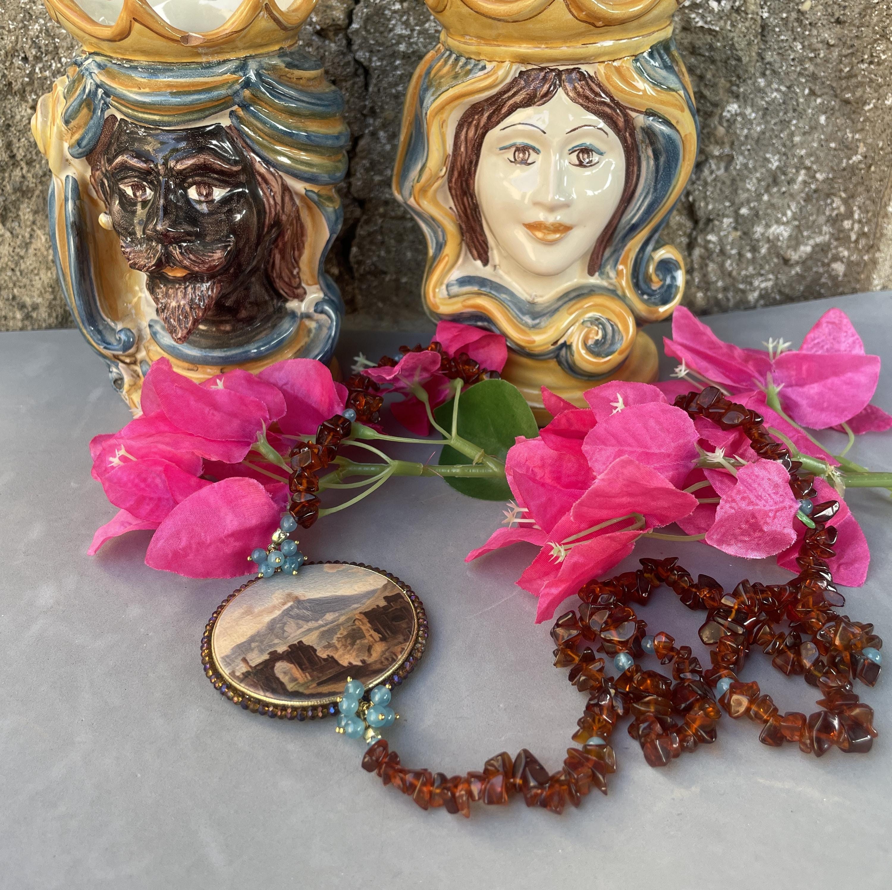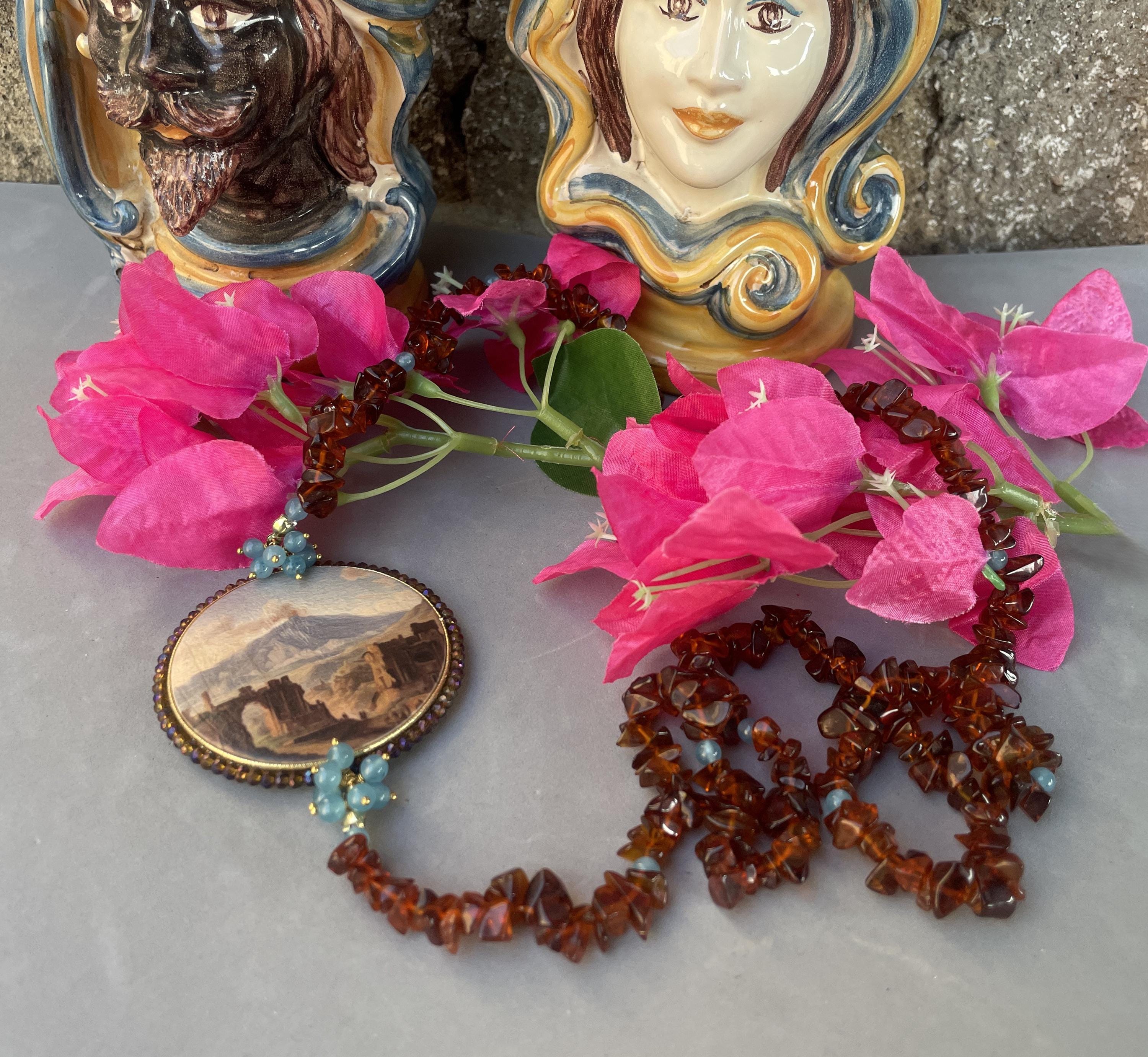 Collana siciliana con chips di pietra marrone e perle di Angelite, medaglione double-face con Veduta Etna e Teatro Greco di Taormina.