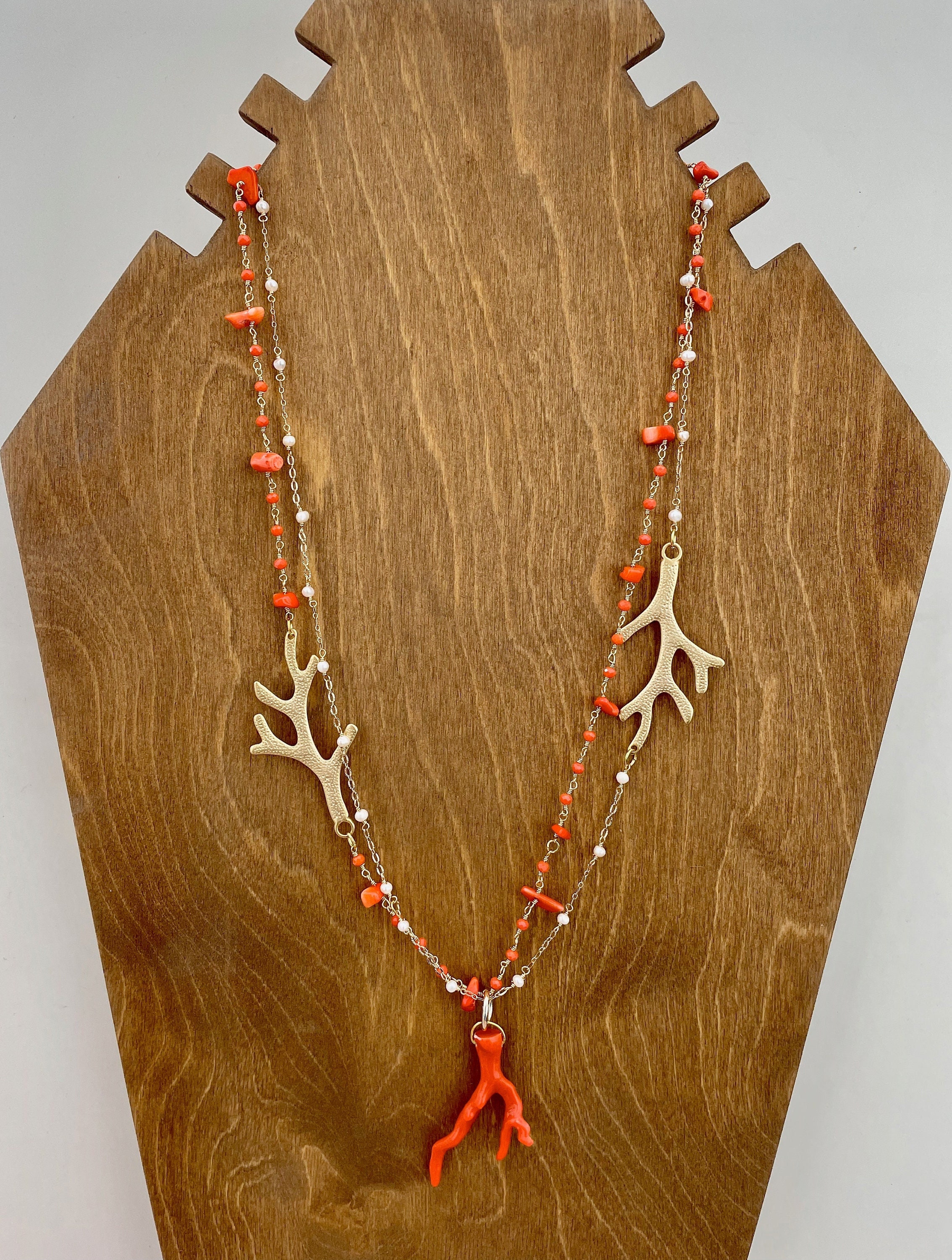 Realizzata con doppia catena del tipo Rosario, una con perle di fiume e una con pezzi di corallo.