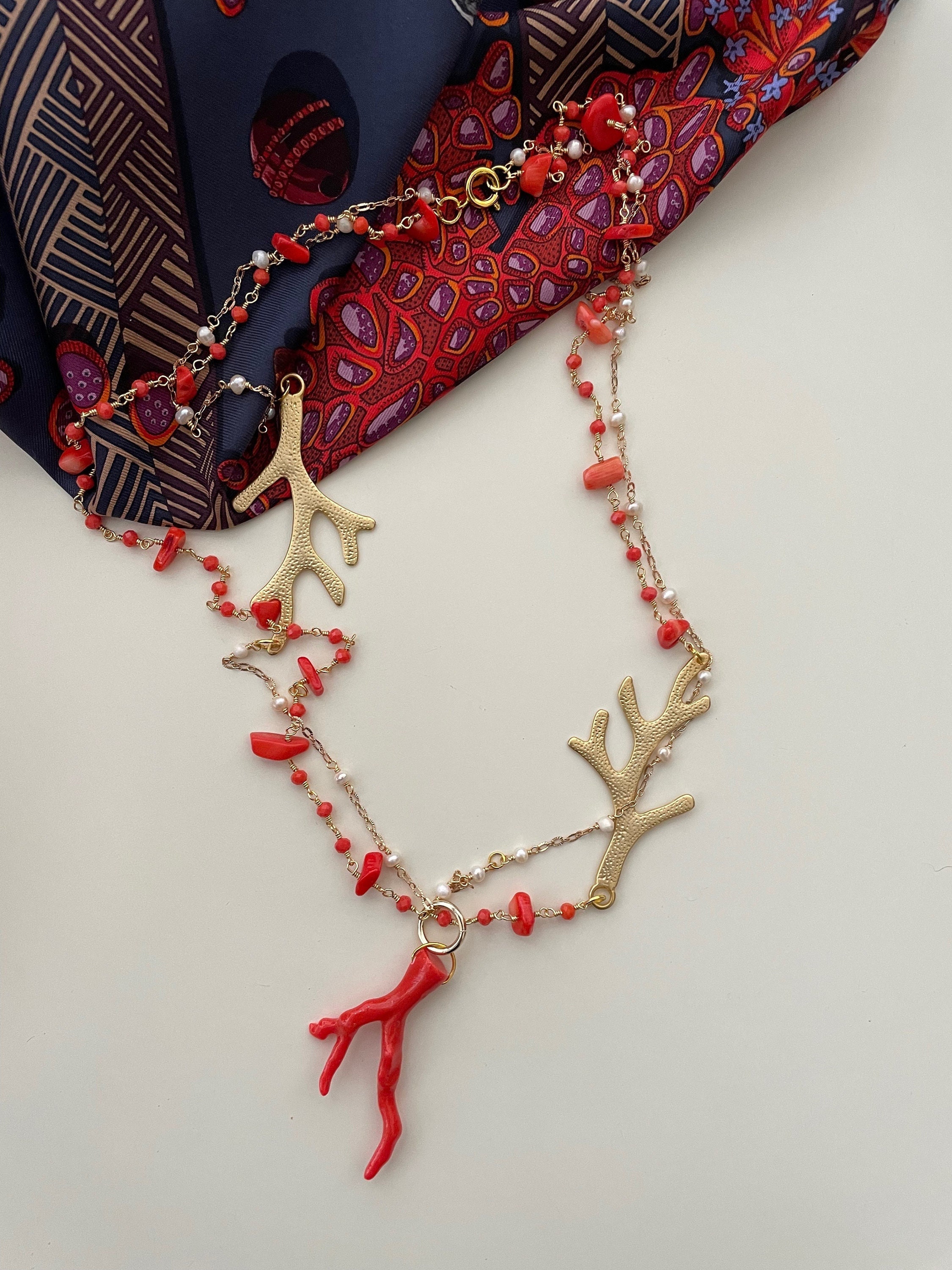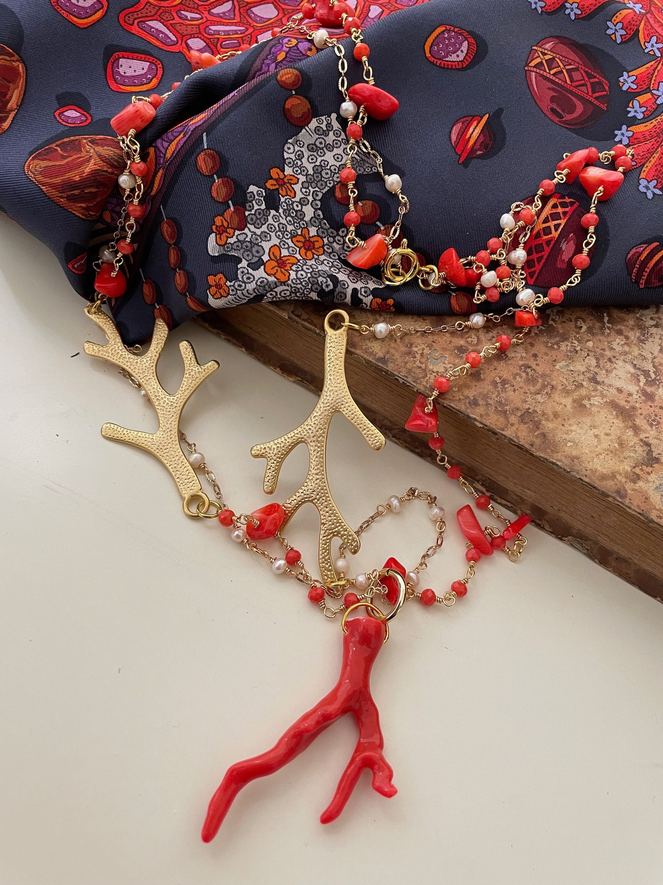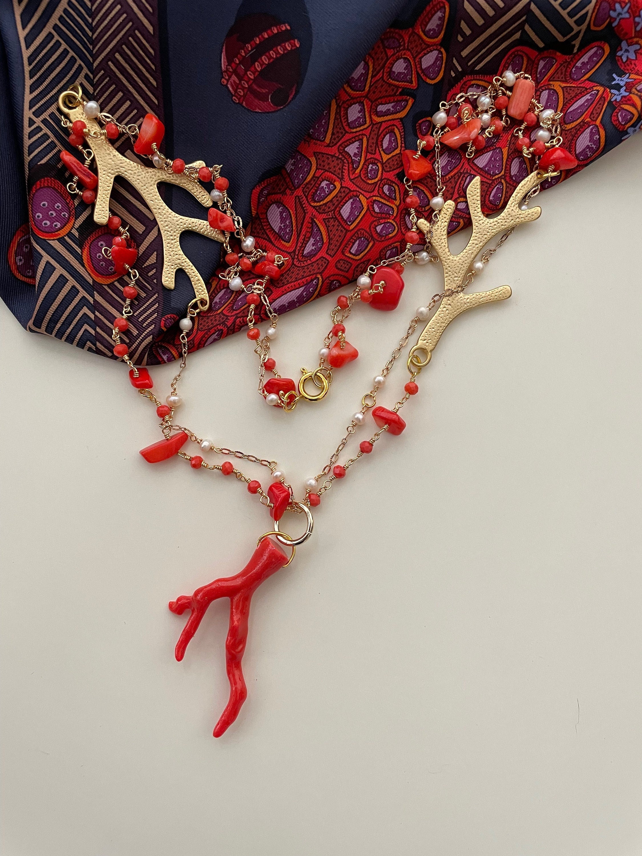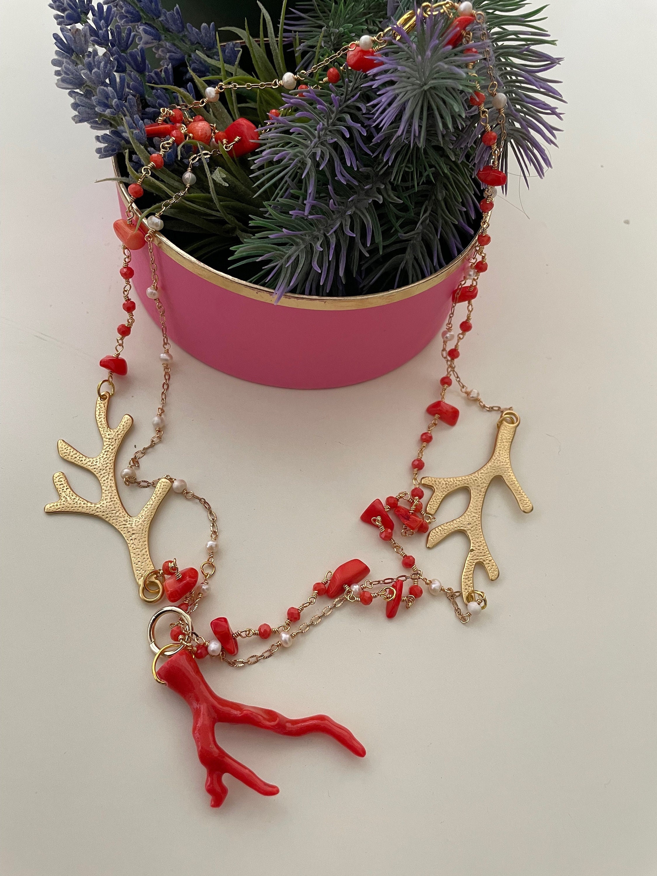 Completa il gioiello un ciondolo pendente di resina a forma di ramo di corallo.