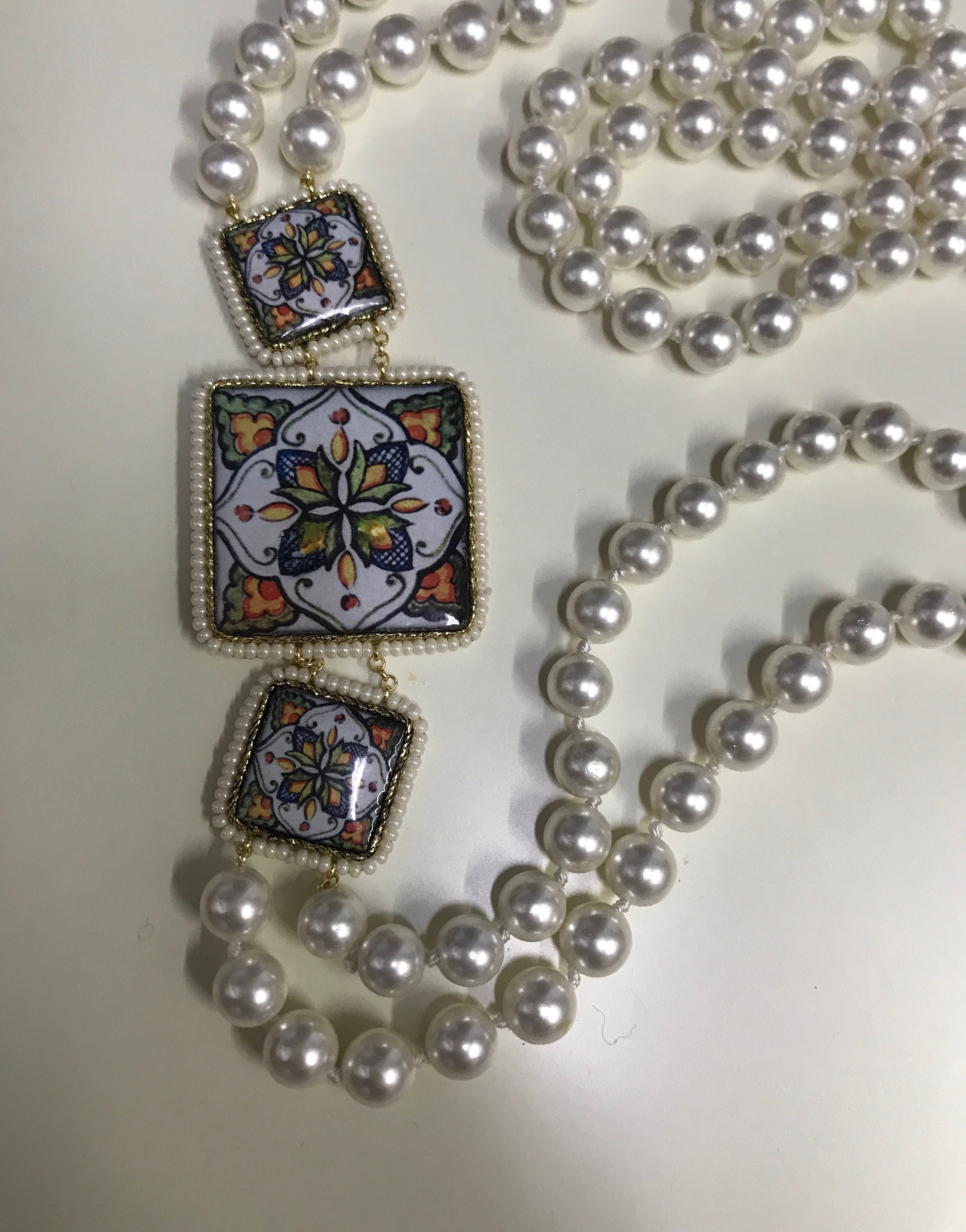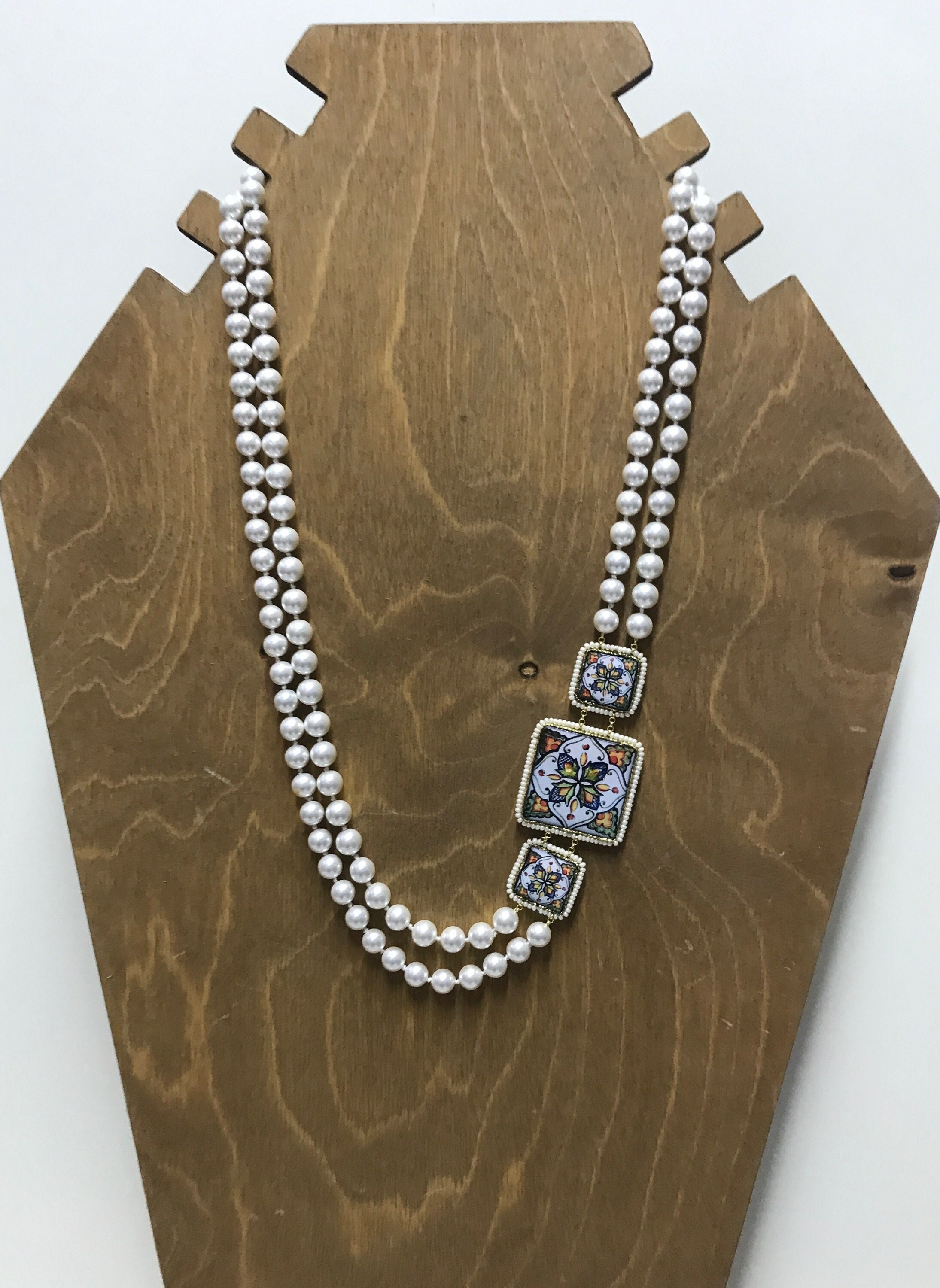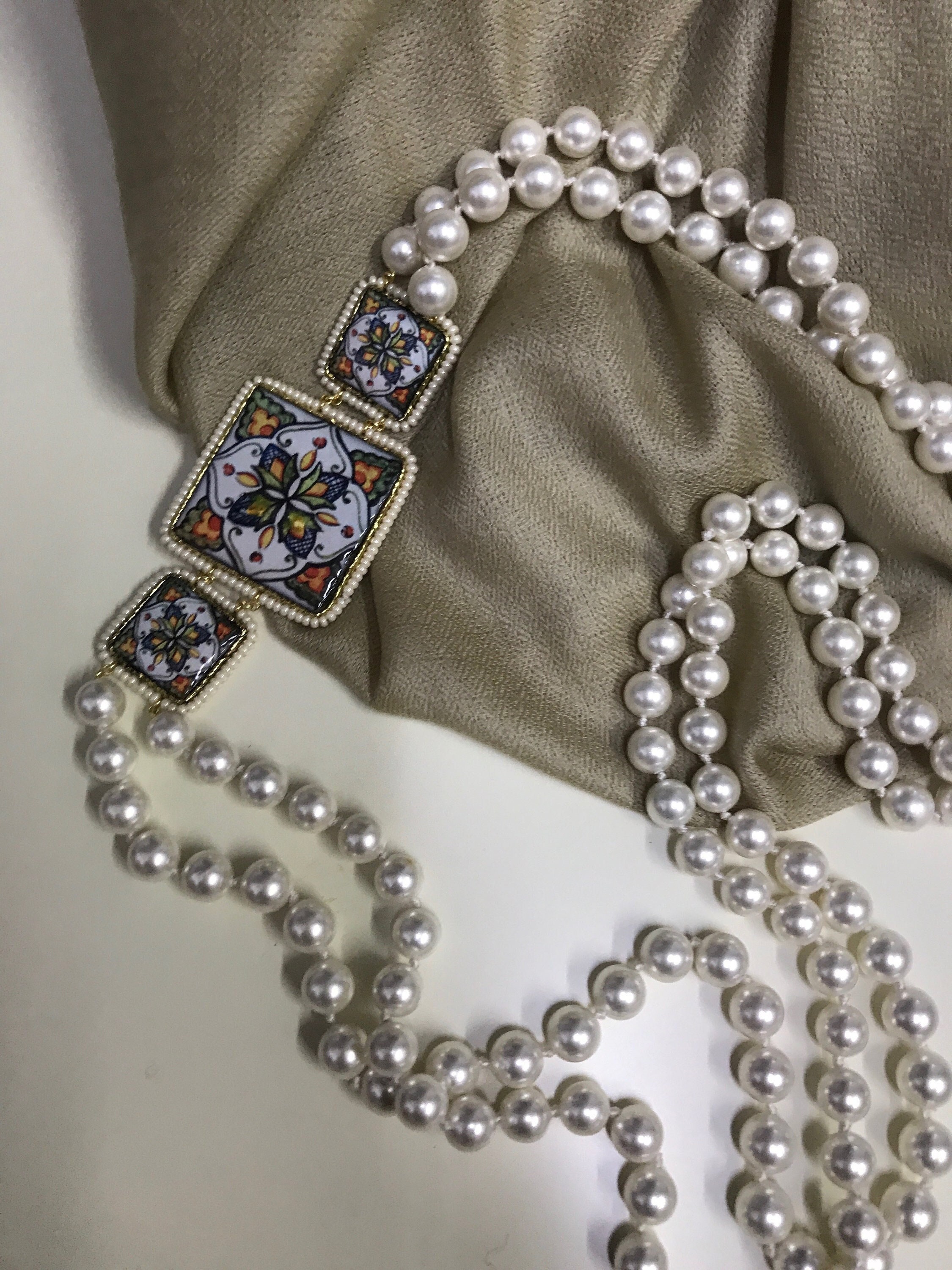 Composta da doppio filo di di perle maiorca, singolarmente annodate, e tre mattonelle in ceramica di Caltagirone, su base lavica, stampate in superficie con motivi tipici della maiolica siciliana. Ogni mattonella è incorniciata da un filo di microperle di fiume.