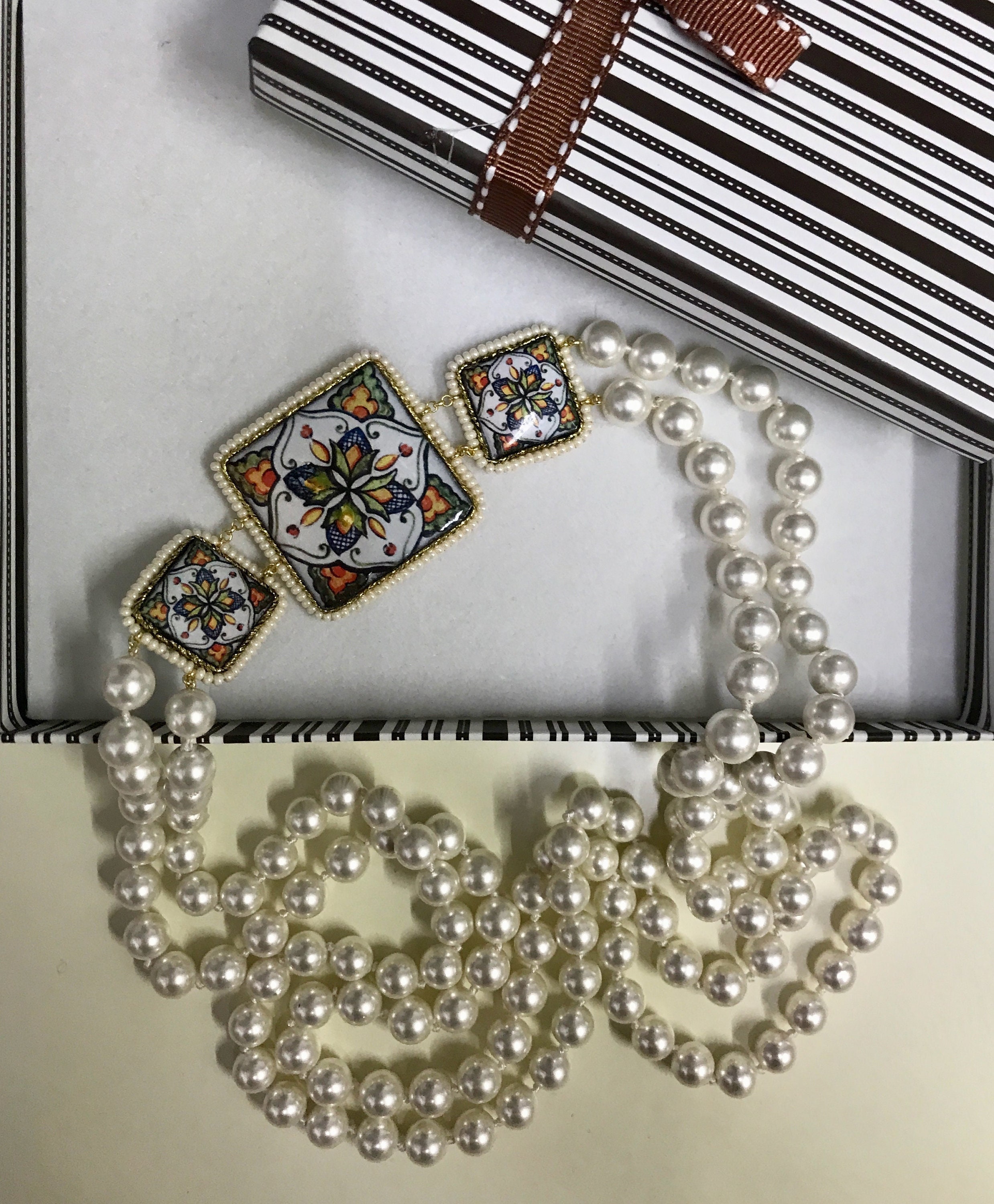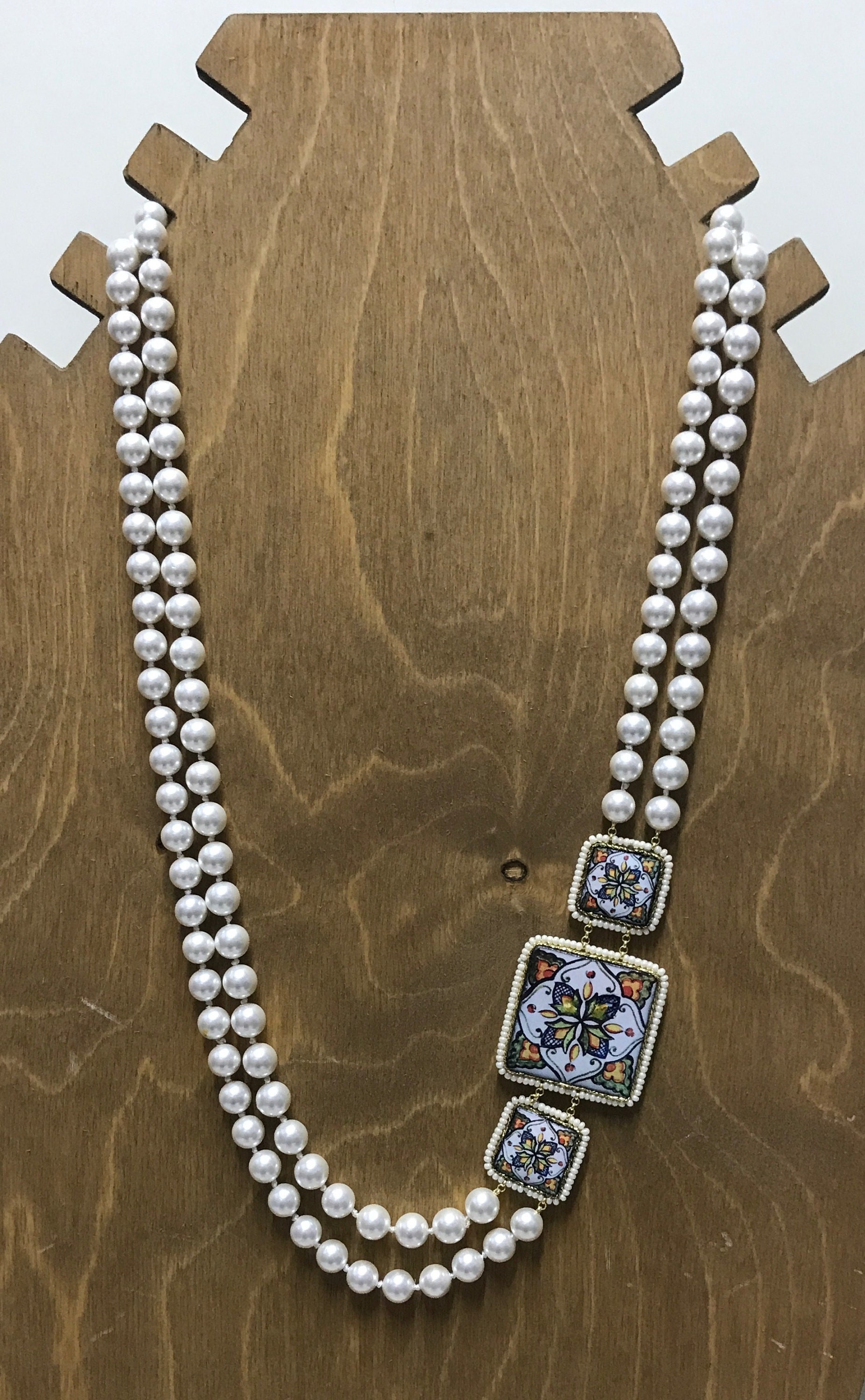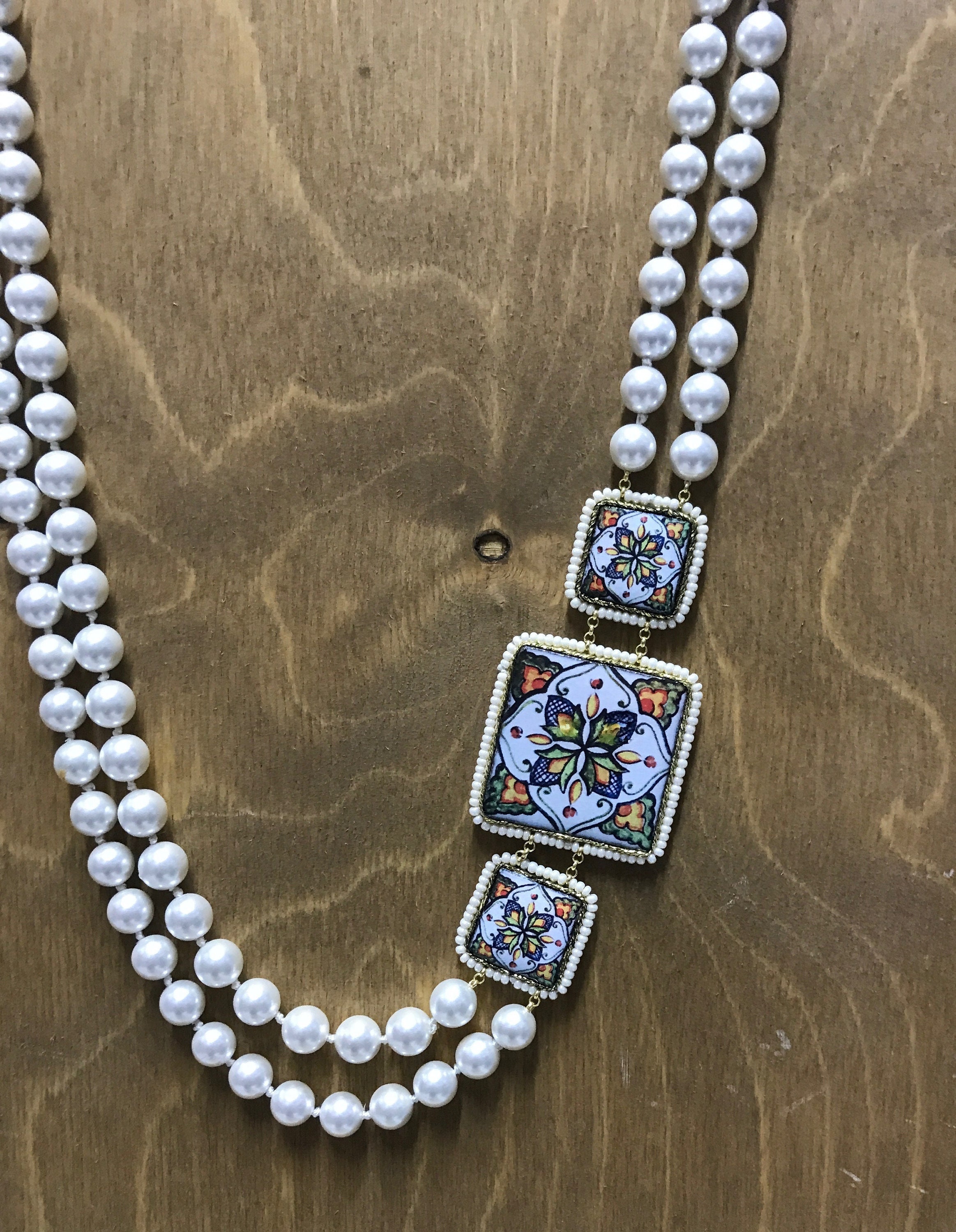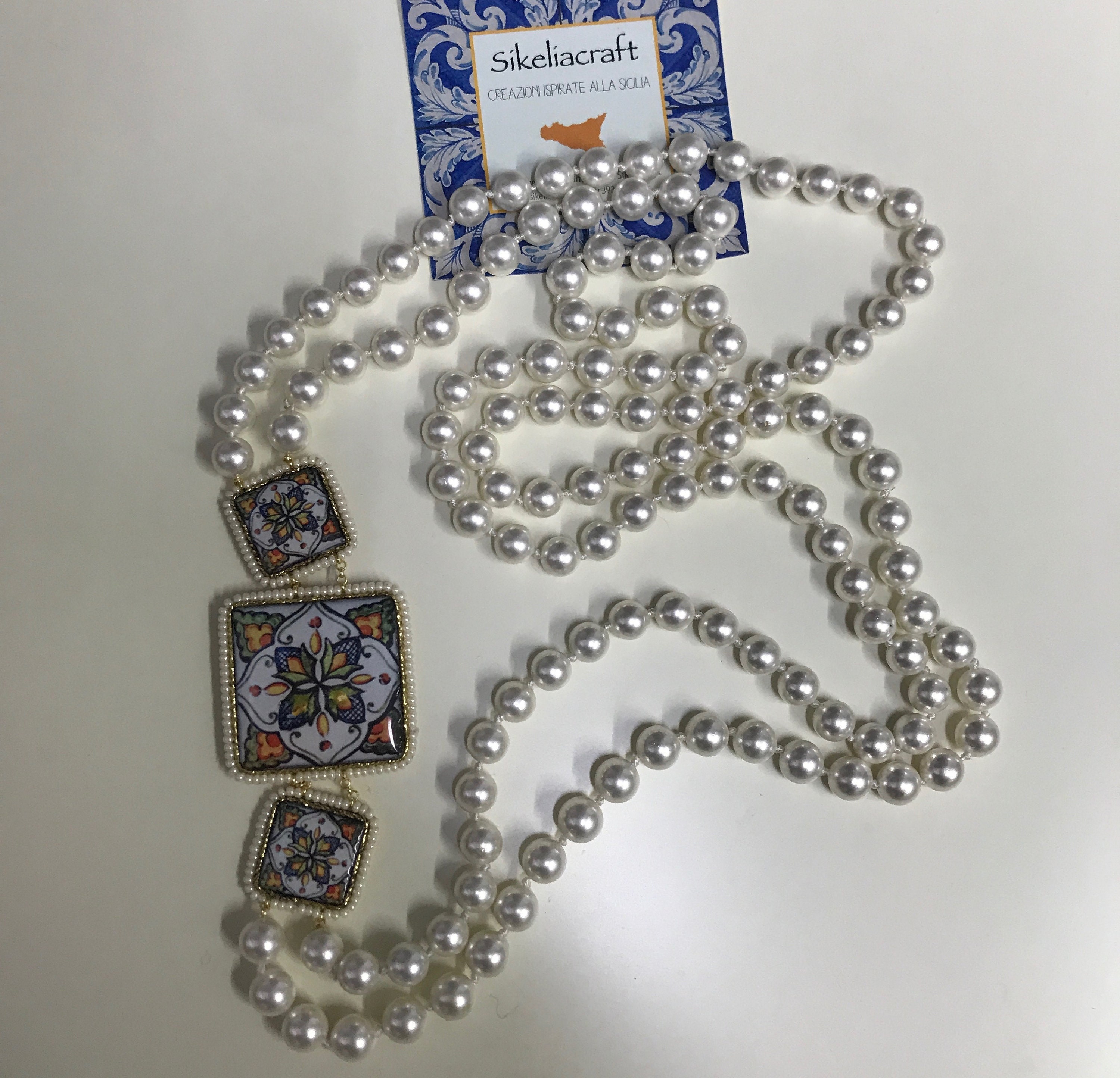 Grazie per avere visitato il mio shop 🤩 con due fili di perle maiorca, singolarmente annodate, e tre mattonelle in ceramica di Caltagirone stampate in superficie a motivi di tipica decorazione siciliana e incorniciate da filo di perline di fiume.
