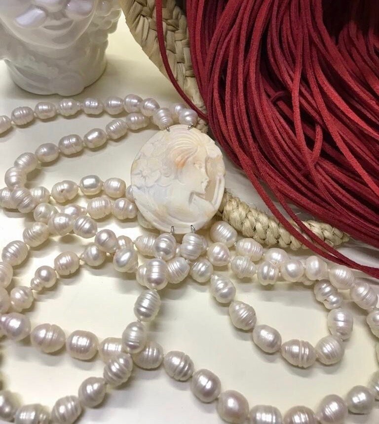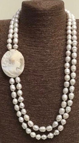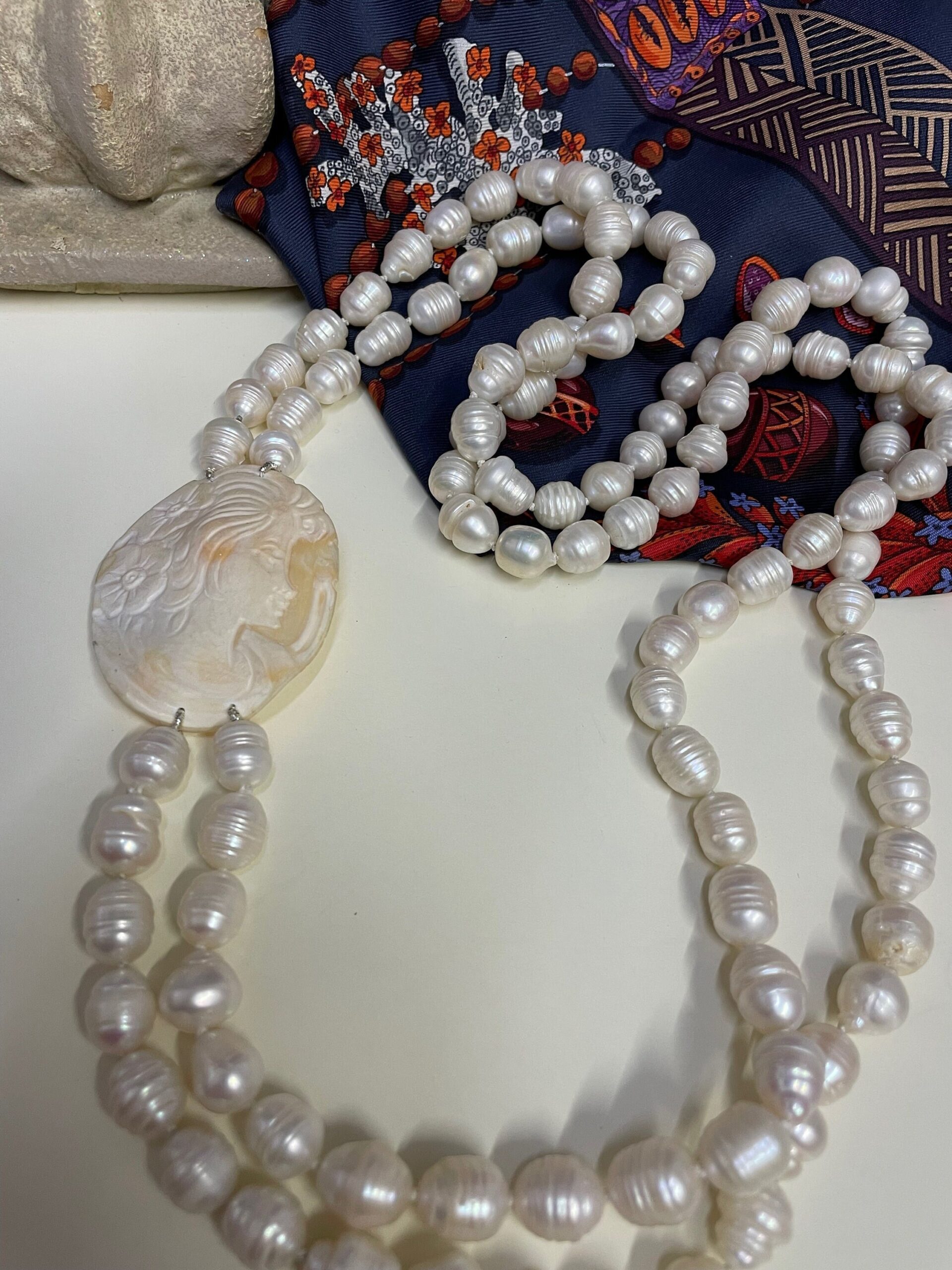 Elegante collana composta da due fili di perle barocche, singolarmente annodate, interrotti da un cammeo in vera conchiglia sardonica.