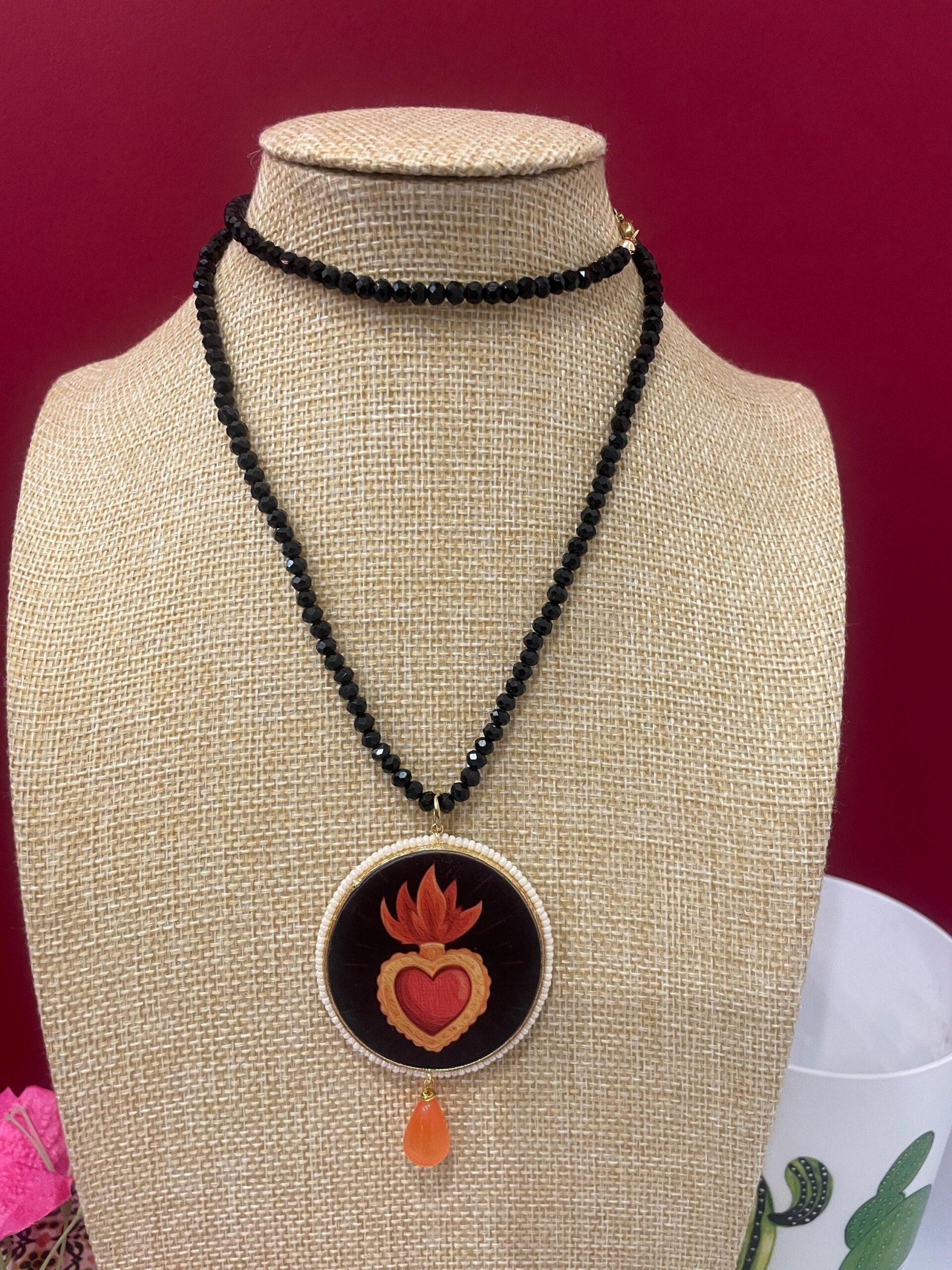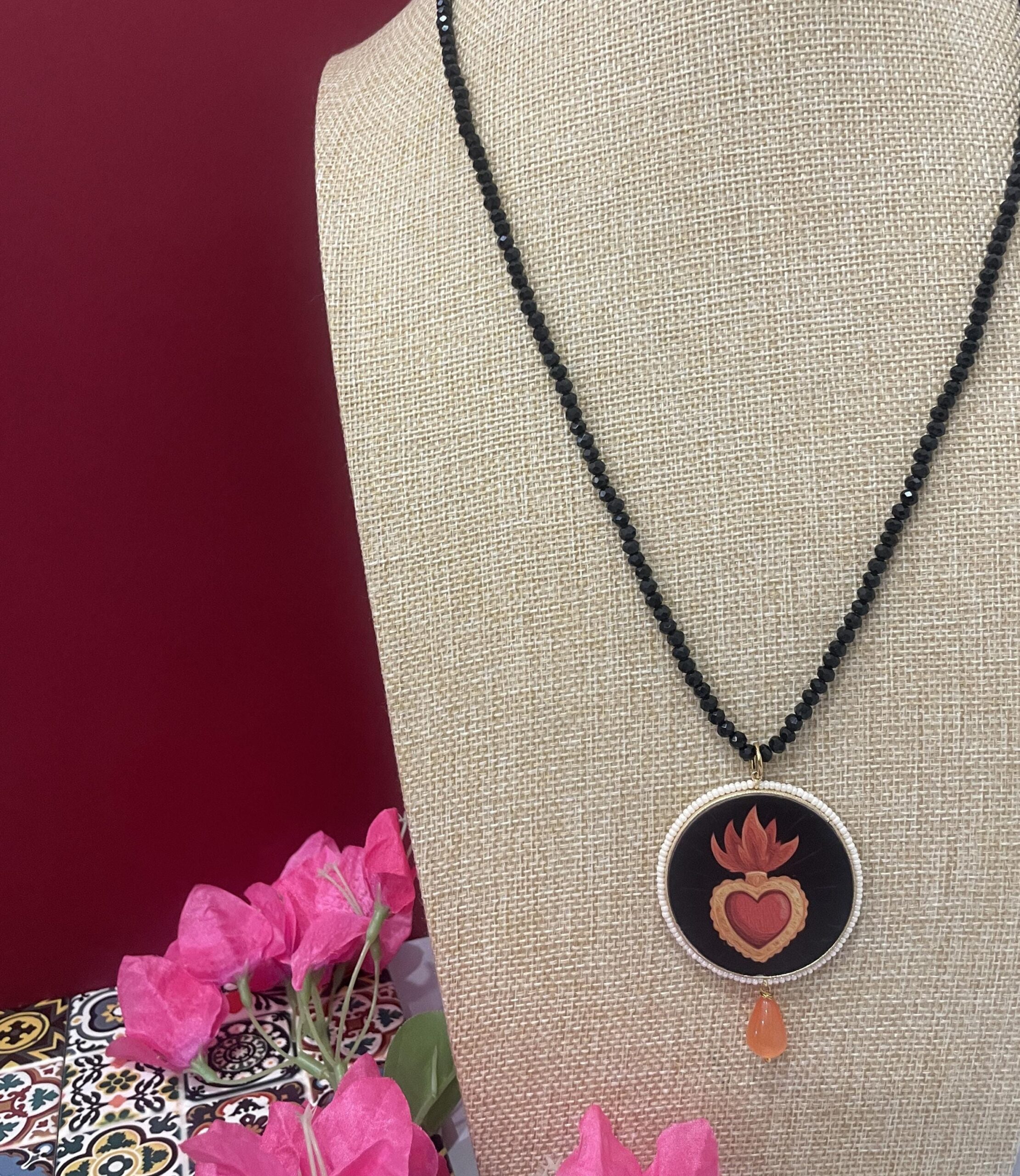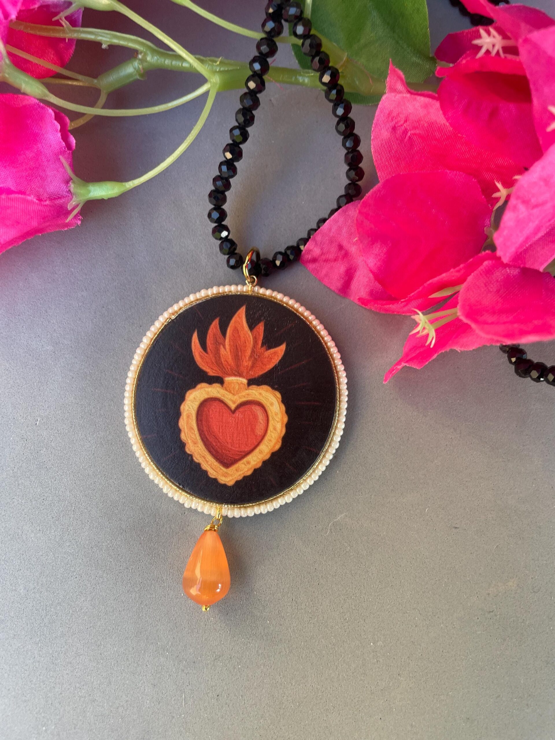 Collana delicata realizzata con un filo di cristalli neri e come ciondolo un grande medaglione di legno double-face raffigurante un Cuore sacro su fondo scuro.