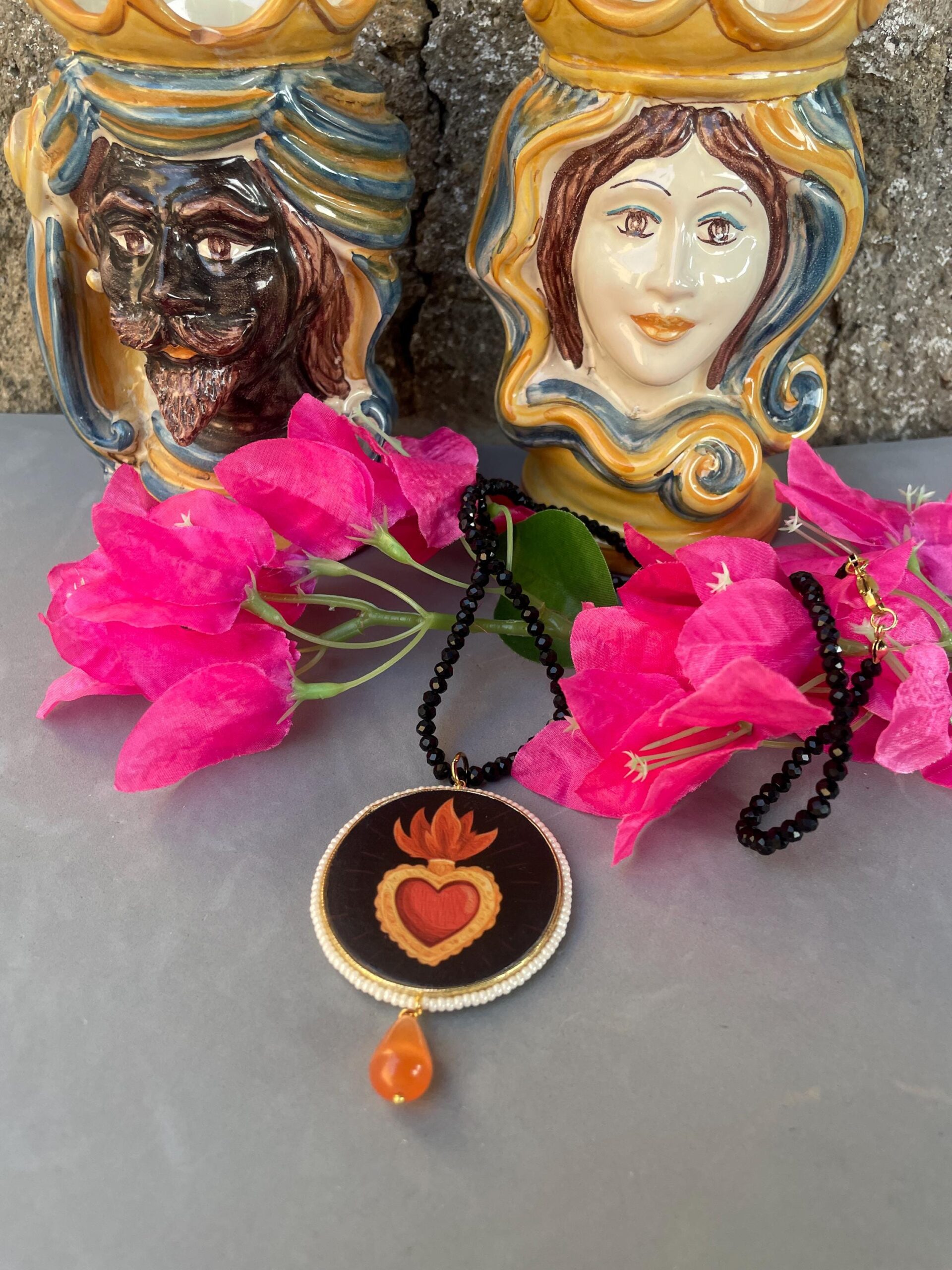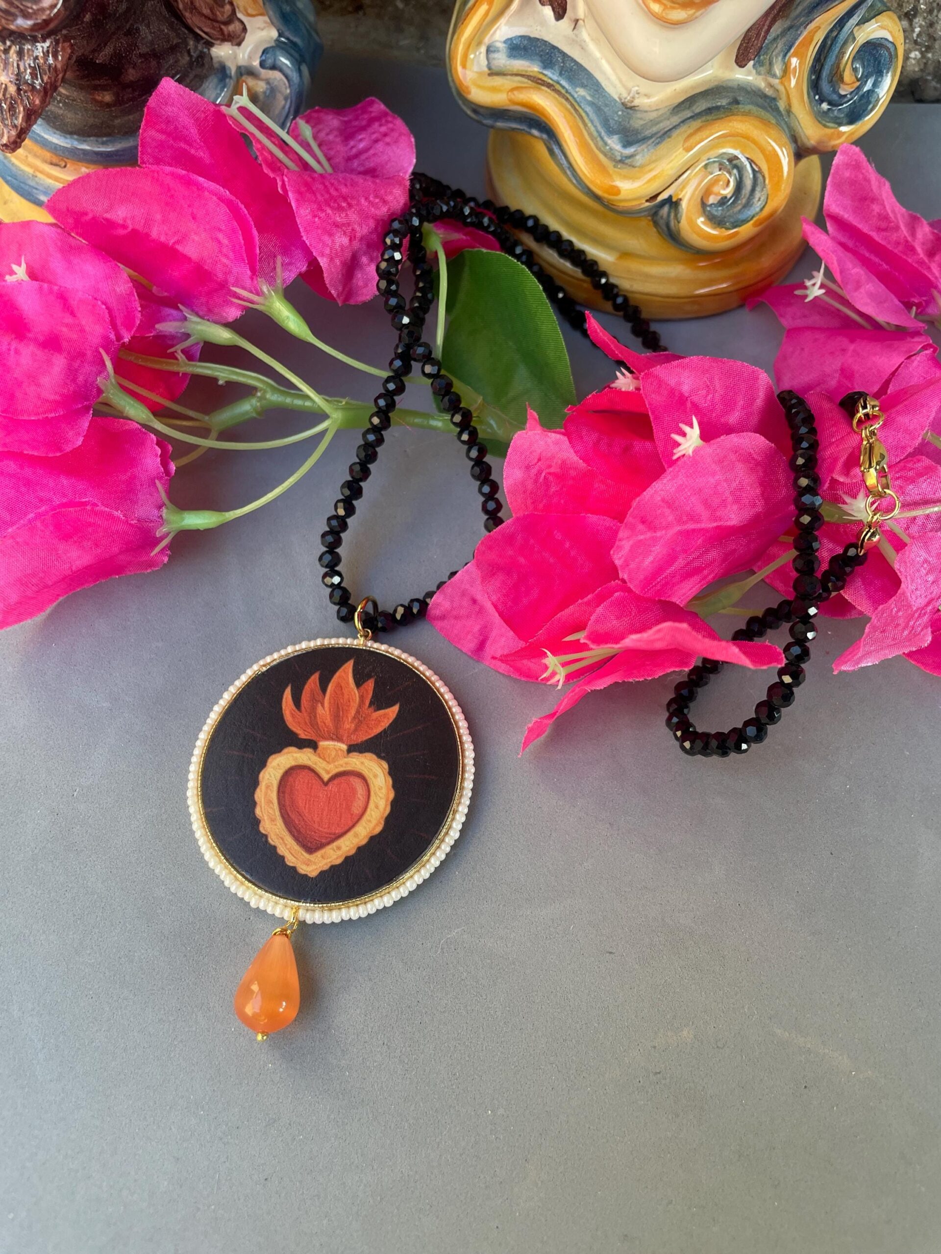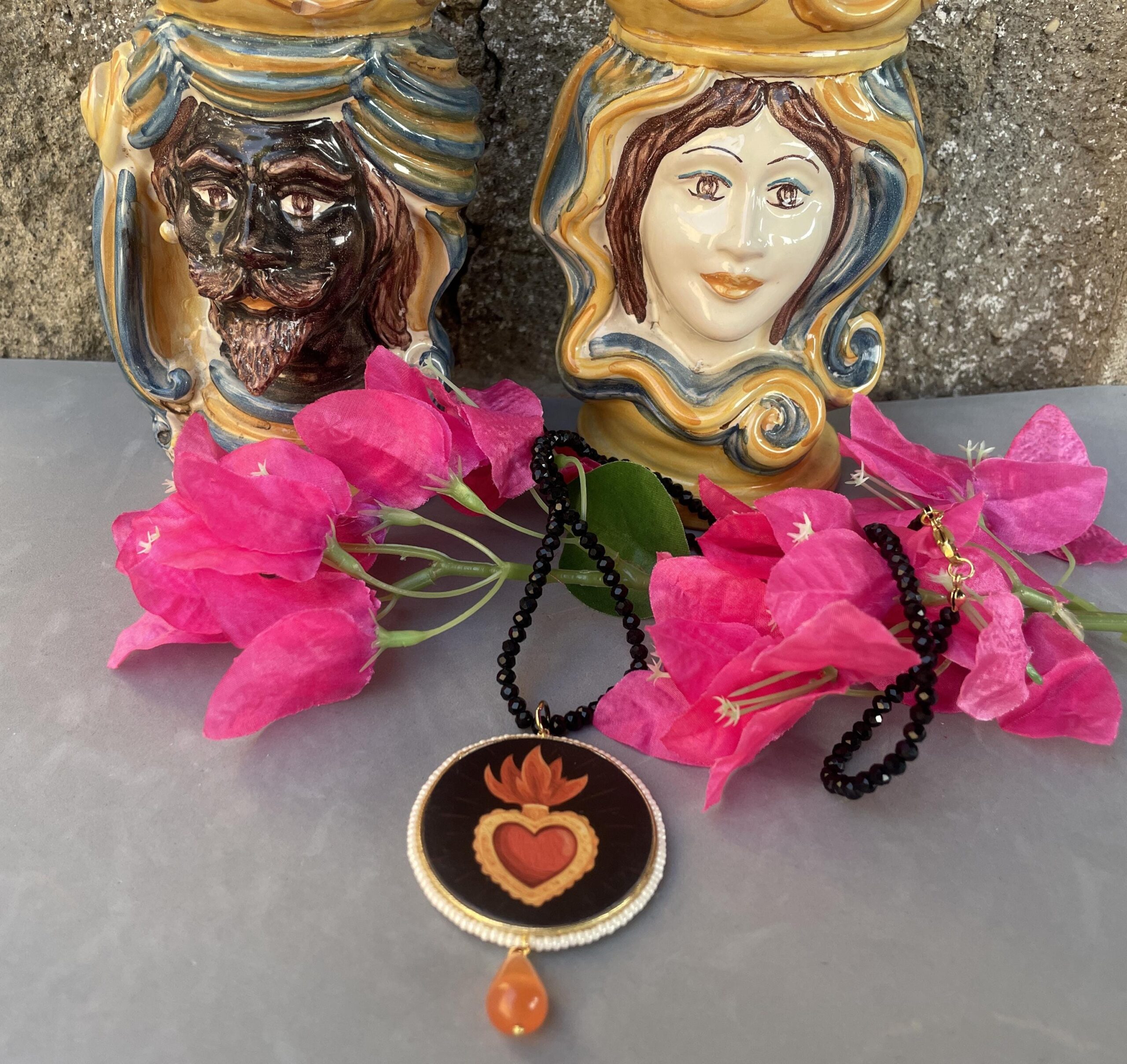 Collana siciliana con filo cristalli neri, grande medaglione double-face con Cuore Sacro, perla a goccia di Occhio di gatto.