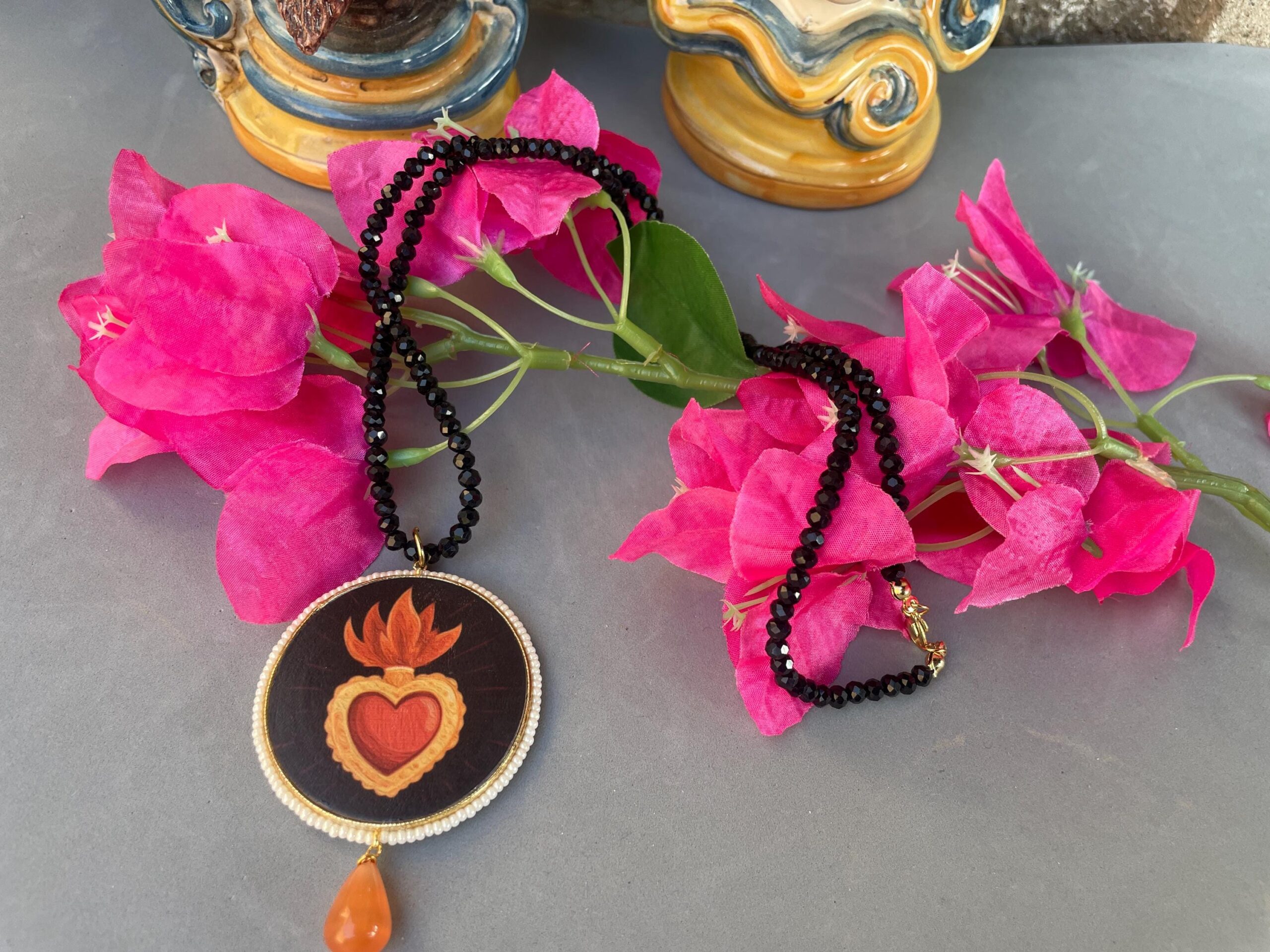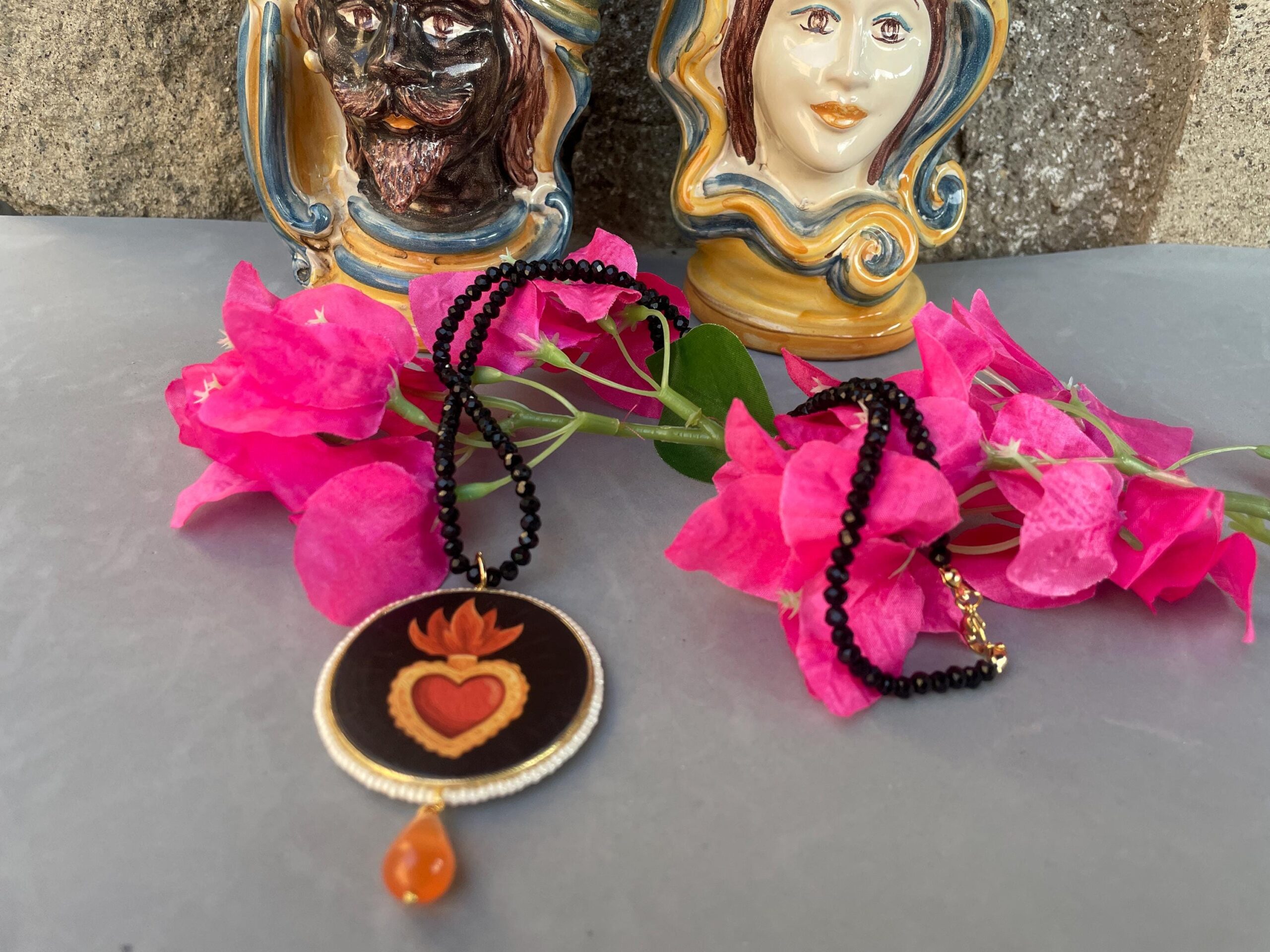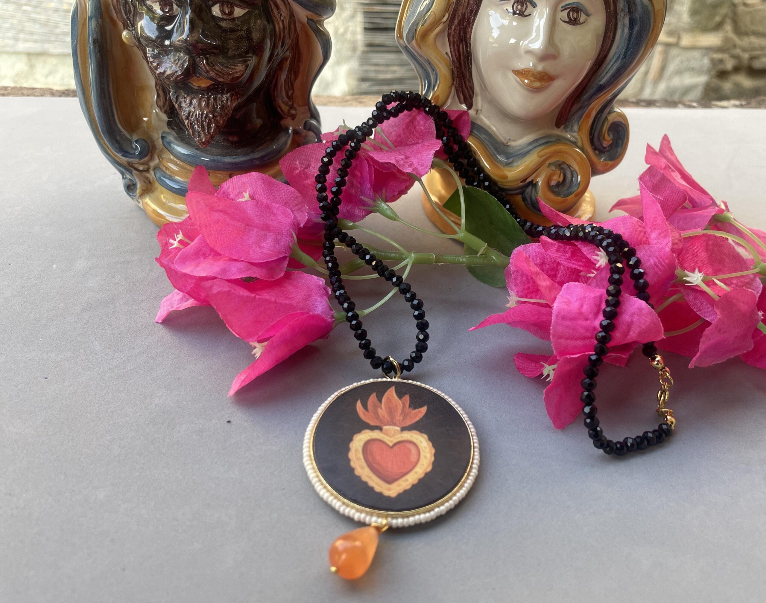 Collana siciliana con filo cristalli neri, grande medaglione double-face con Cuore Sacro, perla a goccia di Occhio di gatto.
