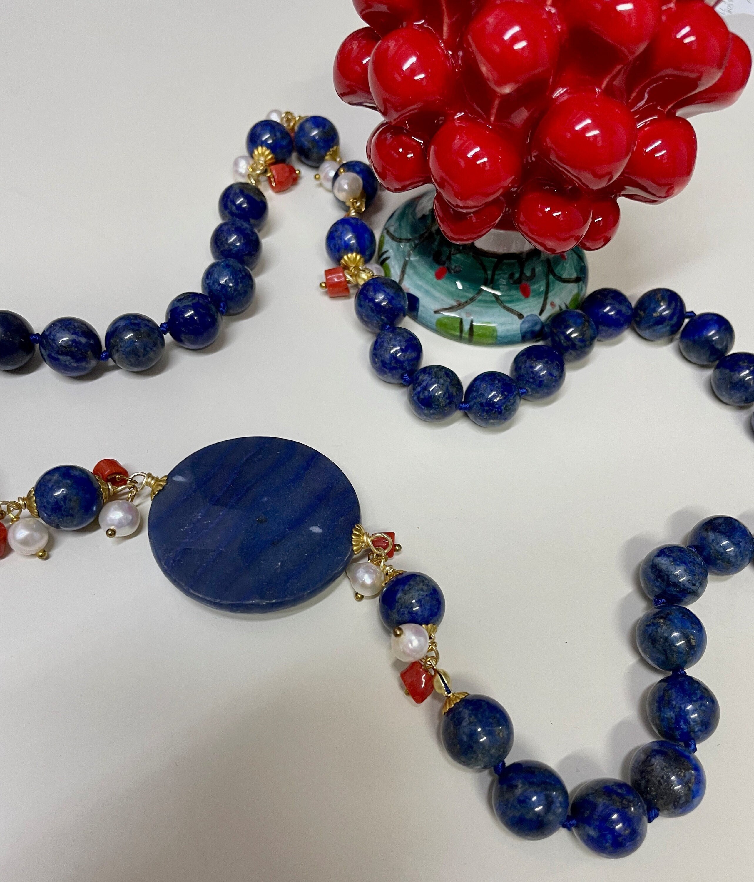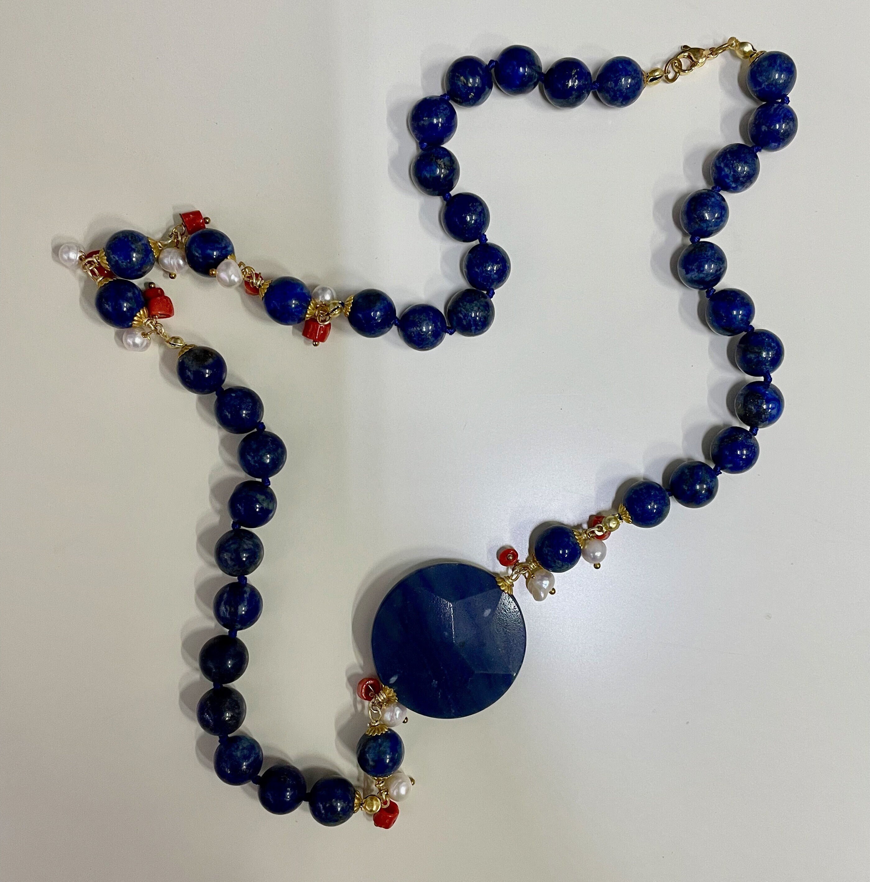 Elegante collana artigianale, realizzata con filo di perle di lapislazzuli, singolarmente annodate, interrotta da piccole perle di fiume e coralli, e una grande perla piatta di Avventurina blu.