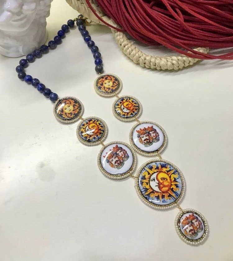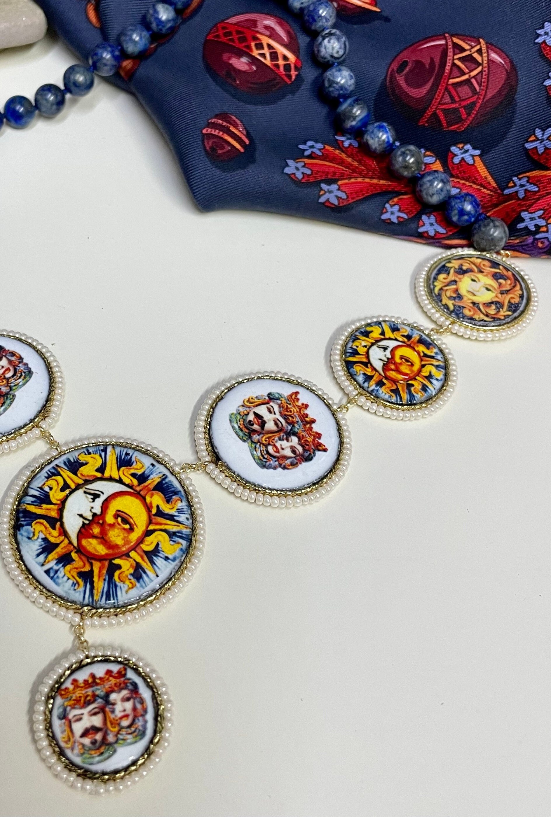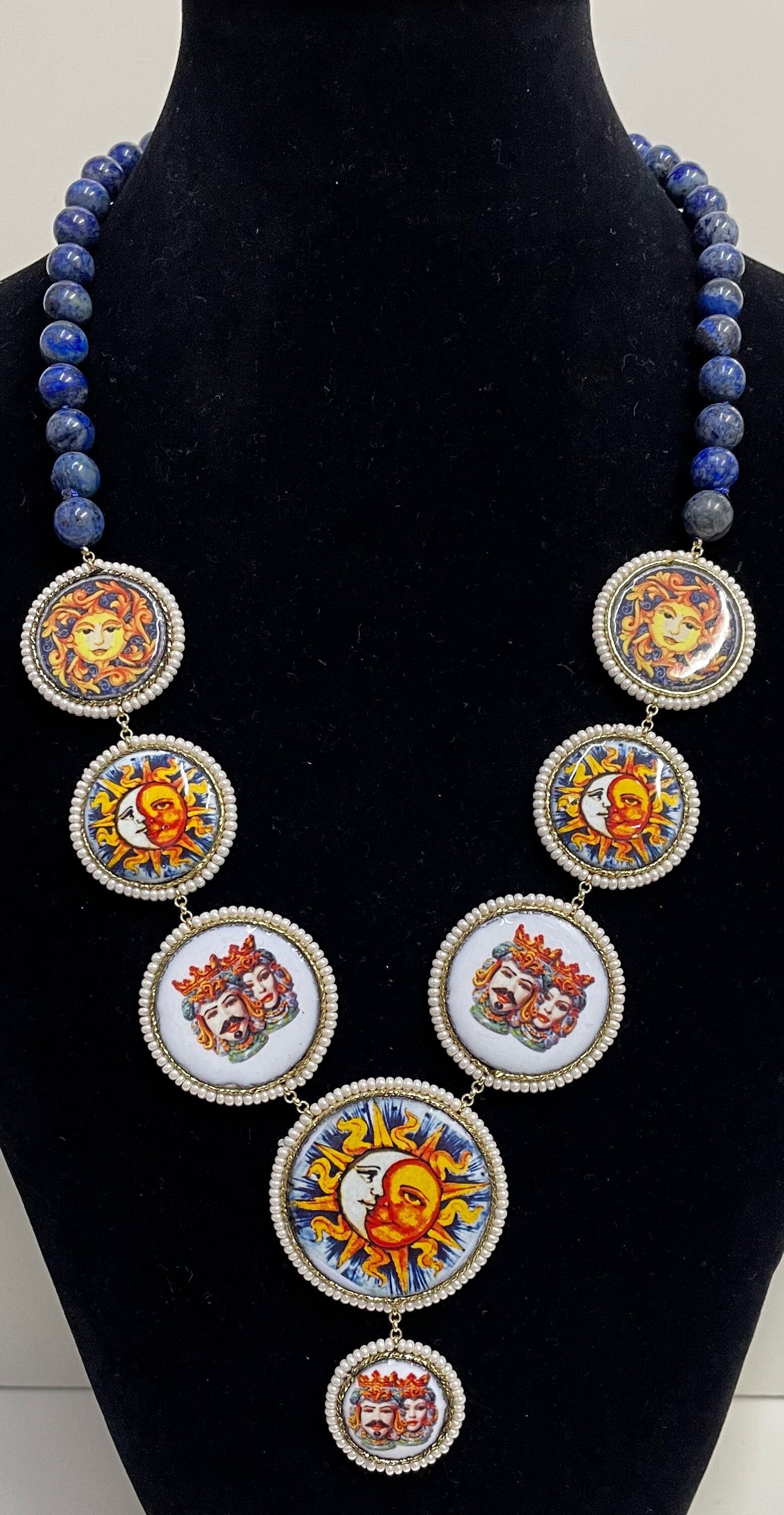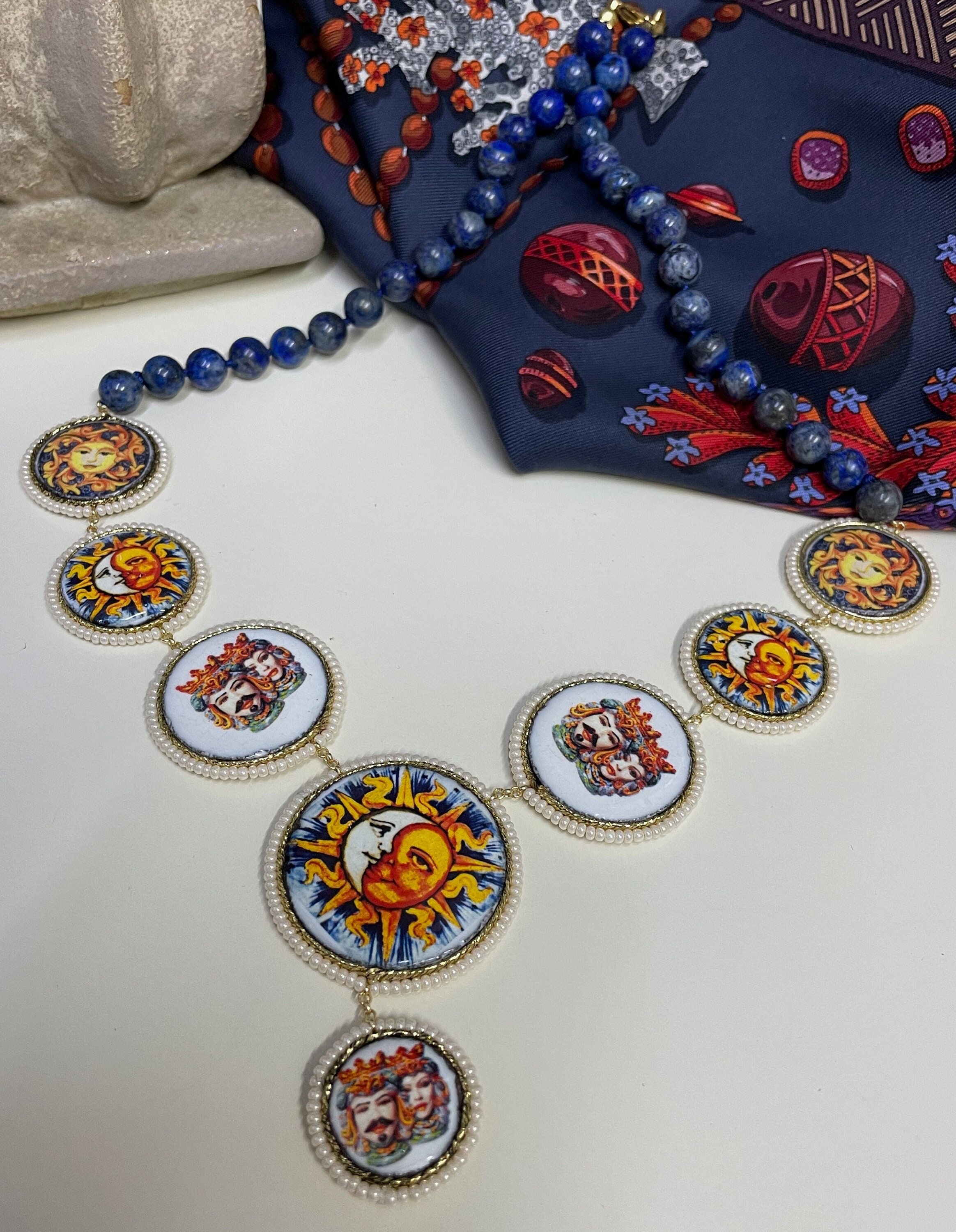 Collana di grande effetto con filo di perle di lapislazzuli e otto mattonelle tonde di ceramica di Caltagirone montate a mosaico.