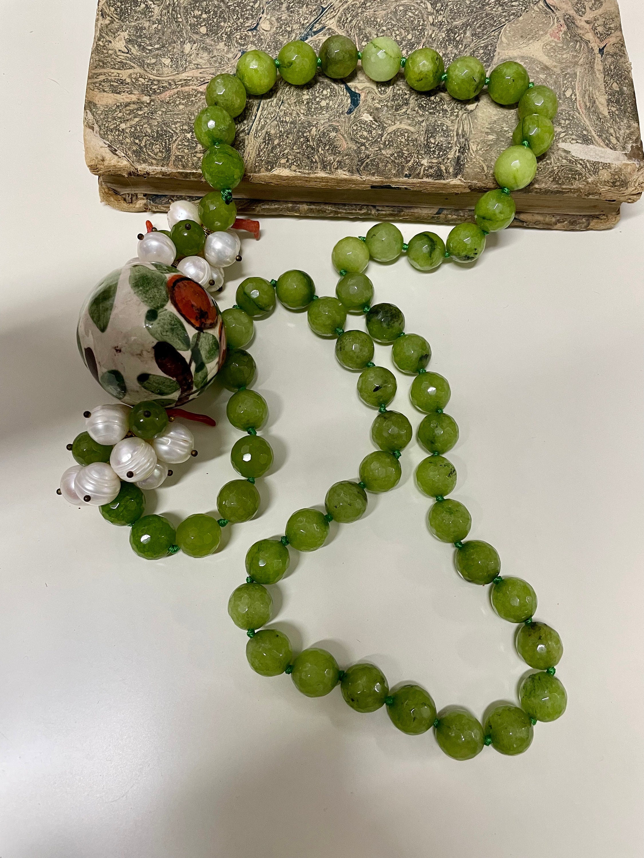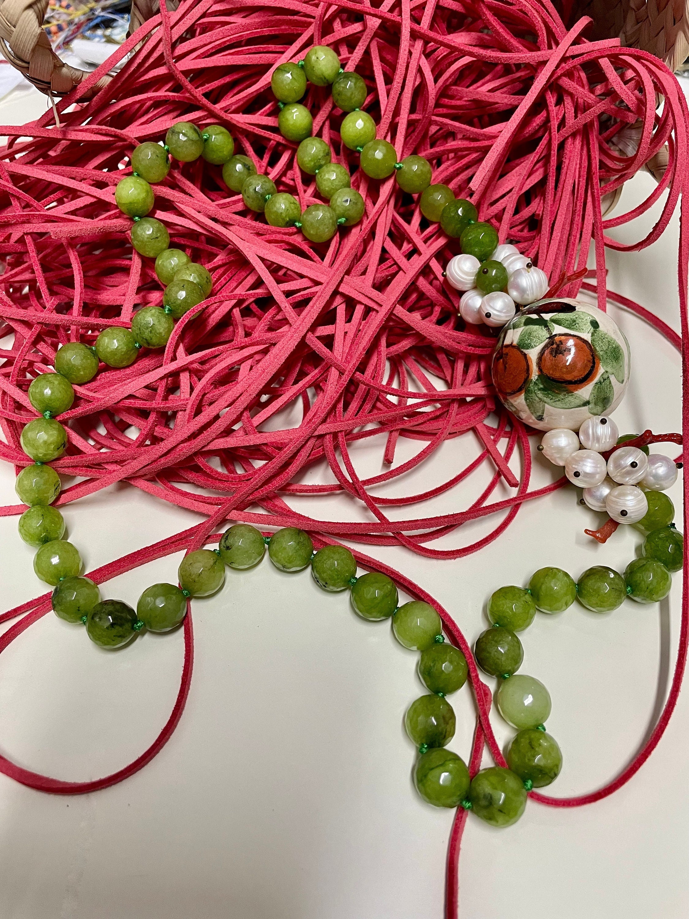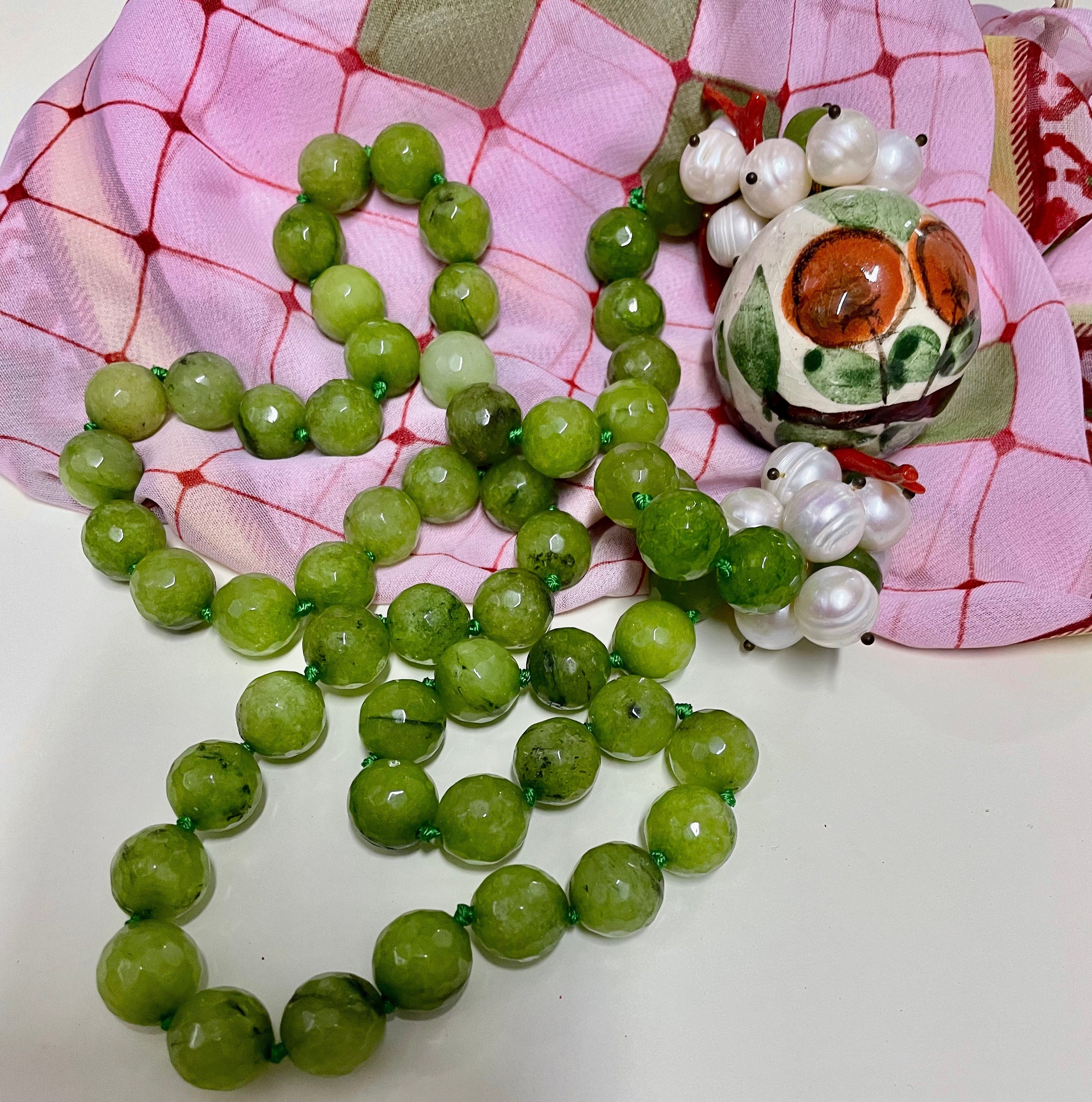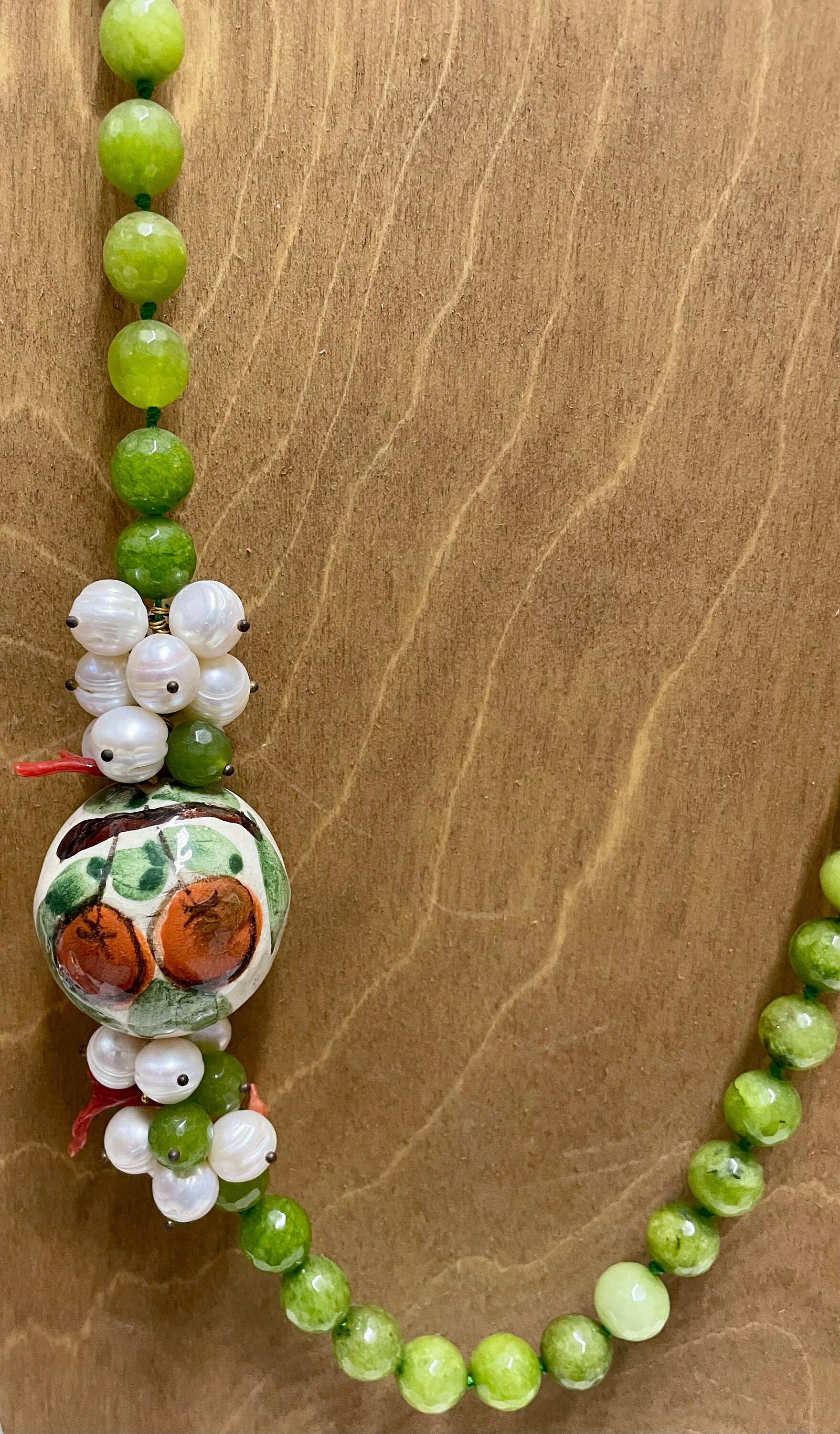 Realizzata con filo di perle in agata verde, singolarmente annodate, interrotta da una grande Palla in ceramica di Caltagirone, dipinta a mano, e perle di fiume.