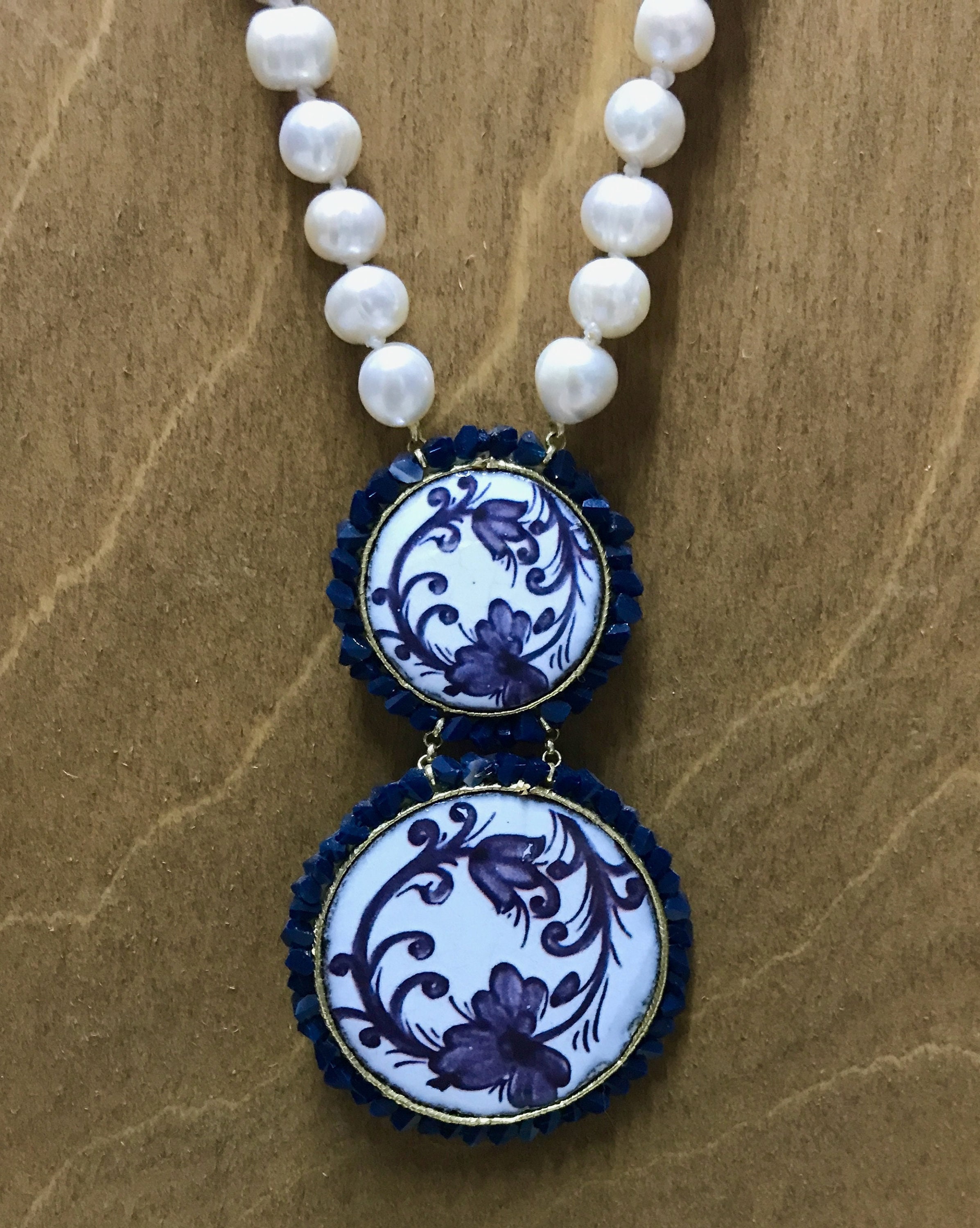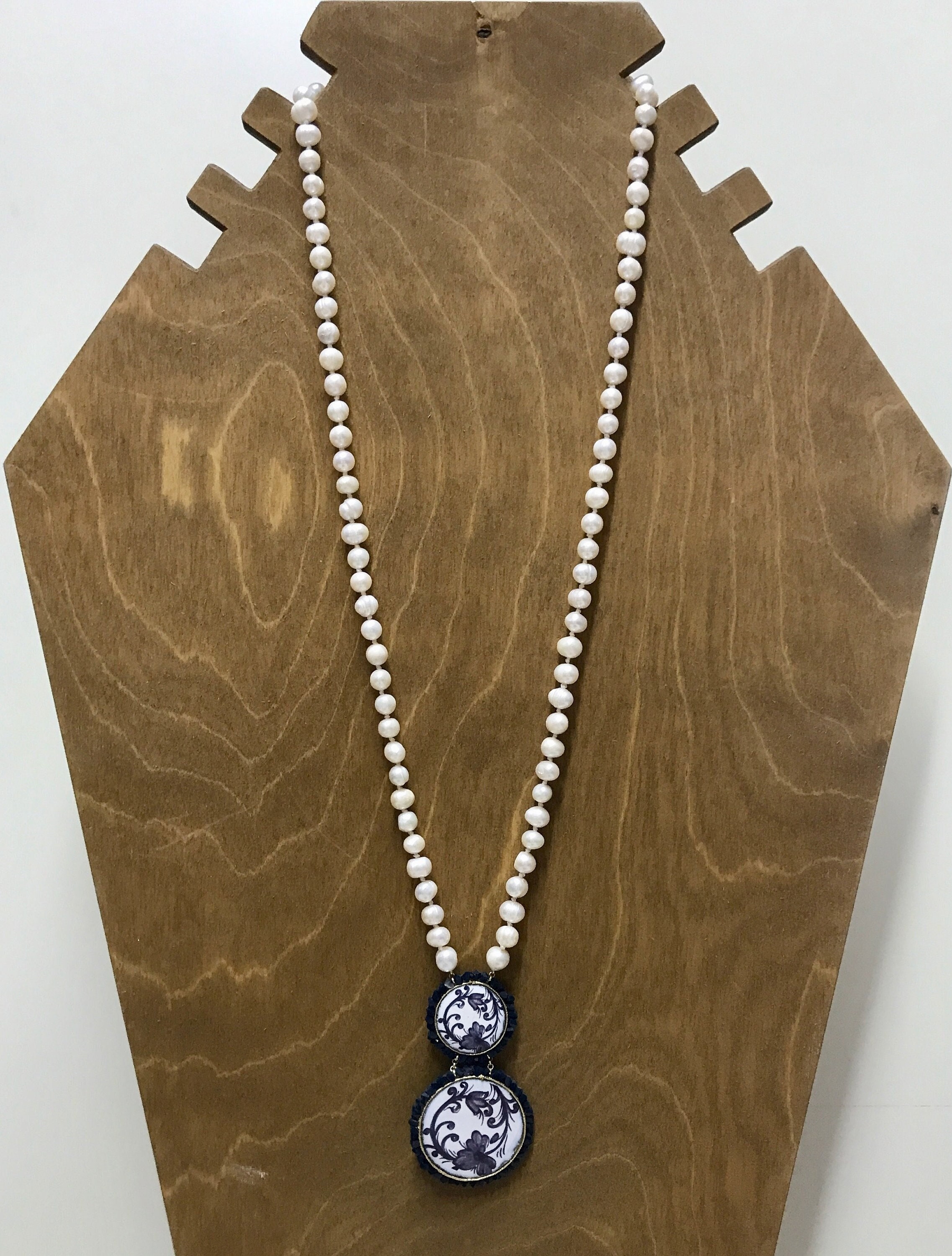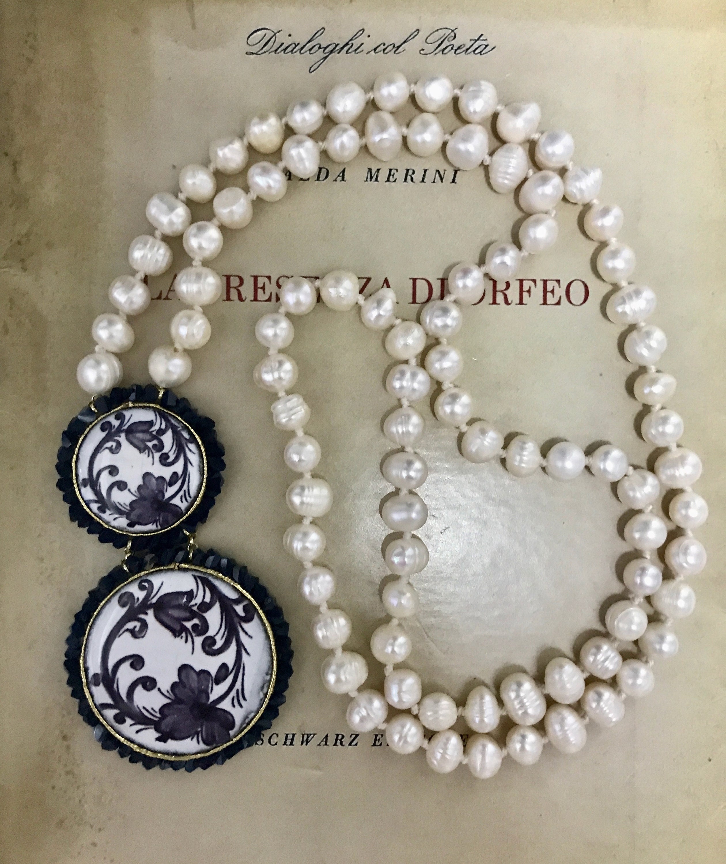 Bel filo di perle di fiume, singolarmente annodate, e pendenti due mattonelle tonde di Ceramica di Caltagirone stampate in superficie.