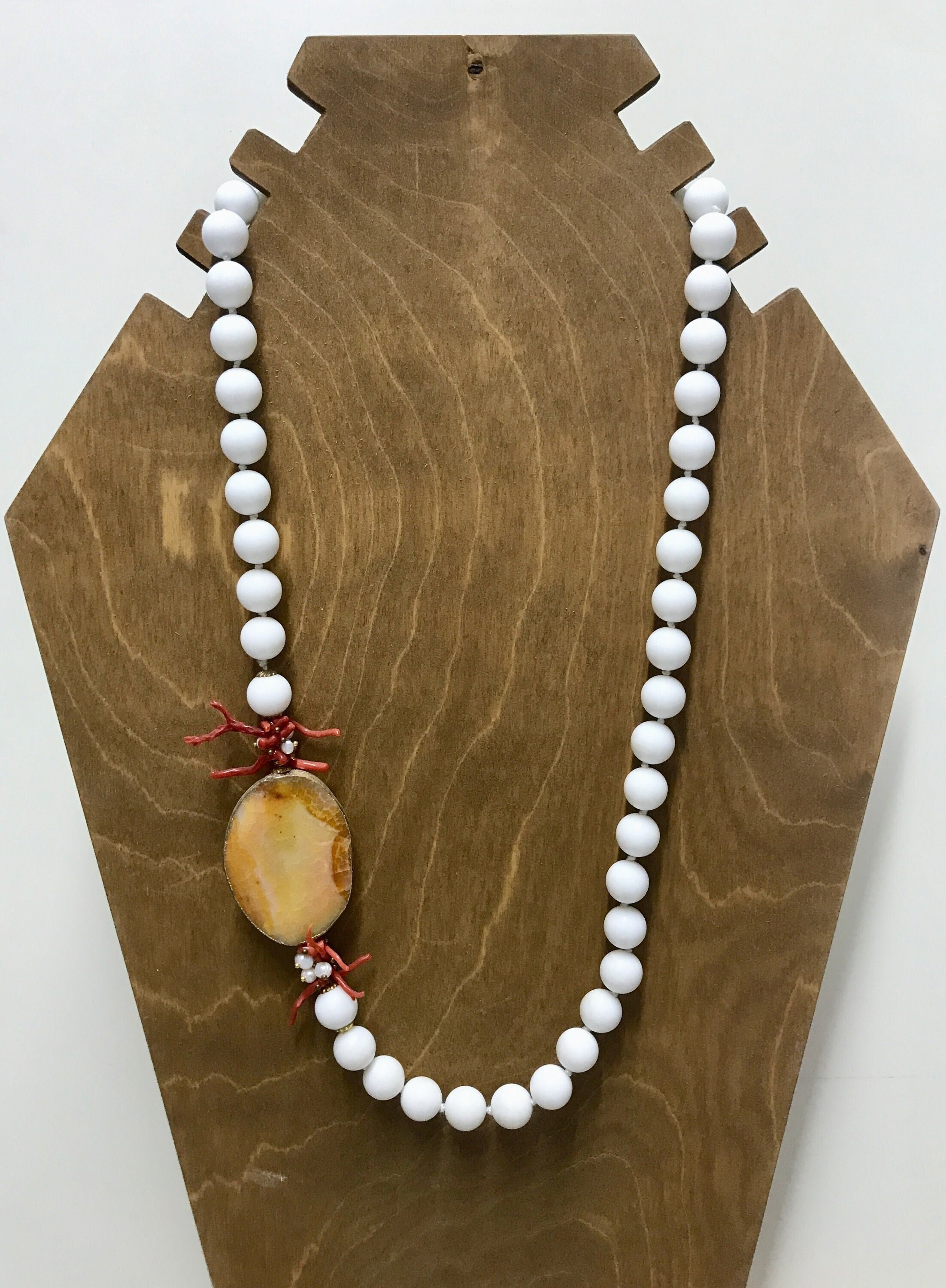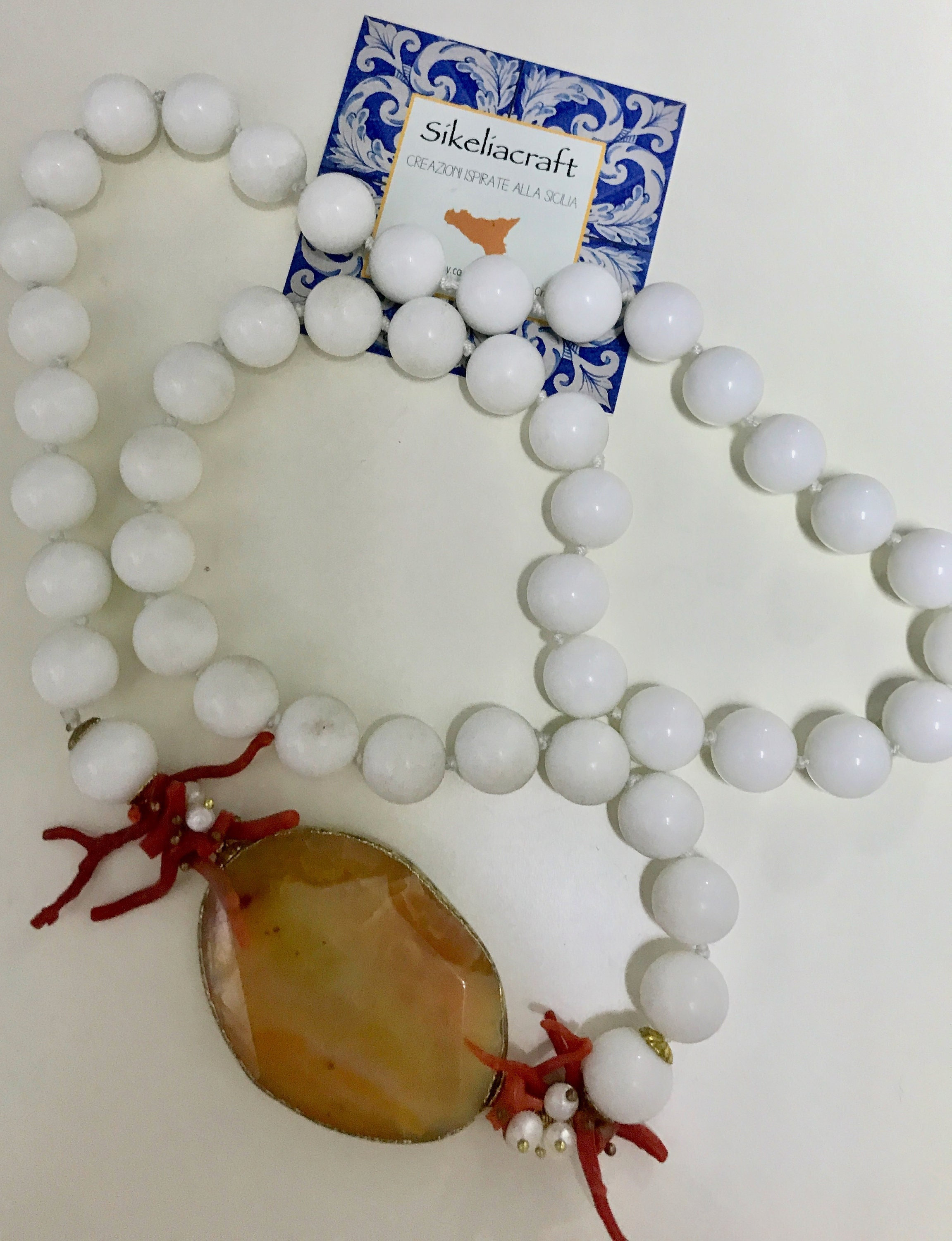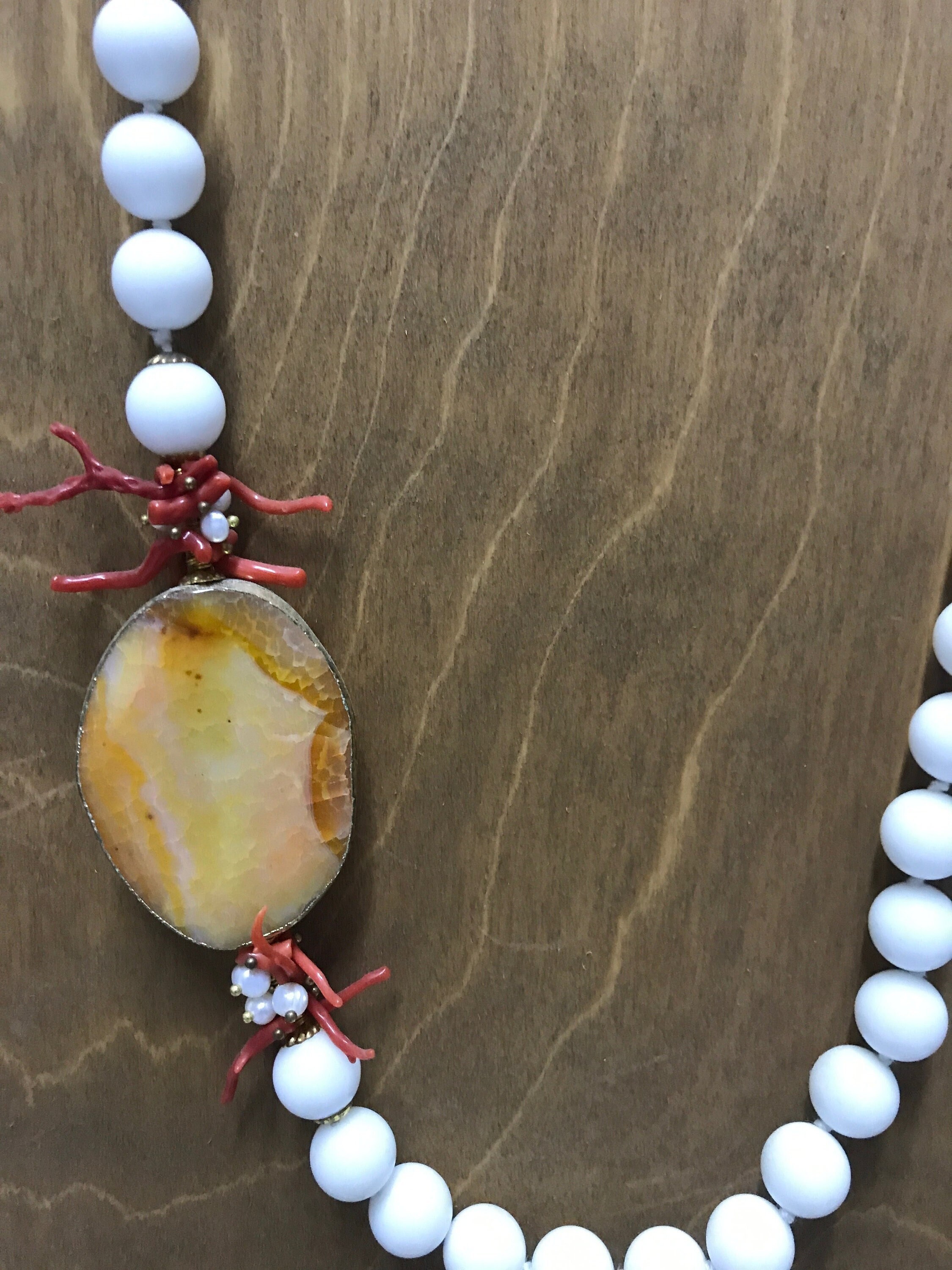 Collana artigianale, realizzata con filo di perle in agata bianca, singolarmente annodate, e interrotta da un una piastra di agata arancione ovale contornata da rametti di corallo.