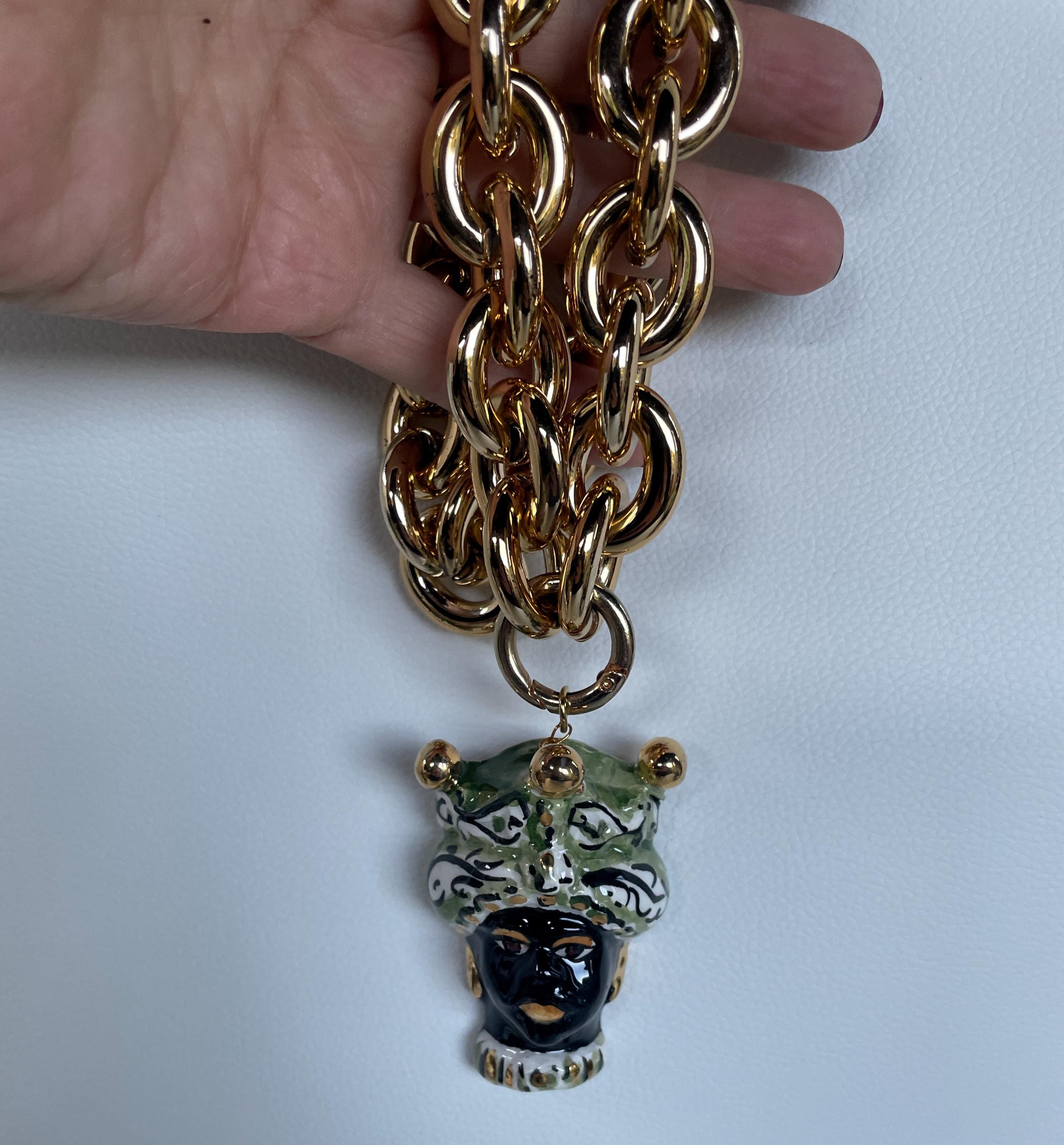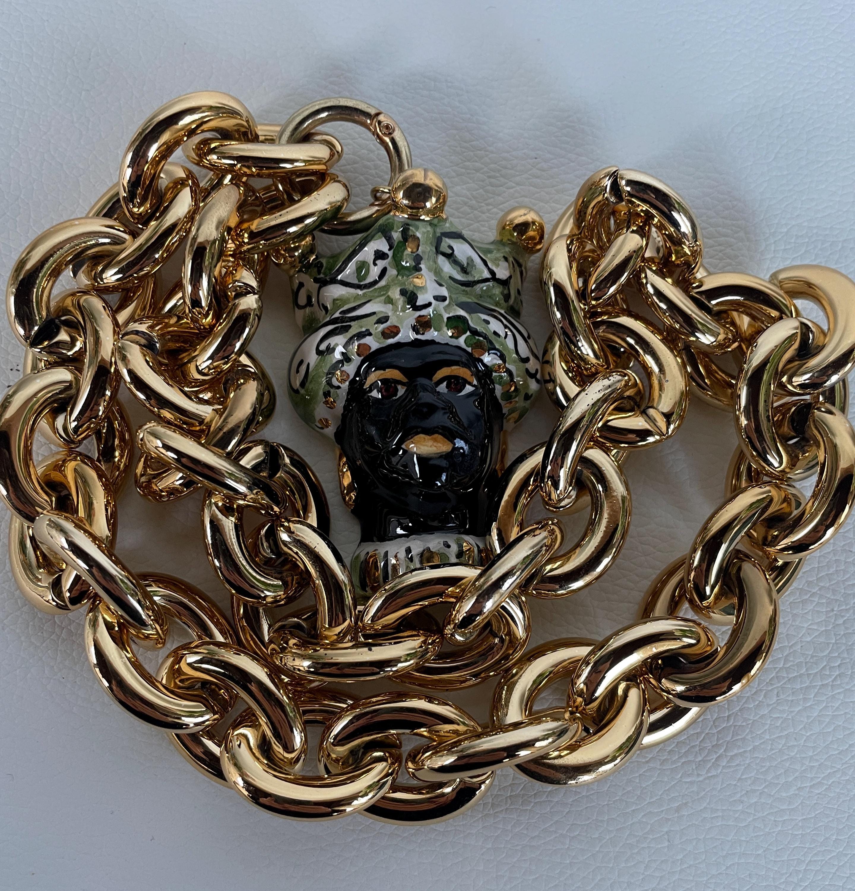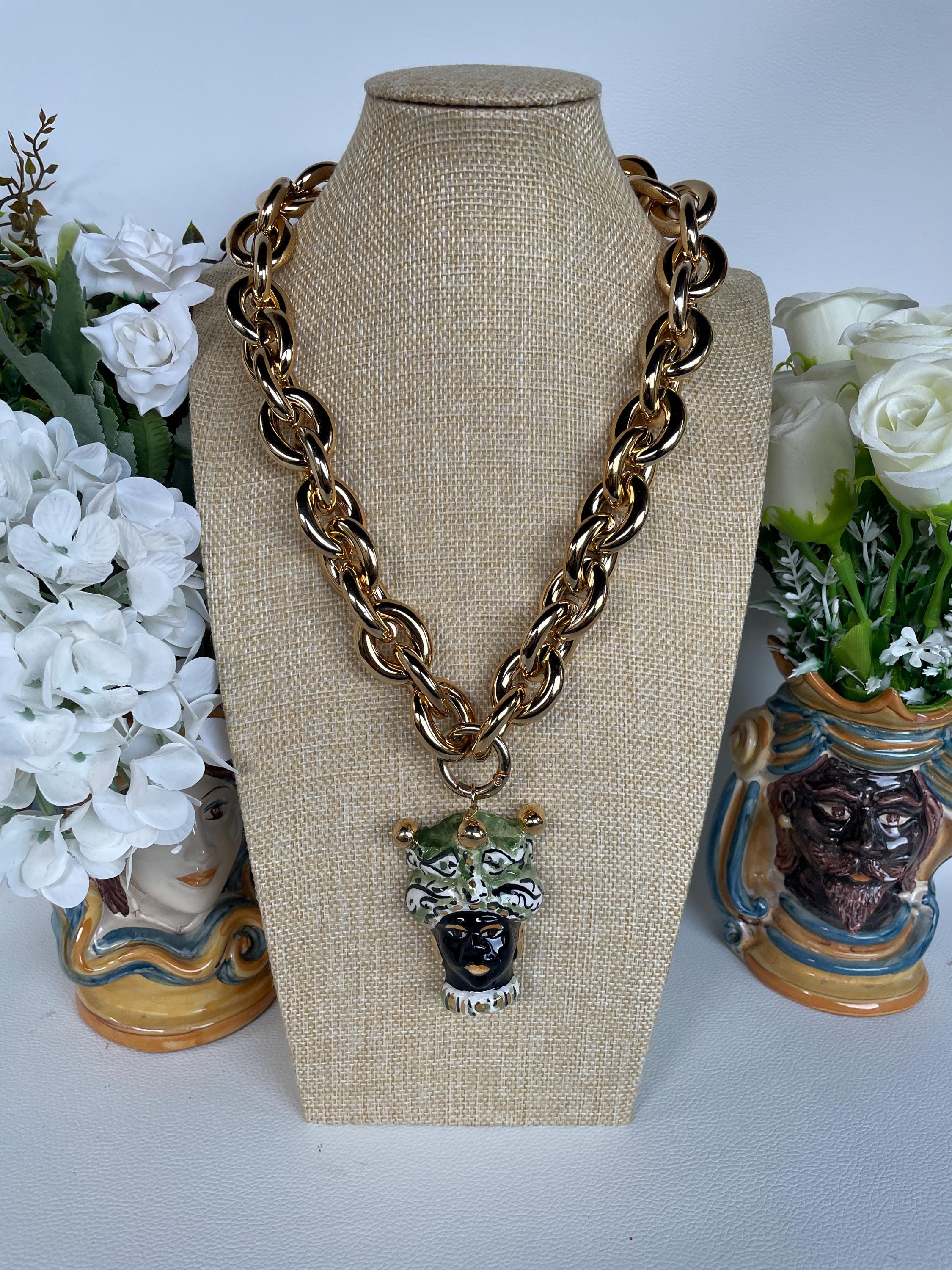 Per chi non vuole passare inosservata è la collana perfetta realizzata con una catena a maglie grosse di alluminio anallergico colore oro e uno splendido ciondolo di ceramica di Caltagirone, dipinto a mano, raffigurante una testa di moro.