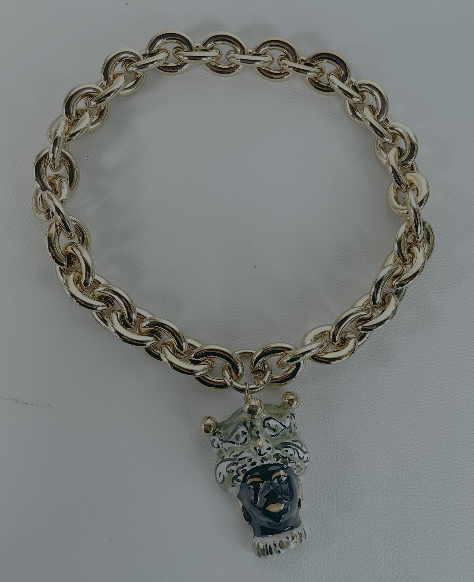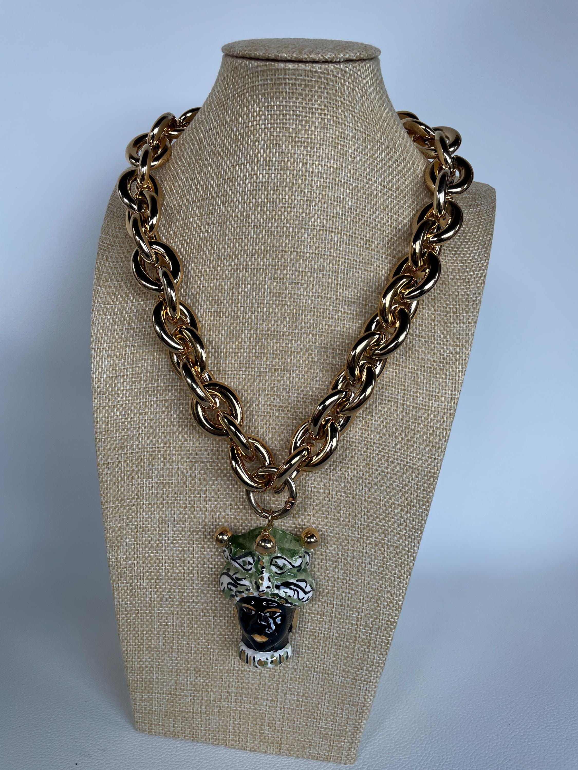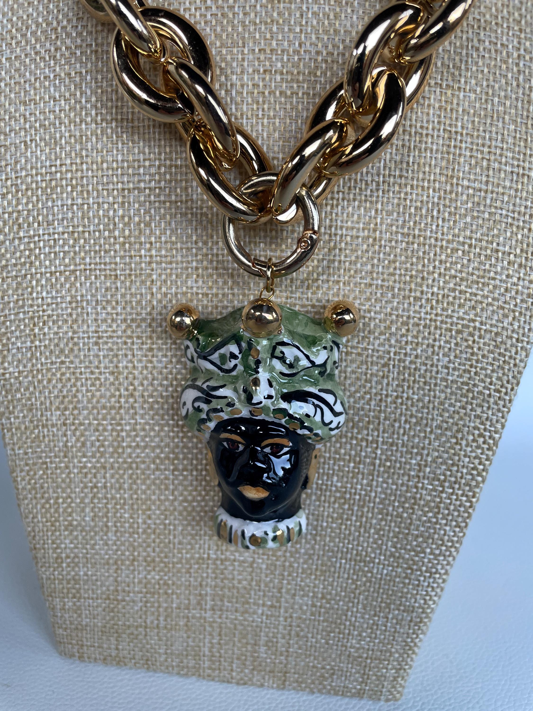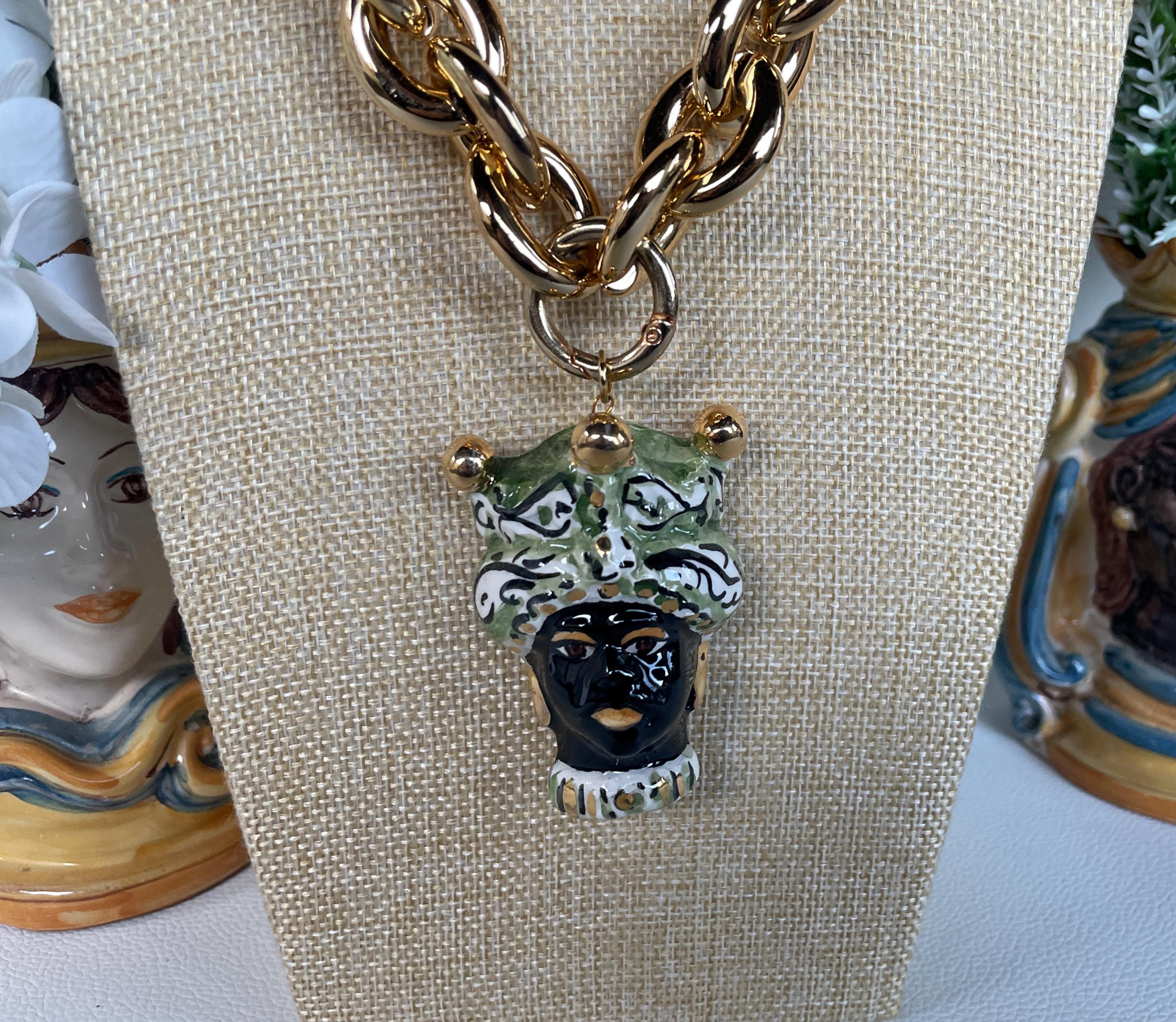 Per chi non vuole passare inosservata è la collana perfetta realizzata con una catena a maglie grosse di alluminio anallergico colore oro e uno splendido ciondolo di ceramica di Caltagirone, dipinto a mano, raffigurante una testa di moro.