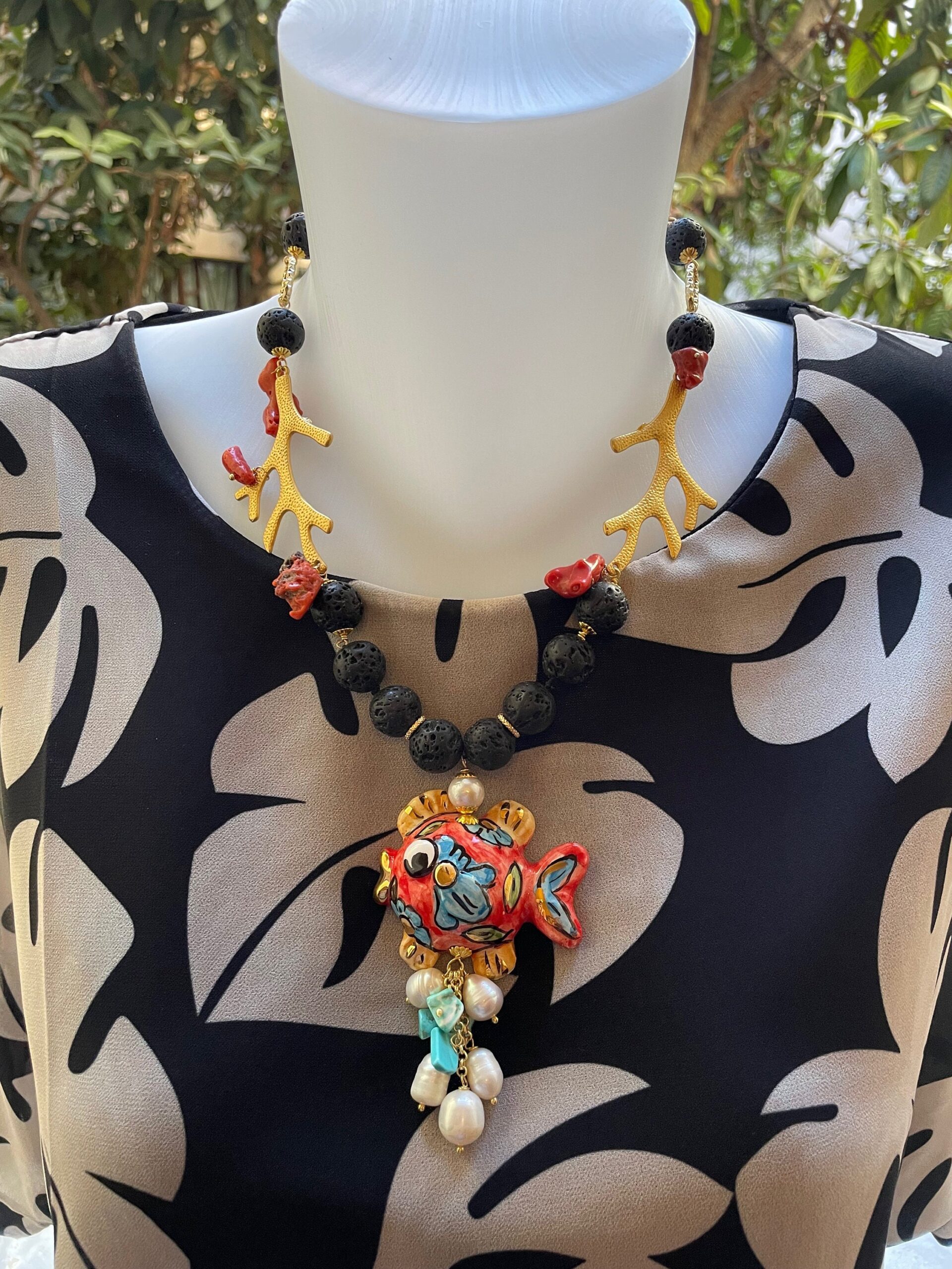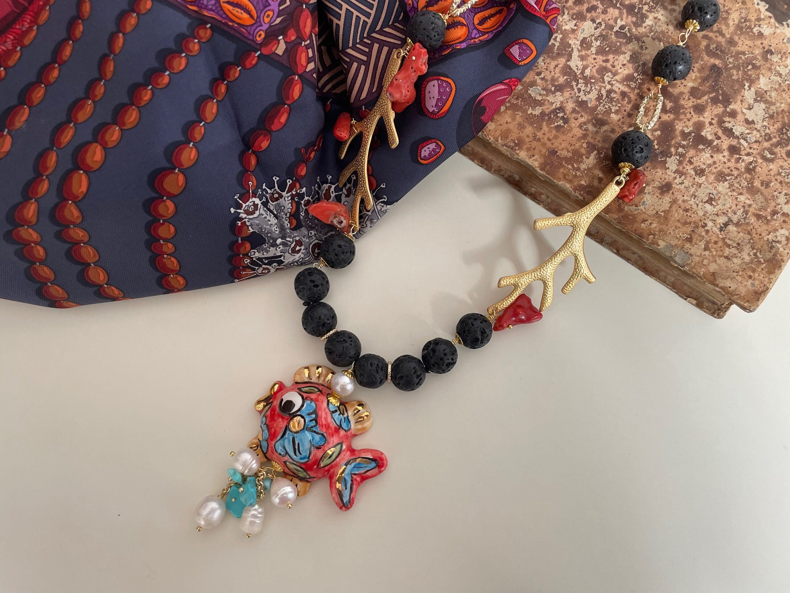 Completa il gioiello un ciondolo a forma di Pesce di Ceramica di Caltagirone, dipinto a mano, con grappolo di perle di fiume e chips turchesi.