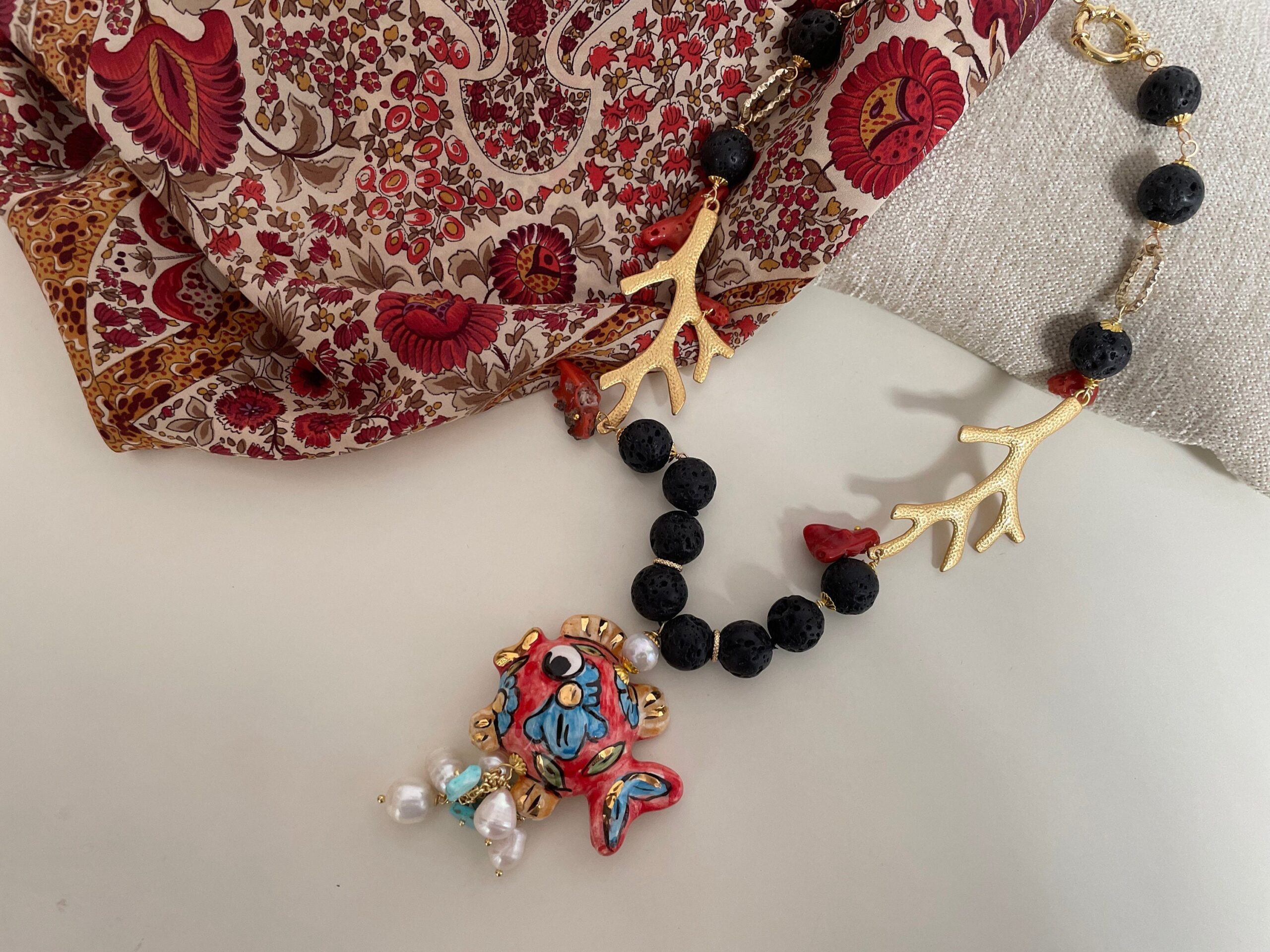 Realizzata con perle di Lava, anelli di ottone, due connettori a forma di rami di corallo in ottone e pezzi di corallo autentico del Mediterraneo.