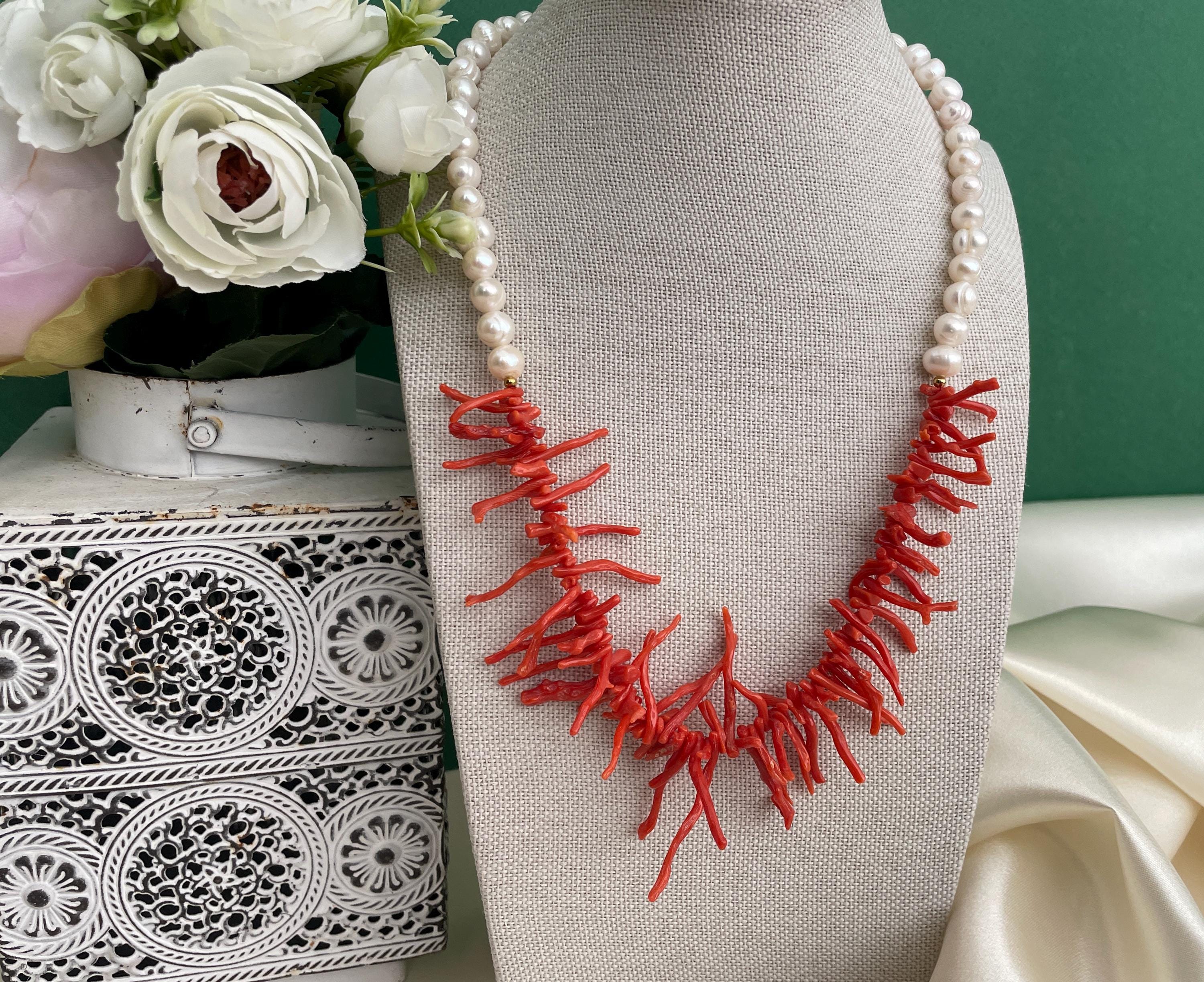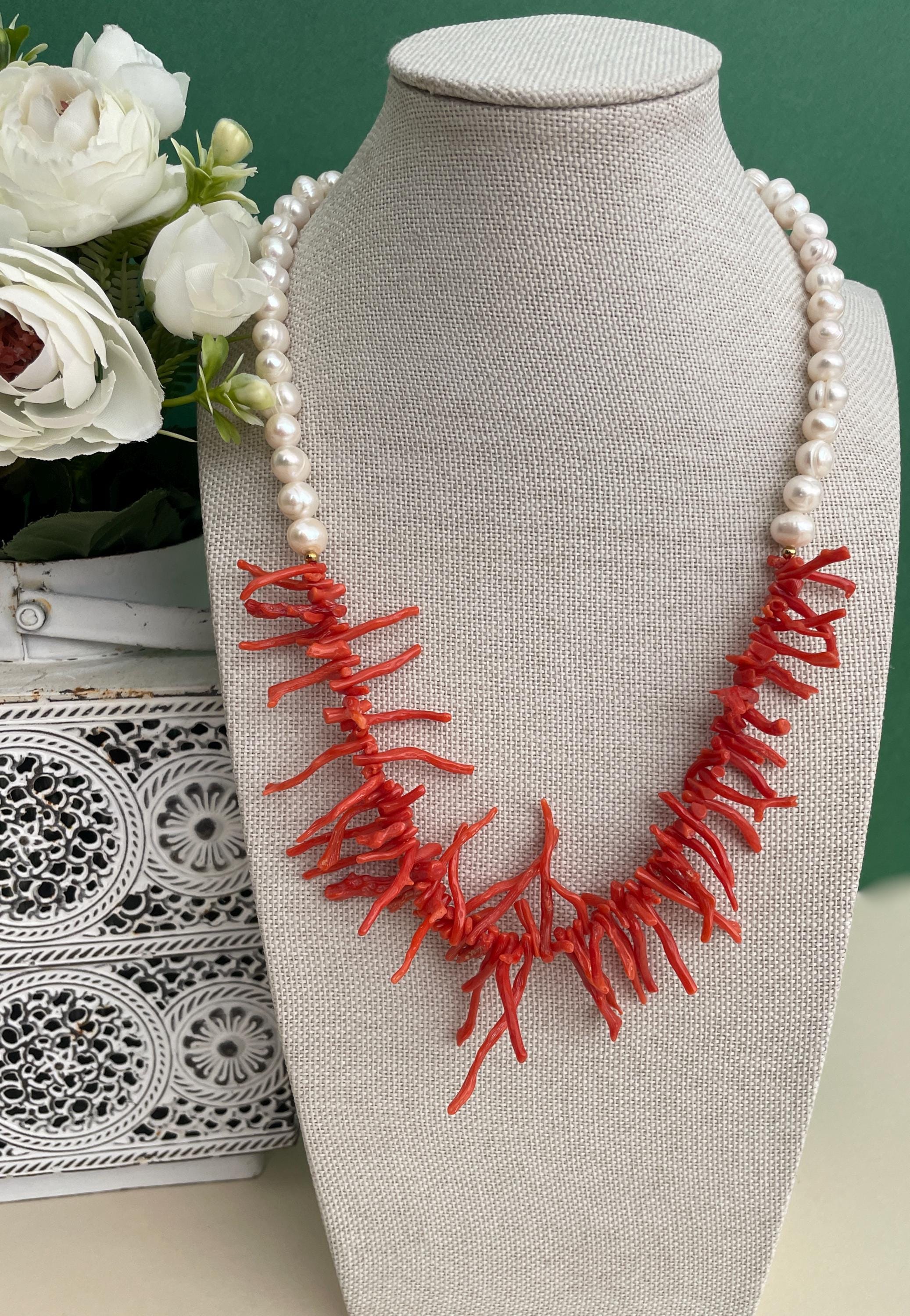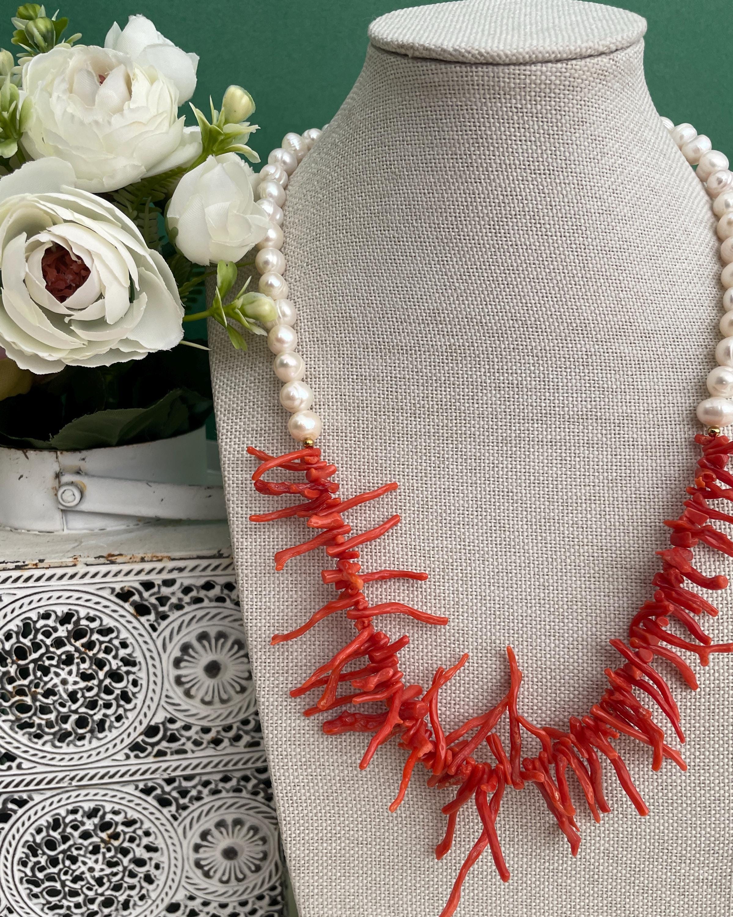 Collana siciliana con perle barocche e rami di Corallo autentico del Mediterraneo.