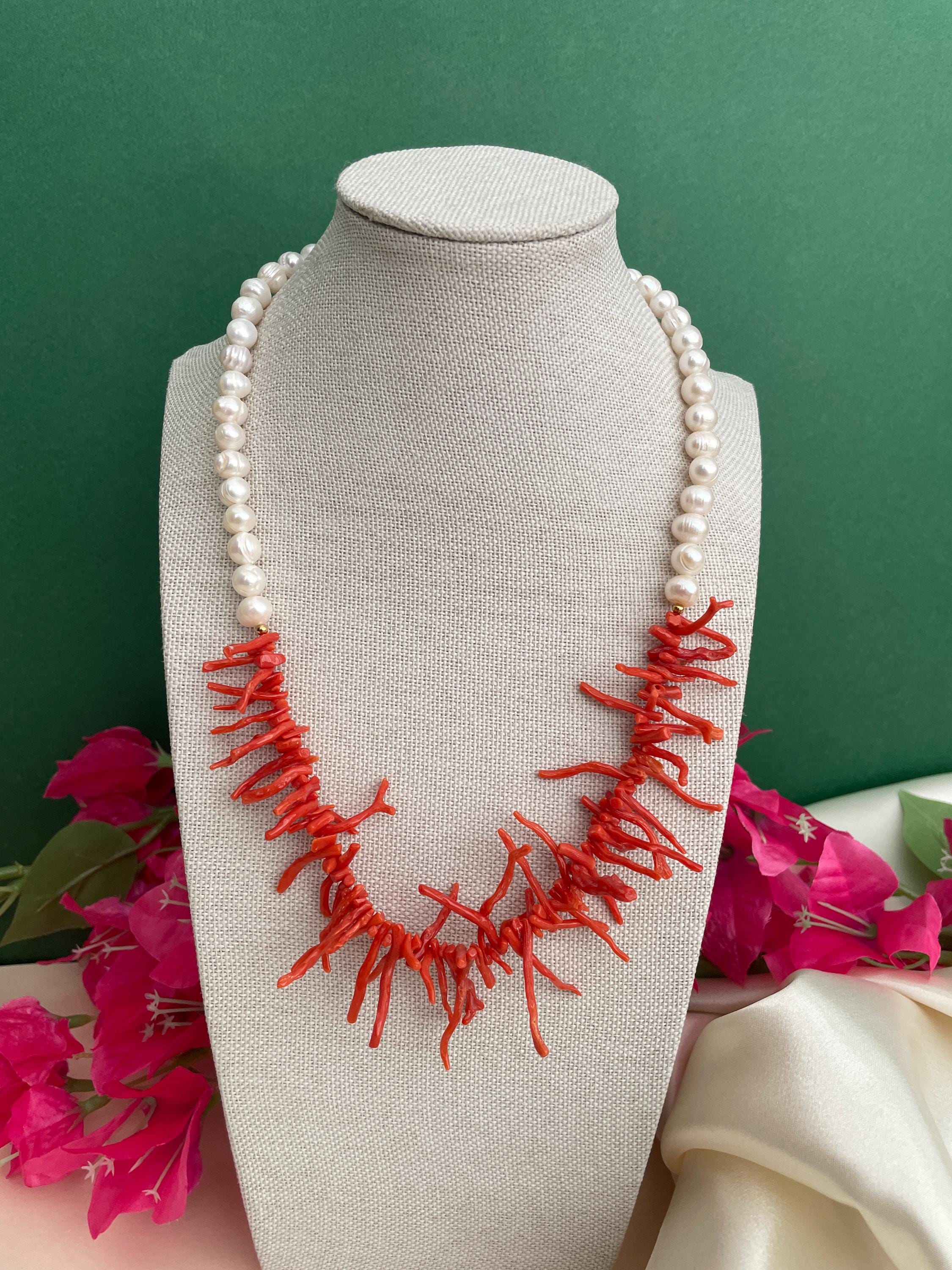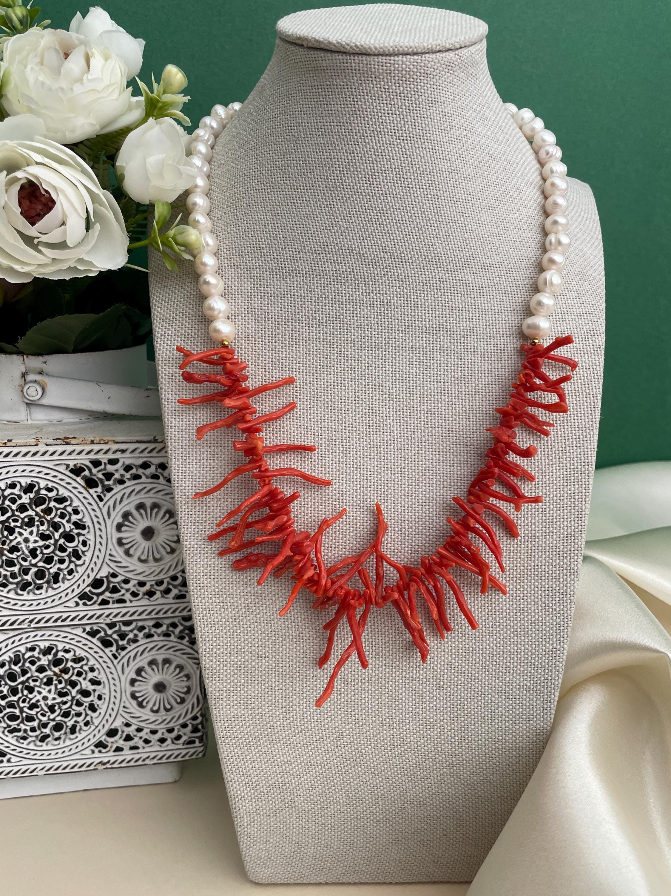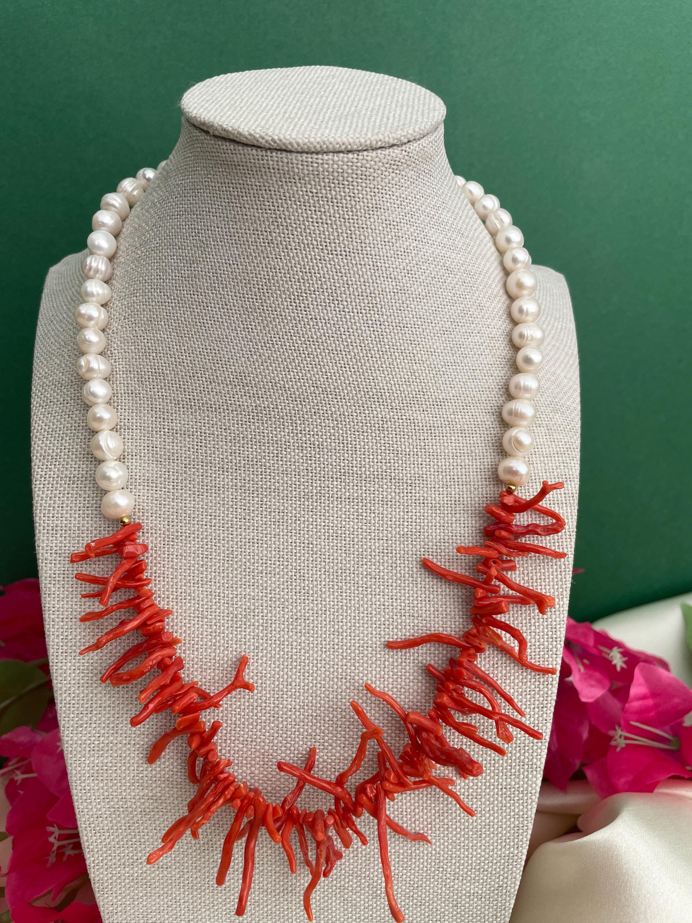 Collana siciliana con perle barocche e rami di Corallo autentico del Mediterraneo.