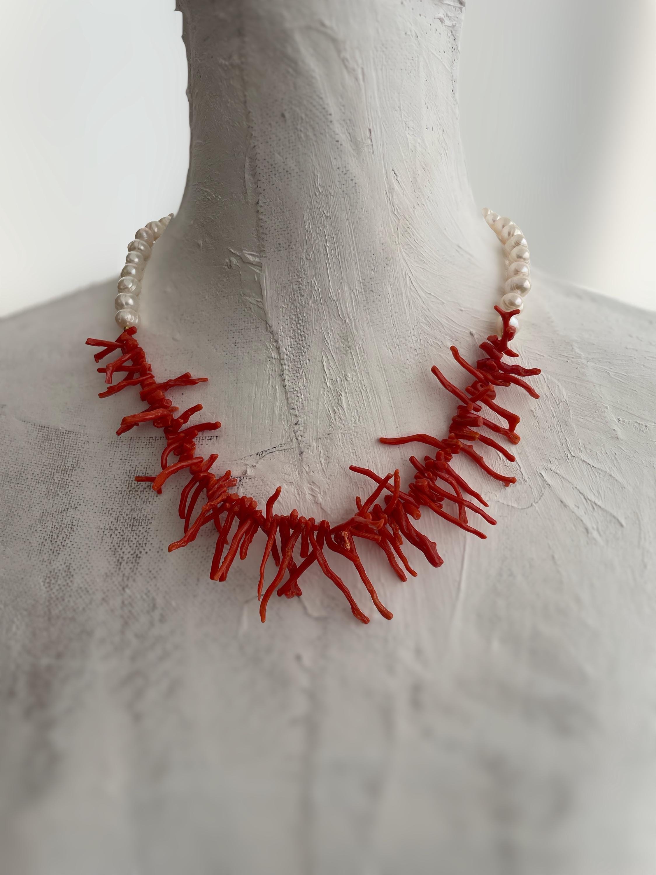 Realizzata nel sopragiro con un filo di perle barocche e nel sottogiro un filo progressivo di rami di Corallo rosso autentico del Mediterraneo.