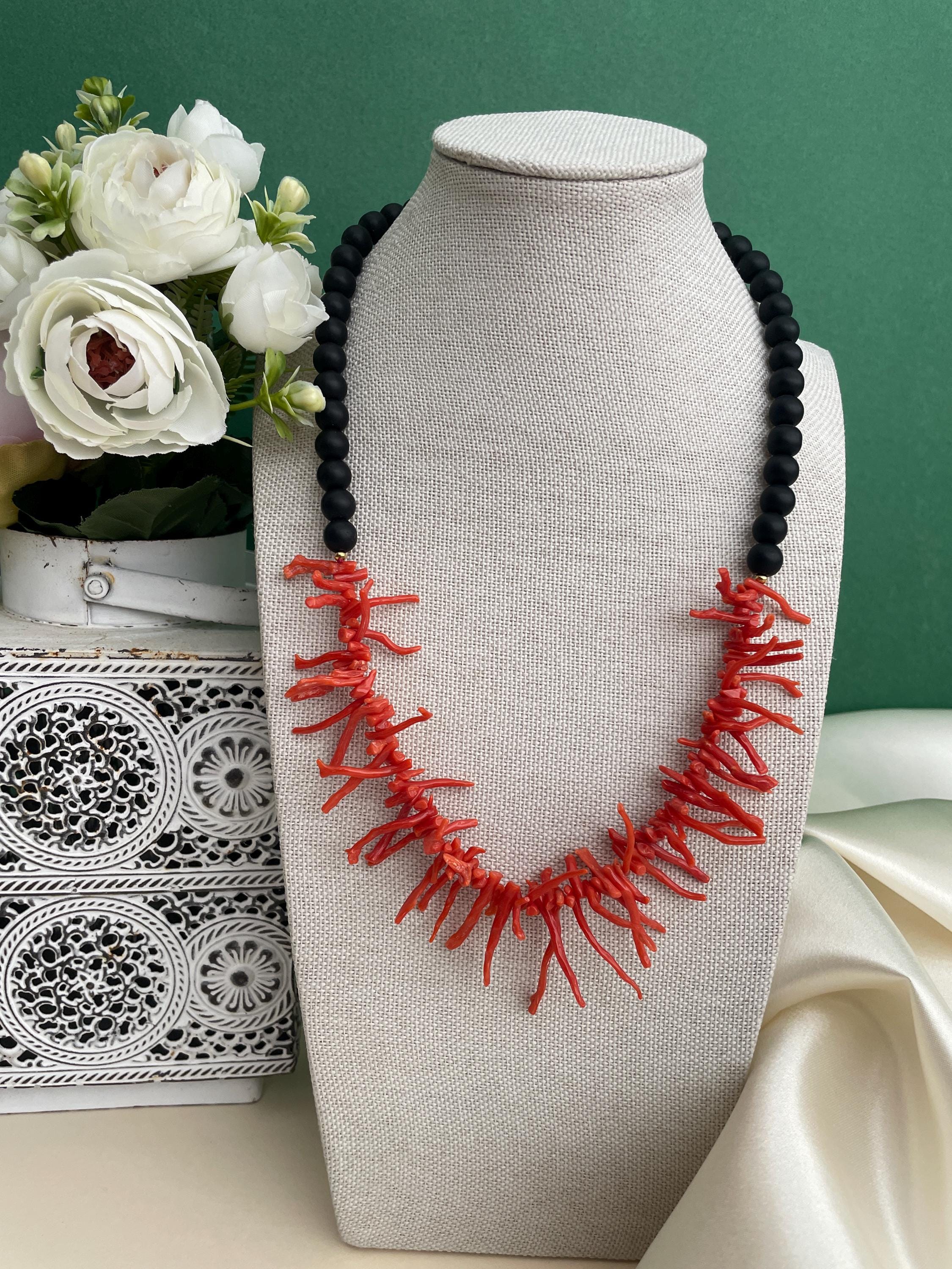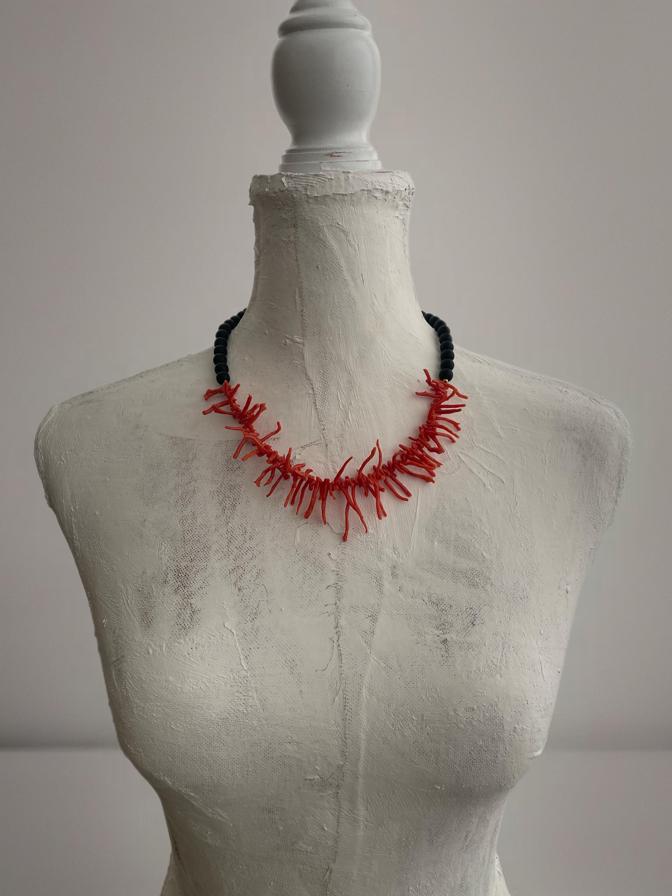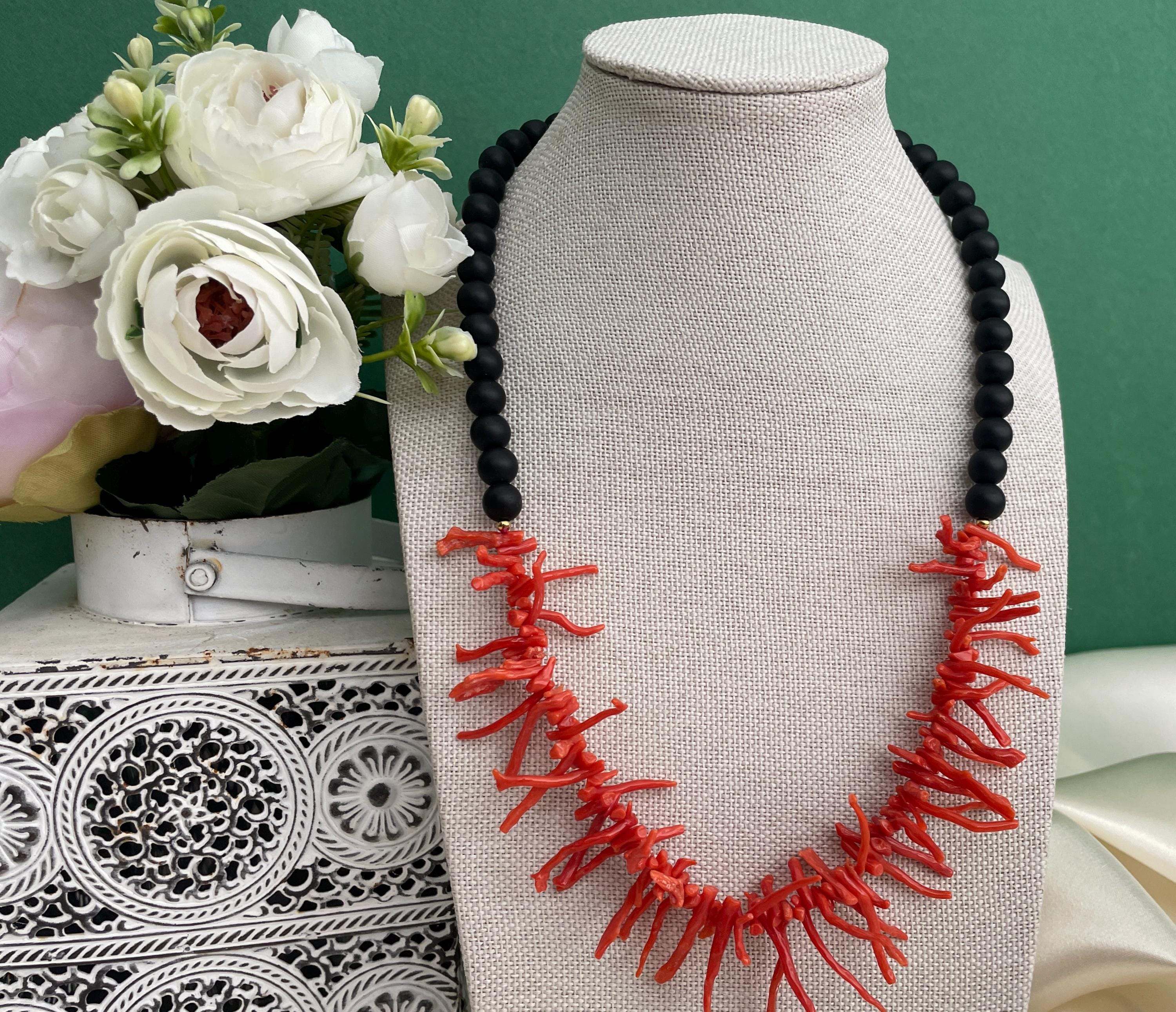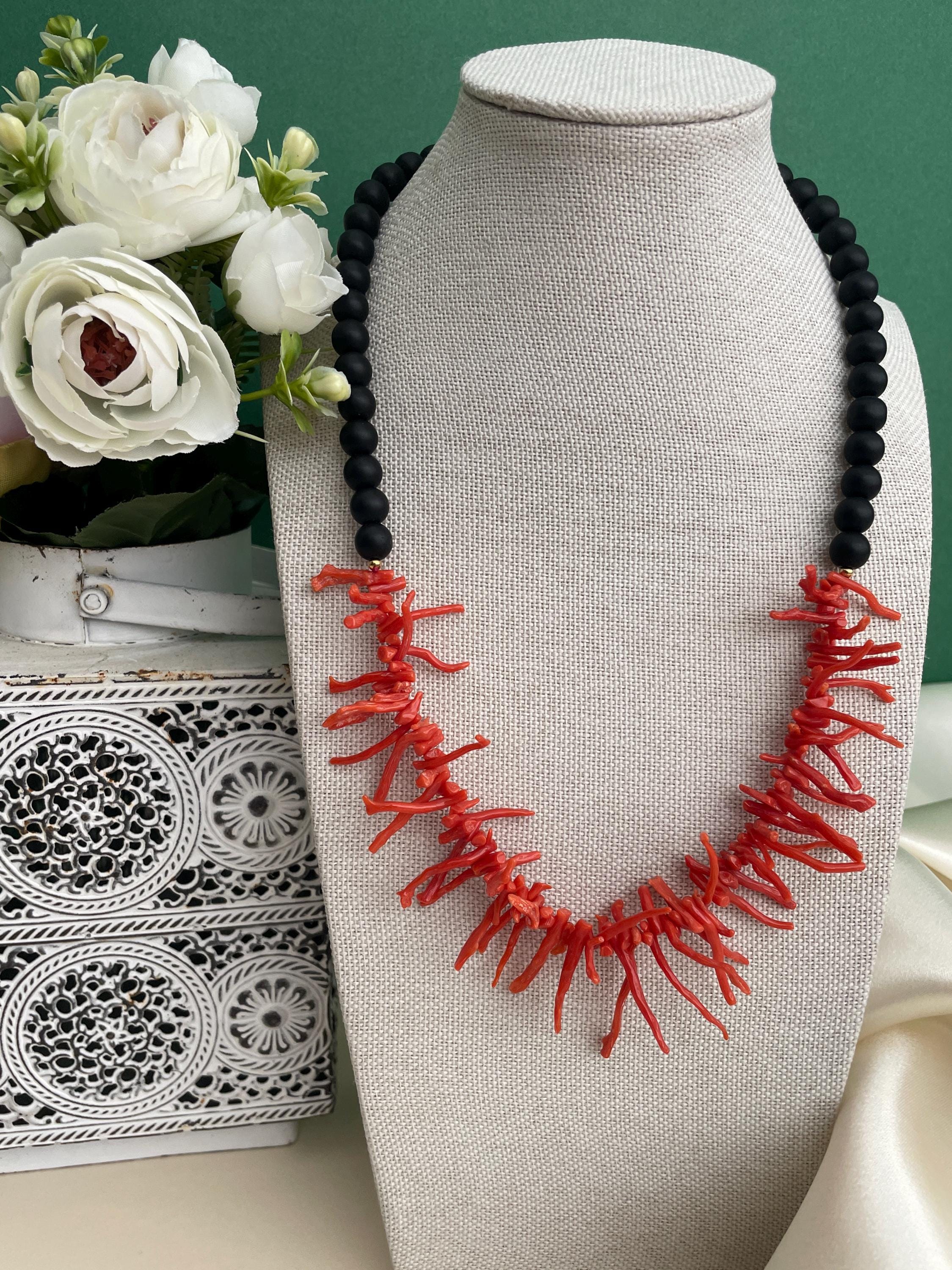 Collana siciliana con perle di lava dell’Etna e rami di Corallo autentico del Mediterraneo.