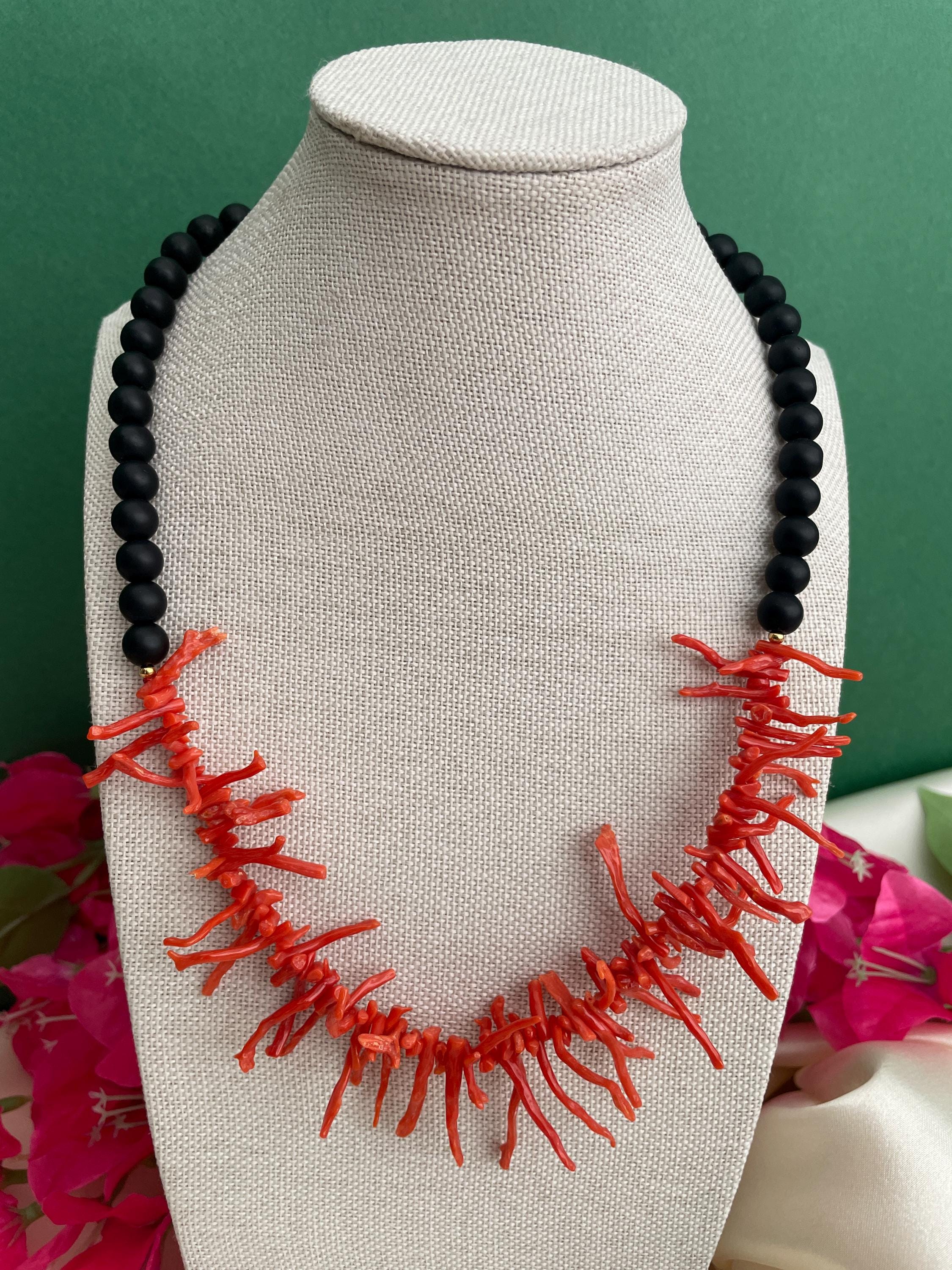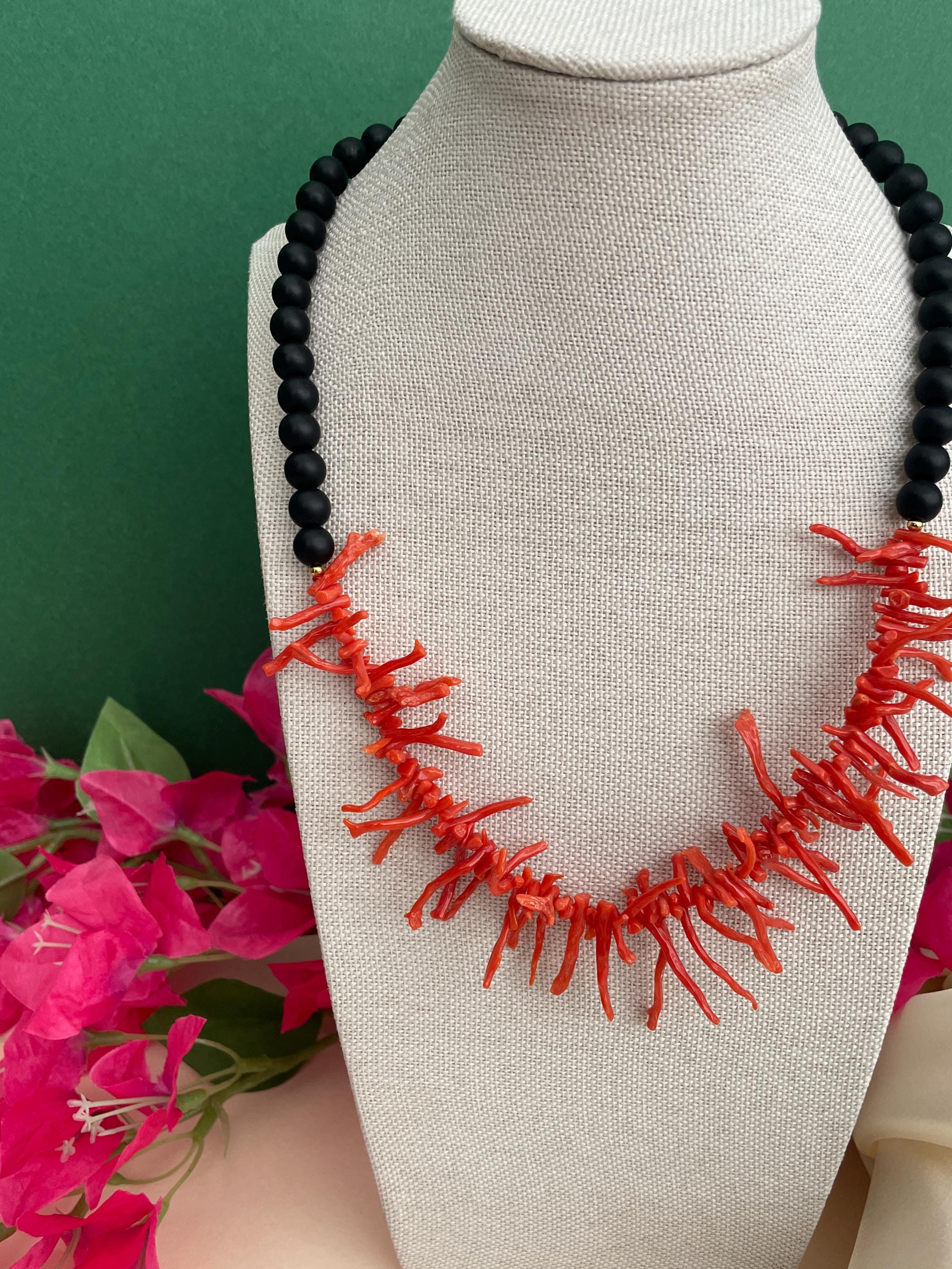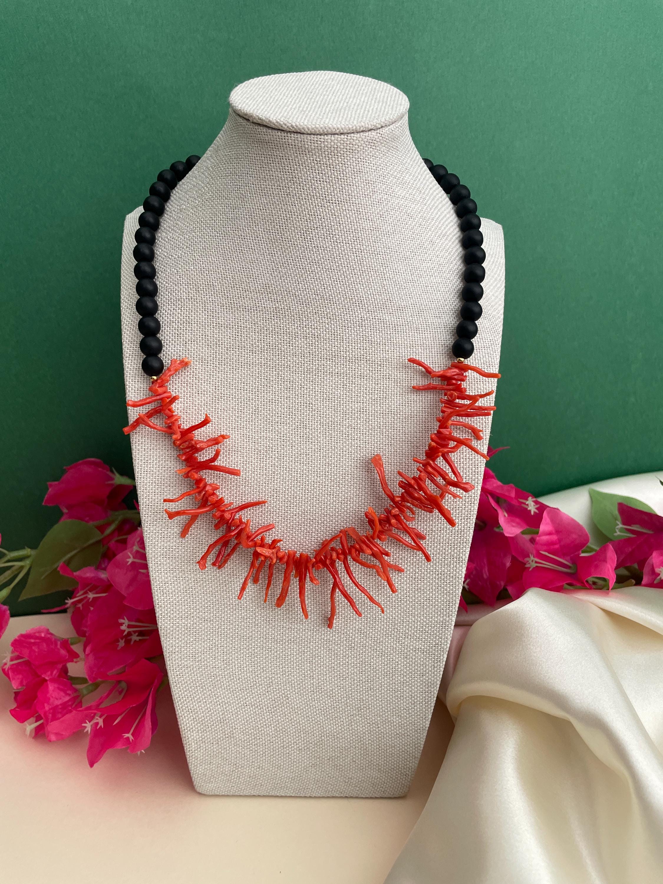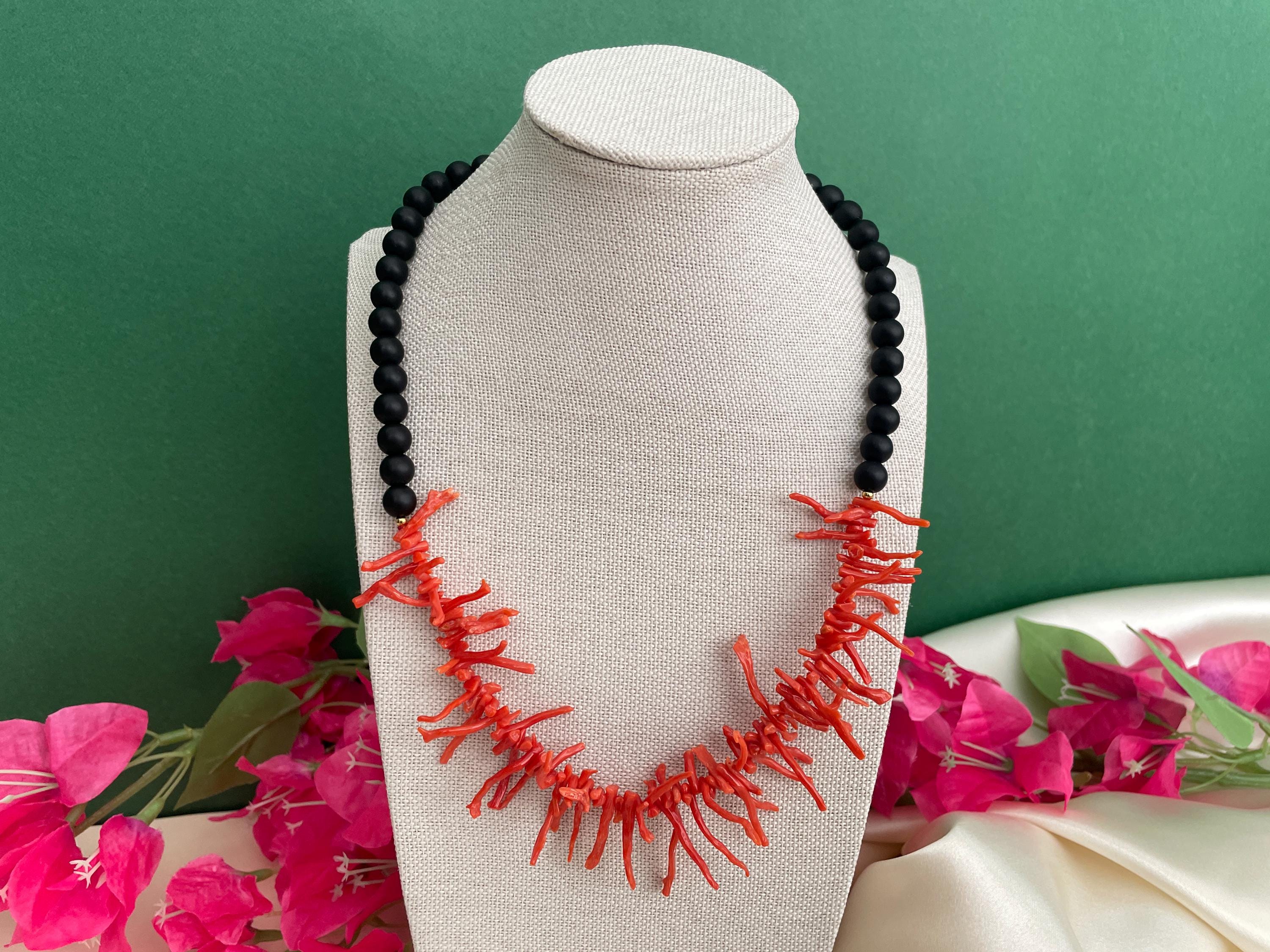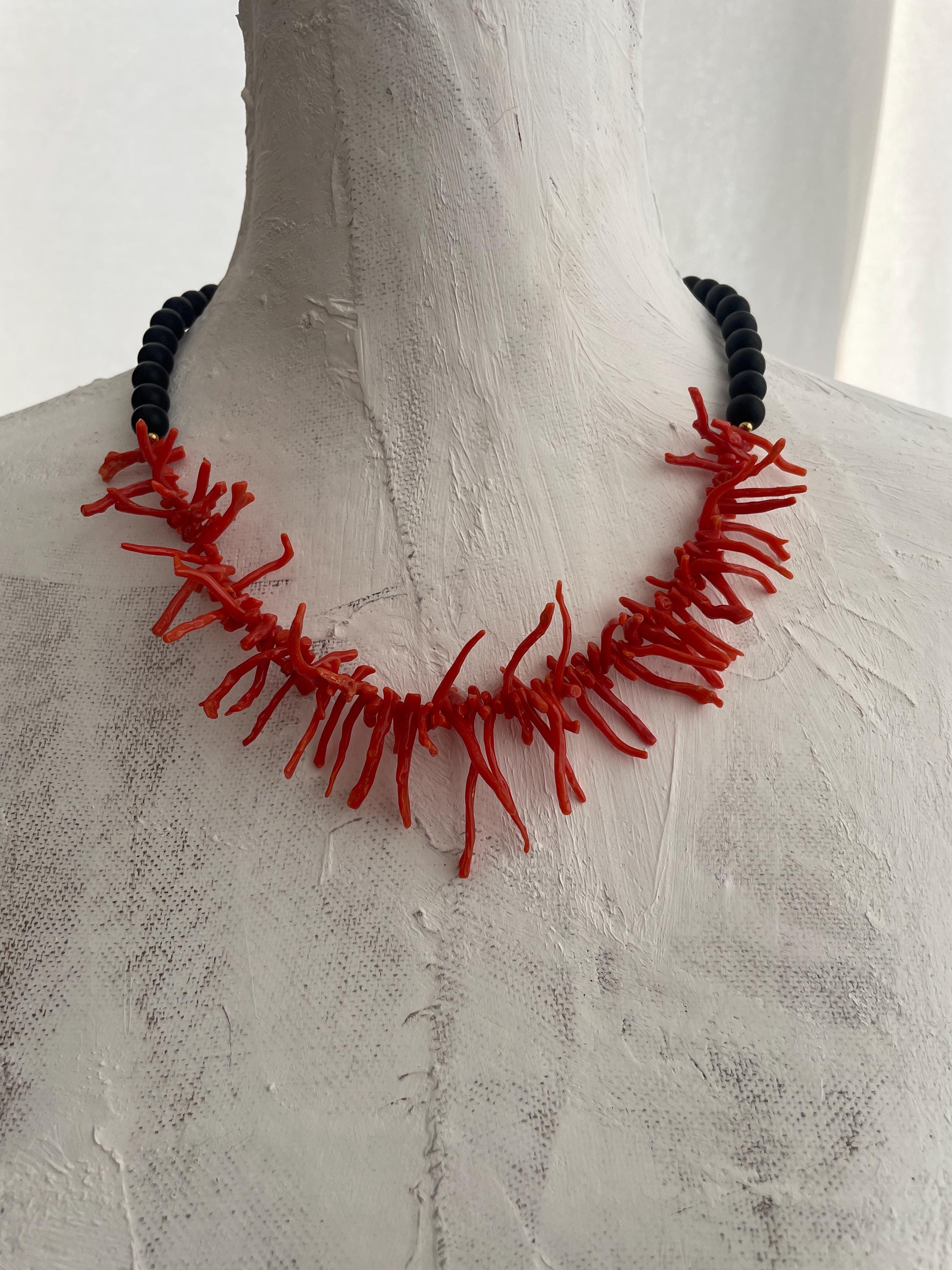 Collana siciliana con perle di lava dell’Etna e rami di Corallo autentico del Mediterraneo.