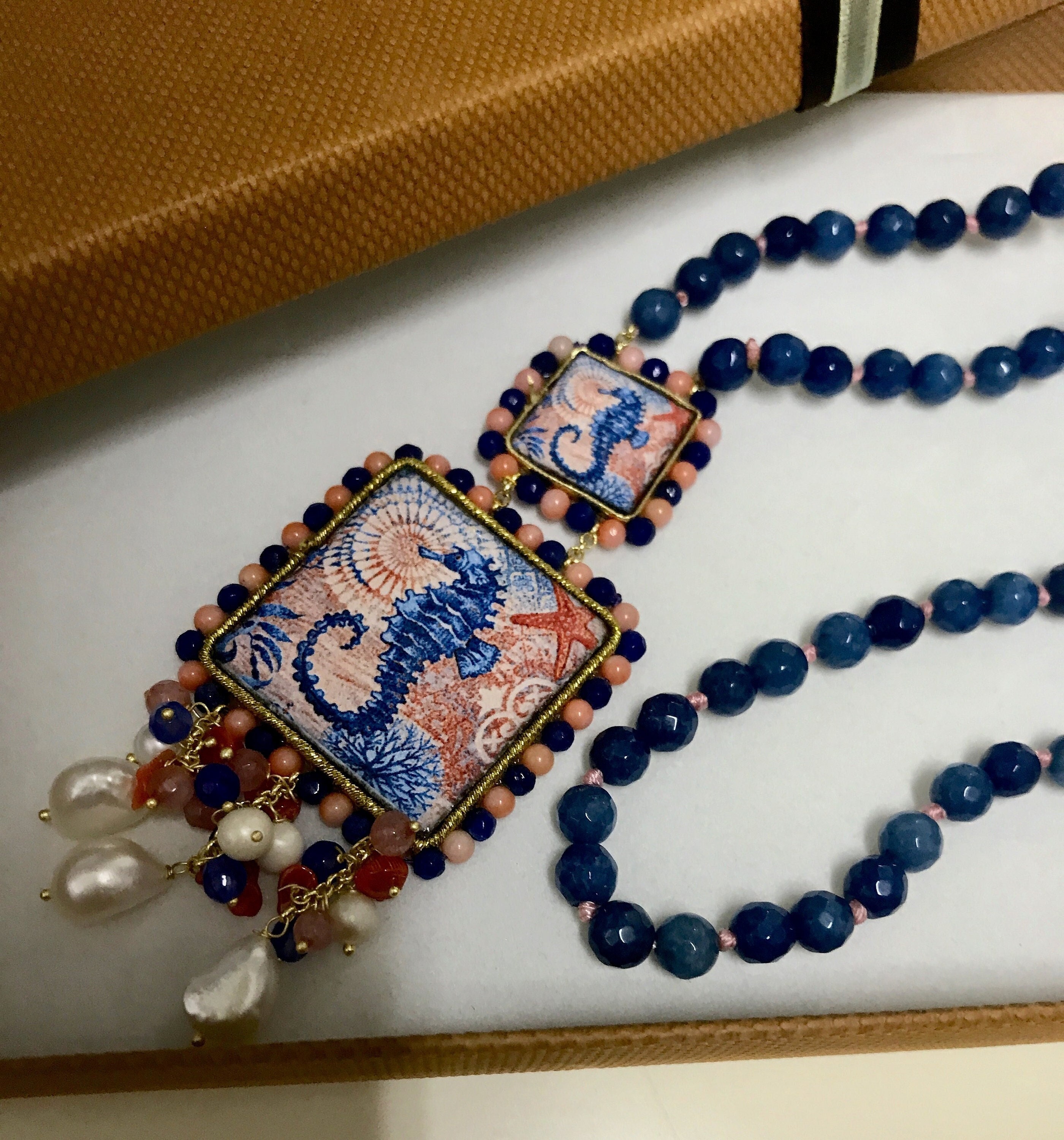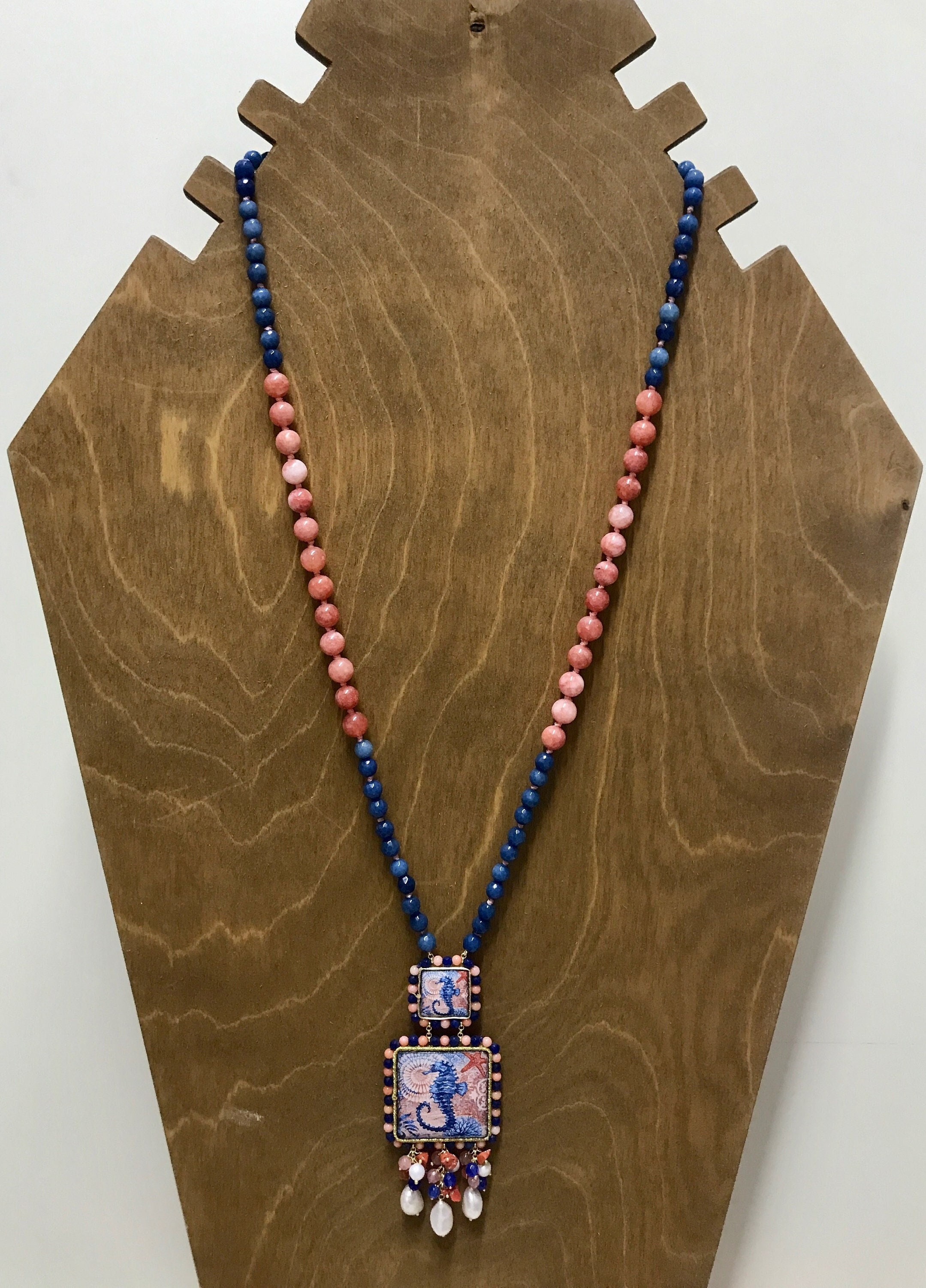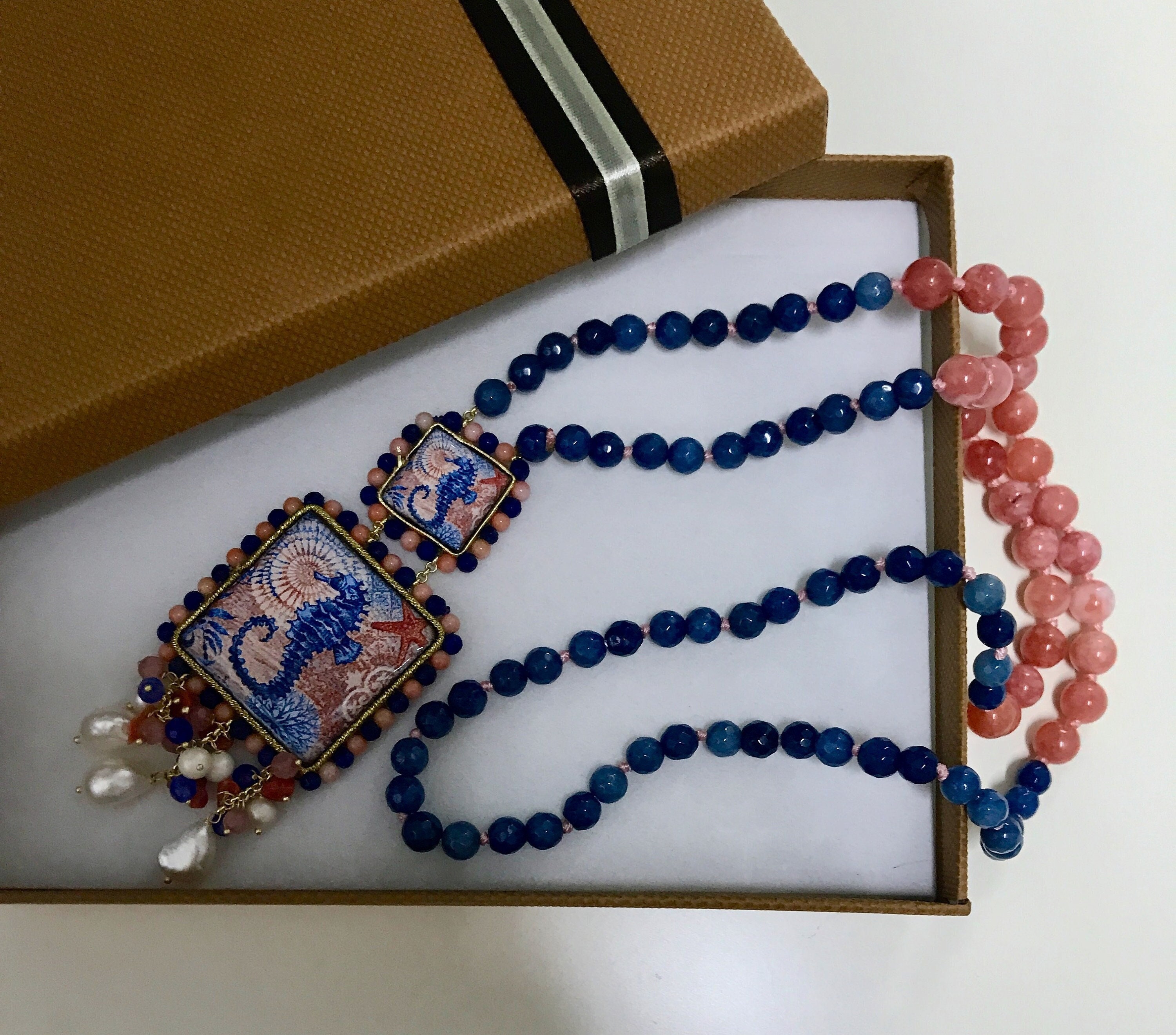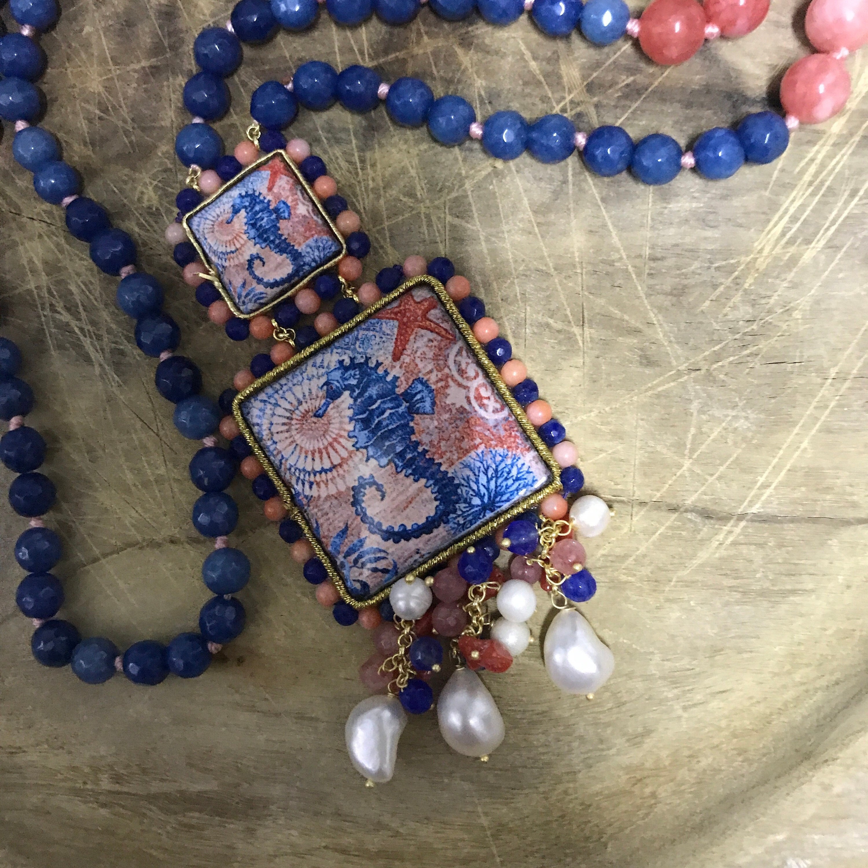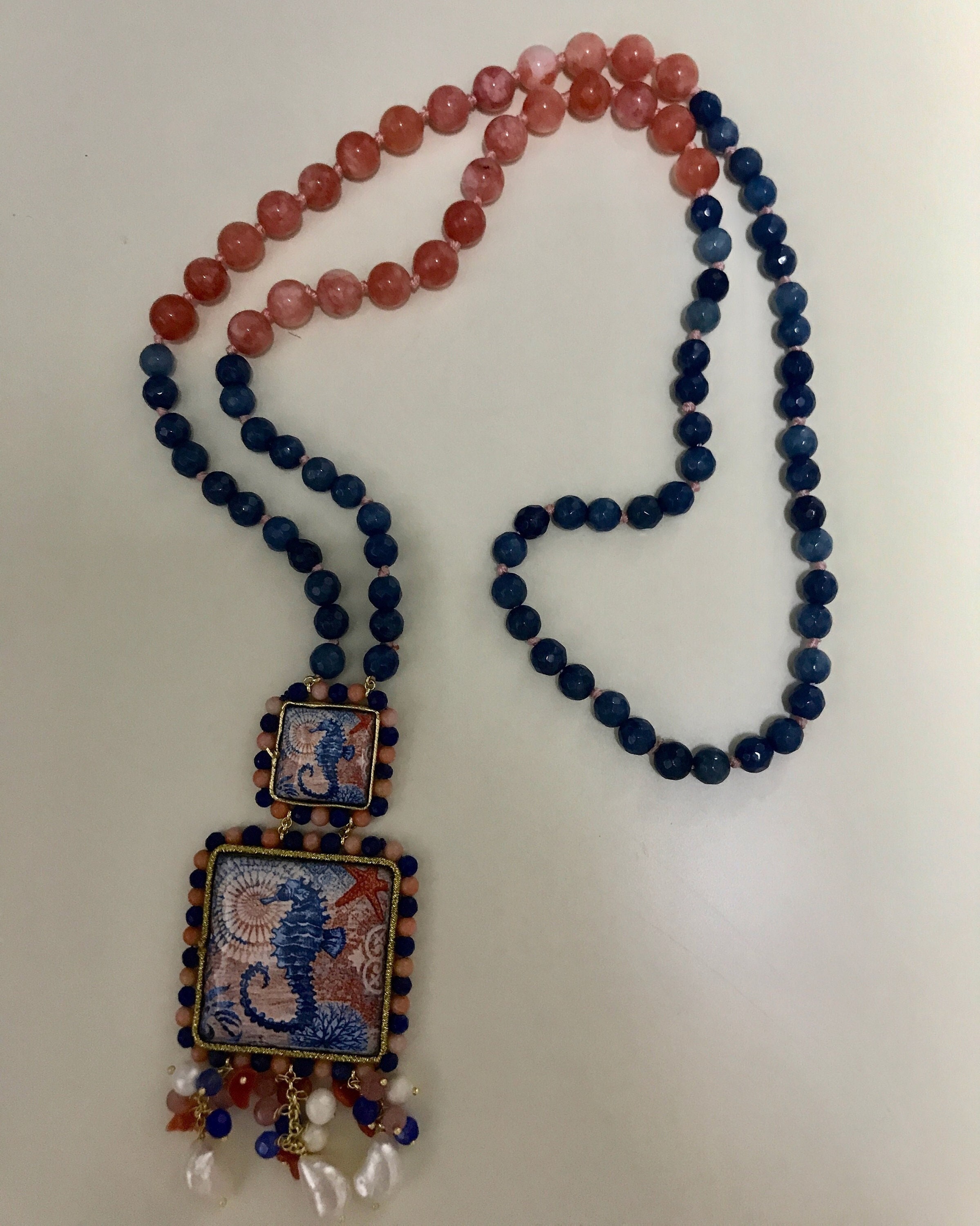 Composta da filo di perle miste di agata rosa e blu, singolarmente annodate e pendenti due mattonelle di Ceramica di Caltagirone.
