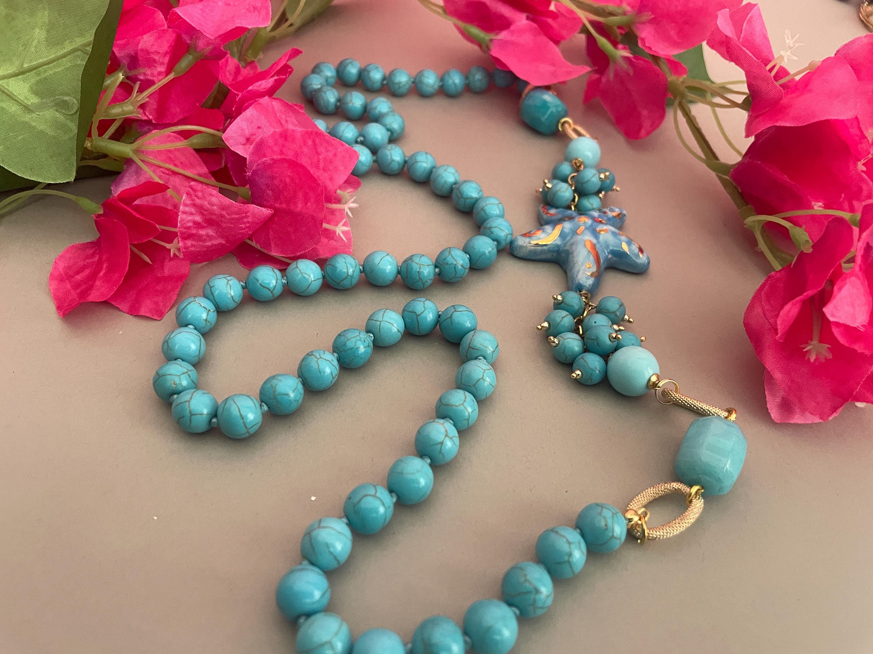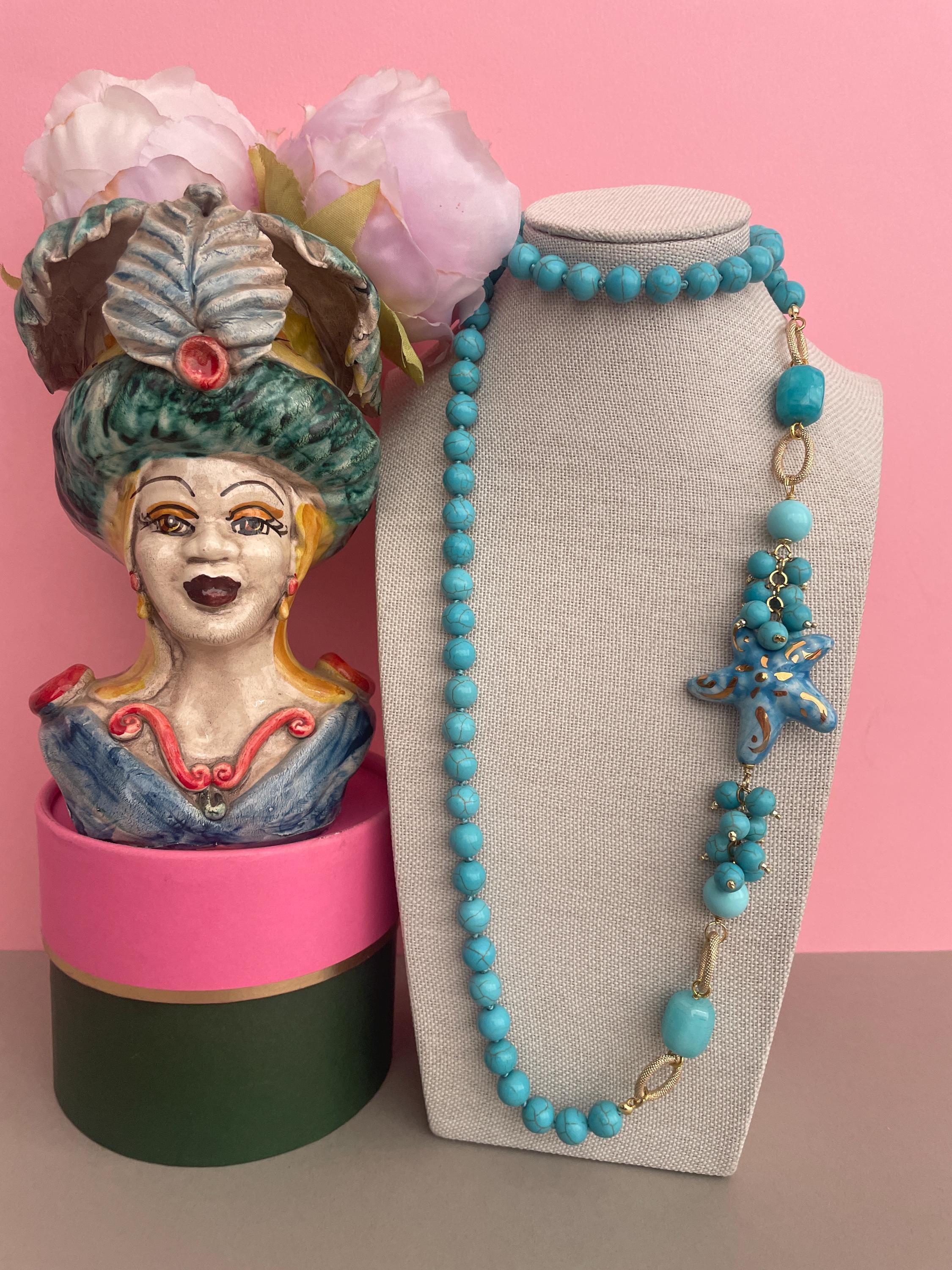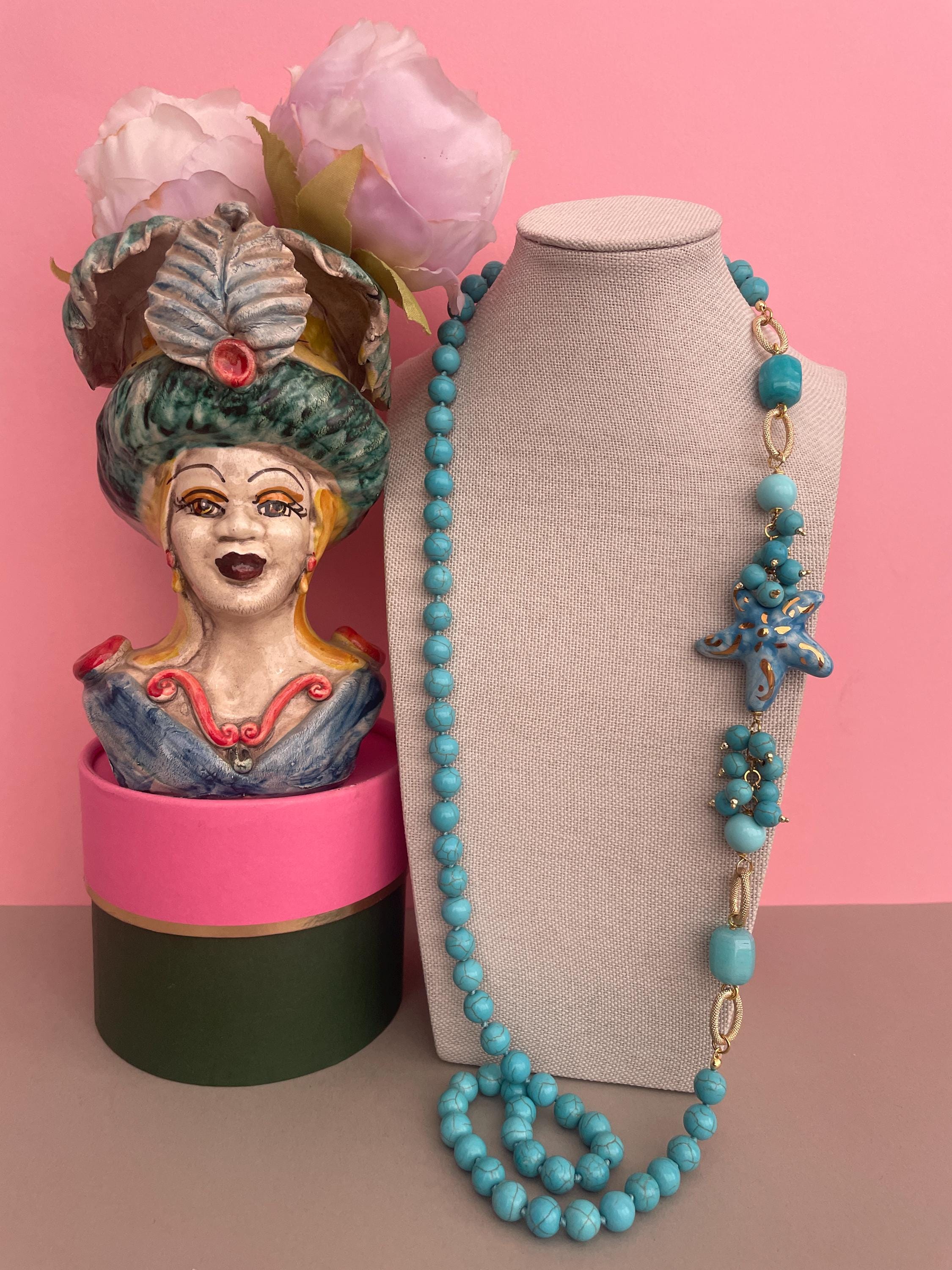 Collana siciliana realizzata con perle di pasta di Turchese tutte singolarmente annodate. Un connettore di ceramica di Caltagirone dipinto a mano e raffigurante una Stella marina si combina con grappoli di perle turchesi e anelli dorati.