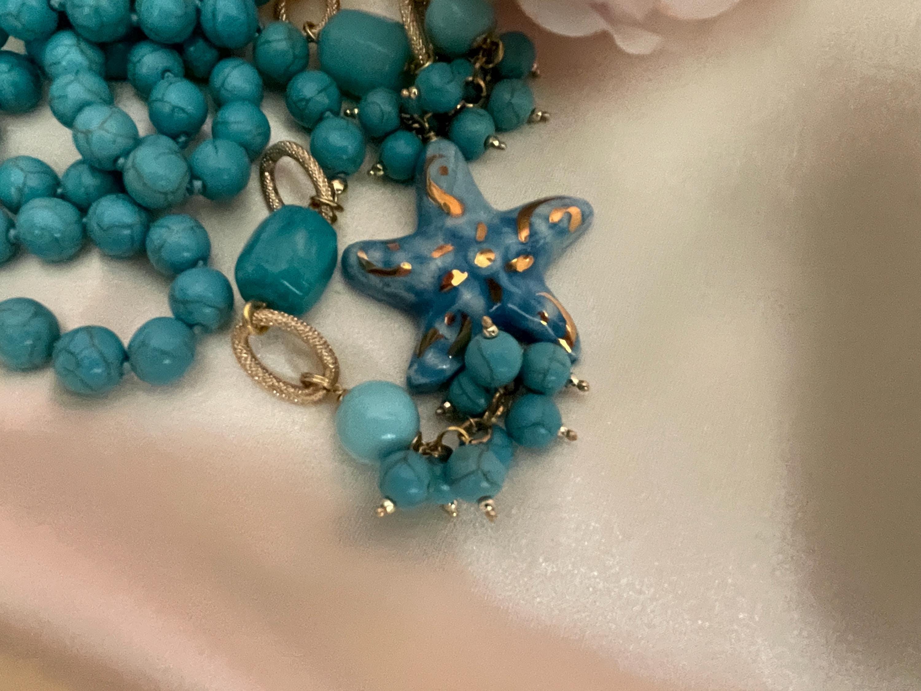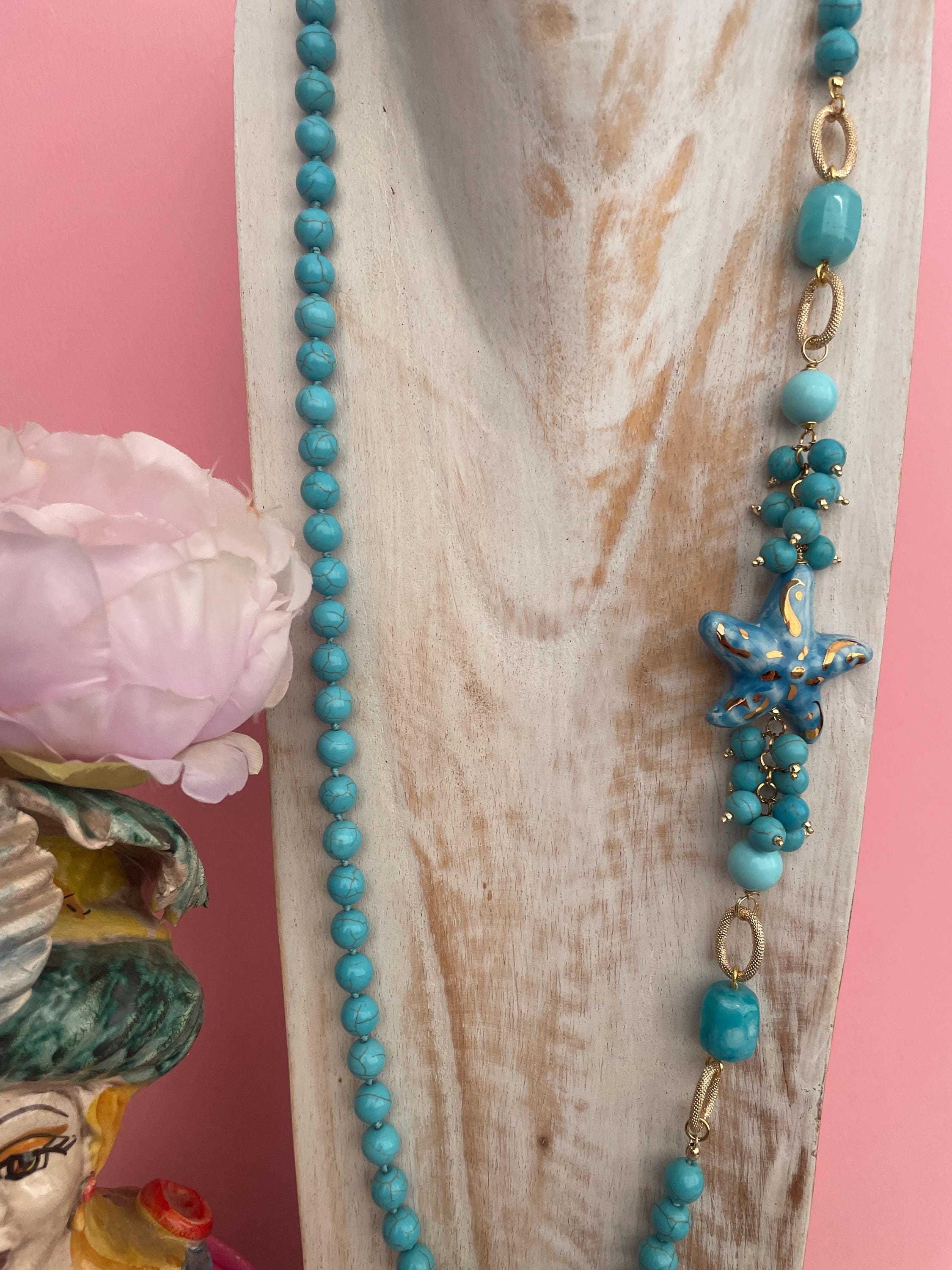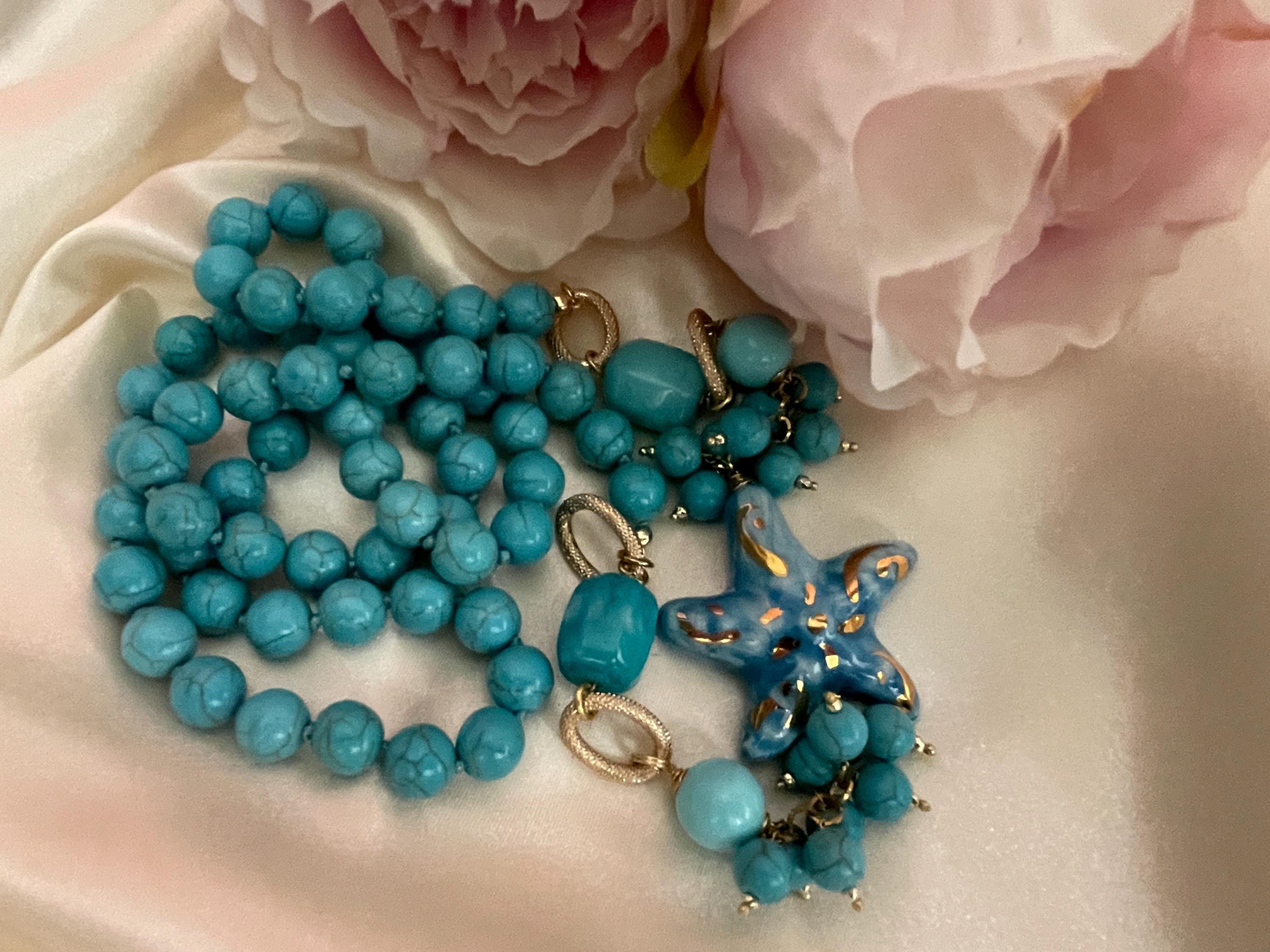 Collana siciliana realizzata con perle di pasta di Turchese tutte singolarmente annodate. Un connettore di ceramica di Caltagirone dipinto a mano e raffigurante una Stella marina si combina con grappoli di perle turchesi e anelli dorati.
