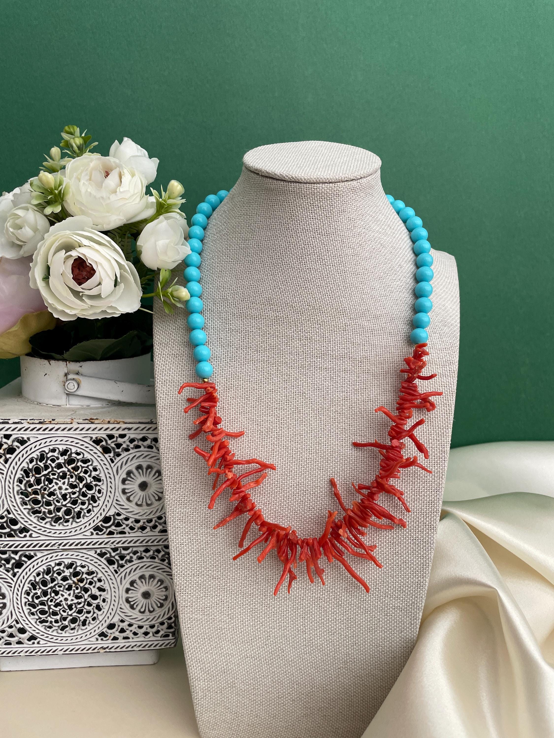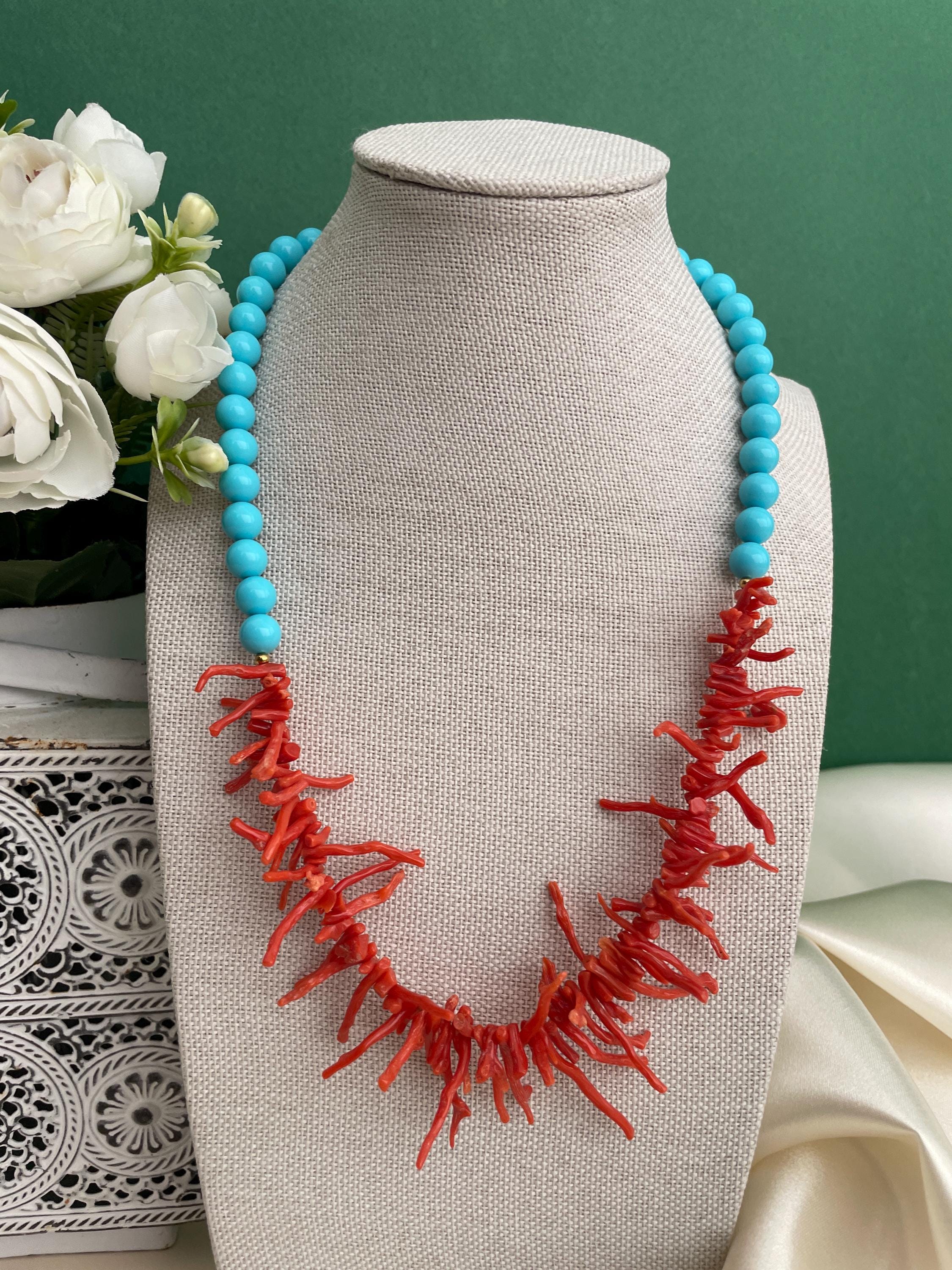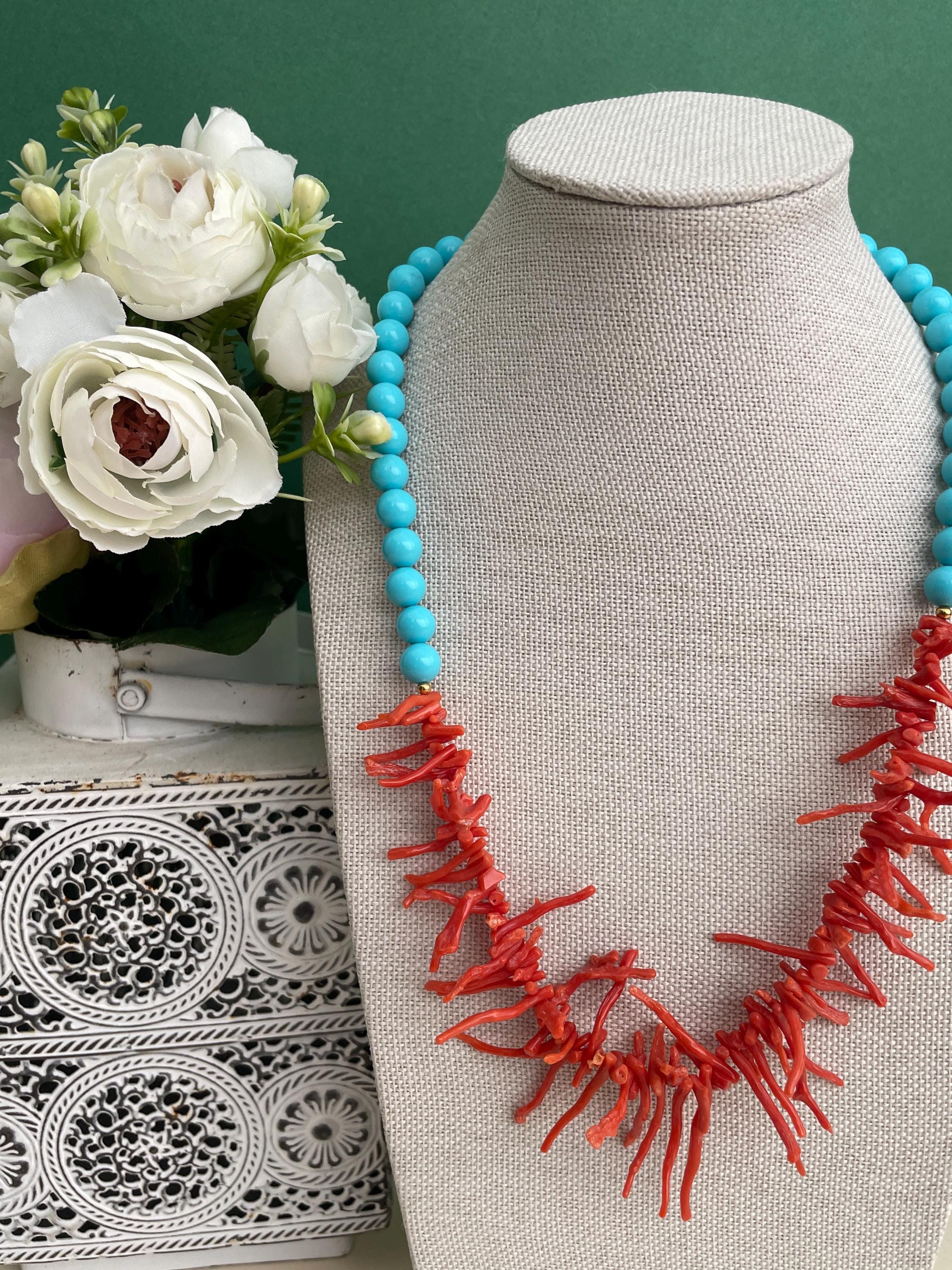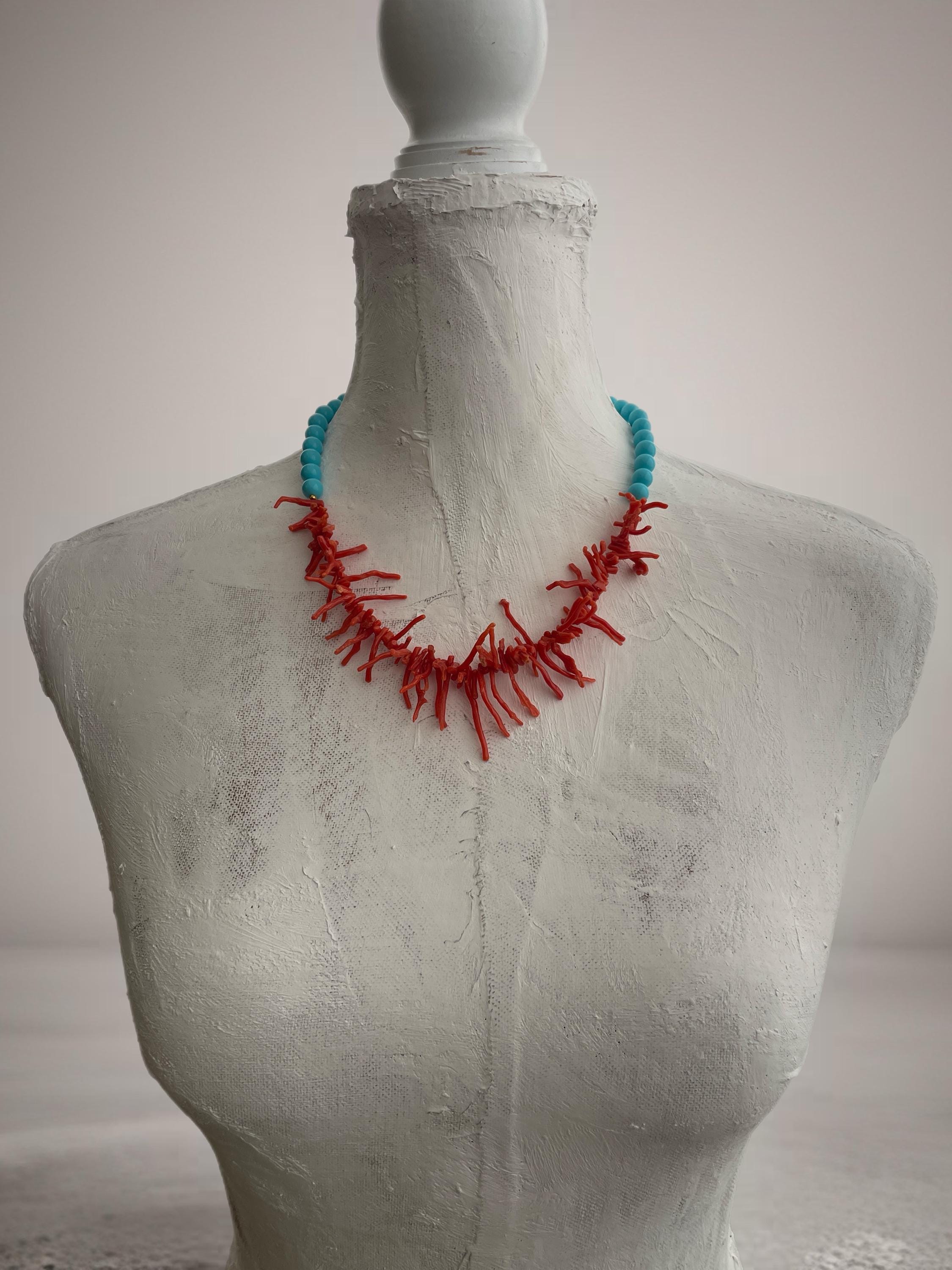 Collana bicolore realizzata nel sopragiro con un filo di perle di pasta di turchese e nel sottogiro un filo progressivo di rami di Corallo rosso autentico del Mediterraneo.