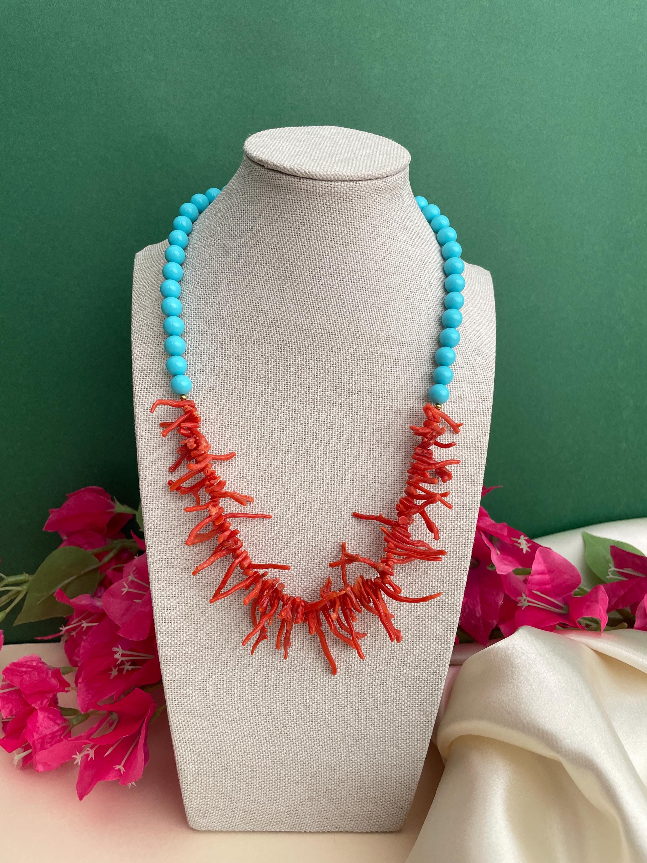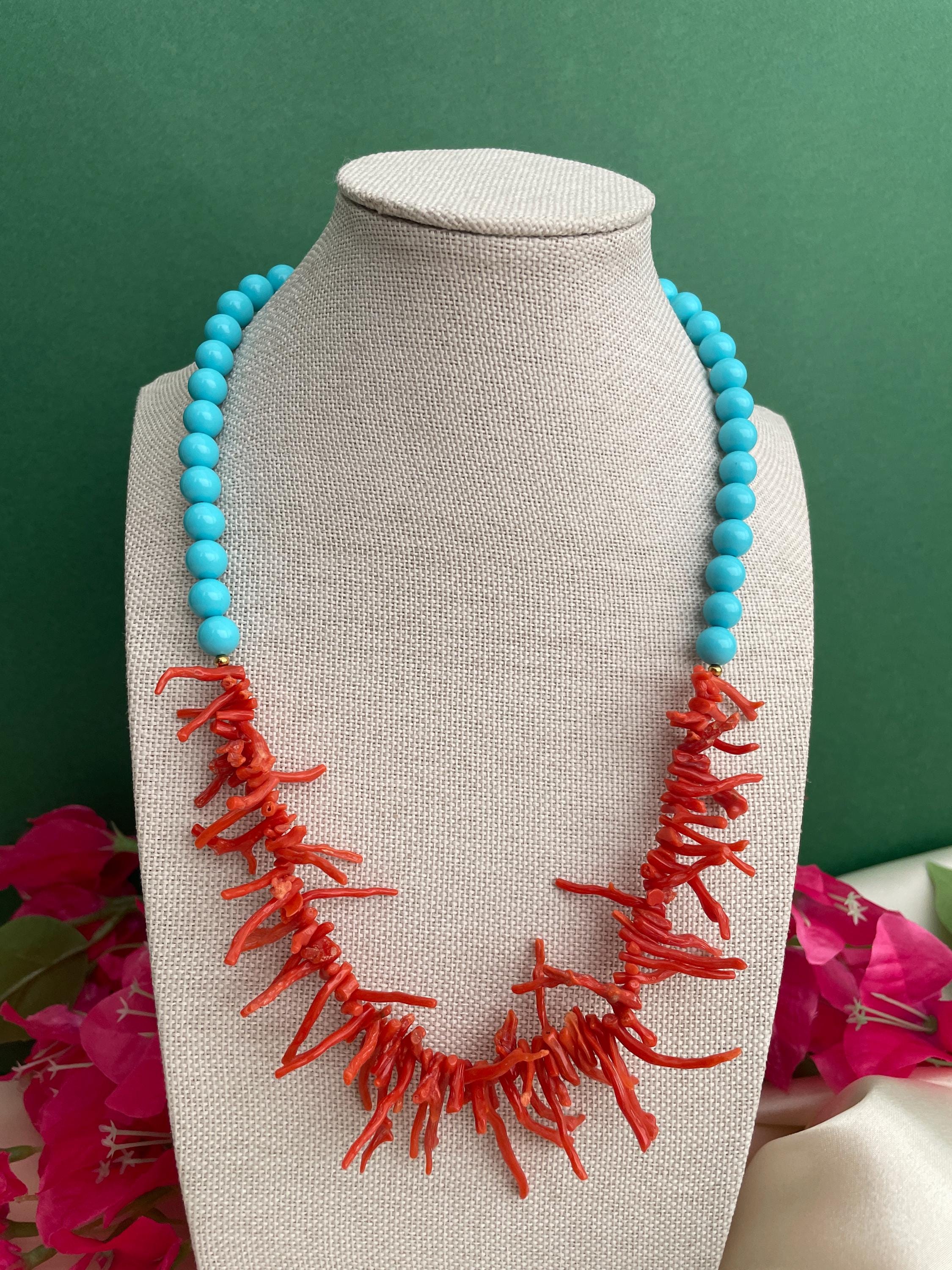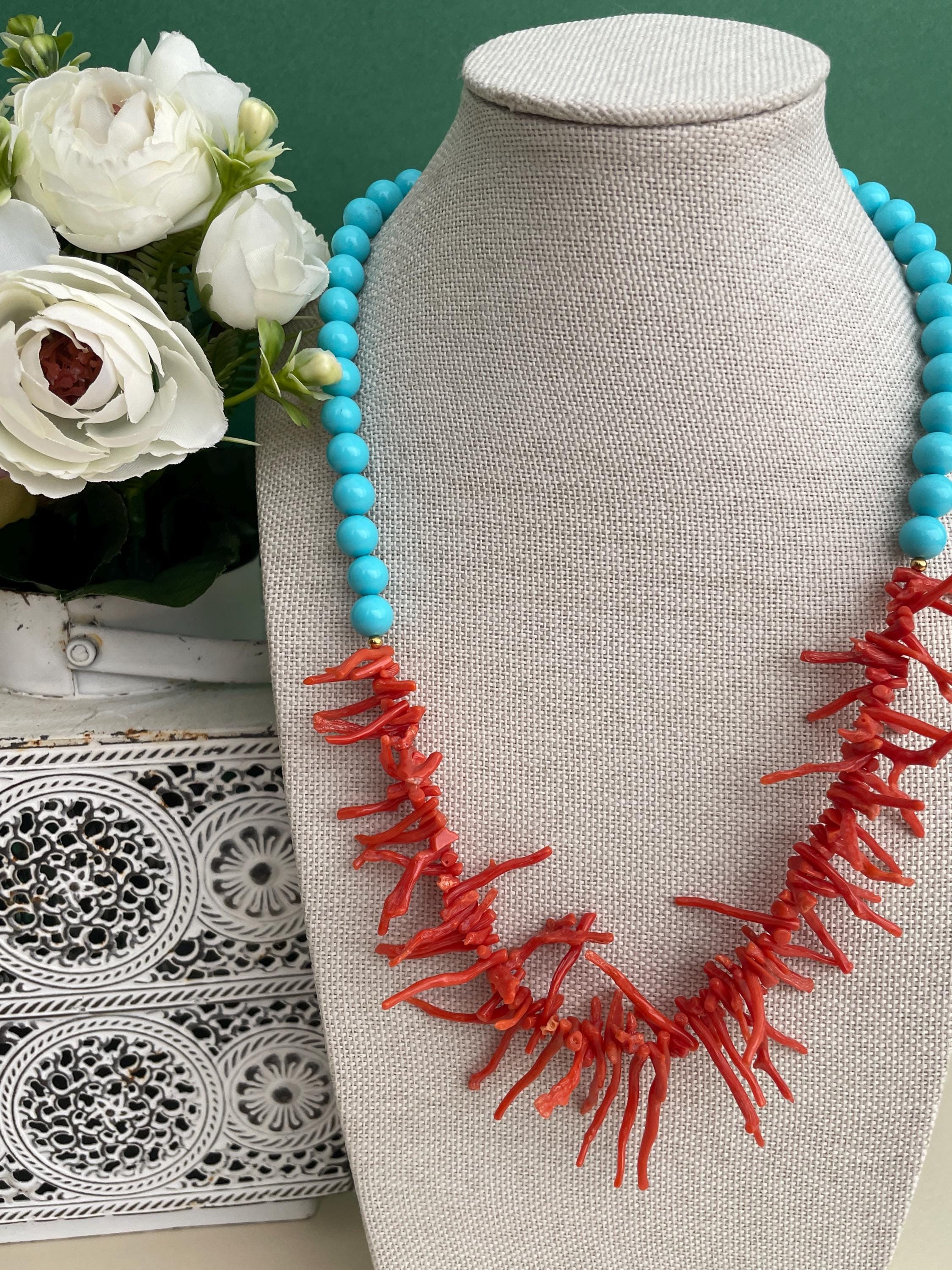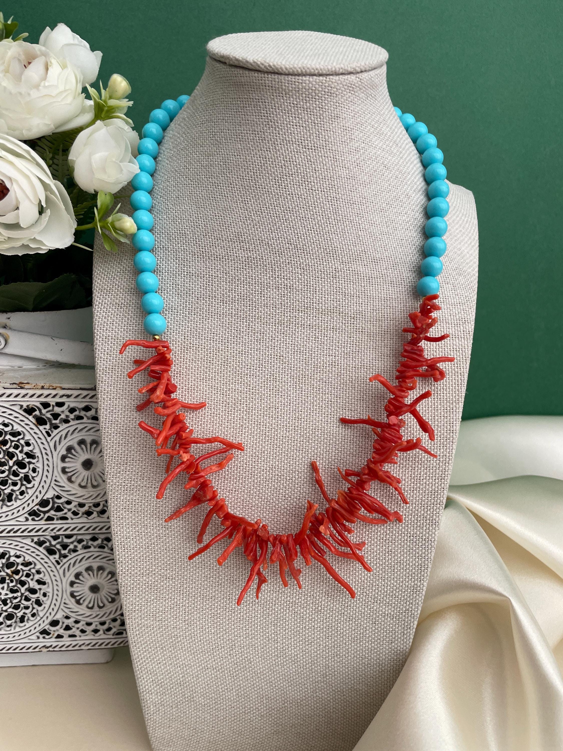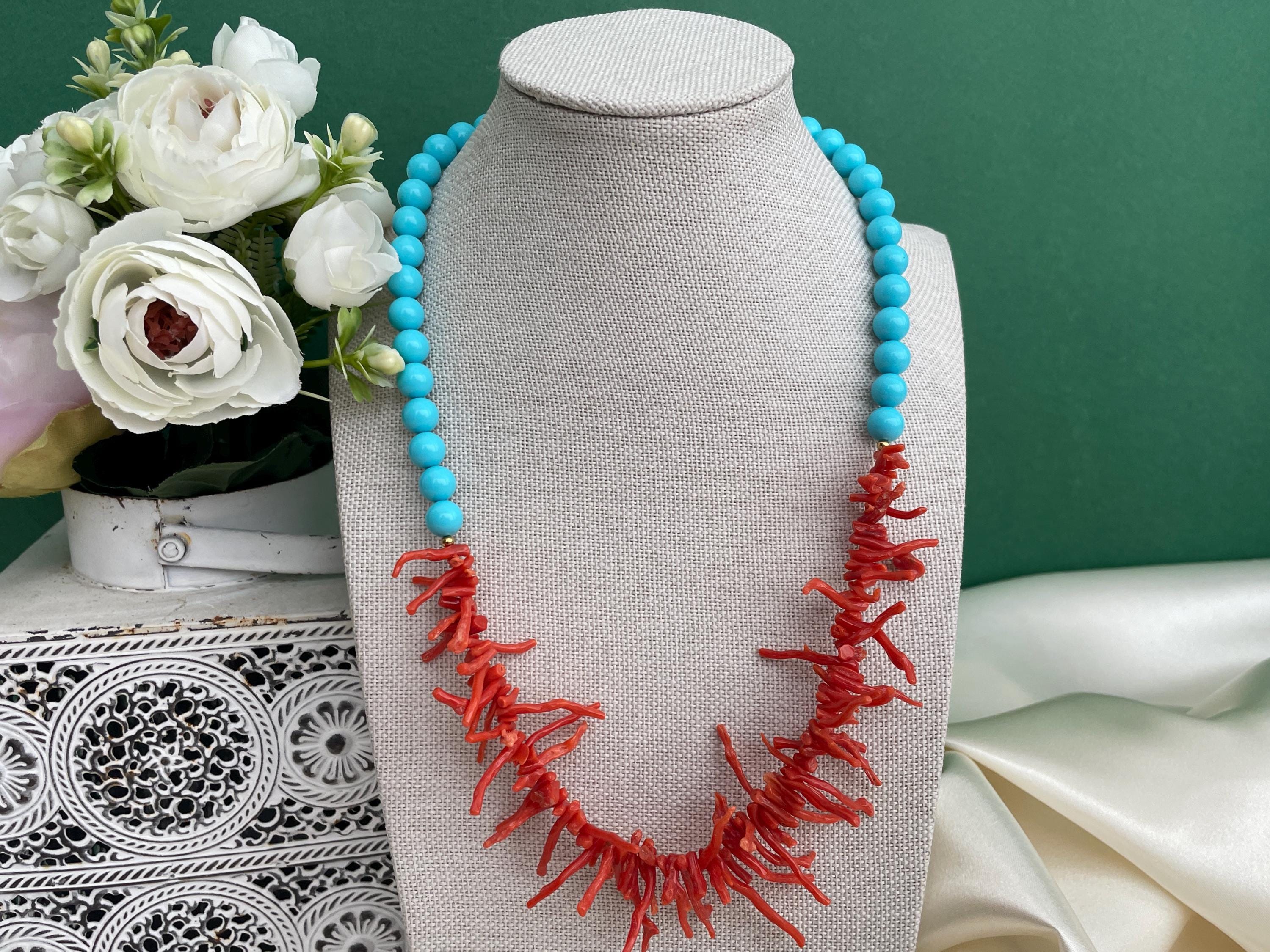 Collana bicolore realizzata nel sopragiro con un filo di perle di pasta di turchese e nel sottogiro un filo progressivo di rami di Corallo rosso autentico del Mediterraneo.