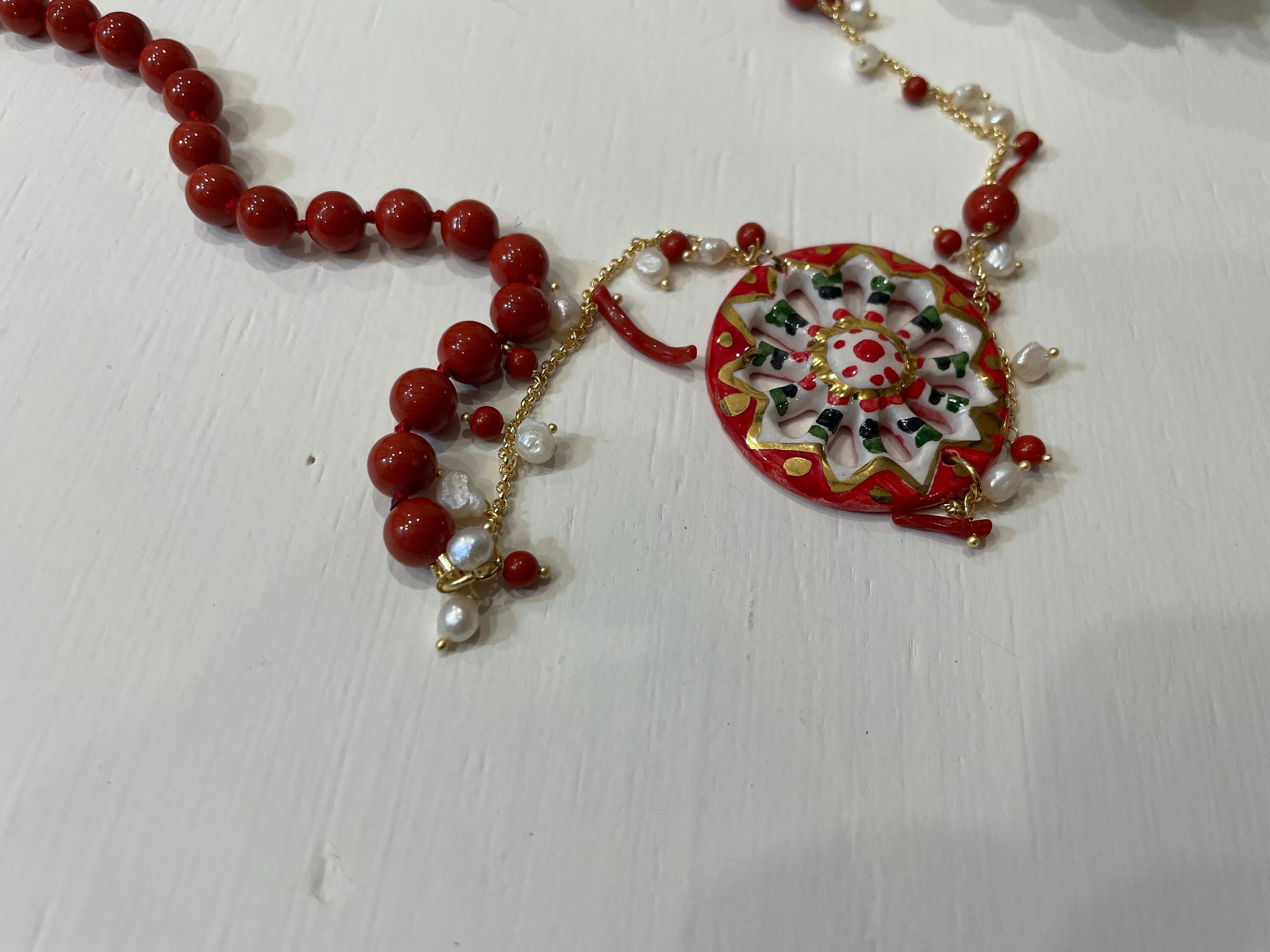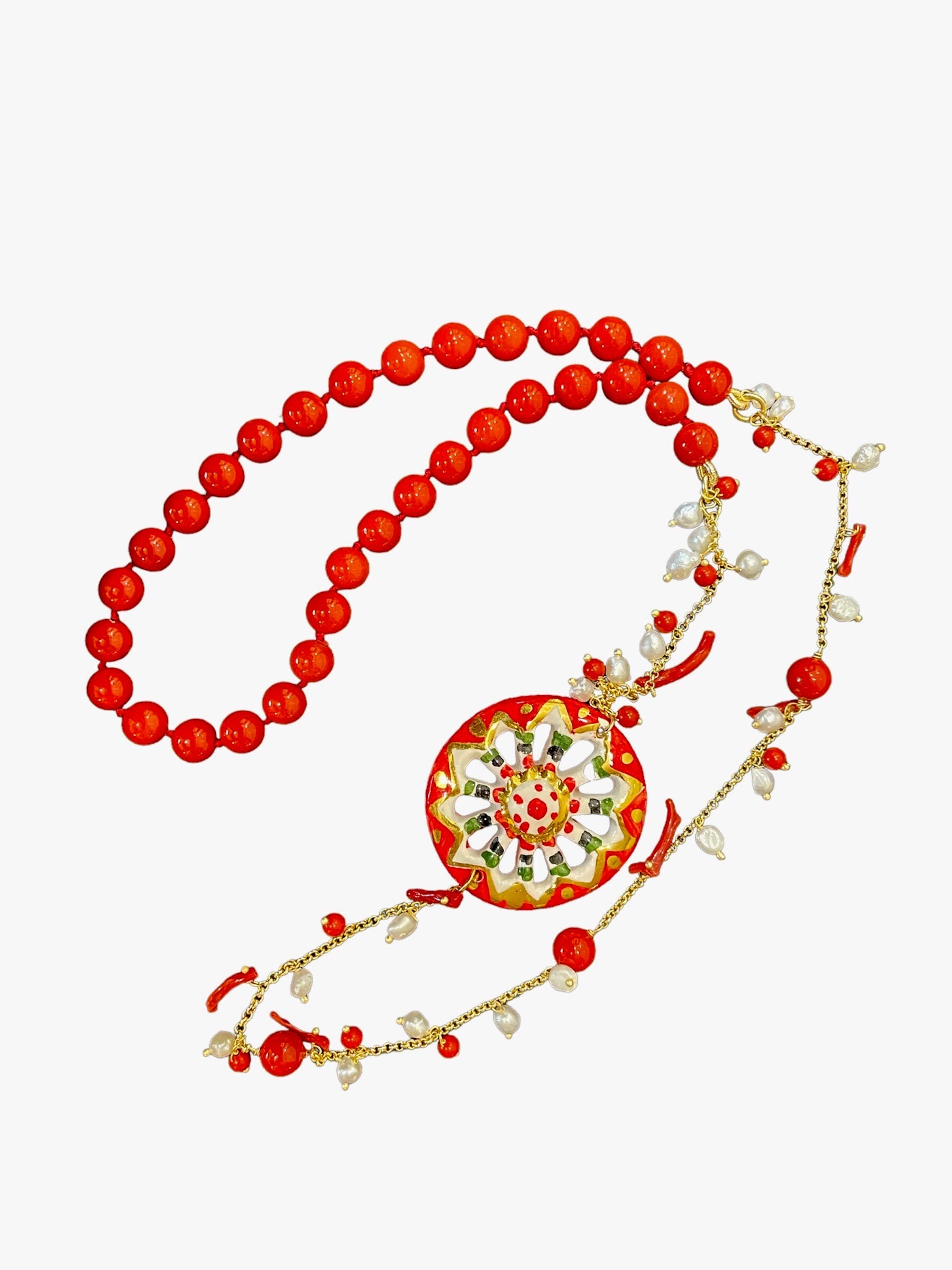 Composta da filo di perle Maiorca rosse, singolarmente annodate, catena in acciaio inossidabile placcato oro, piccole perle di fiume e chips di Corallo rosso.