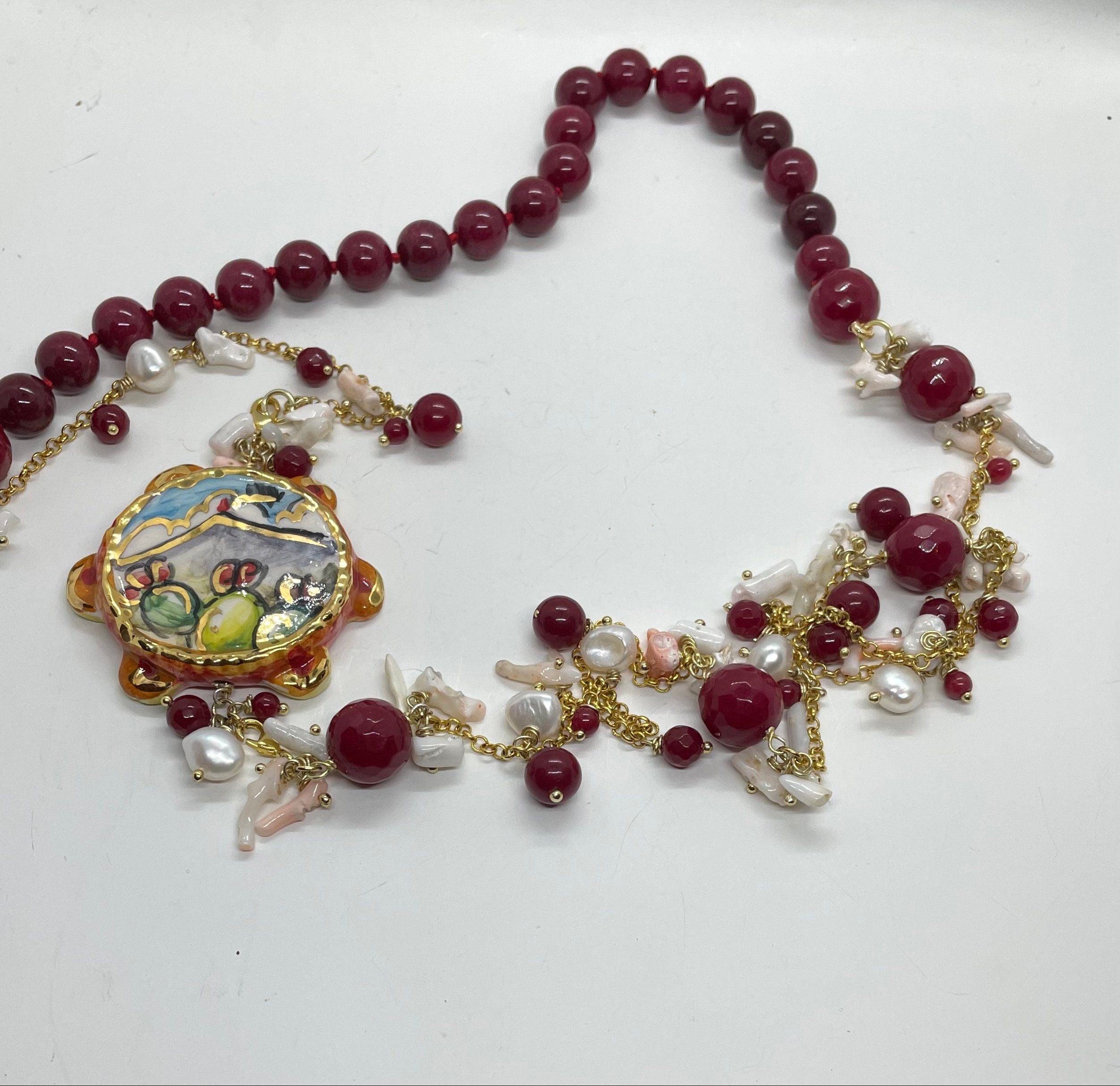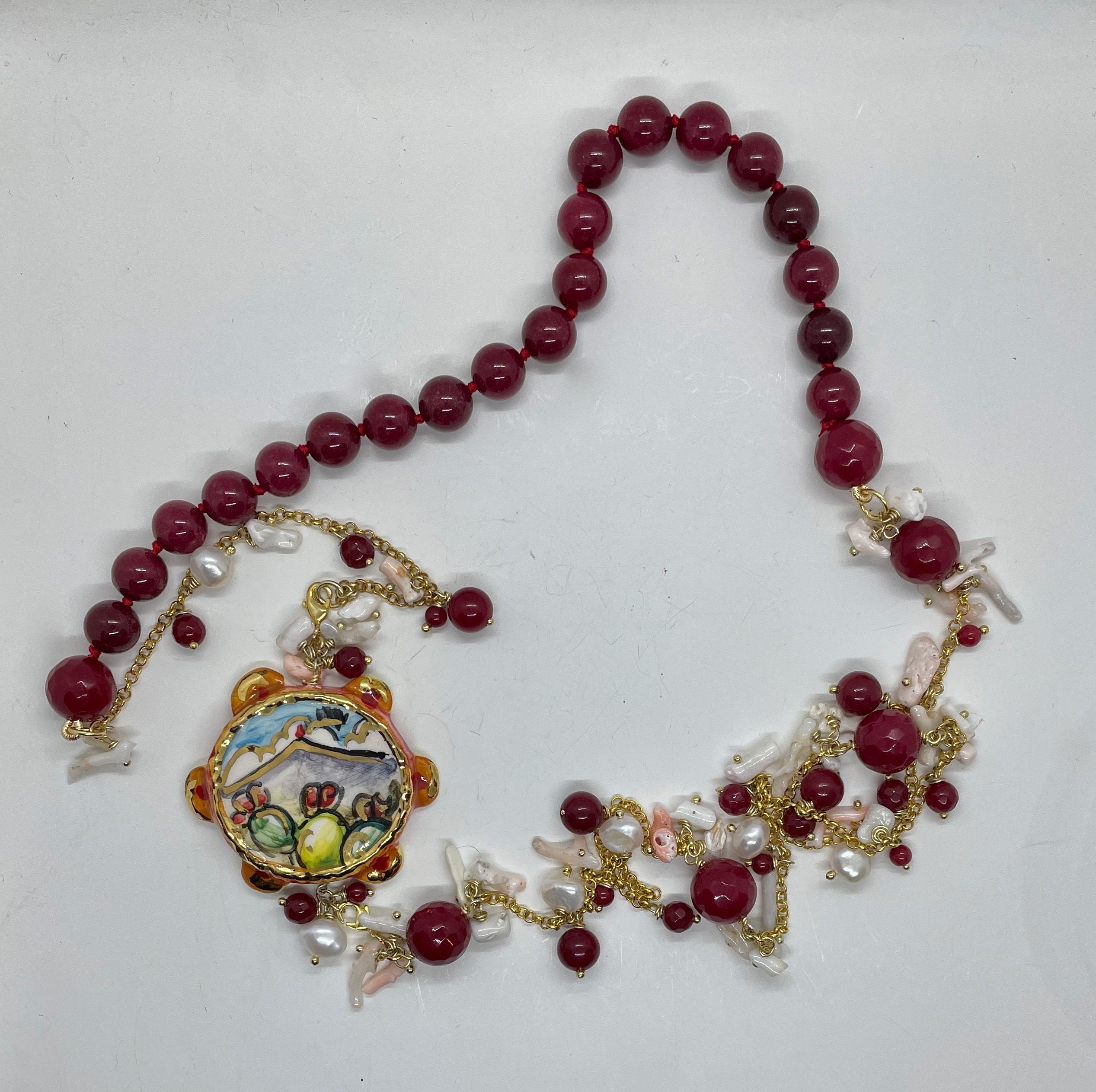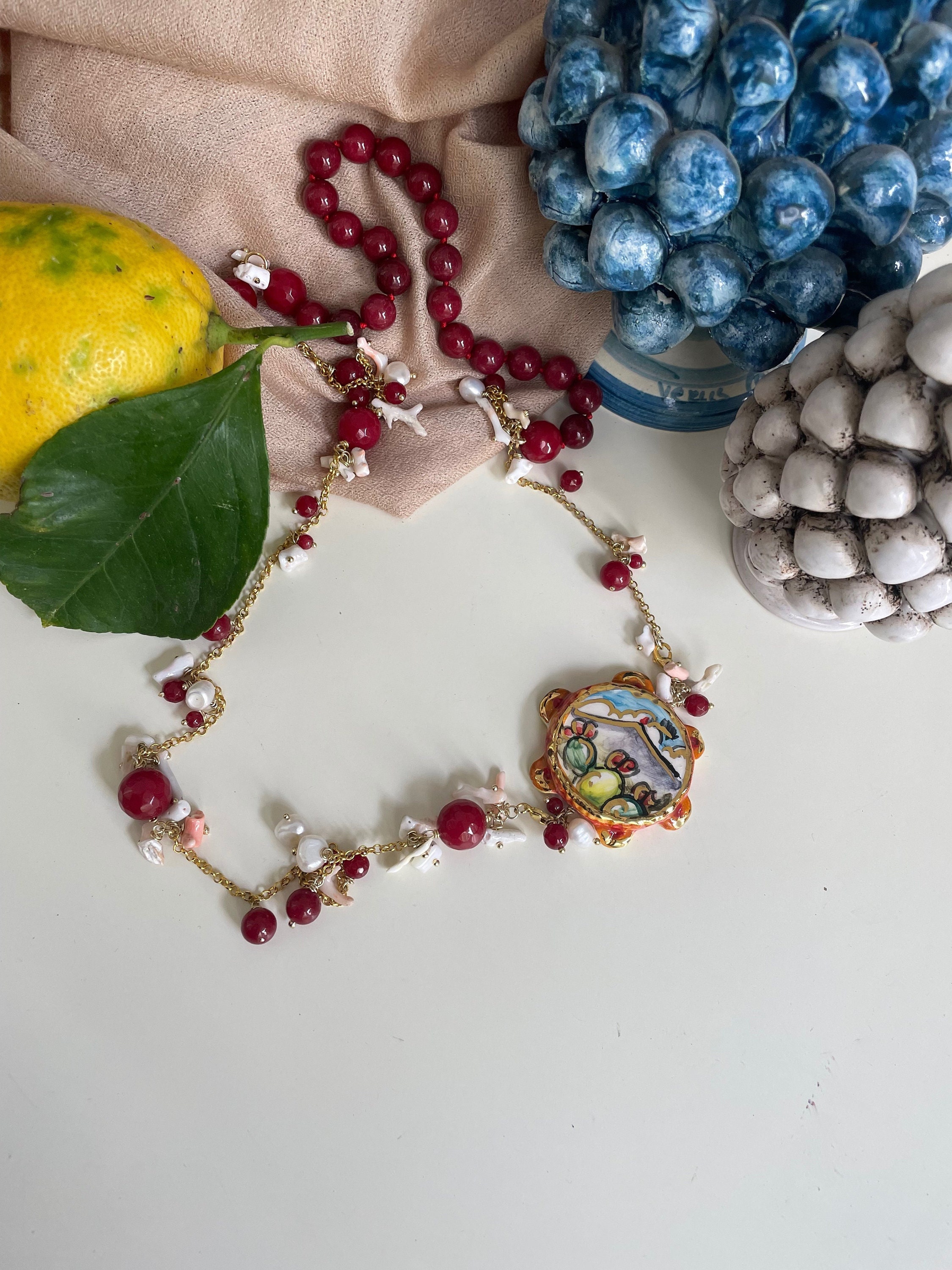 Realizzata con filo di perle lisce di Agata rossa, singolarmente annodate, catena in acciaio inossidabile placcato oro, perle naturali di fiume, chips di corallo rosa e piccole perle di agata rossa liscia.