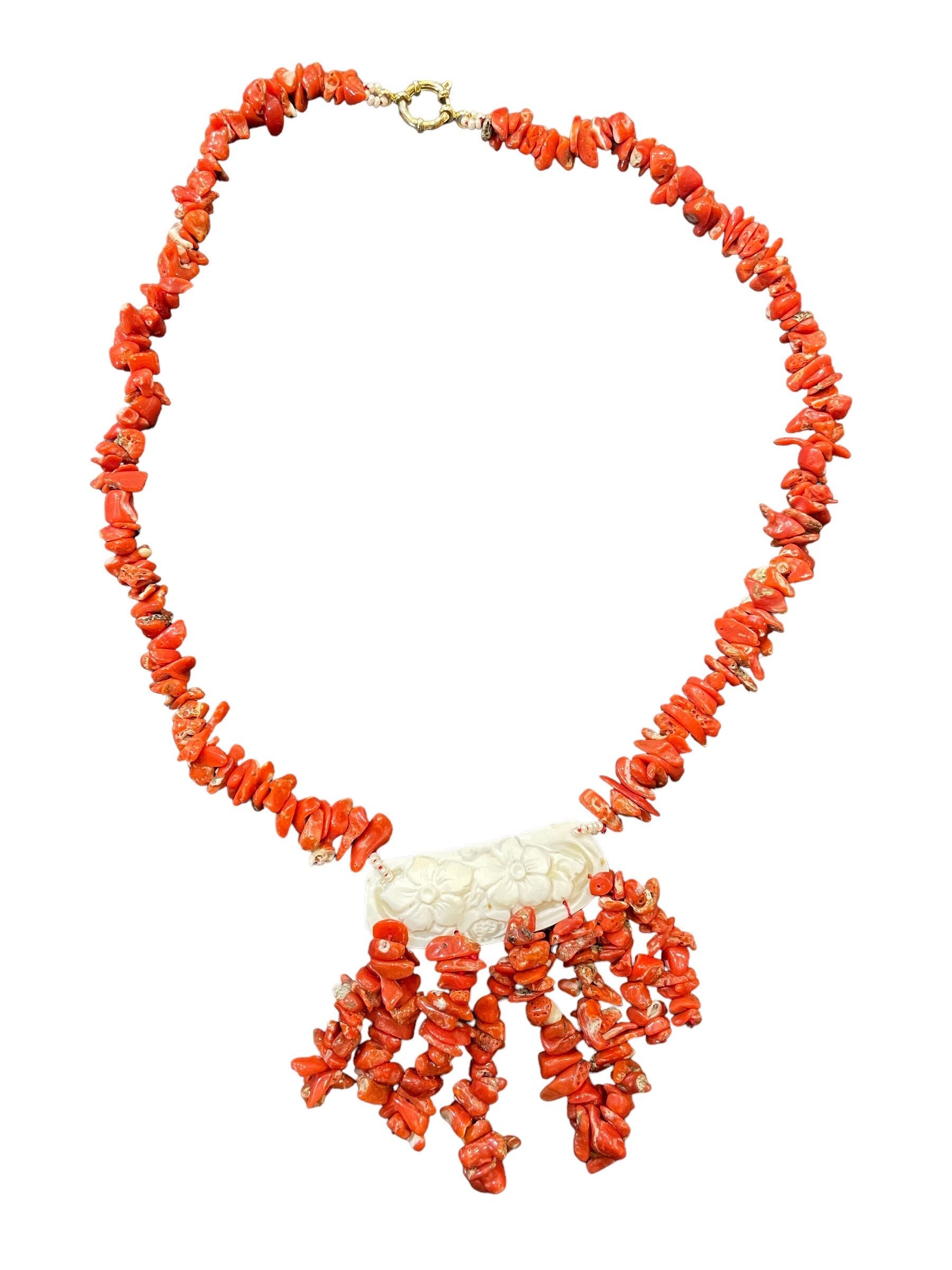 Un bel connettore in vero Cammeo di conchiglia sardonica, si combina con il filo superiore di grandi chips di corallo e gli 8 fili pedenti dal Cammeo.