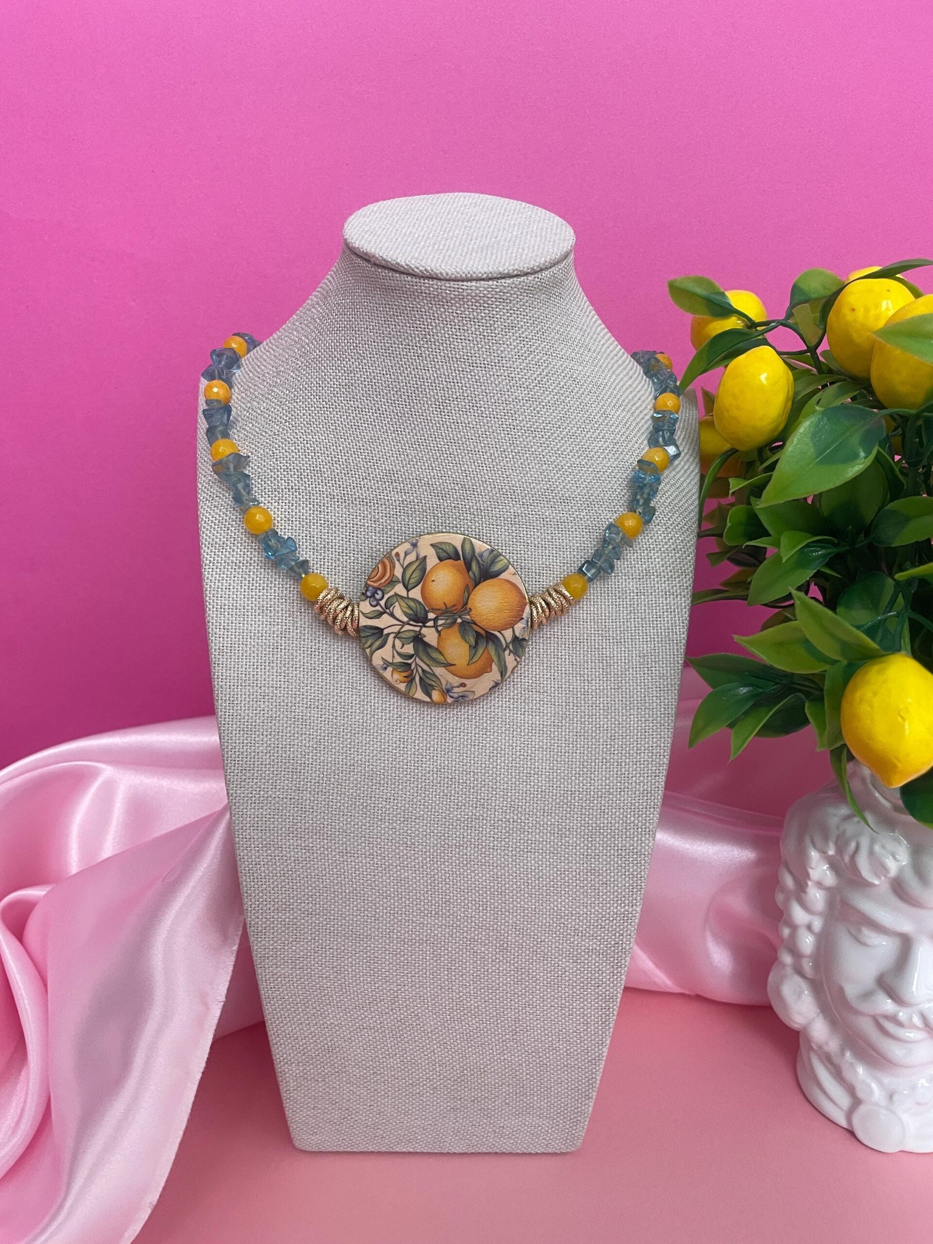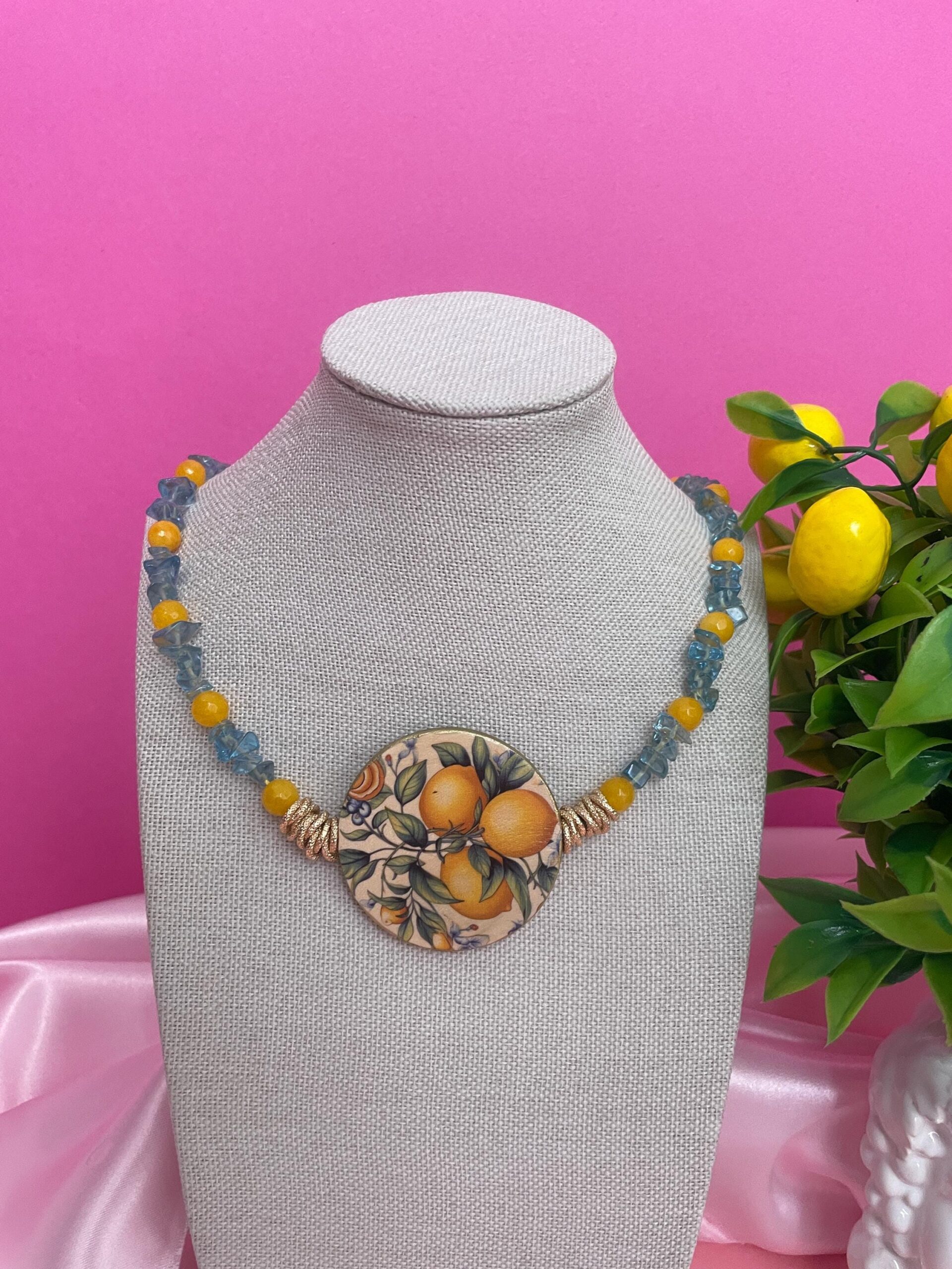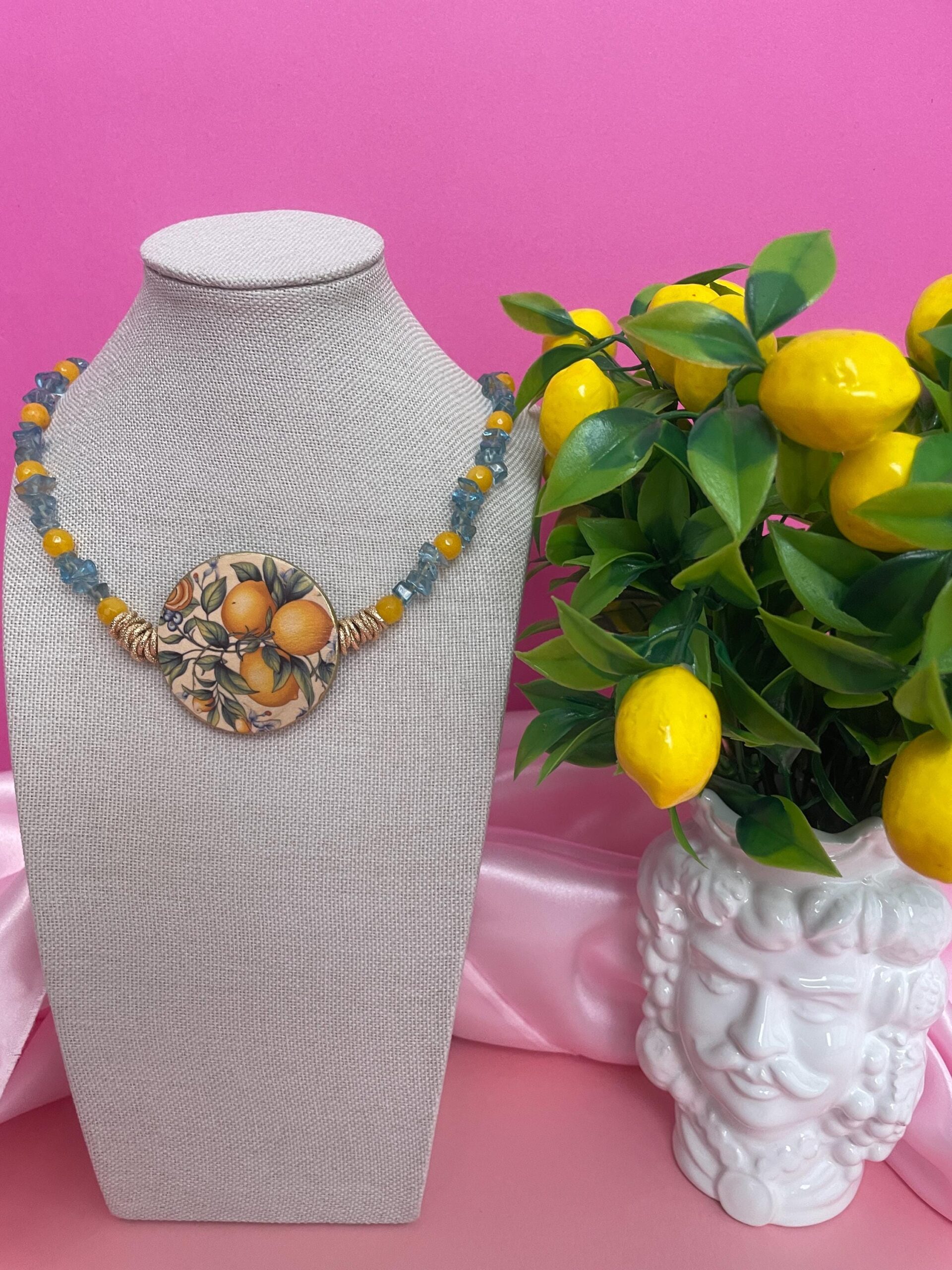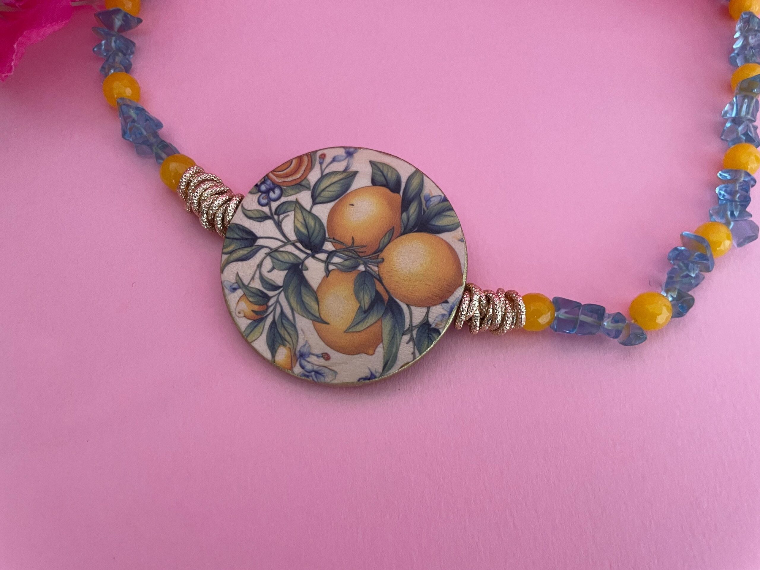 Collana di grande effetto unica nel suo genere realizzata con un filo di chips di pietra naturale azzurra e perle di Agata gialla. Un grande medaglione di legno double face, limoni su un lato e disegni geometrici sull’altro, funge da connettore.
